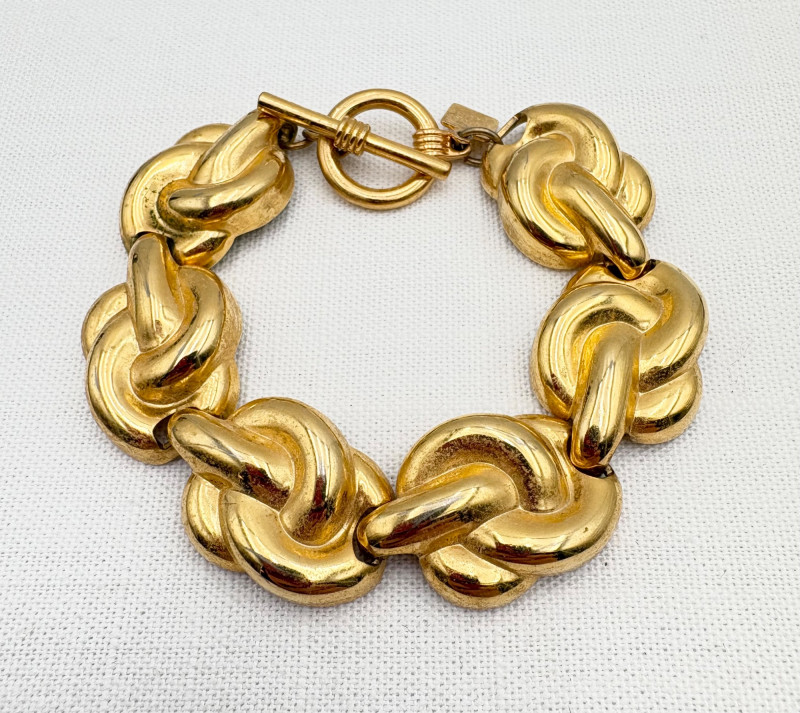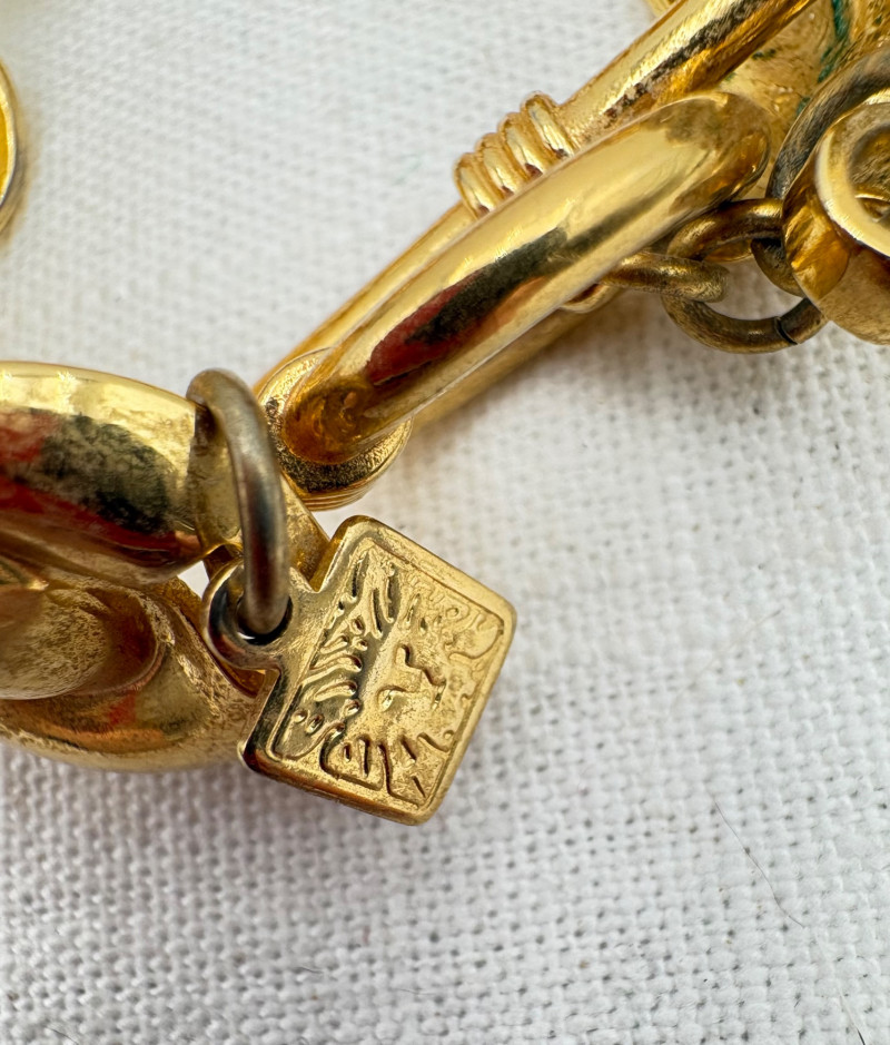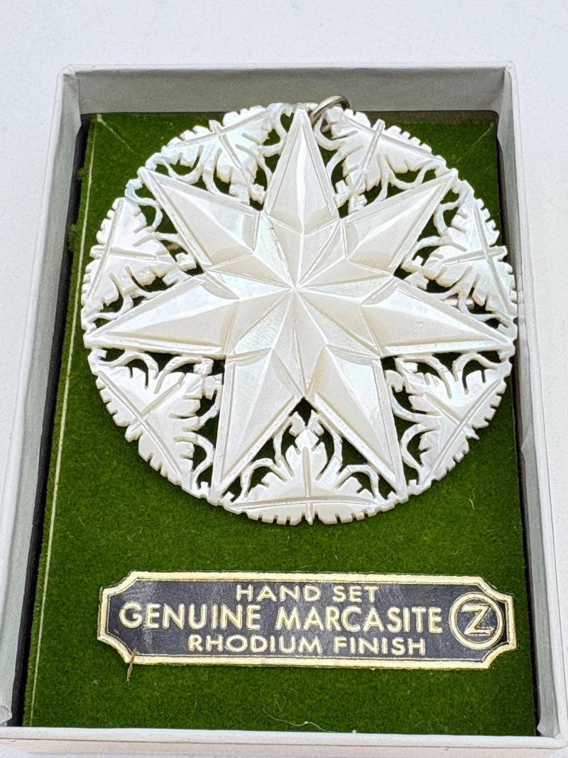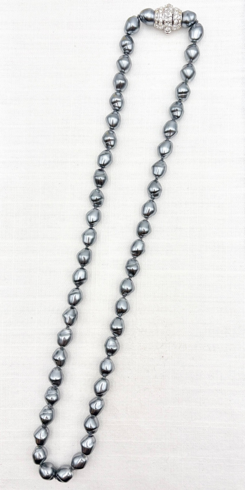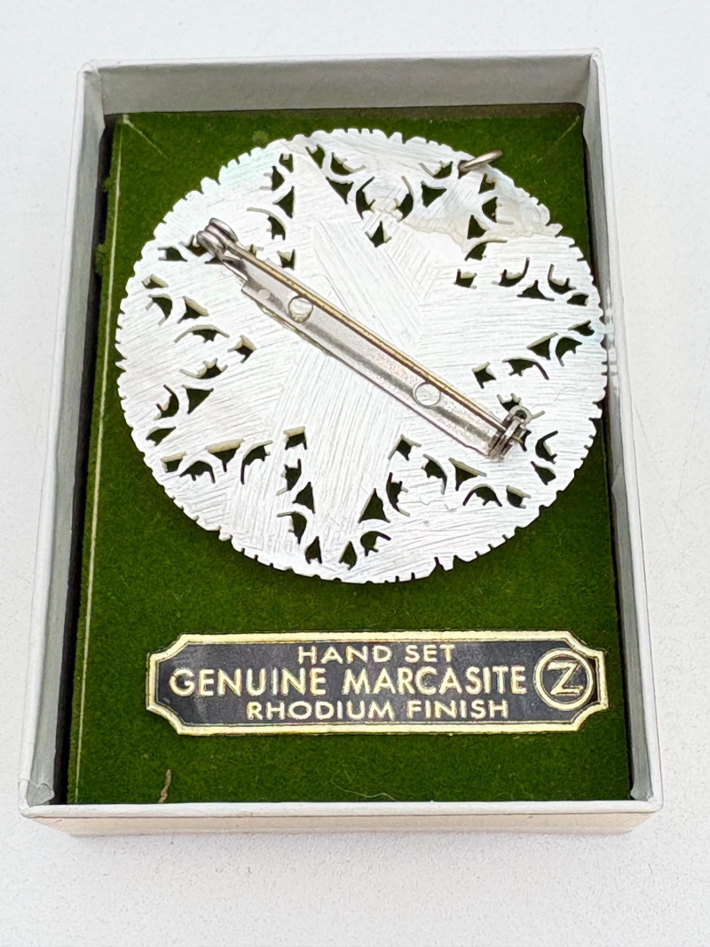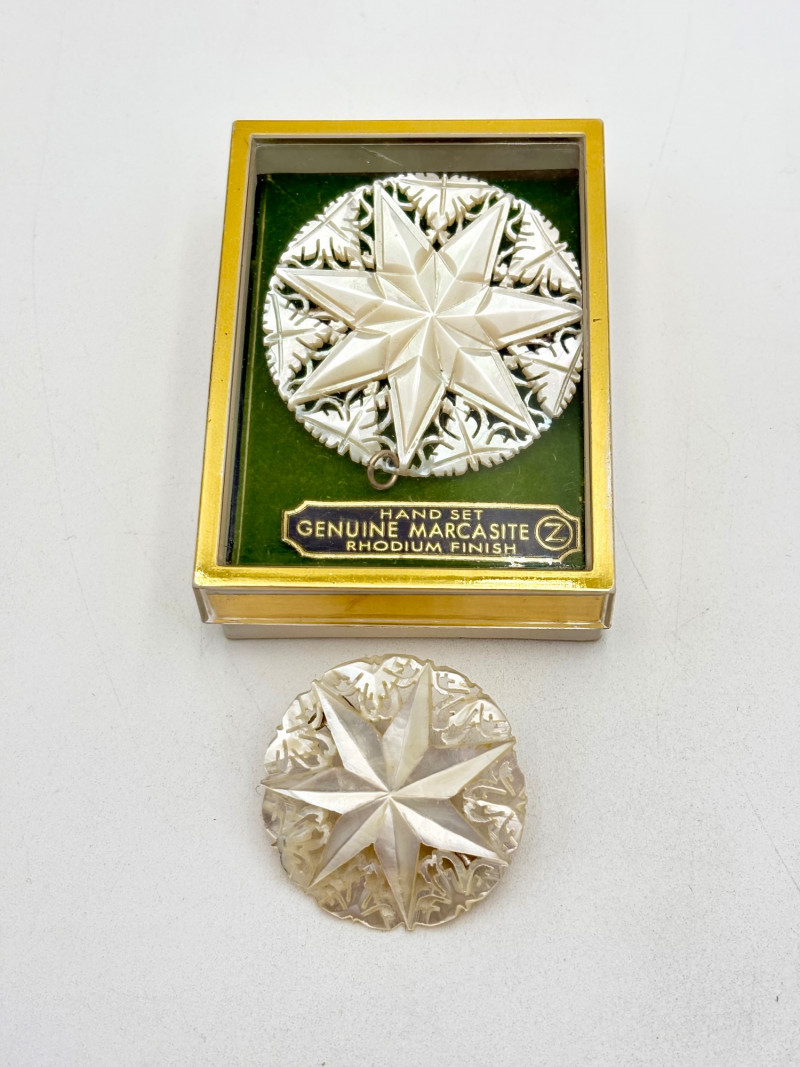 This grouping of jewelry doesn't have a lot in common except for classic understated design. Set of baroque pearls from Nolan Miller in grey with sparkly clasp. Measures 29" L end to end. Comes with original grey box and information, but box is only in ok condition. Sparkly black & gold-tone bracelet with rhinestones has hinged side and slide-in clasp. Measures just over 2" across horizontally. Made in hefty cast metal, but no maker mark. Anne Klein gold-tone bracelet in pseudo-braid with toggle. Measures approx. 7.5" from toggle to loop. Black enamel floral necklace from Casini of London. Square pendant has flowers that appear to be hand-painted with French enamel. The surround on pendant is composed of man-made diamonds. Chain measures 24" from clasp to loop. Pair of marcasite pins - the larger can also be used as a necklace if hung on a chain. Neither has a maker mark, but the smaller says "Made in Bethlehem" on the reverse. Larger measures 2" wide while the smaller measures 1.5" W.