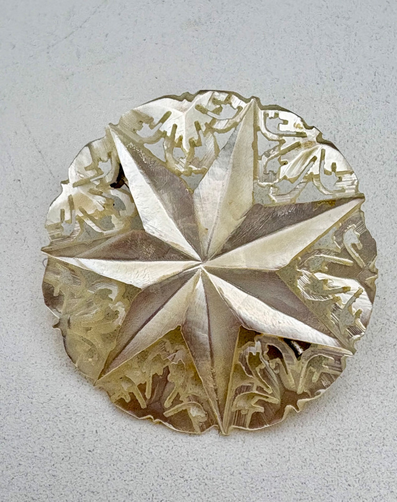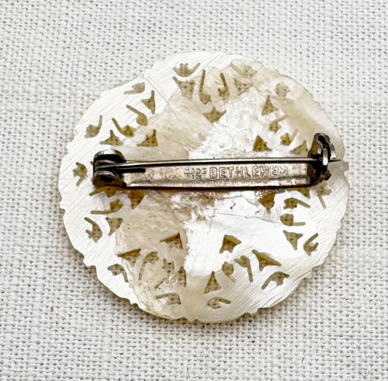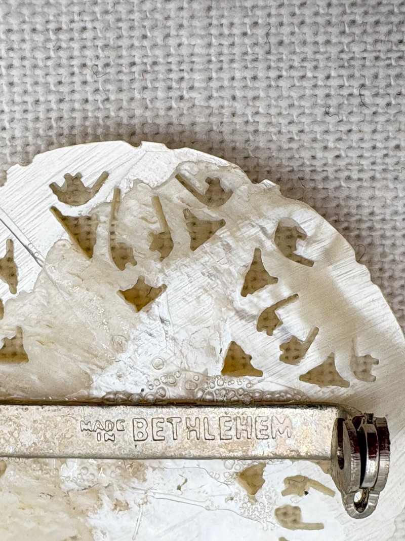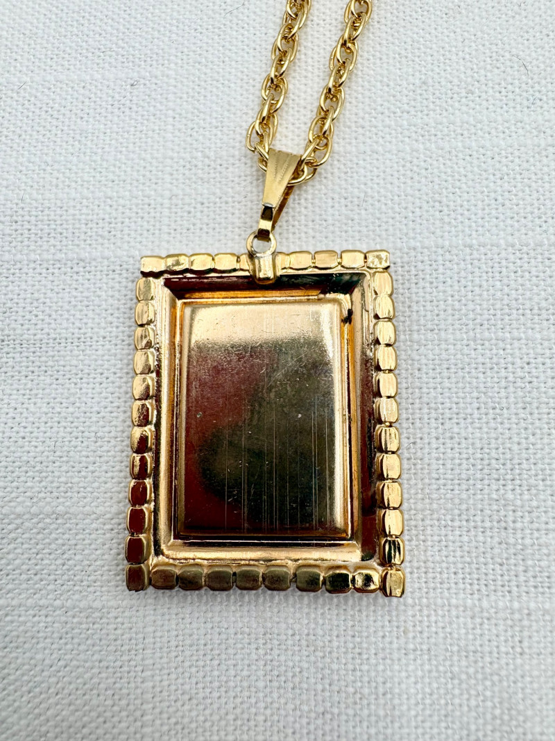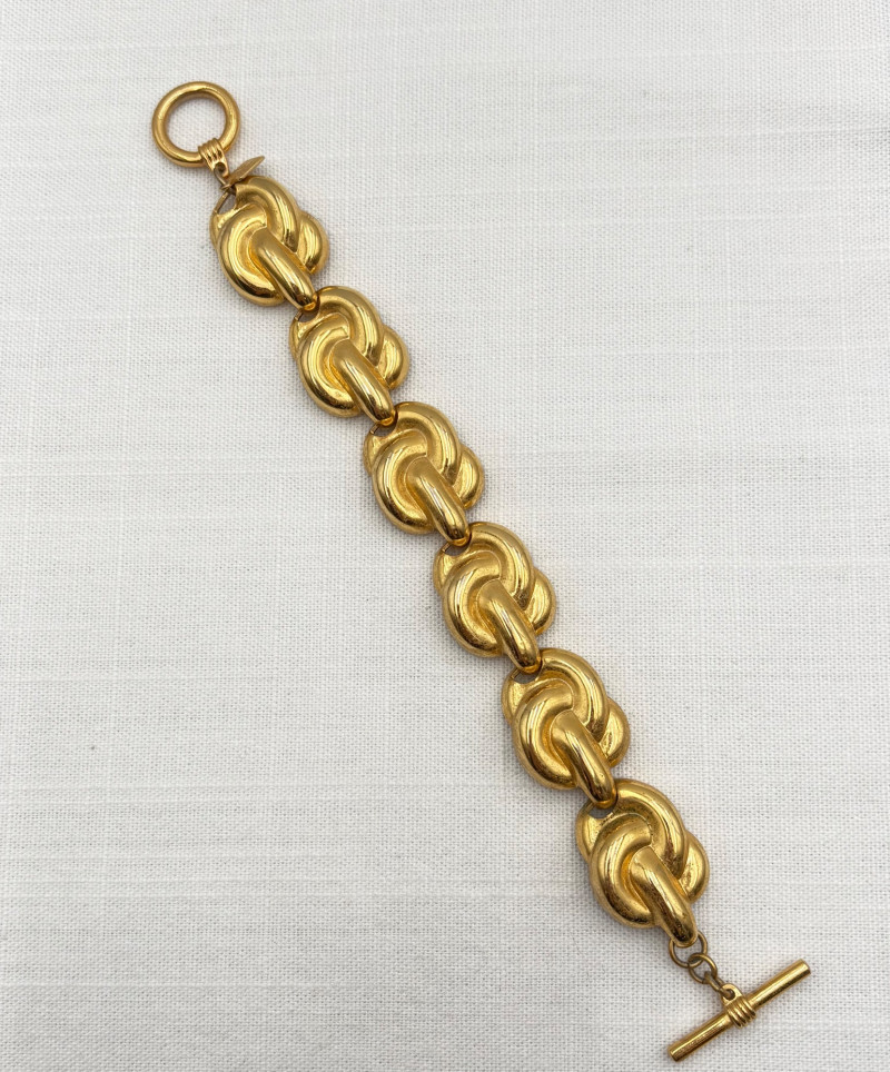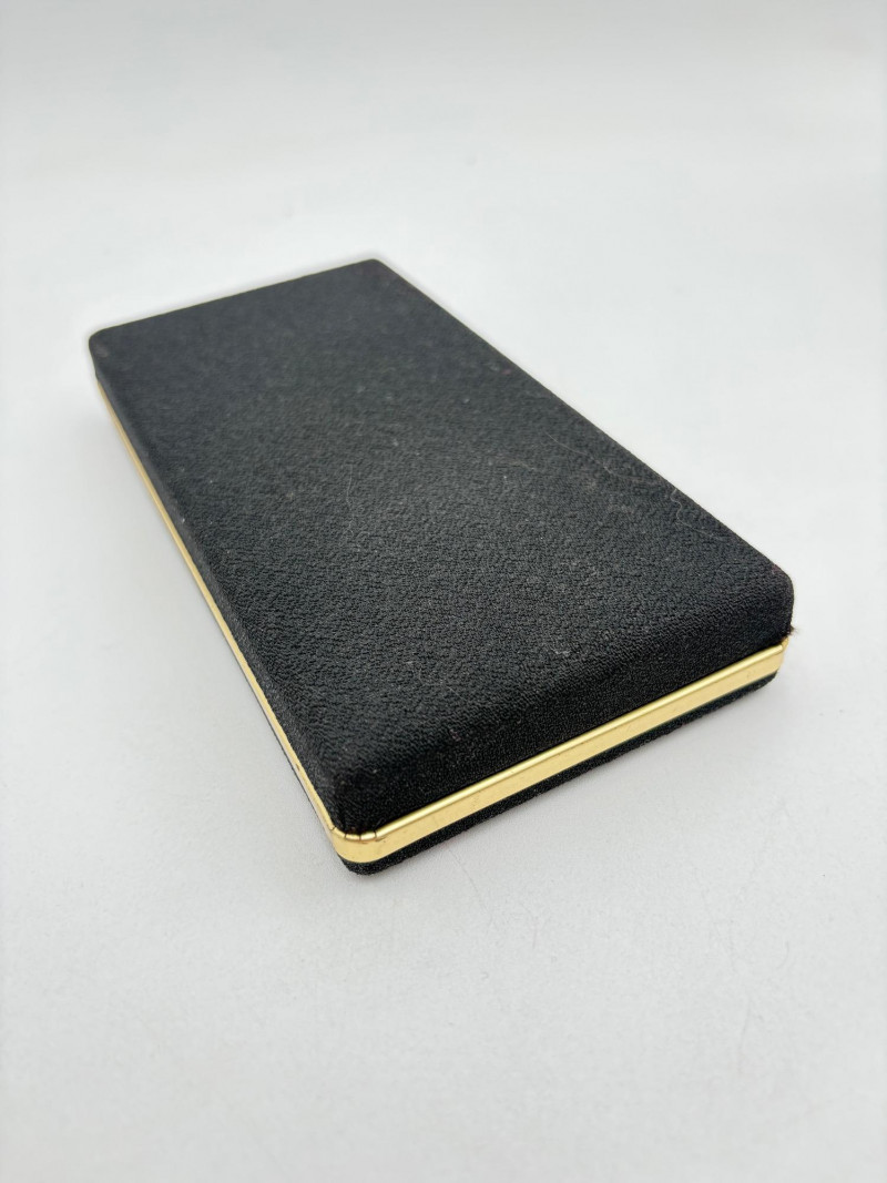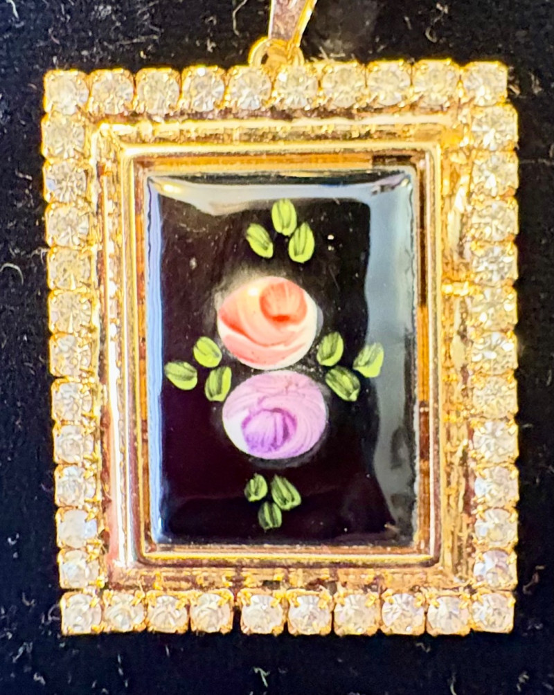 This grouping of jewelry doesn't have a lot in common except for classic understated design. Set of baroque pearls from Nolan Miller in grey with sparkly clasp. Measures 29" L end to end. Comes with original grey box and information, but box is only in ok condition. Sparkly black & gold-tone bracelet with rhinestones has hinged side and slide-in clasp. Measures just over 2" across horizontally. Made in hefty cast metal, but no maker mark. Anne Klein gold-tone bracelet in pseudo-braid with toggle. Measures approx. 7.5" from toggle to loop. Black enamel floral necklace from Casini of London. Square pendant has flowers that appear to be hand-painted with French enamel. The surround on pendant is composed of man-made diamonds. Chain measures 24" from clasp to loop. Pair of marcasite pins - the larger can also be used as a necklace if hung on a chain. Neither has a maker mark, but the smaller says "Made in Bethlehem" on the reverse. Larger measures 2" wide while the smaller measures 1.5" W.