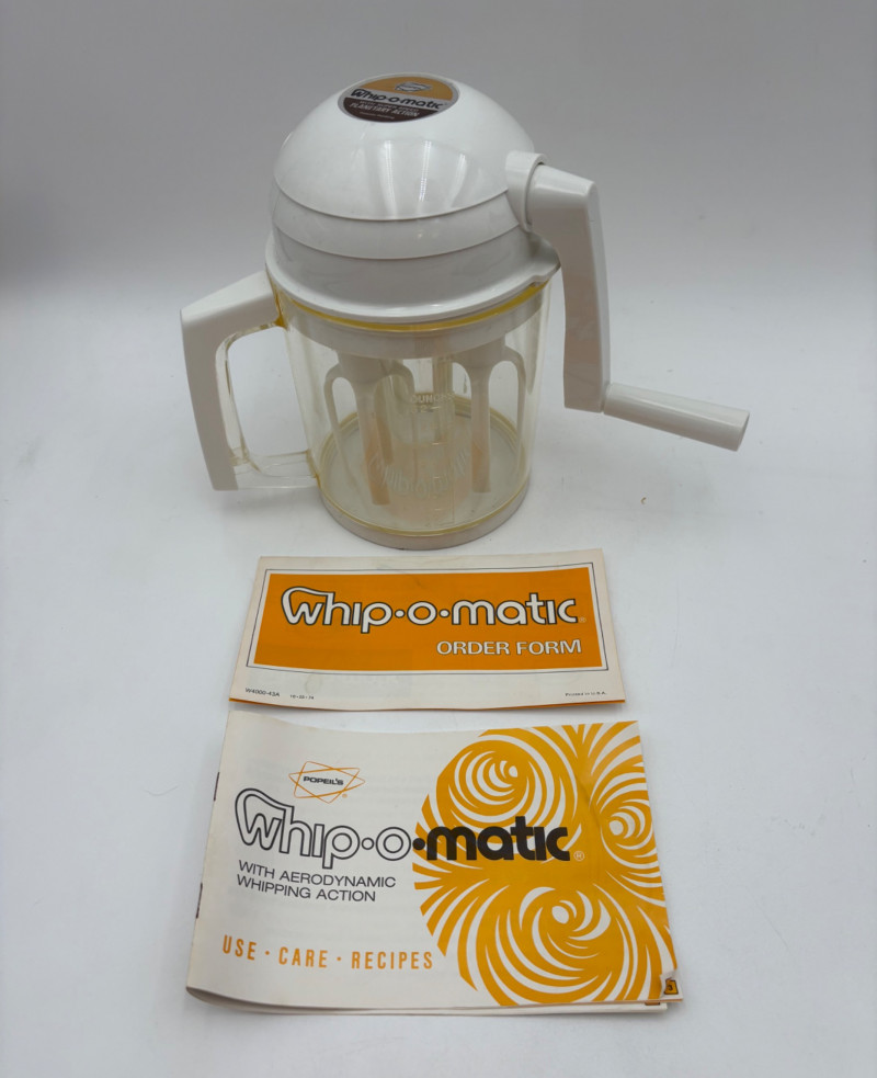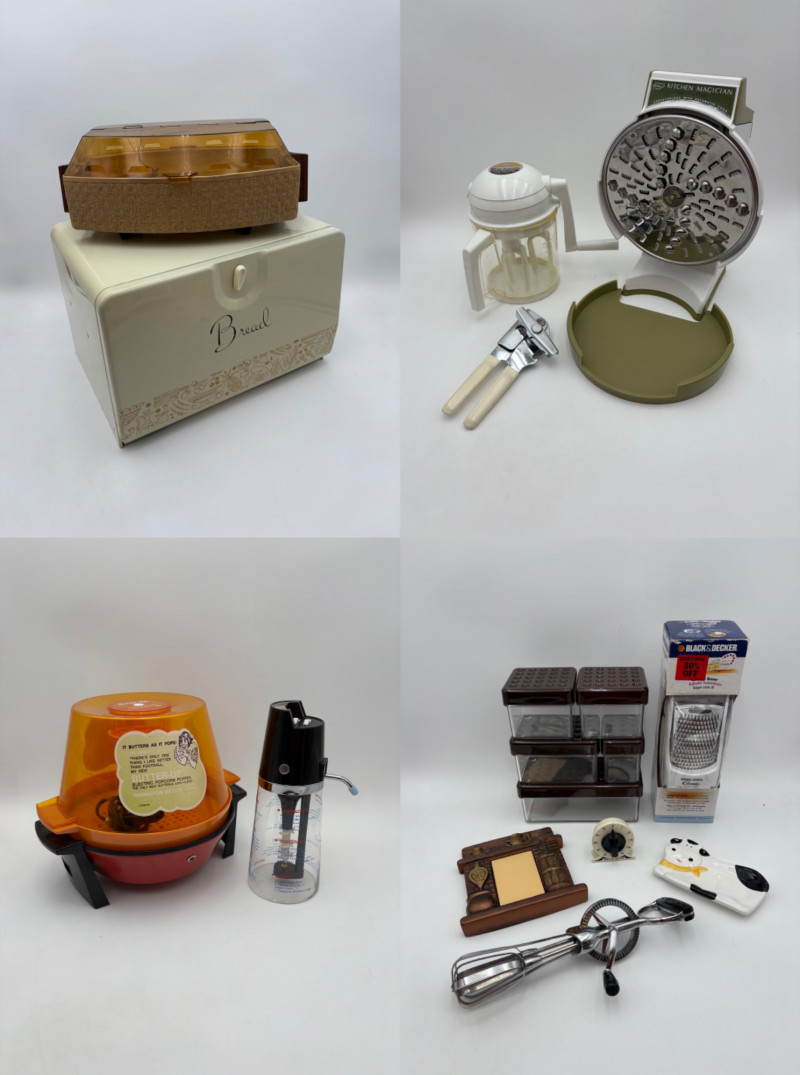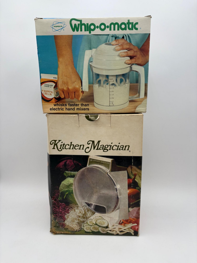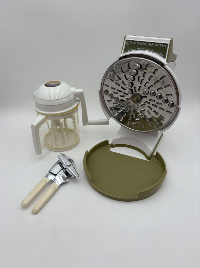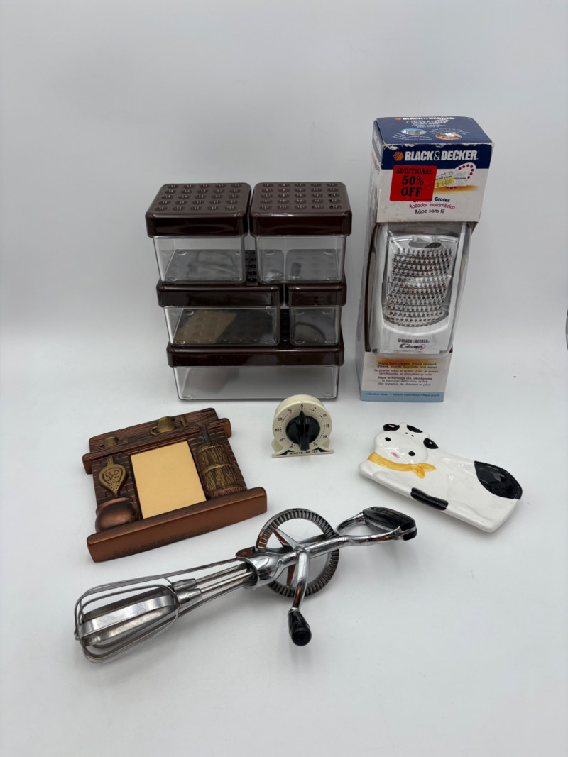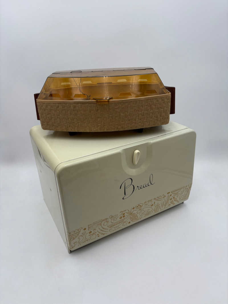 Wonderful mix of items for your vintage kitchen! Beige metal bread box from Harvel-Kilgore with nice graphic detailing. Front panel locking door drops down to the counter on a hinge and inside is room for two loaves of bread and a shelf for baked items. In decent vintage condition but definitely shows a bit of use and some flaws. Measures 10" H x 15" W x 11" L. Saltan Bun Warmer with wicker detailing and fold back lid. Warms when plugged in and comes with all instruction booklets. Shows a bit of wear on plastic lid. Hamilton Beach Butter-Up self-buttering electric popcorn popper. Unique system butters as the popcorn pops. Very 1970s in design. Comes with instruction booklet and powers up. Measures 10" H x 12" across. Action Drink o’ Matic battery powered drink mixer. Fully portable - runs on 2 C batteries so it can be taken to the beach and has printed drink recipes on the glass. Model# 5451. Appears to be relatively unused. Measures approximately 10" H (makes us wax rhapsodic about The Bon's housewares department from so long ago.....) Popeil Kitchen Magician in green and white plastic. Appears to be complete. Approximately 13" H. 1970. Popeil's Whip-o-Matic manual whisker for whipping cream, egg whites, omelets, etc. Measures 8" H. 1974. Vintage Swing-Away metal can opener with white vinyl on handles. Ingrid Corporation stacking 5-piece storage set with brown lids. Appears to be unused. Largest measures approx. 3" H X 8" L x 4" D. Chalkwear memo pad from Miller Studio. 1963. Black & Decker Gizmo Shredder. Ergonomic grater with three interchangeable blades. New in box. Mark Time timer in white plastic with black lettering. Vintage stainless-steel manual eggbeater. Measures approximately 11" H. Farm animal ceramic spoon rest. Bread
