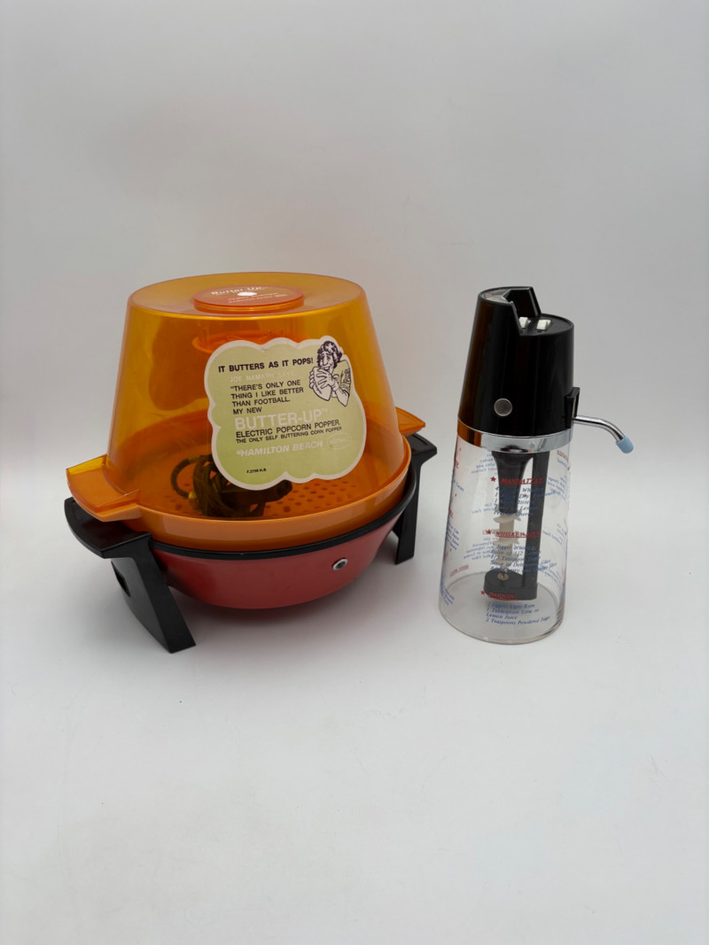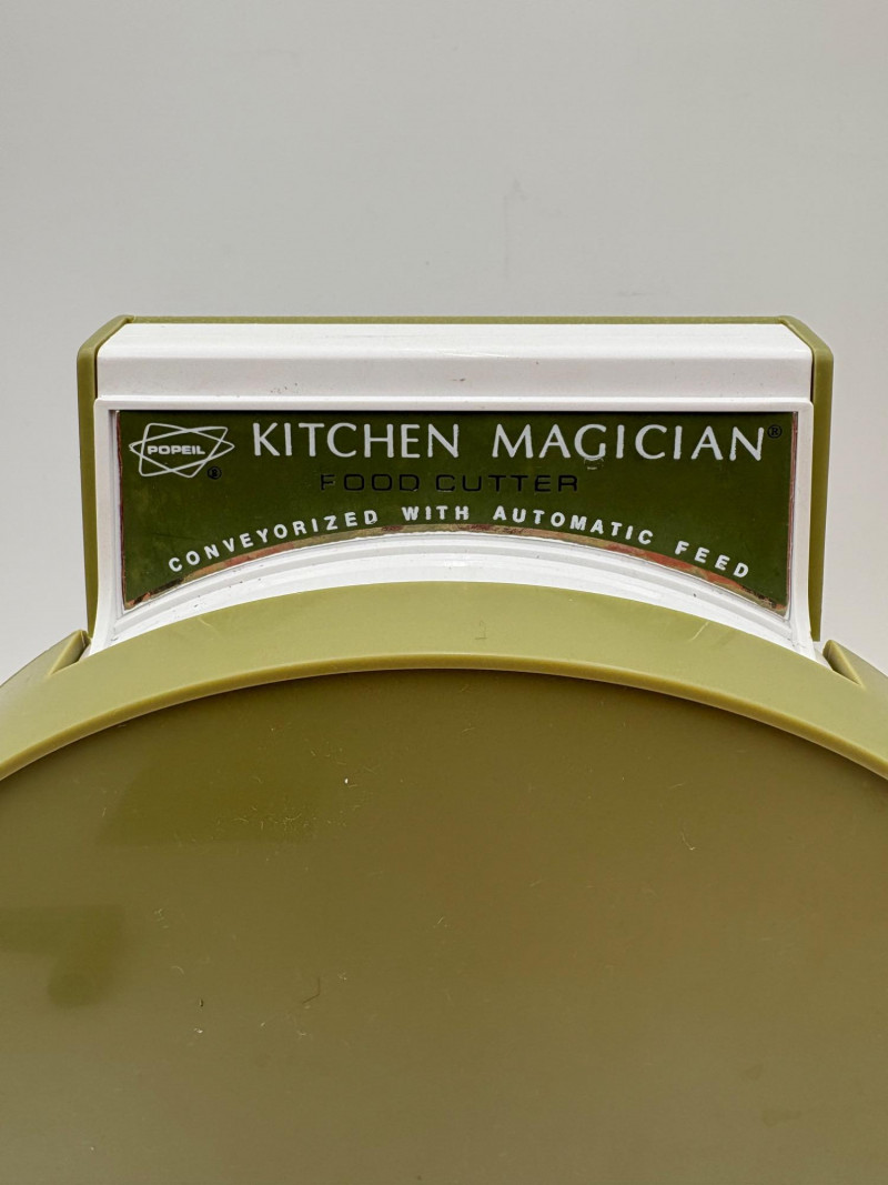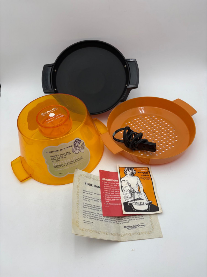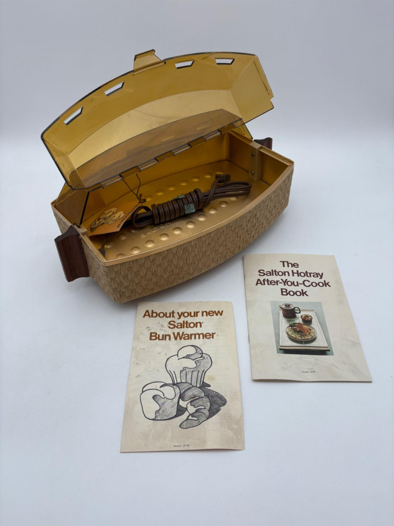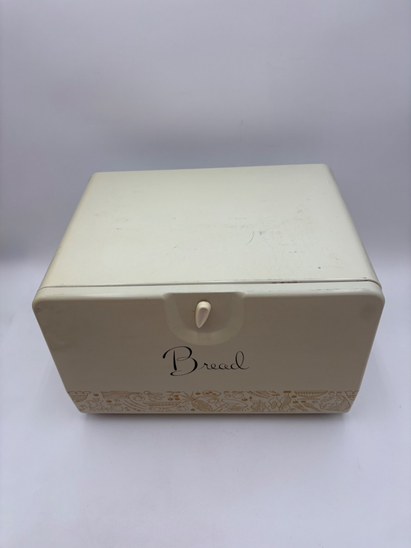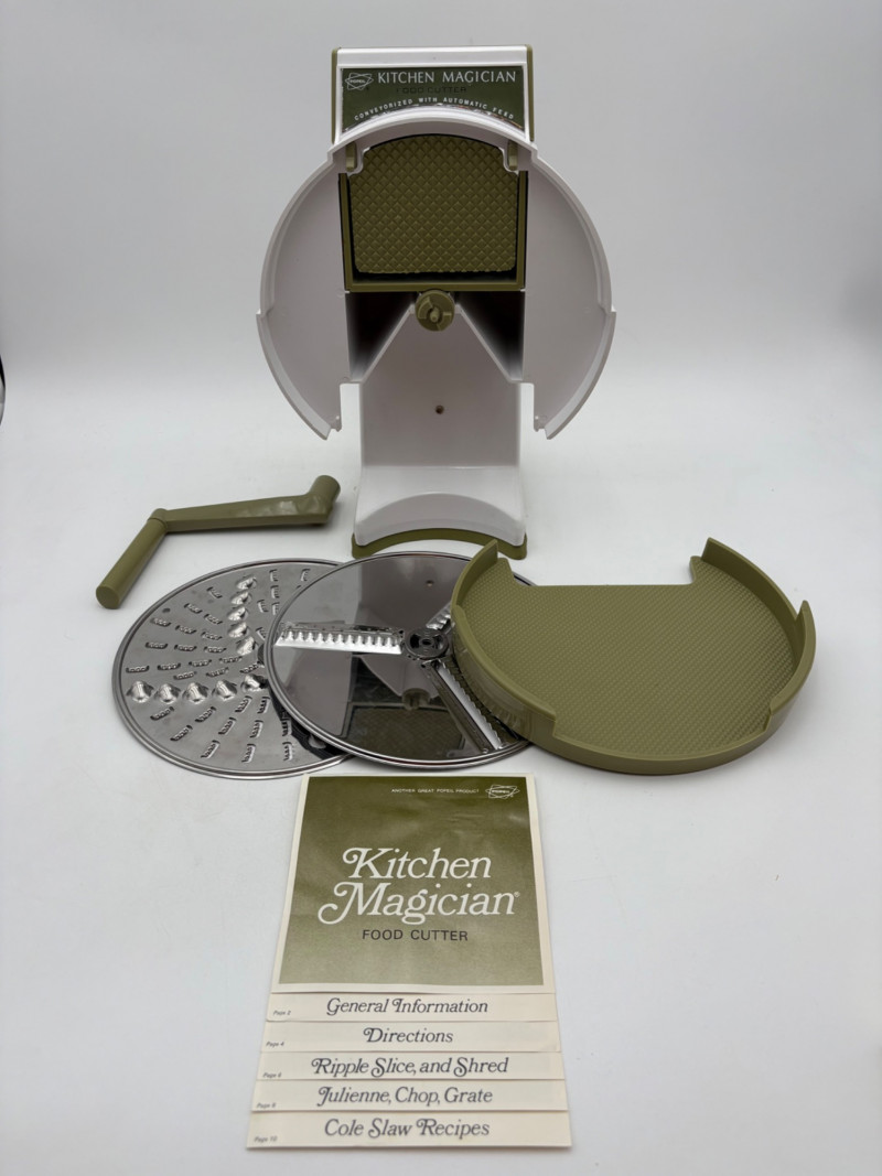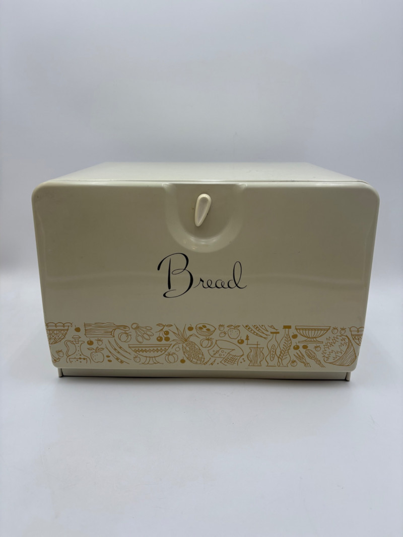 Wonderful mix of items for your vintage kitchen! Beige metal bread box from Harvel-Kilgore with nice graphic detailing. Front panel locking door drops down to the counter on a hinge and inside is room for two loaves of bread and a shelf for baked items. In decent vintage condition but definitely shows a bit of use and some flaws. Measures 10" H x 15" W x 11" L. Saltan Bun Warmer with wicker detailing and fold back lid. Warms when plugged in and comes with all instruction booklets. Shows a bit of wear on plastic lid. Hamilton Beach Butter-Up self-buttering electric popcorn popper. Unique system butters as the popcorn pops. Very 1970s in design. Comes with instruction booklet and powers up. Measures 10" H x 12" across. Action Drink o’ Matic battery powered drink mixer. Fully portable - runs on 2 C batteries so it can be taken to the beach and has printed drink recipes on the glass. Model# 5451. Appears to be relatively unused. Measures approximately 10" H (makes us wax rhapsodic about The Bon's housewares department from so long ago.....) Popeil Kitchen Magician in green and white plastic. Appears to be complete. Approximately 13" H. 1970. Popeil's Whip-o-Matic manual whisker for whipping cream, egg whites, omelets, etc. Measures 8" H. 1974. Vintage Swing-Away metal can opener with white vinyl on handles. Ingrid Corporation stacking 5-piece storage set with brown lids. Appears to be unused. Largest measures approx. 3" H X 8" L x 4" D. Chalkwear memo pad from Miller Studio. 1963. Black & Decker Gizmo Shredder. Ergonomic grater with three interchangeable blades. New in box. Mark Time timer in white plastic with black lettering. Vintage stainless-steel manual eggbeater. Measures approximately 11" H. Farm animal ceramic spoon rest. Bread
