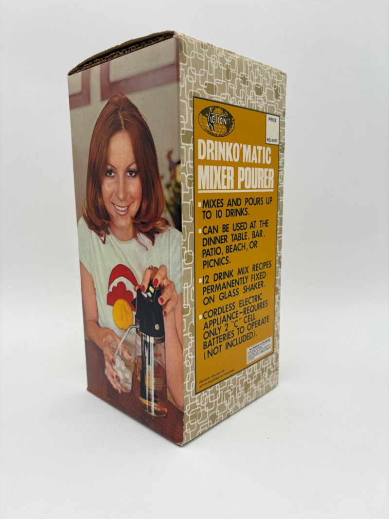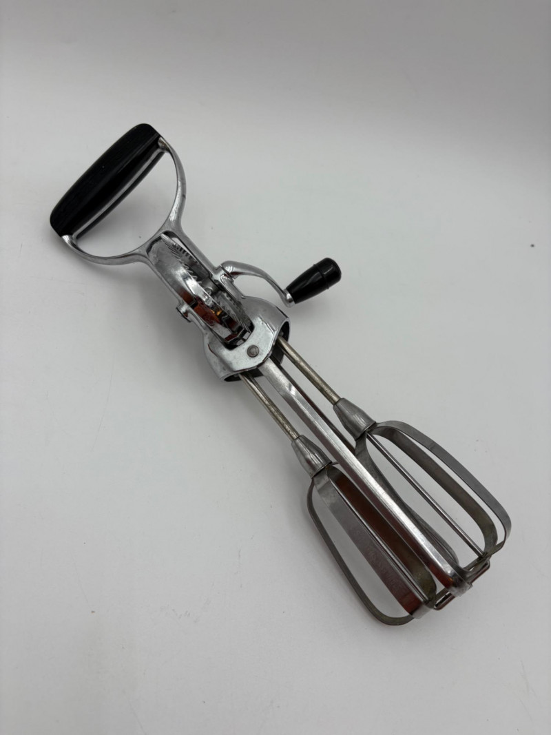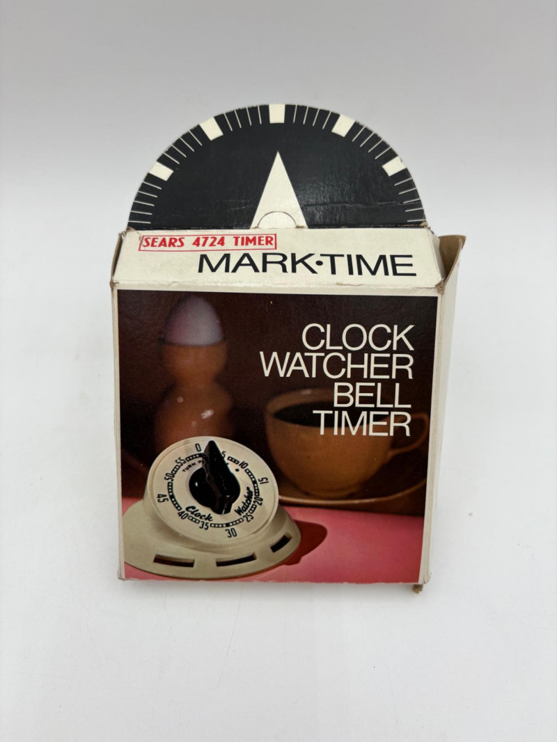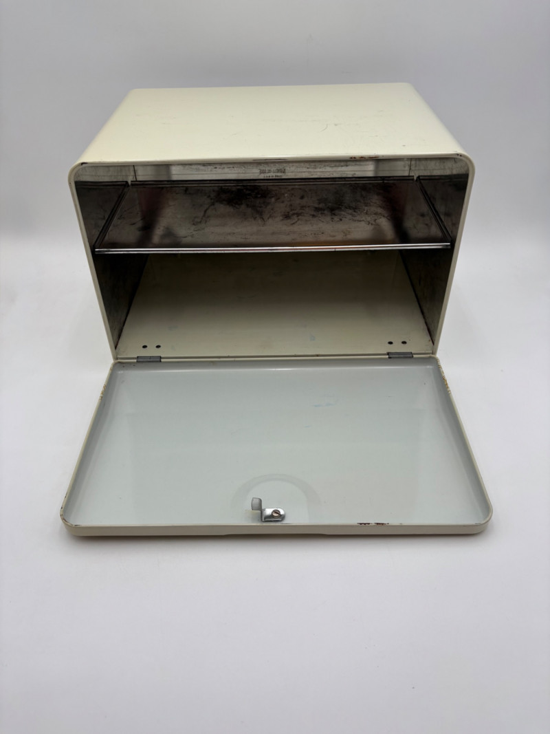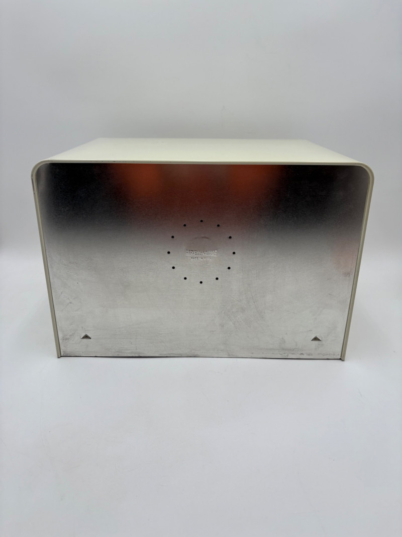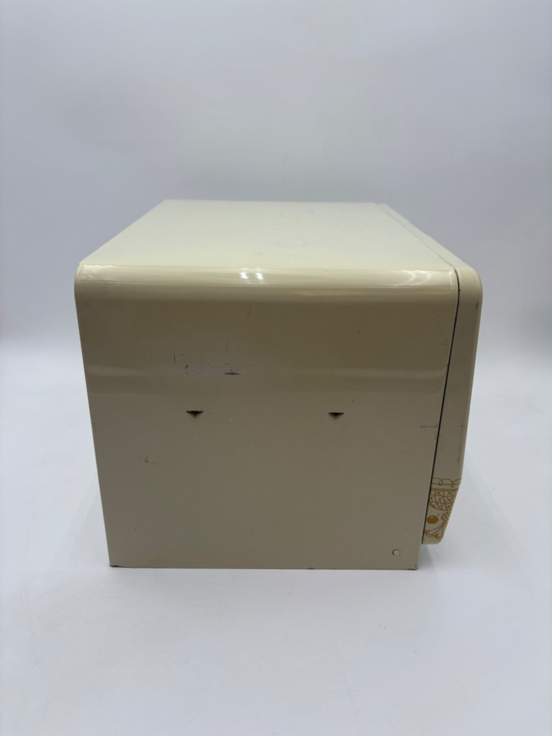 Wonderful mix of items for your vintage kitchen! Beige metal bread box from Harvel-Kilgore with nice graphic detailing. Front panel locking door drops down to the counter on a hinge and inside is room for two loaves of bread and a shelf for baked items. In decent vintage condition but definitely shows a bit of use and some flaws. Measures 10" H x 15" W x 11" L. Saltan Bun Warmer with wicker detailing and fold back lid. Warms when plugged in and comes with all instruction booklets. Shows a bit of wear on plastic lid. Hamilton Beach Butter-Up self-buttering electric popcorn popper. Unique system butters as the popcorn pops. Very 1970s in design. Comes with instruction booklet and powers up. Measures 10" H x 12" across. Action Drink o’ Matic battery powered drink mixer. Fully portable - runs on 2 C batteries so it can be taken to the beach and has printed drink recipes on the glass. Model# 5451. Appears to be relatively unused. Measures approximately 10" H (makes us wax rhapsodic about The Bon's housewares department from so long ago.....) Popeil Kitchen Magician in green and white plastic. Appears to be complete. Approximately 13" H. 1970. Popeil's Whip-o-Matic manual whisker for whipping cream, egg whites, omelets, etc. Measures 8" H. 1974. Vintage Swing-Away metal can opener with white vinyl on handles. Ingrid Corporation stacking 5-piece storage set with brown lids. Appears to be unused. Largest measures approx. 3" H X 8" L x 4" D. Chalkwear memo pad from Miller Studio. 1963. Black & Decker Gizmo Shredder. Ergonomic grater with three interchangeable blades. New in box. Mark Time timer in white plastic with black lettering. Vintage stainless-steel manual eggbeater. Measures approximately 11" H. Farm animal ceramic spoon rest. Bread