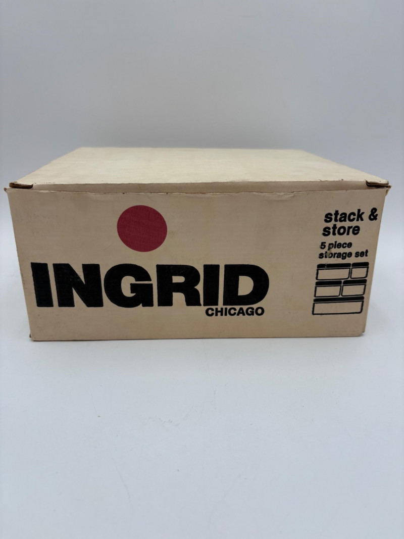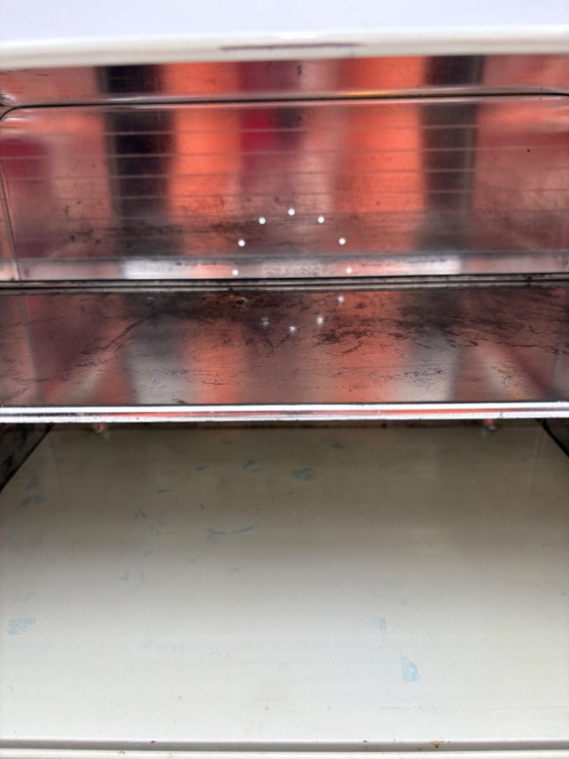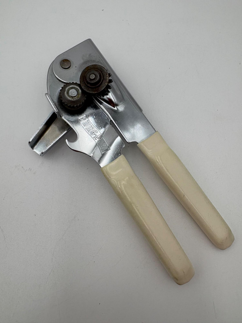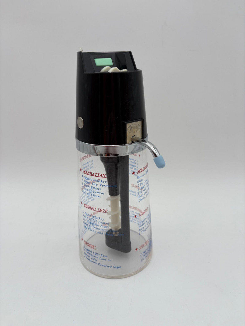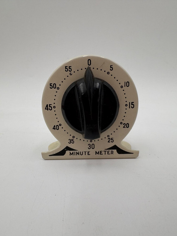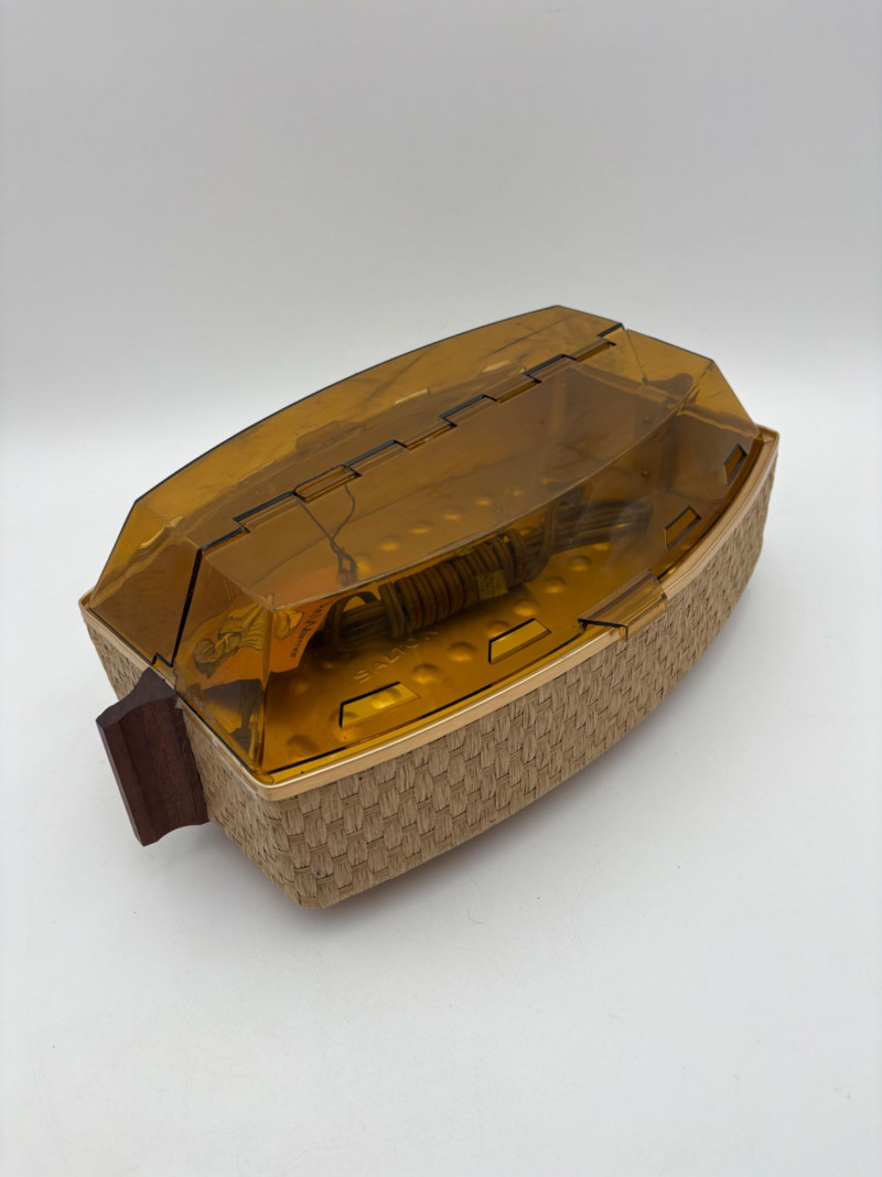 Wonderful mix of items for your vintage kitchen! Beige metal bread box from Harvel-Kilgore with nice graphic detailing. Front panel locking door drops down to the counter on a hinge and inside is room for two loaves of bread and a shelf for baked items. In decent vintage condition but definitely shows a bit of use and some flaws. Measures 10" H x 15" W x 11" L. Saltan Bun Warmer with wicker detailing and fold back lid. Warms when plugged in and comes with all instruction booklets. Shows a bit of wear on plastic lid. Hamilton Beach Butter-Up self-buttering electric popcorn popper. Unique system butters as the popcorn pops. Very 1970s in design. Comes with instruction booklet and powers up. Measures 10" H x 12" across. Action Drink o’ Matic battery powered drink mixer. Fully portable - runs on 2 C batteries so it can be taken to the beach and has printed drink recipes on the glass. Model# 5451. Appears to be relatively unused. Measures approximately 10" H (makes us wax rhapsodic about The Bon's housewares department from so long ago.....) Popeil Kitchen Magician in green and white plastic. Appears to be complete. Approximately 13" H. 1970. Popeil's Whip-o-Matic manual whisker for whipping cream, egg whites, omelets, etc. Measures 8" H. 1974. Vintage Swing-Away metal can opener with white vinyl on handles. Ingrid Corporation stacking 5-piece storage set with brown lids. Appears to be unused. Largest measures approx. 3" H X 8" L x 4" D. Chalkwear memo pad from Miller Studio. 1963. Black & Decker Gizmo Shredder. Ergonomic grater with three interchangeable blades. New in box. Mark Time timer in white plastic with black lettering. Vintage stainless-steel manual eggbeater. Measures approximately 11" H. Farm animal ceramic spoon rest. Bread