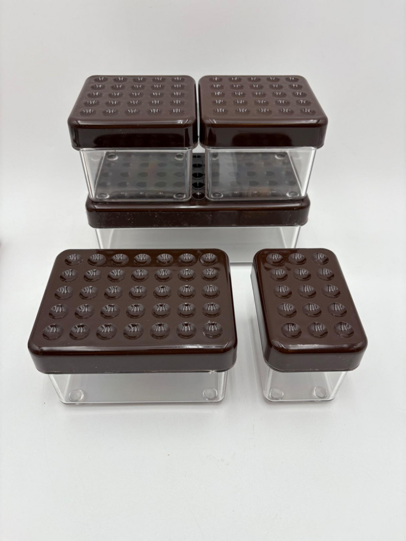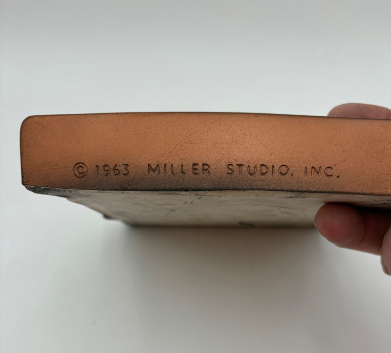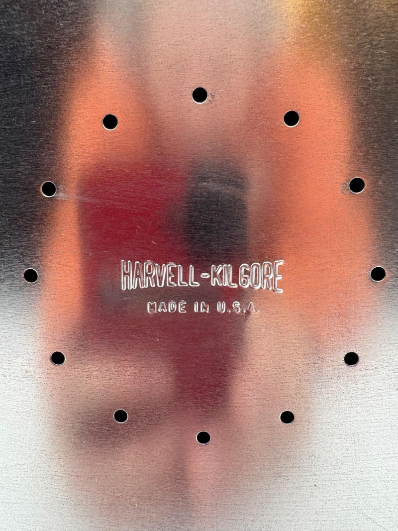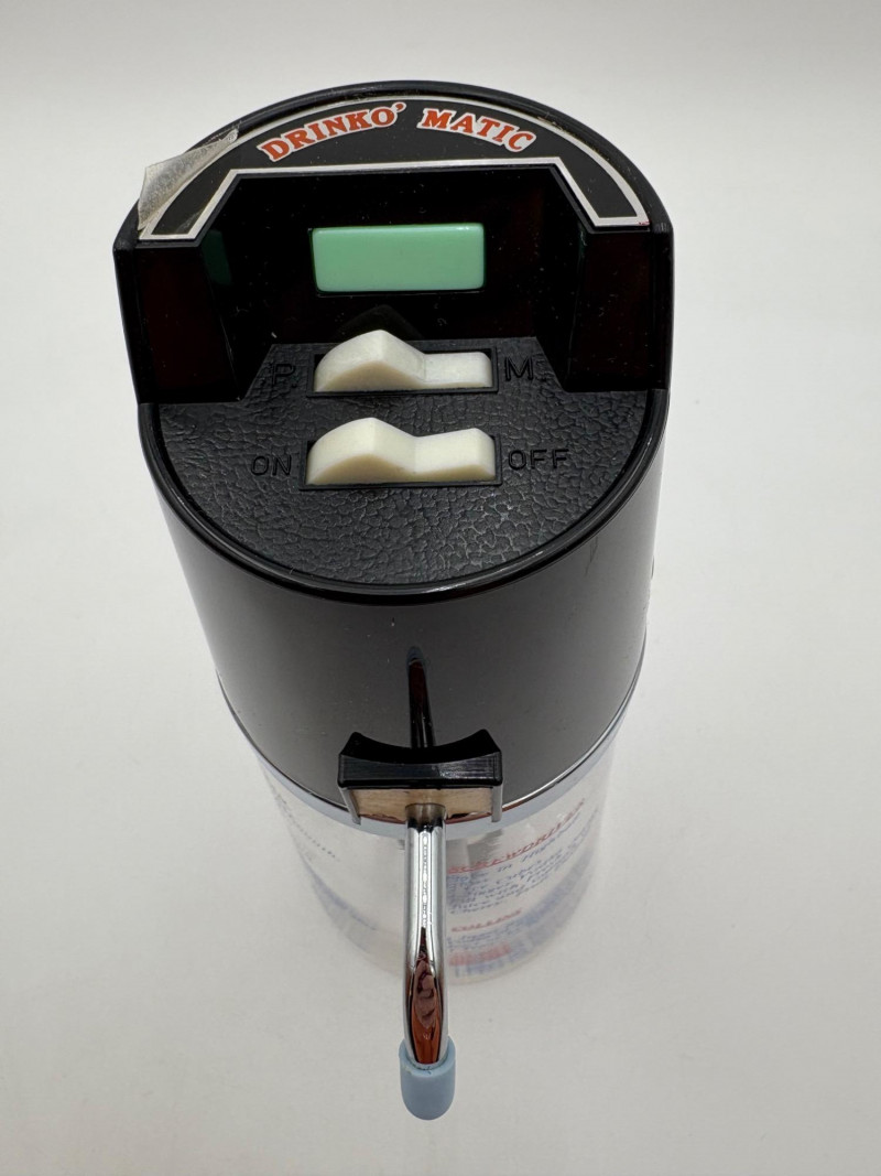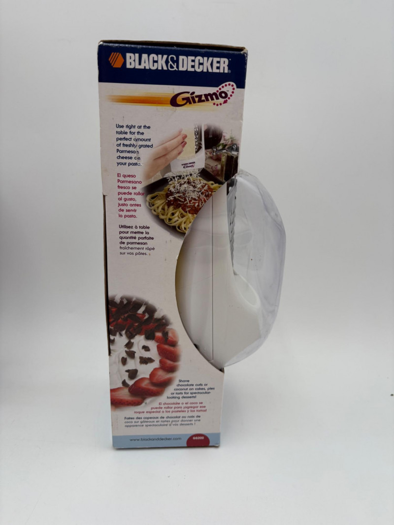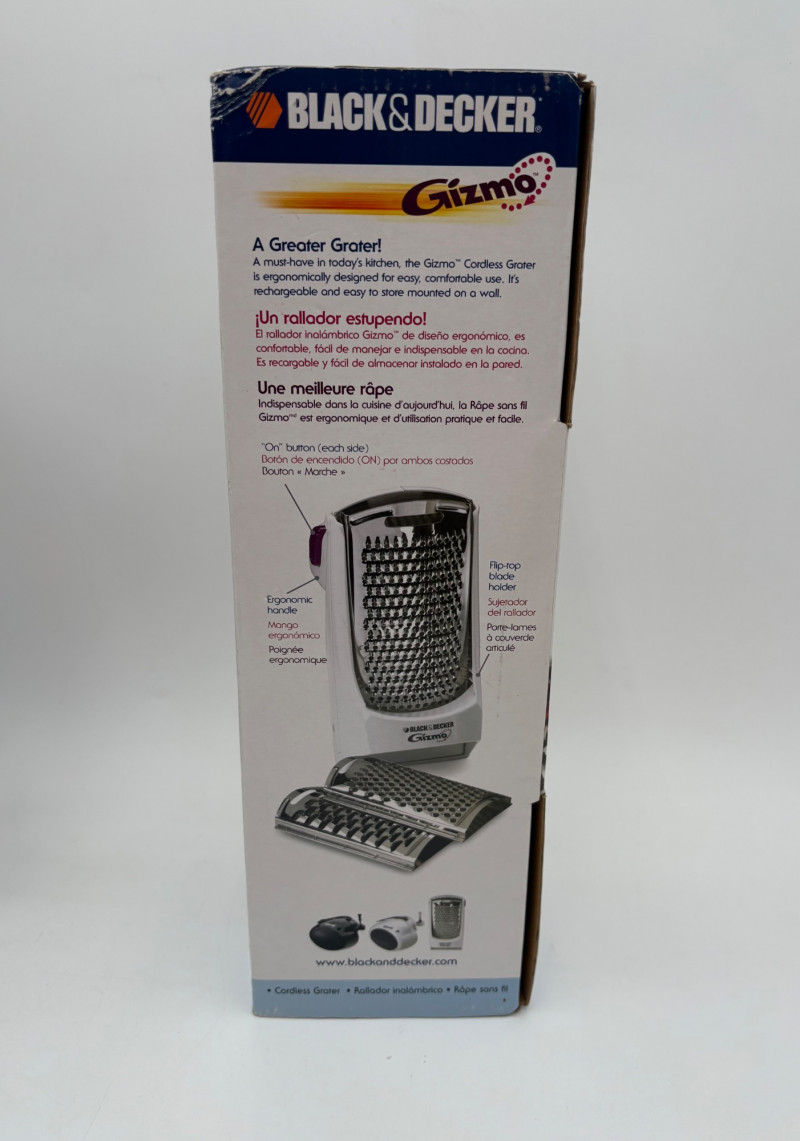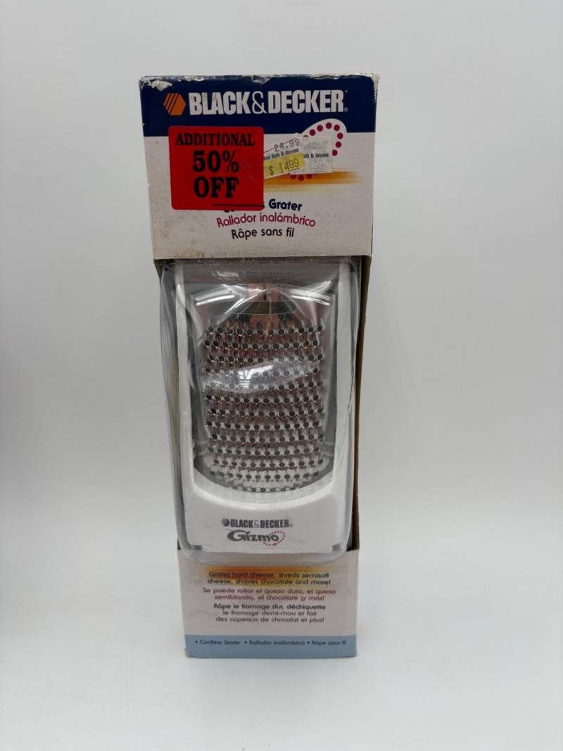 Wonderful mix of items for your vintage kitchen! Beige metal bread box from Harvel-Kilgore with nice graphic detailing. Front panel locking door drops down to the counter on a hinge and inside is room for two loaves of bread and a shelf for baked items. In decent vintage condition but definitely shows a bit of use and some flaws. Measures 10" H x 15" W x 11" L. Saltan Bun Warmer with wicker detailing and fold back lid. Warms when plugged in and comes with all instruction booklets. Shows a bit of wear on plastic lid. Hamilton Beach Butter-Up self-buttering electric popcorn popper. Unique system butters as the popcorn pops. Very 1970s in design. Comes with instruction booklet and powers up. Measures 10" H x 12" across. Action Drink o’ Matic battery powered drink mixer. Fully portable - runs on 2 C batteries so it can be taken to the beach and has printed drink recipes on the glass. Model# 5451. Appears to be relatively unused. Measures approximately 10" H (makes us wax rhapsodic about The Bon's housewares department from so long ago.....) Popeil Kitchen Magician in green and white plastic. Appears to be complete. Approximately 13" H. 1970. Popeil's Whip-o-Matic manual whisker for whipping cream, egg whites, omelets, etc. Measures 8" H. 1974. Vintage Swing-Away metal can opener with white vinyl on handles. Ingrid Corporation stacking 5-piece storage set with brown lids. Appears to be unused. Largest measures approx. 3" H X 8" L x 4" D. Chalkwear memo pad from Miller Studio. 1963. Black & Decker Gizmo Shredder. Ergonomic grater with three interchangeable blades. New in box. Mark Time timer in white plastic with black lettering. Vintage stainless-steel manual eggbeater. Measures approximately 11" H. Farm animal ceramic spoon rest. Bread