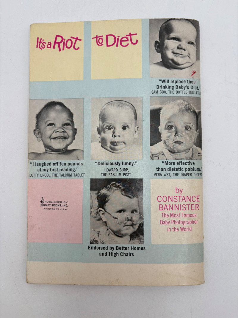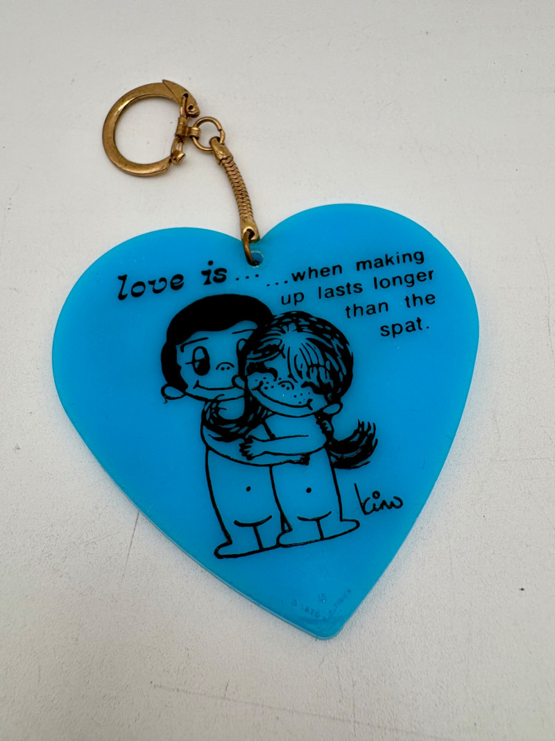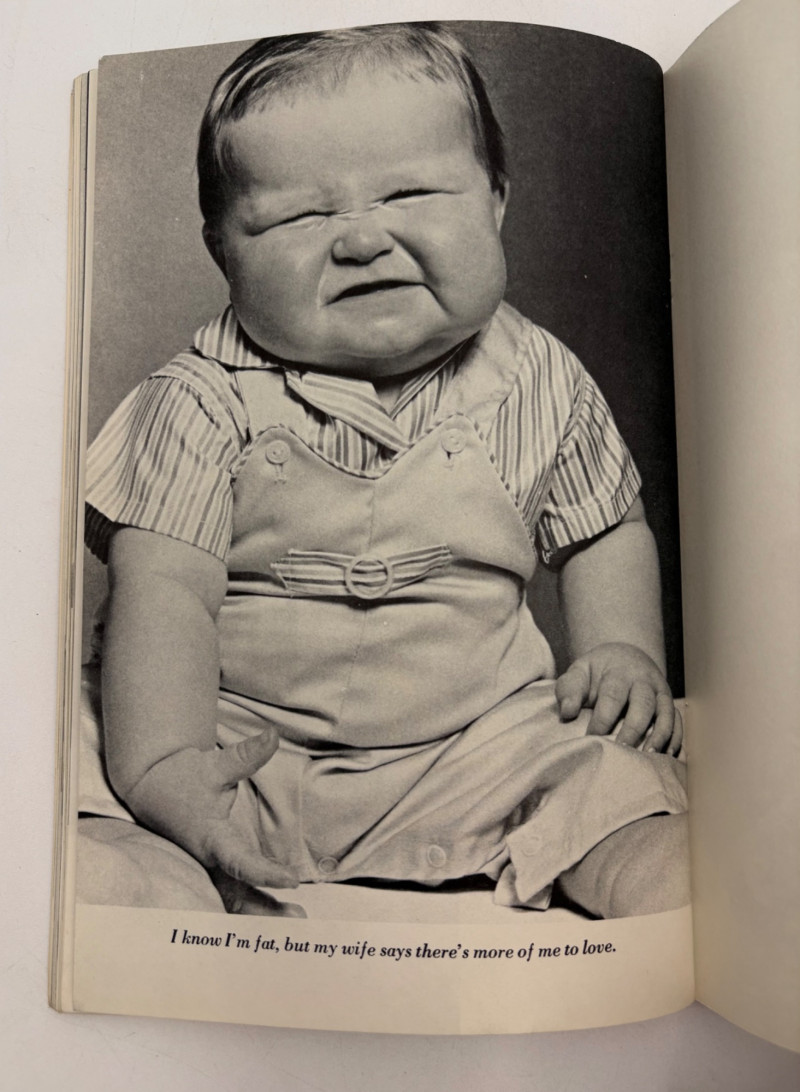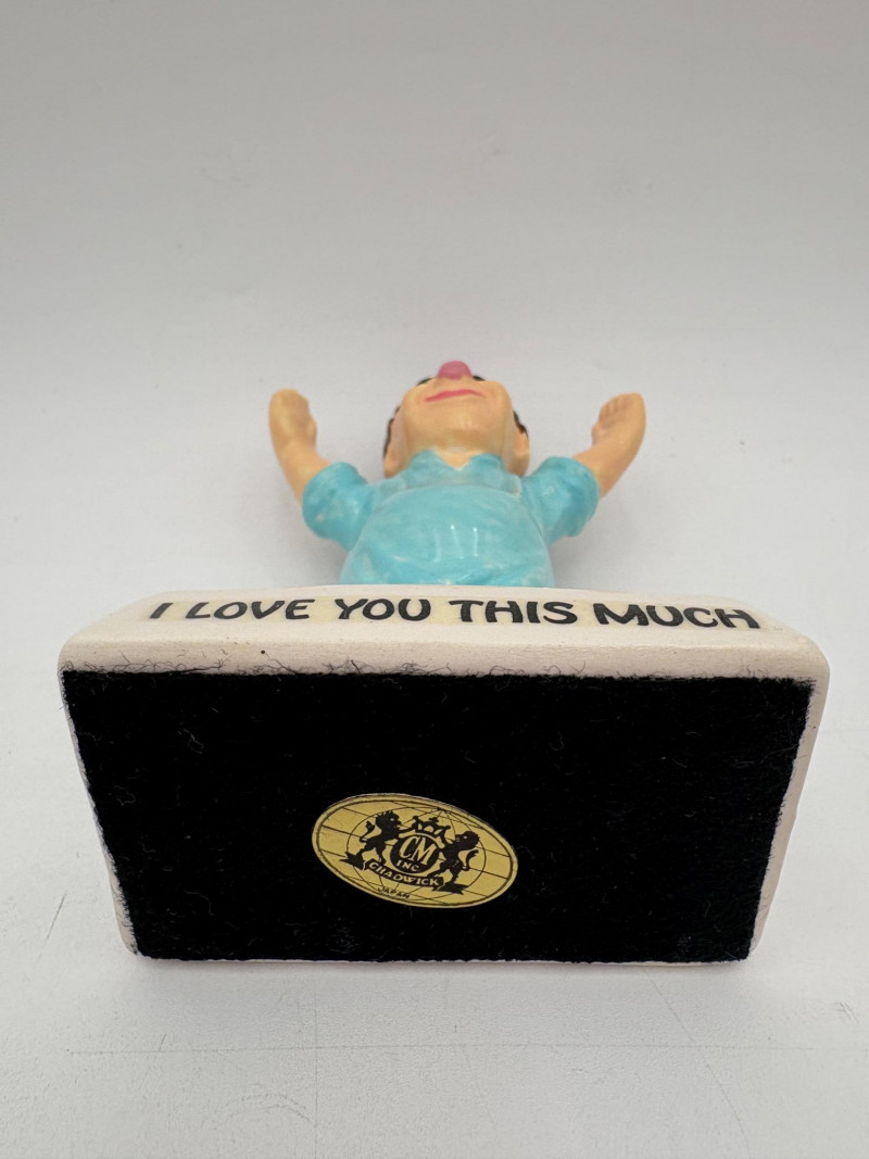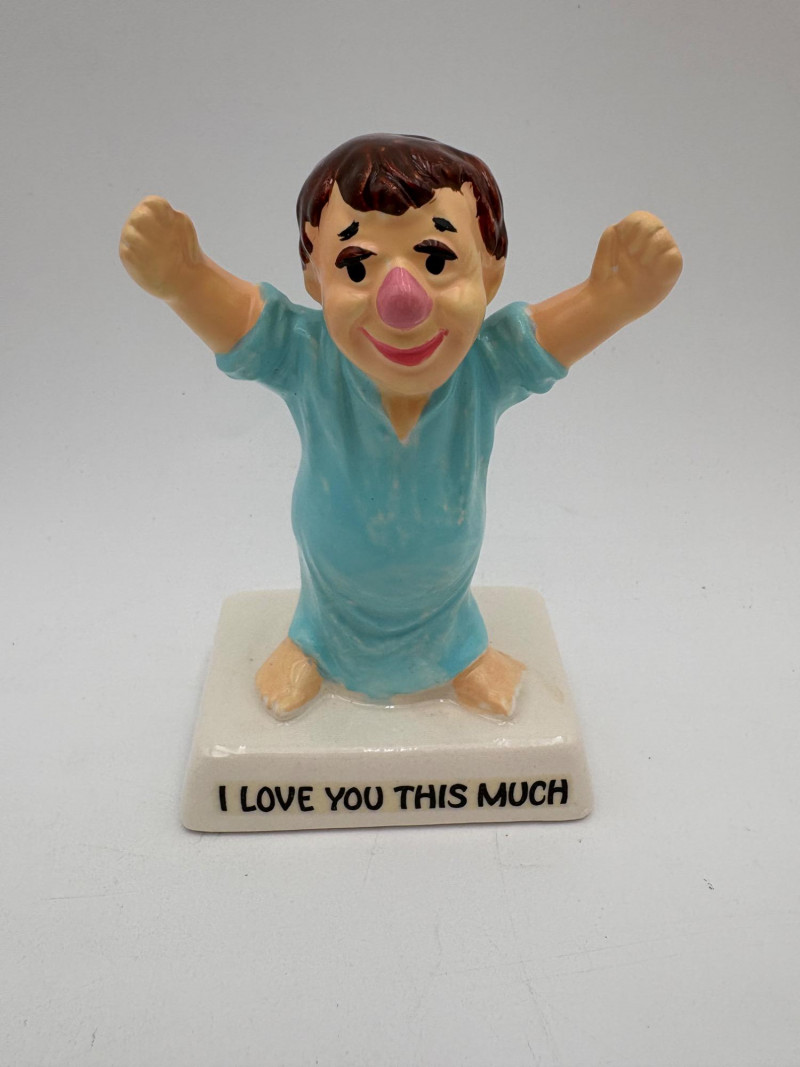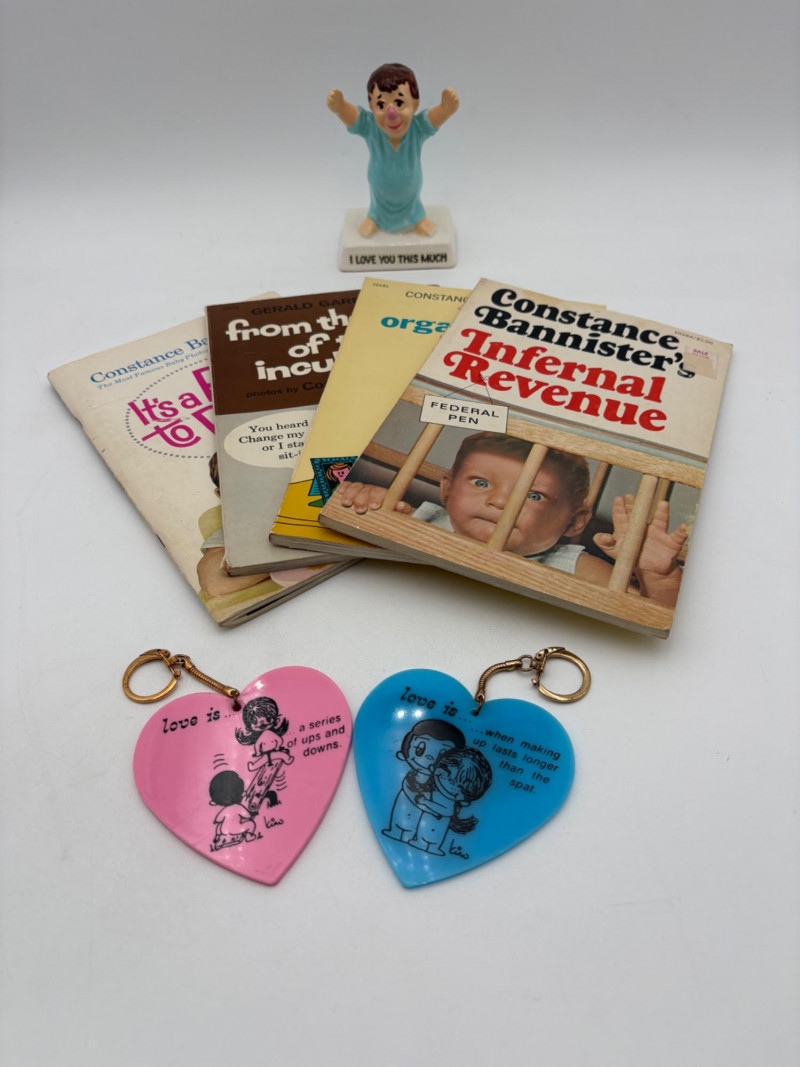 Lots of love (and humor) here! 4 Constance Bannister photo books that were immensely popular in the 1960s. Published by Esandess & Pocket Books. All in good used condition with the 3rd one having one page loose. Titles are: - Infernal Revenue (babies commenting of taxes and the IRS) - It's a Riot to Diet (babies making rude remarks about weight and eating) - From the Back of the Incubator (babies making rather stereotyped comments re: civil rights and Black tropes of the 1960s - note that it appears all the babies in this book are Black, but it still evokes a bit of "ick" in terms of stereotypes with today's sensibilities. We think the "back of the incubator" was a very intentional title) - The Organization Baby (babies making comments as if they are at the office/working a job) Classic "I Love You This Much" porcelain figurine we think EVERYONE had in the 1960s except for us! Measures approx. 5" H. From Chadwick Company. Pair of blue & pink plastic "Love" keyrings with phrases that can be innocent or have innuendo depending upon your personal take. Same image on front and back. Riot
