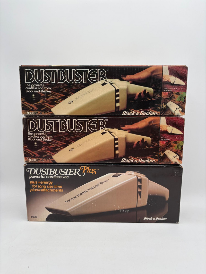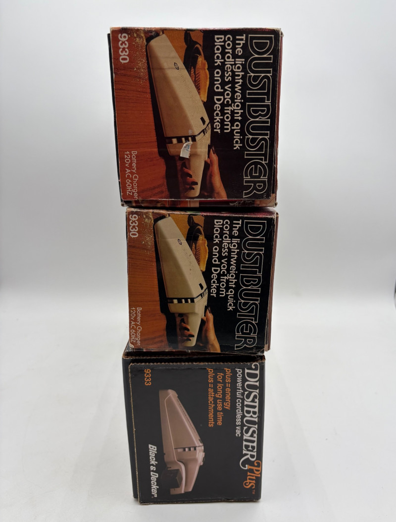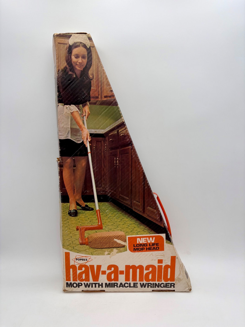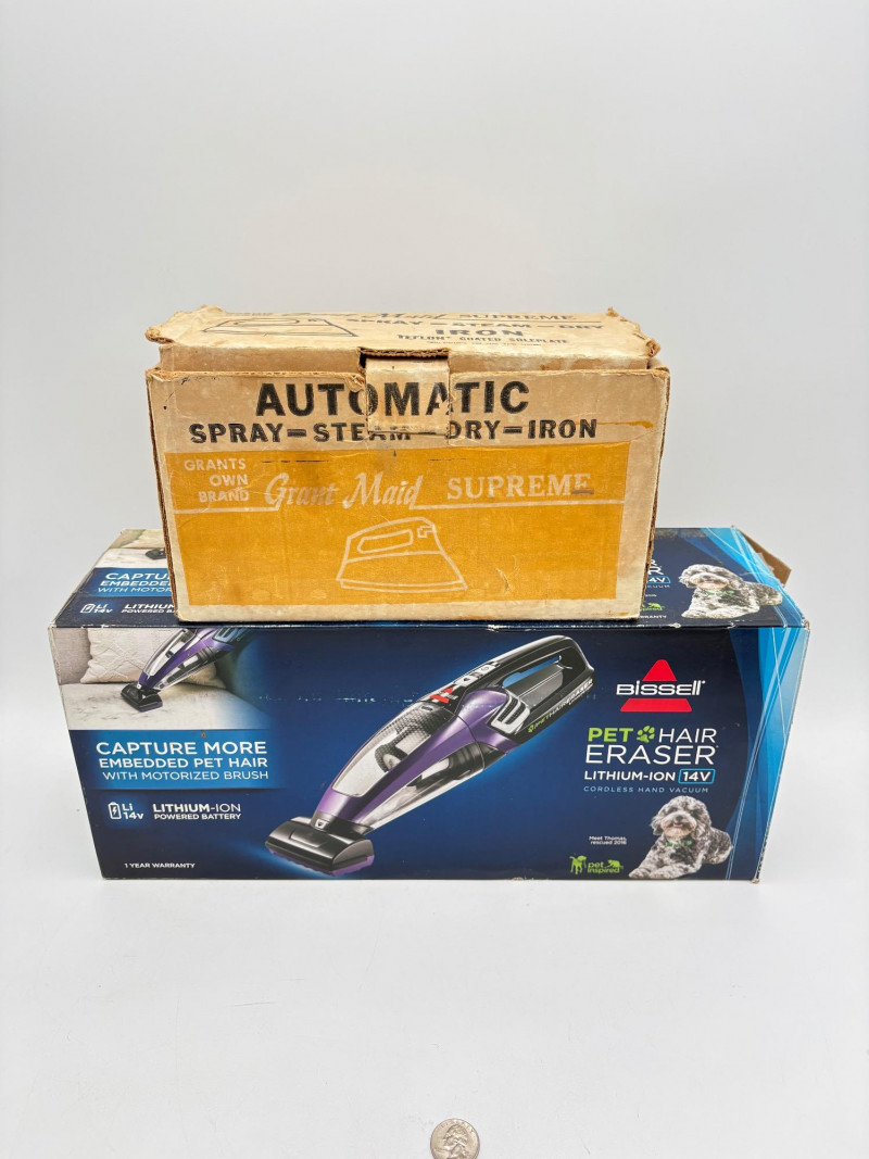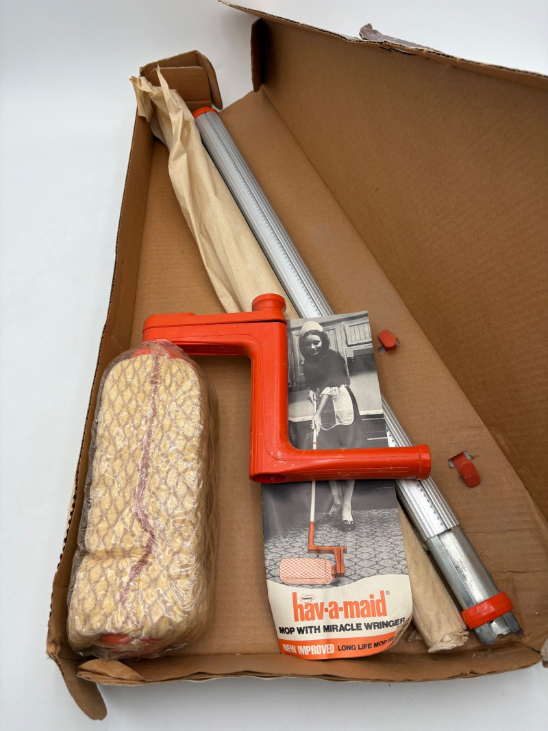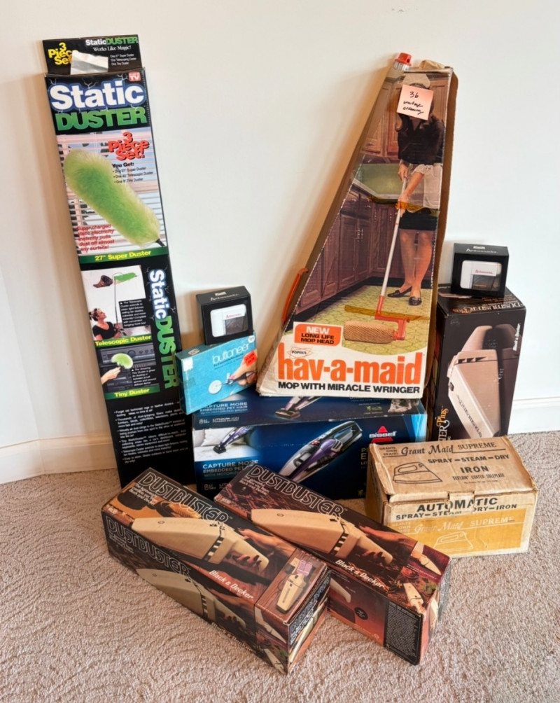Great group of vintage items for taking care of your house and wardrobe. Some of them are old, but sometimes old is better when it comes to maintenance. Lot includes: Static Duster 3-piece set with fluffy heads (27", 43", and 9"). Appears to be new and unused. Grant-Maid brand spray steam/dry iron with Teflon sole plate. This is a true work horse in your laundry room; what these older irons lack in "bells & whistles" they make up for in hardiness (we say this as a lifelong seamstresses). Powers up and gets hot. Sole plate could use a good scrub. Bissell Pet Hair Eraser cordless hand vacuum. Boxes is opened, but contents appear to be unused. 3 original Dustbusters - one is a Dustbuster Plus w/accessories. All appear to be sealed in their original packaging and unused. Buttoneer 5-second button-attacher from Ronco. Appears to be complete and seldom used. 2 Ambassador sweater shavers (purchased at Bon Marche - RIP). Both appear to be new in the original boxes. Popeil’s Hav-A-Maid mop with miracle ringer. Appears to be unused despite the box being in poor condition.
