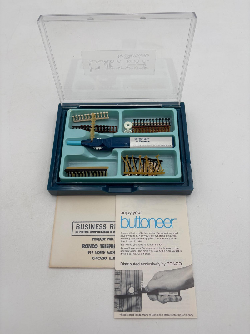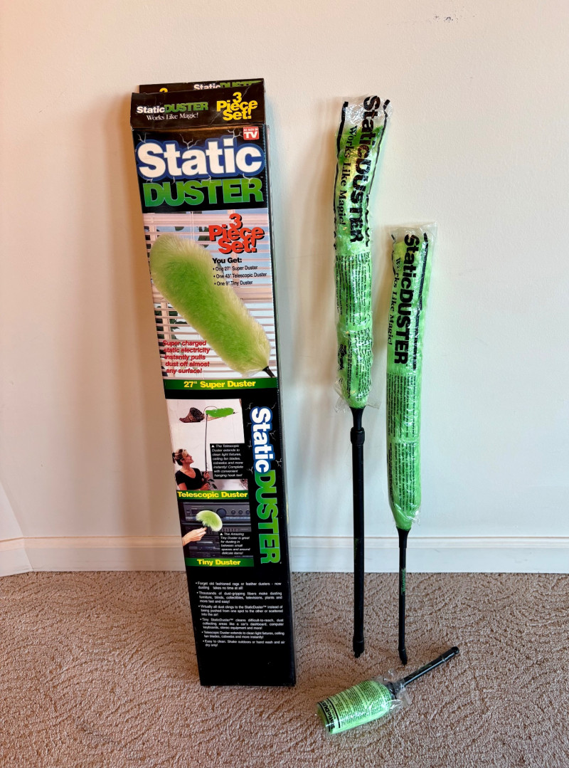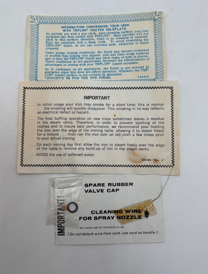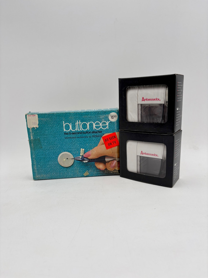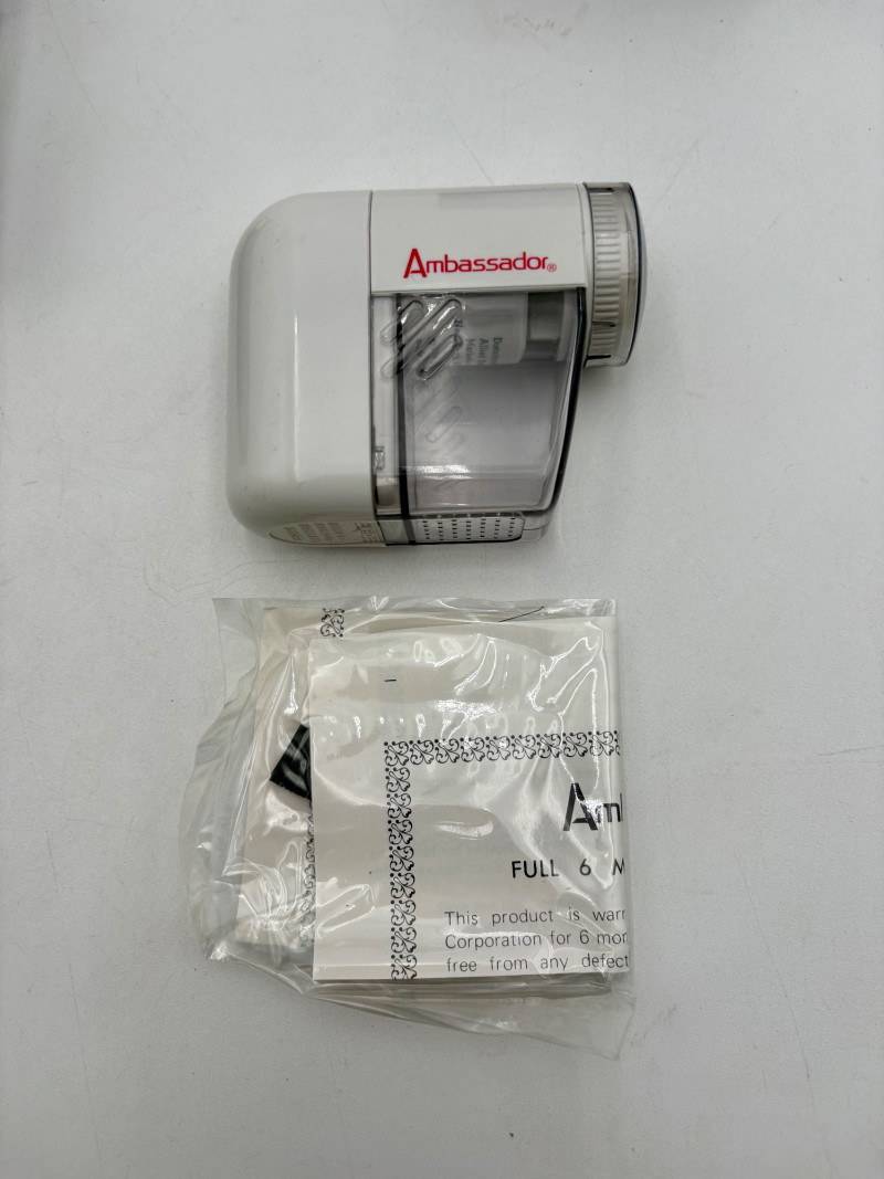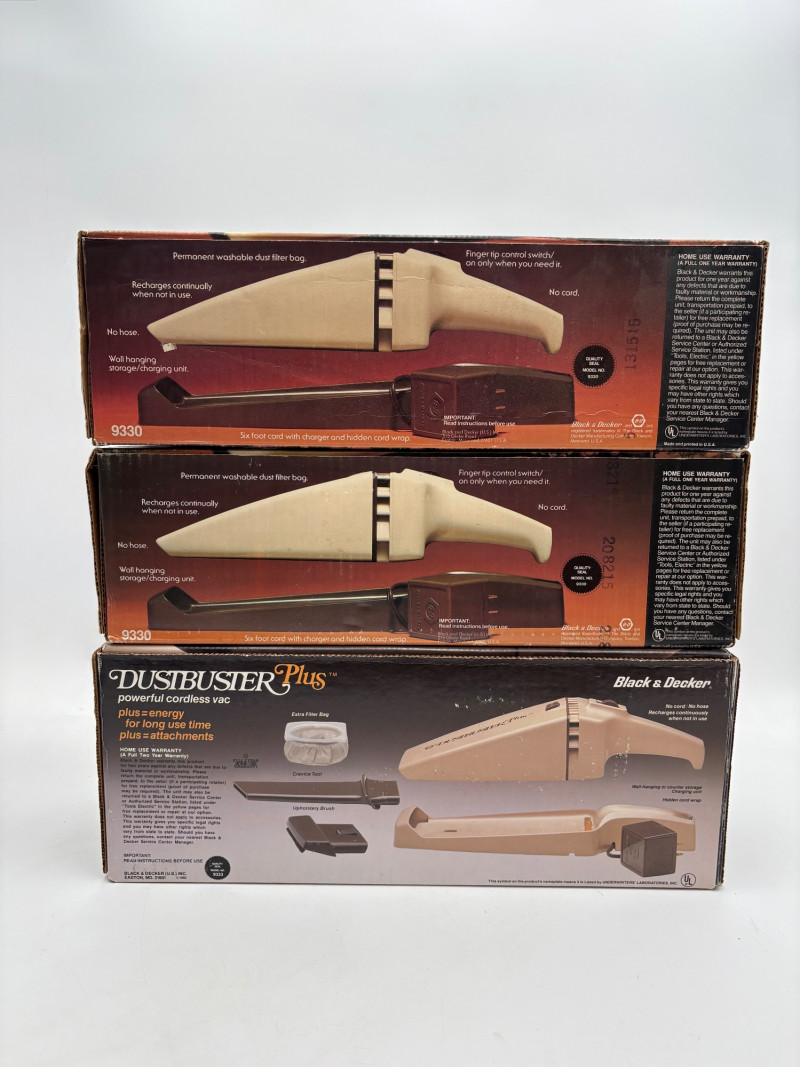 Great group of vintage items for taking care of your house and wardrobe. Some of them are old, but sometimes old is better when it comes to maintenance. Lot includes: Static Duster 3-piece set with fluffy heads (27", 43", and 9"). Appears to be new and unused. Grant-Maid brand spray steam/dry iron with Teflon sole plate. This is a true work horse in your laundry room; what these older irons lack in "bells & whistles" they make up for in hardiness (we say this as a lifelong seamstresses). Powers up and gets hot. Sole plate could use a good scrub. Bissell Pet Hair Eraser cordless hand vacuum. Boxes is opened, but contents appear to be unused. 3 original Dustbusters - one is a Dustbuster Plus w/accessories. All appear to be sealed in their original packaging and unused. Buttoneer 5-second button-attacher from Ronco. Appears to be complete and seldom used. 2 Ambassador sweater shavers (purchased at Bon Marche - RIP). Both appear to be new in the original boxes. Popeil’s Hav-A-Maid mop with miracle ringer. Appears to be unused despite the box being in poor condition.