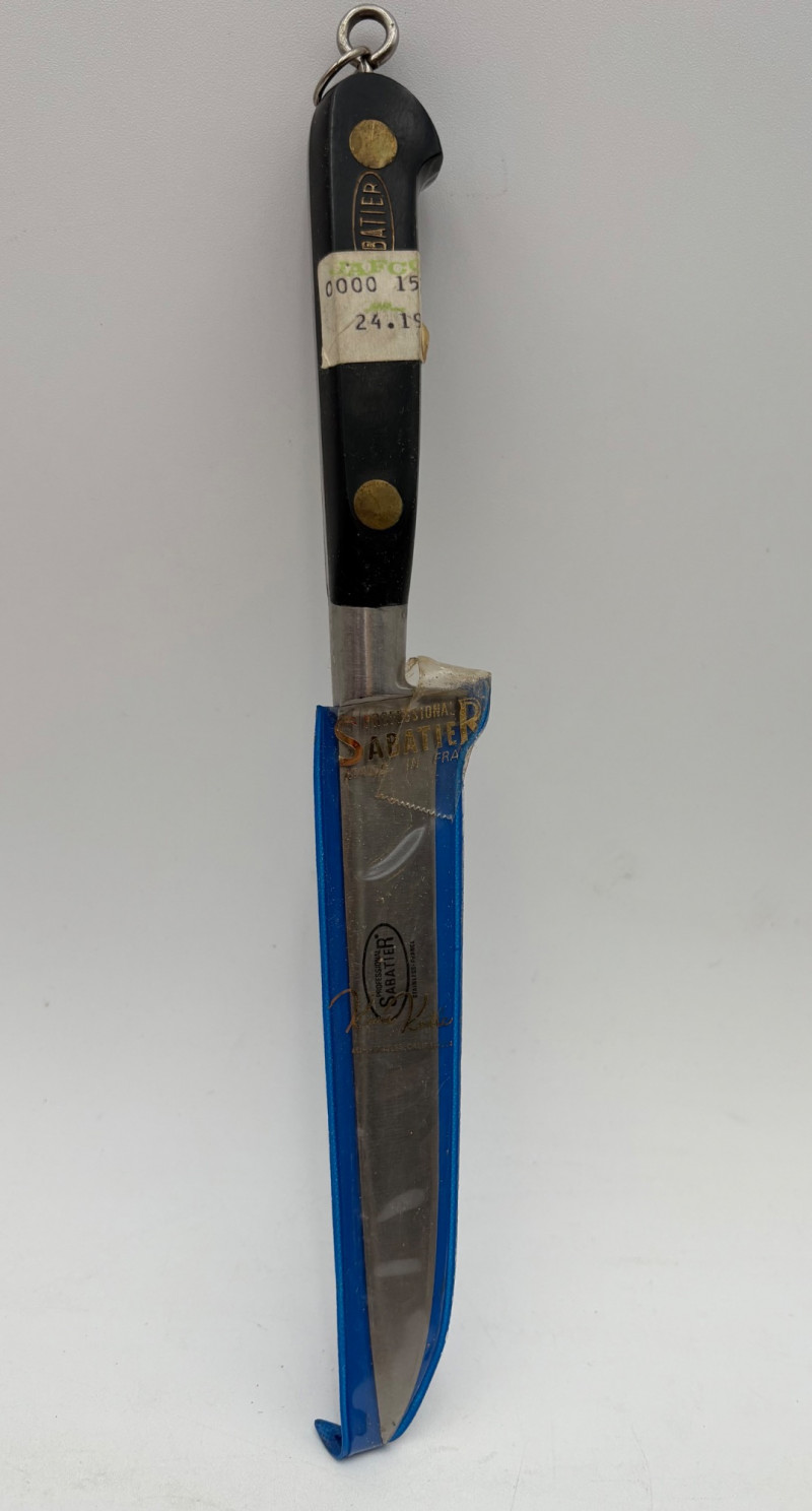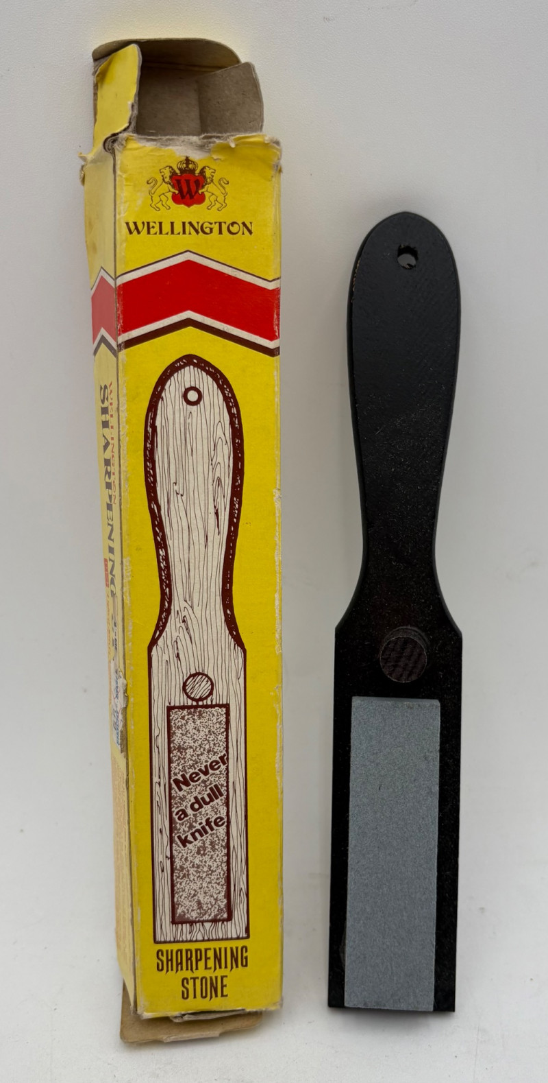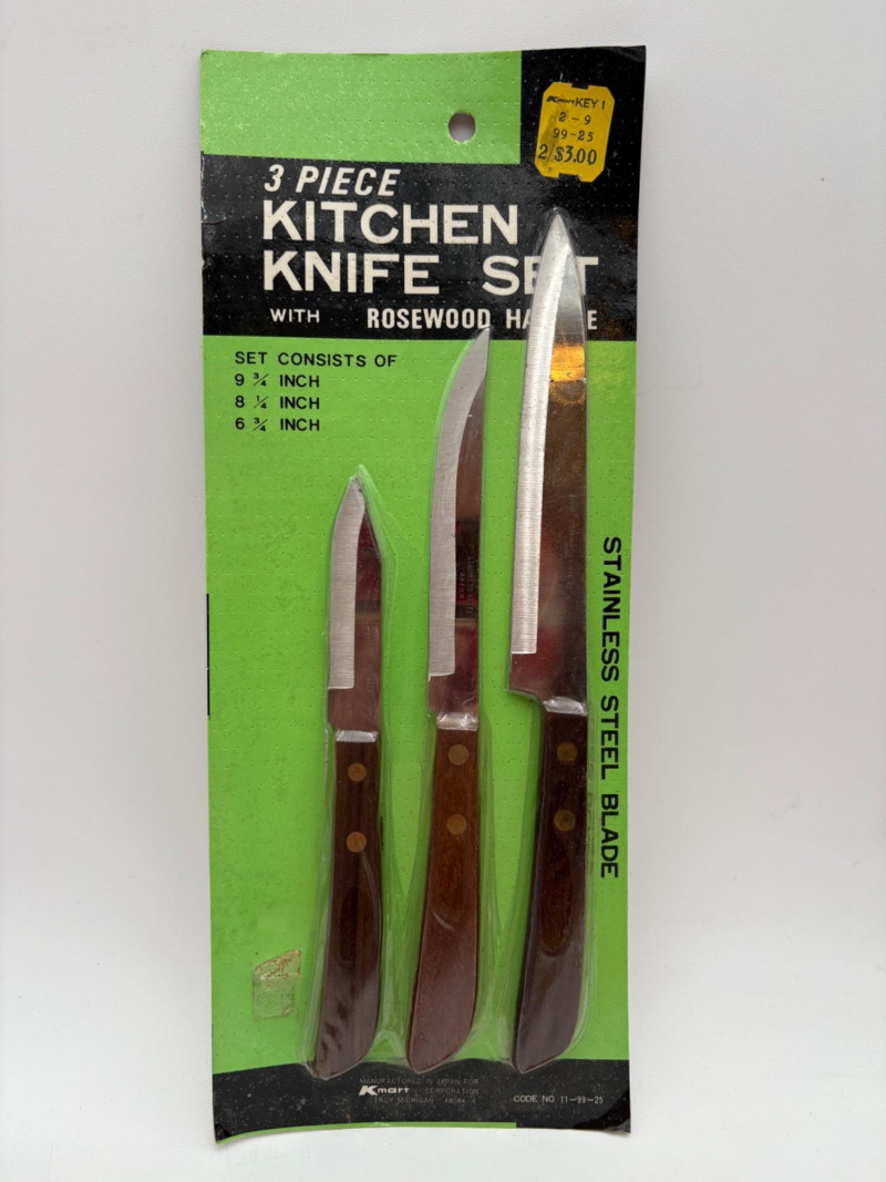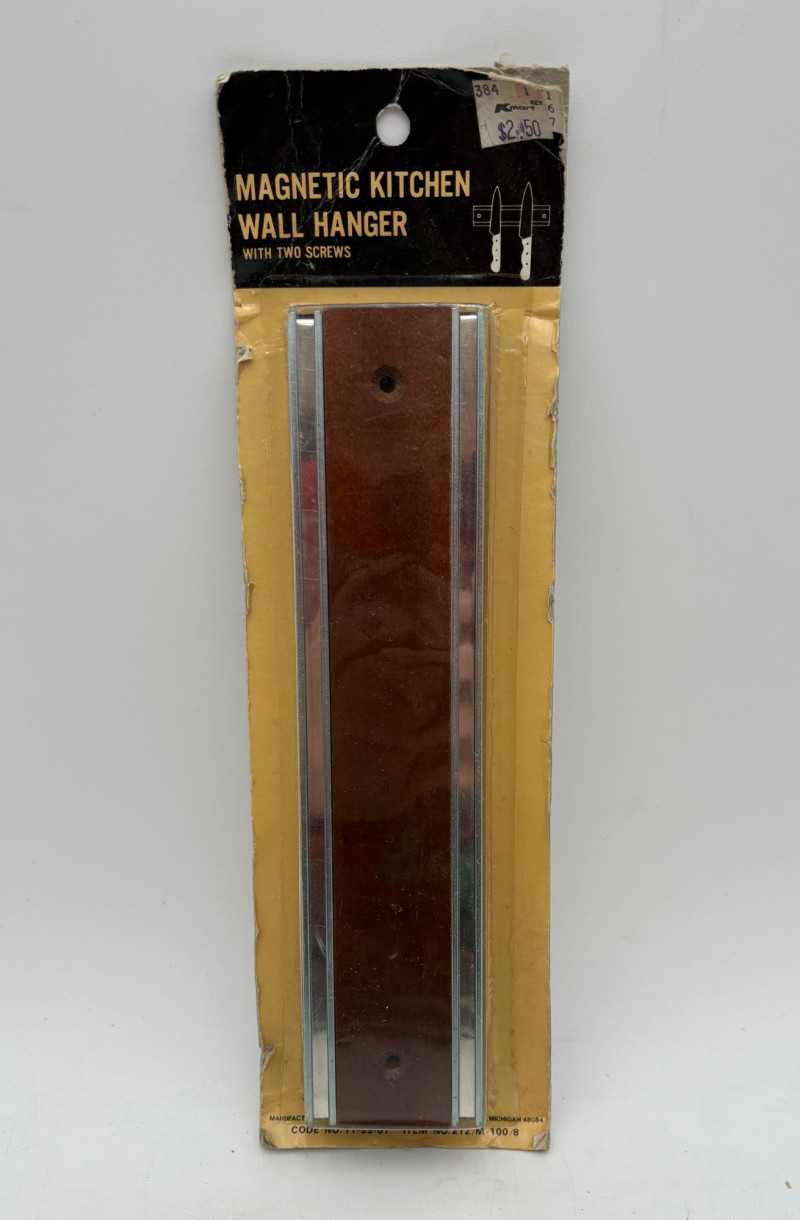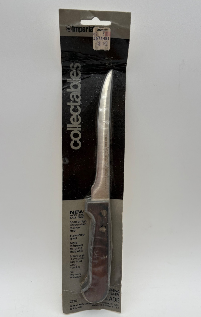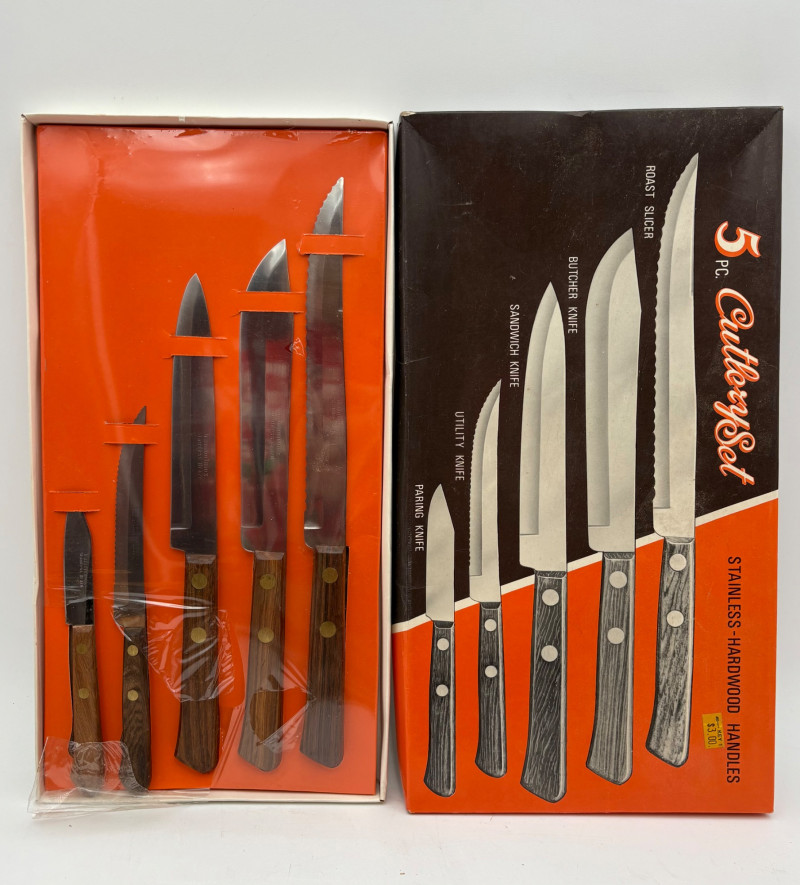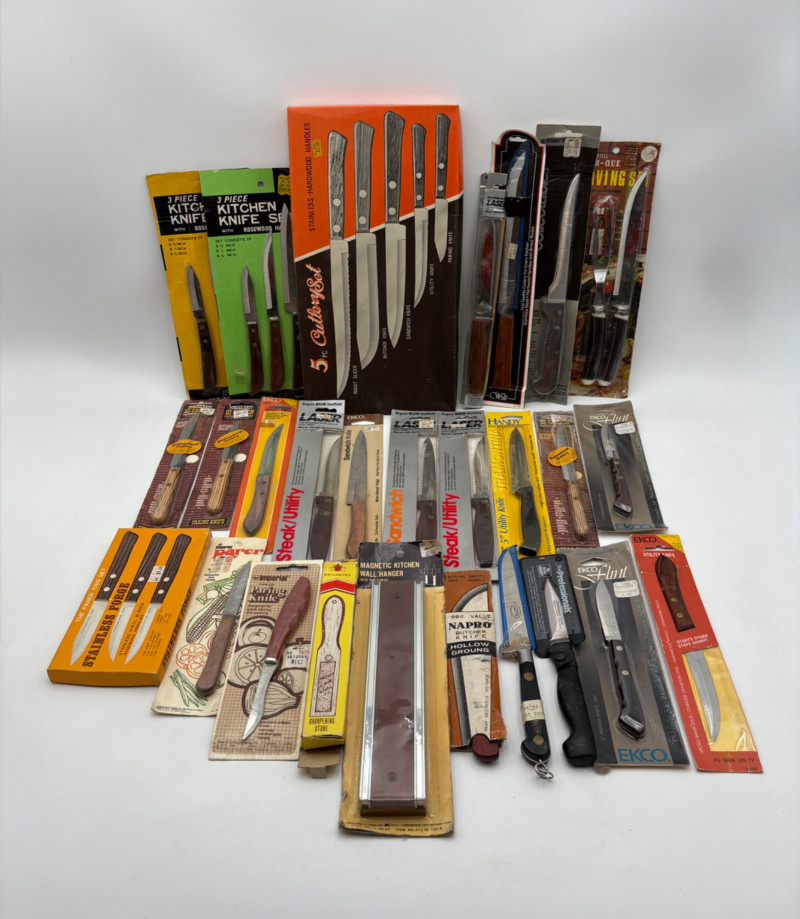 Large group of vintage knives from numerous makers - all appear to be new & unused upon cursory glance. Enjoy never having to hunt for a knife when you need it! Also included are a magnetic wall rack and sharpening stone.