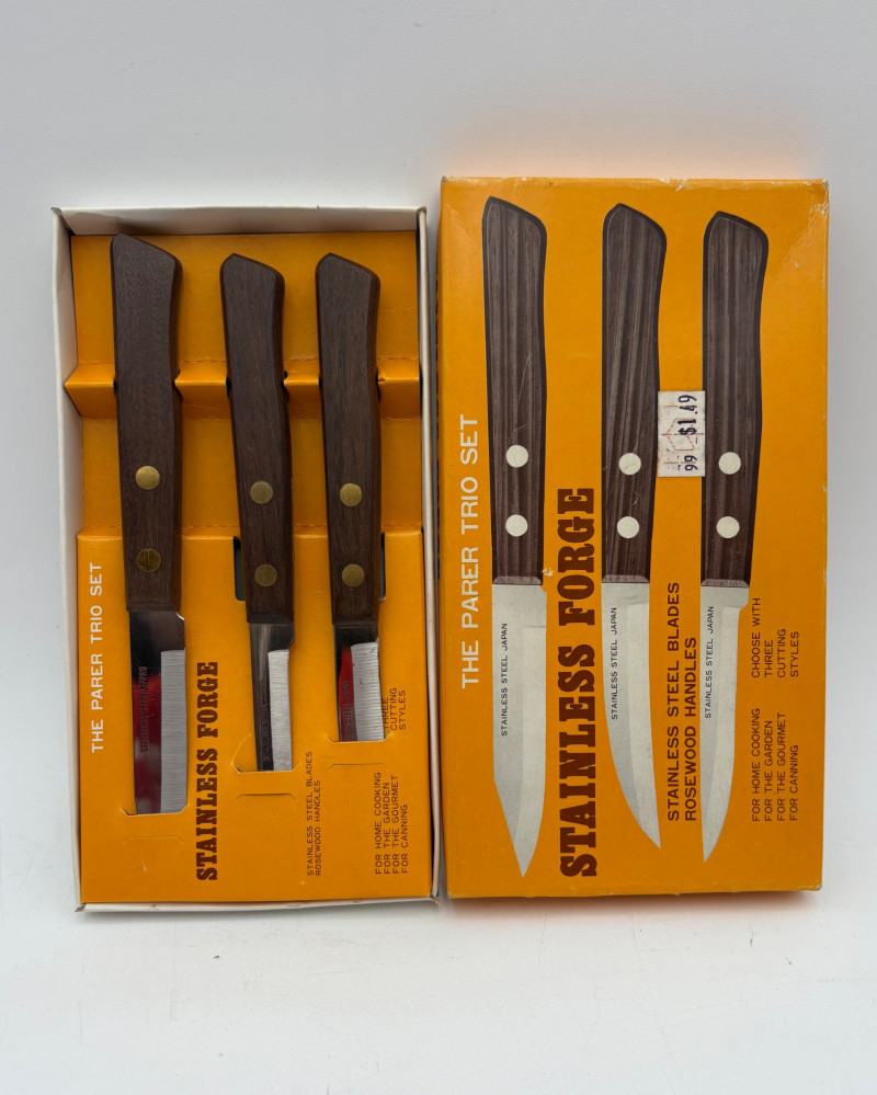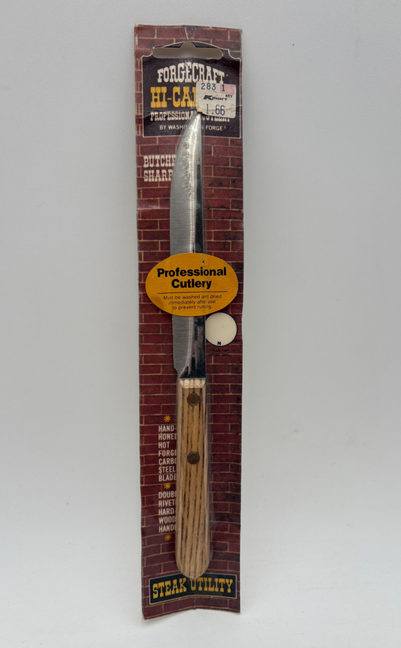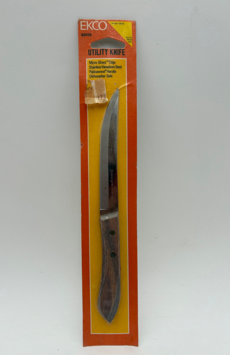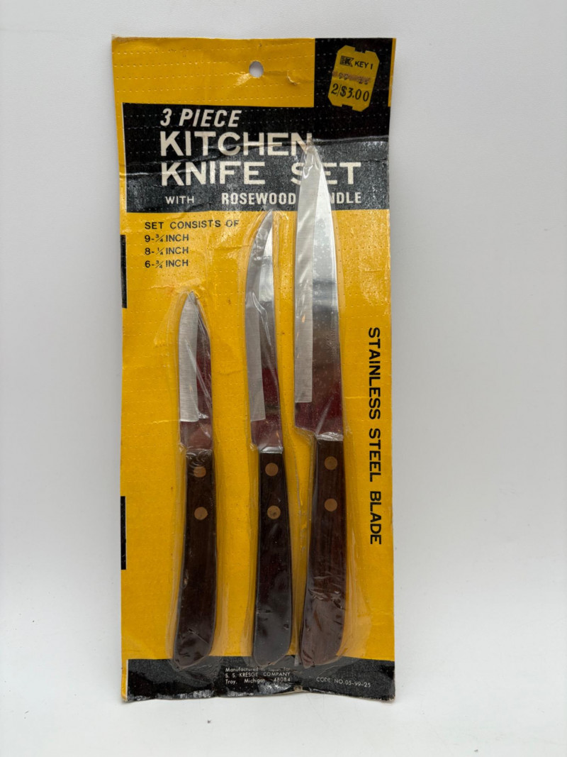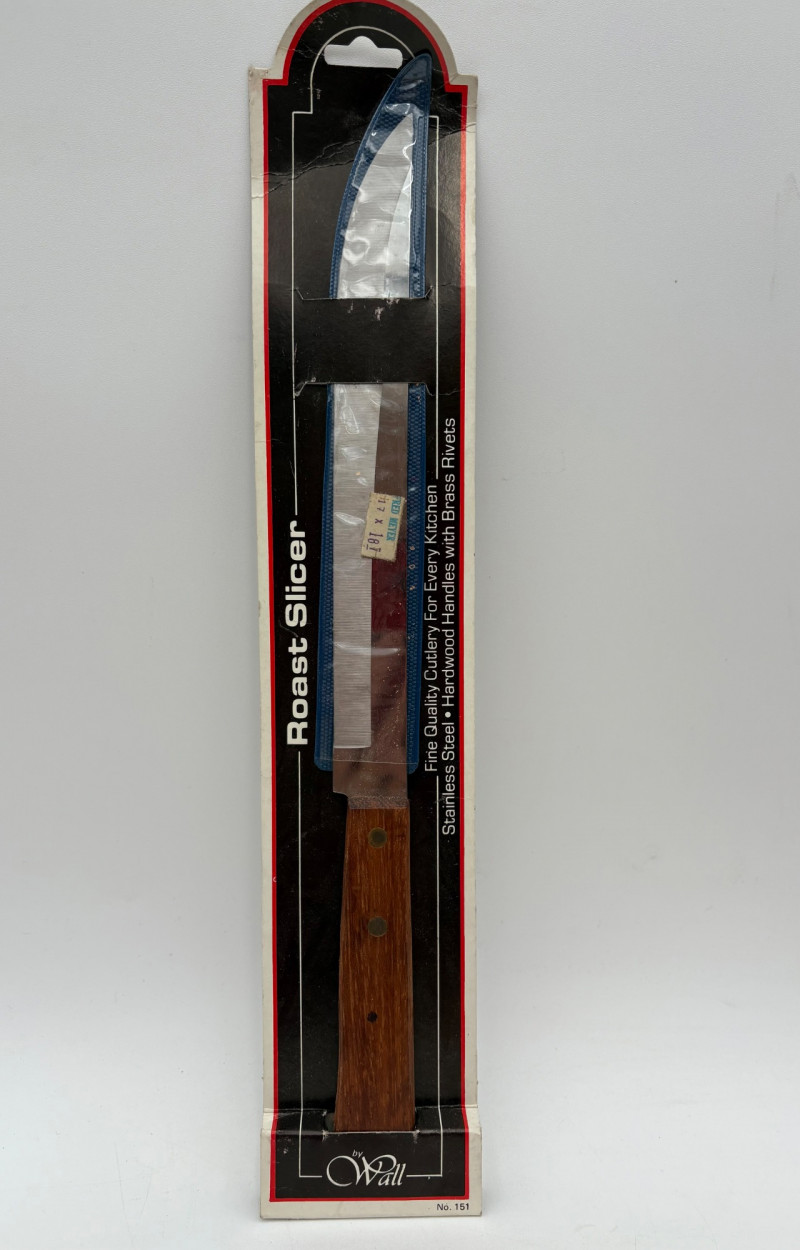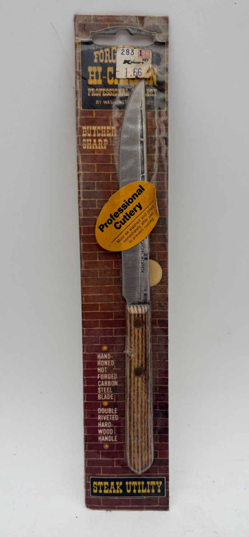 Large group of vintage knives from numerous makers - all appear to be new & unused upon cursory glance. Enjoy never having to hunt for a knife when you need it! Also included are a magnetic wall rack and sharpening stone.