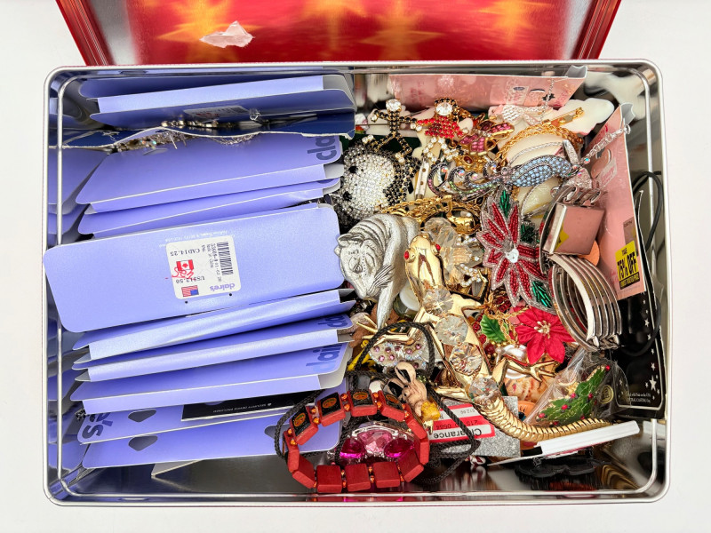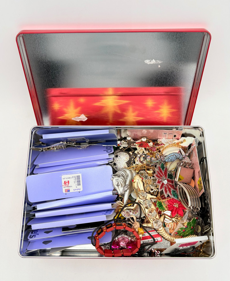 Mystery tin measures 4" H x 11" W x 8" D (yep, it was a Costco cookie tin in its former life). Inside are all kinds of sparkly pins, necklaces, and jewelry of all sorts. You will probably like a few of the things no matter your taste! Please note that while we don't think there are any precious stones/gold amongst the items inside - there are some nice vintage pieces and lots of newer stuff from Claire's.
