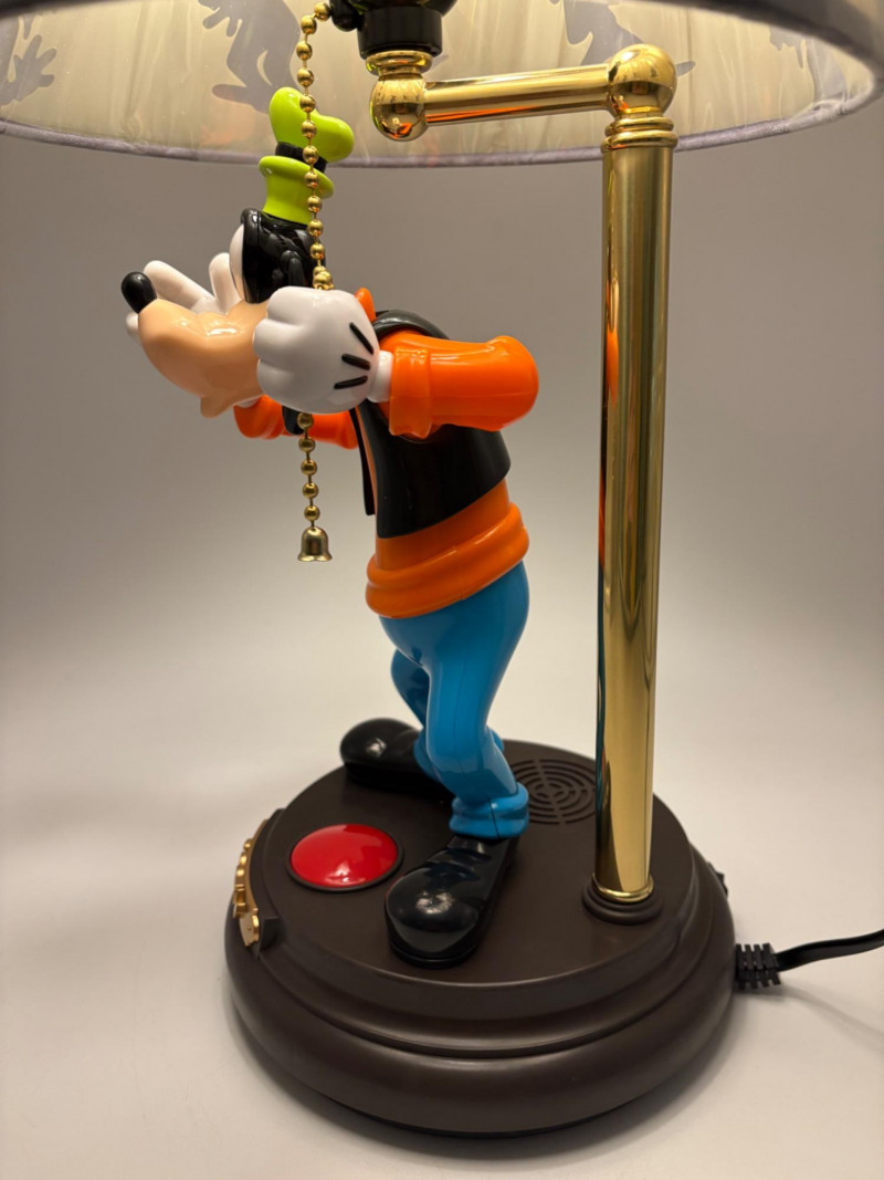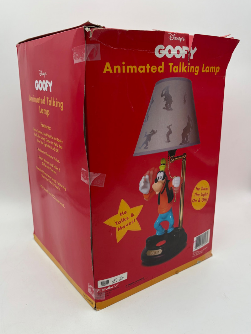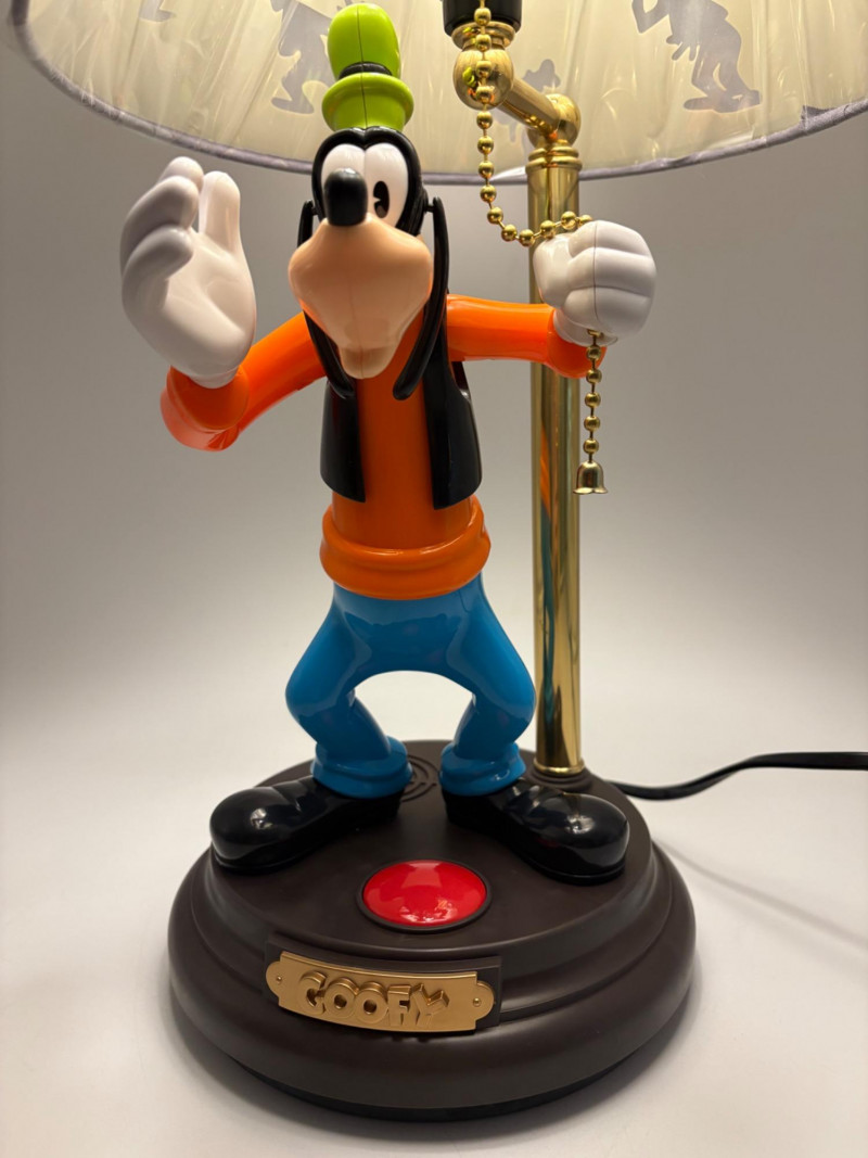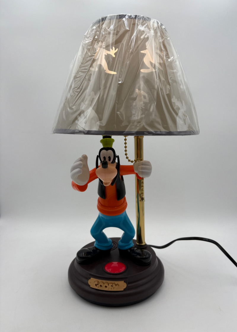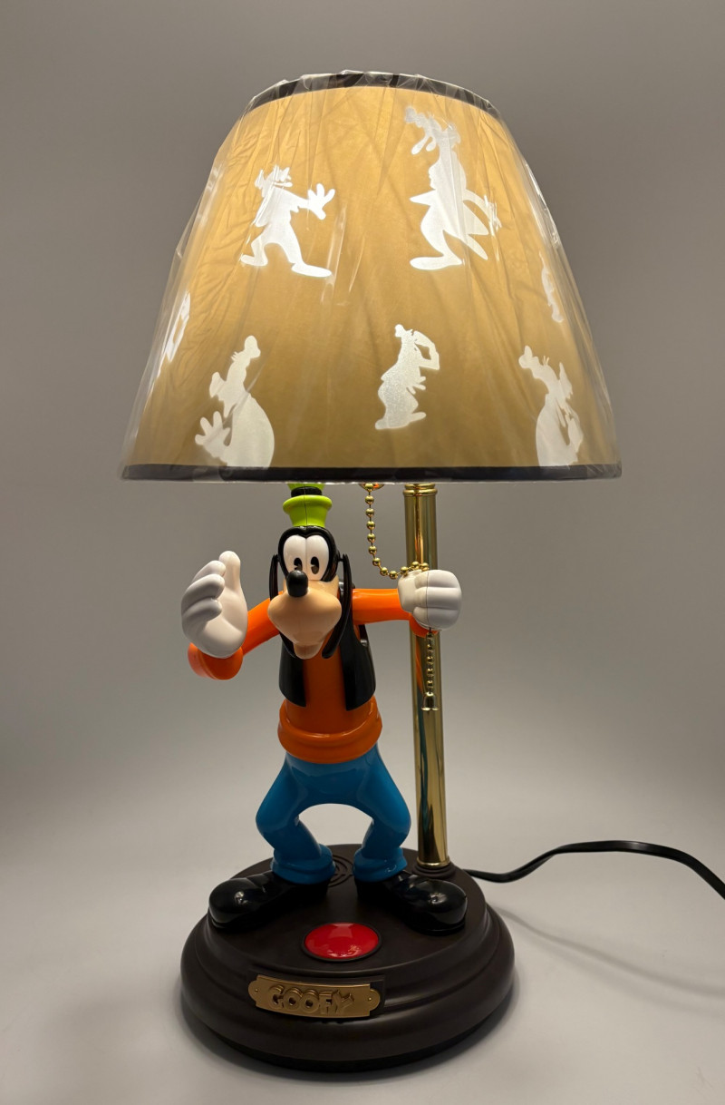 Great Goofy table lamp from KNG America. Touch the red button on the lamp base and Goofy will pull down the light cord to flick the light on and say something to the effect of "Things are looking brighter already" or "I got a bright idea, just gotta remember what it is." Touch the button again and he turns the light off and says something to the effect of "Who turned off the lights" or "Where'd you go?" Appears to be new or seldom used with instructions in box - lampshade is still has plastic wrap covering and shows no noticeable wear. 2-prong plug with a power on/off button at the rear of the lamp base. Measures 18.5" H from base to top of shade and 10" at its widest (shade bottom). Note that box is in poor shape from storage. Goofy Lamp offered elsewhere