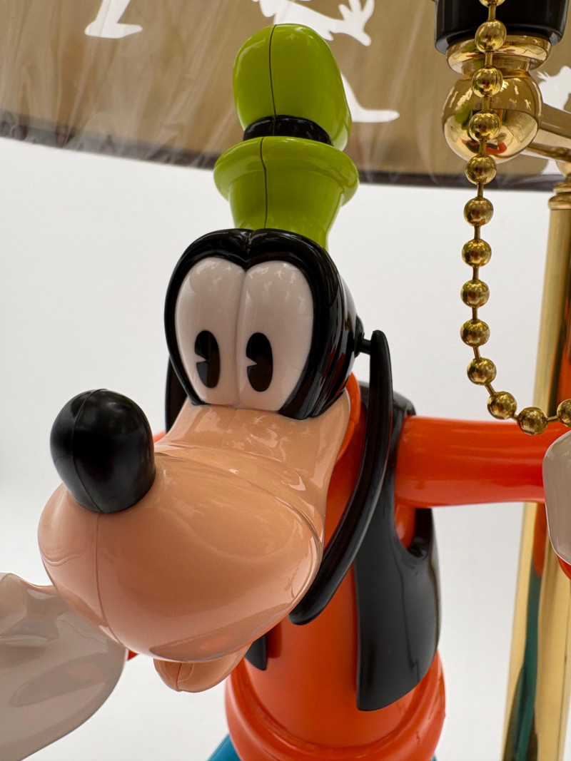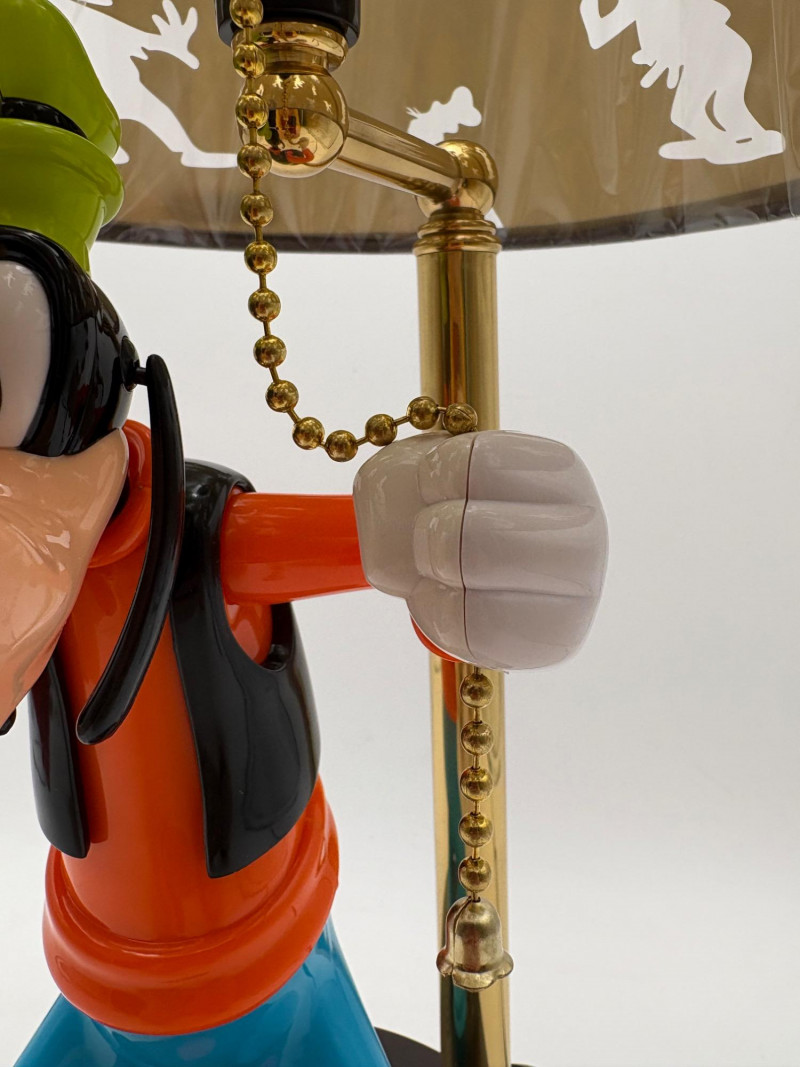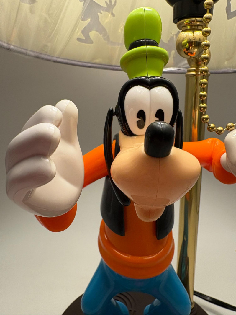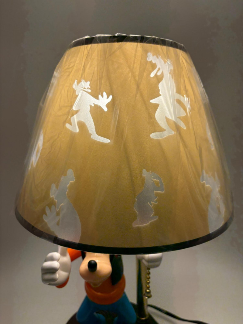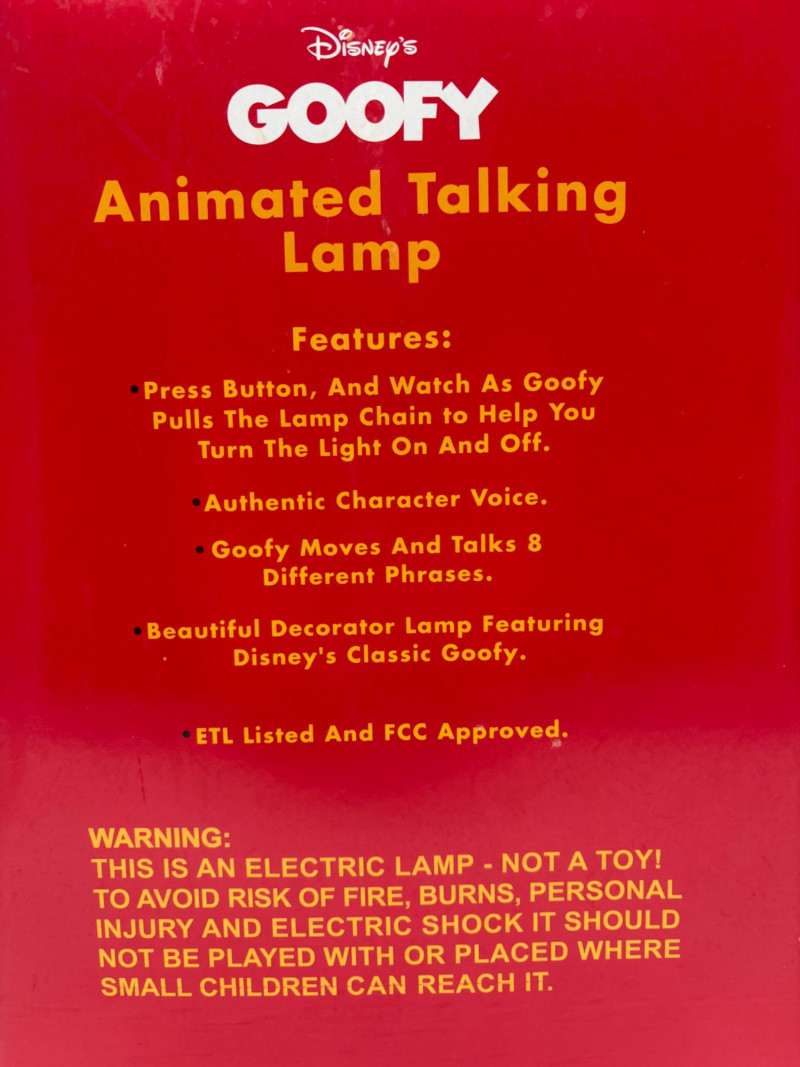 Great Goofy table lamp from KNG America. Touch the red button on the lamp base and Goofy will pull down the light cord to flick the light on and say something to the effect of "Things are looking brighter already" or "I got a bright idea, just gotta remember what it is." Touch the button again and he turns the light off and says something to the effect of "Who turned off the lights" or "Where'd you go?" Appears to be new or seldom used with instructions in box - lampshade is still has plastic wrap covering and shows no noticeable wear. 2-prong plug with a power on/off button at the rear of the lamp base. Measures 18.5" H from base to top of shade and 10" at its widest (shade bottom). Note that box is in poor shape from storage. Goofy Lamp offered elsewhere