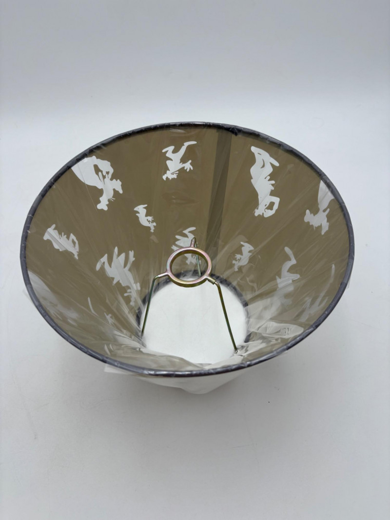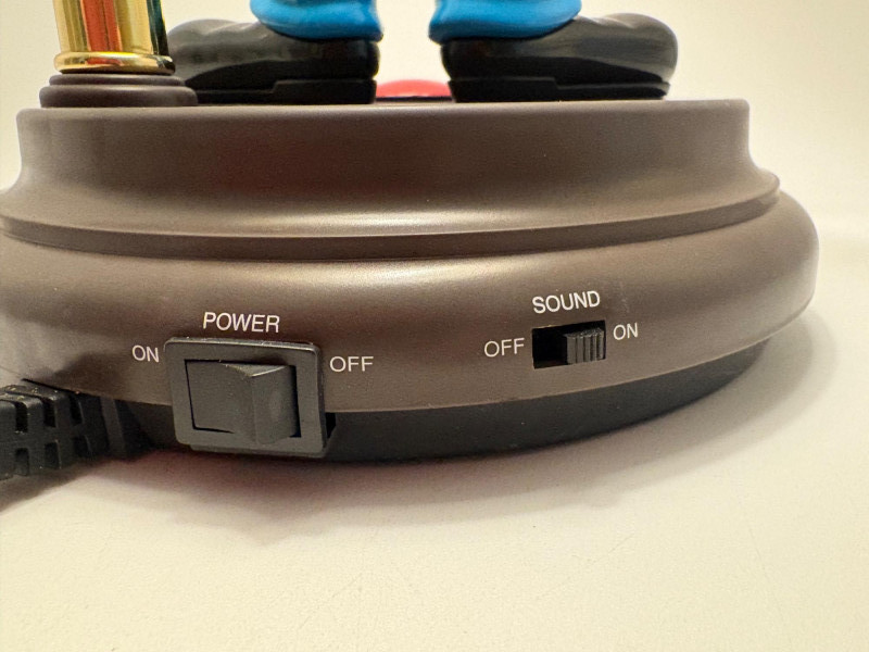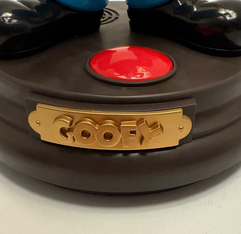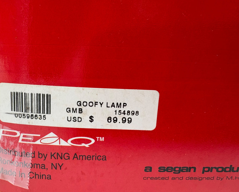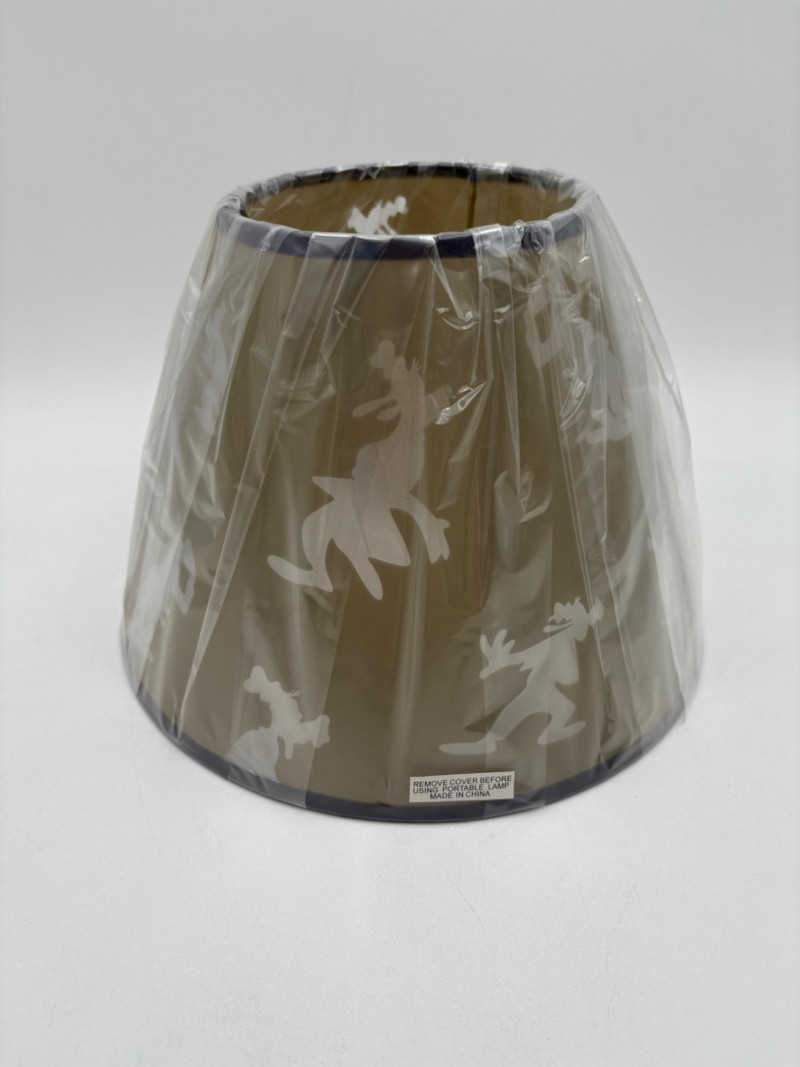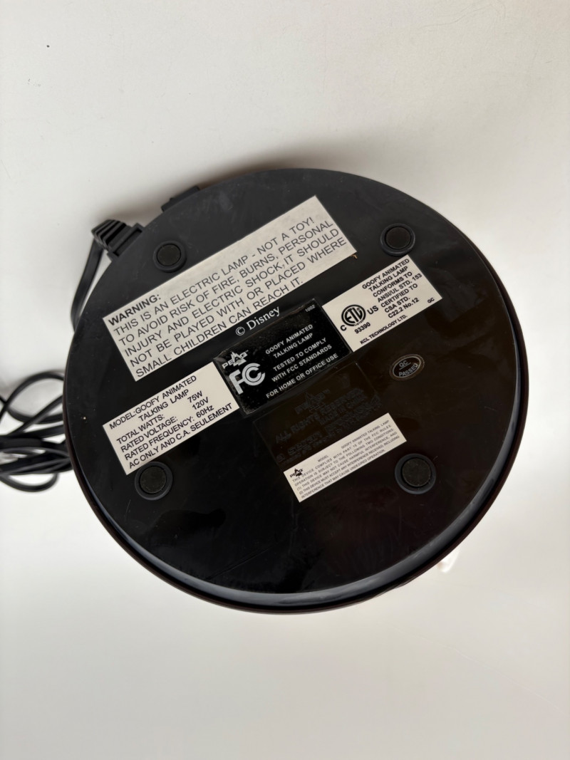 Great Goofy table lamp from KNG America. Touch the red button on the lamp base and Goofy will pull down the light cord to flick the light on and say something to the effect of "Things are looking brighter already" or "I got a bright idea, just gotta remember what it is." Touch the button again and he turns the light off and says something to the effect of "Who turned off the lights" or "Where'd you go?" Appears to be new or seldom used with instructions in box - lampshade is still has plastic wrap covering and shows no noticeable wear. 2-prong plug with a power on/off button at the rear of the lamp base. Measures 18.5" H from base to top of shade and 10" at its widest (shade bottom). Note that box is in poor shape from storage. Goofy Lamp offered elsewhere