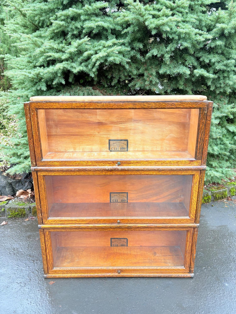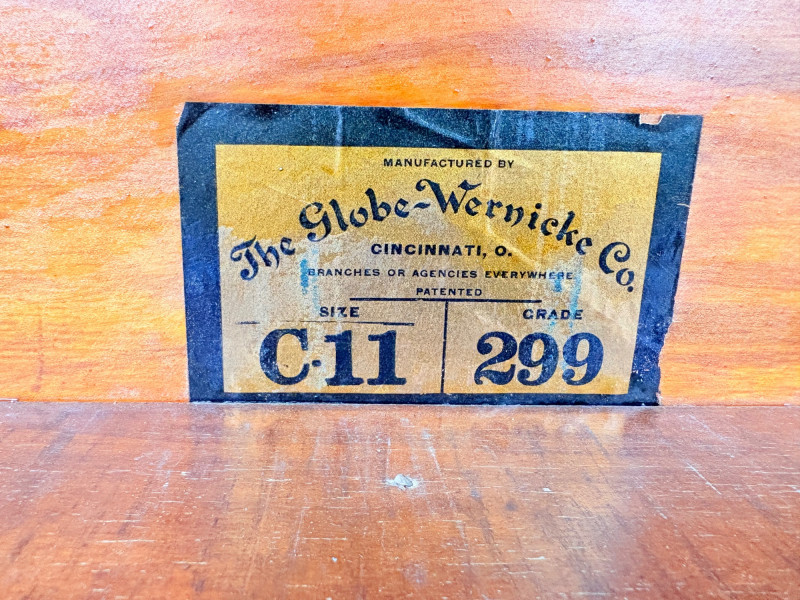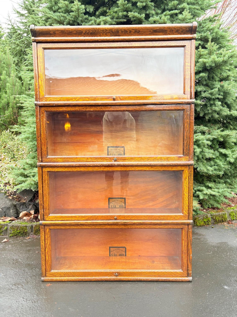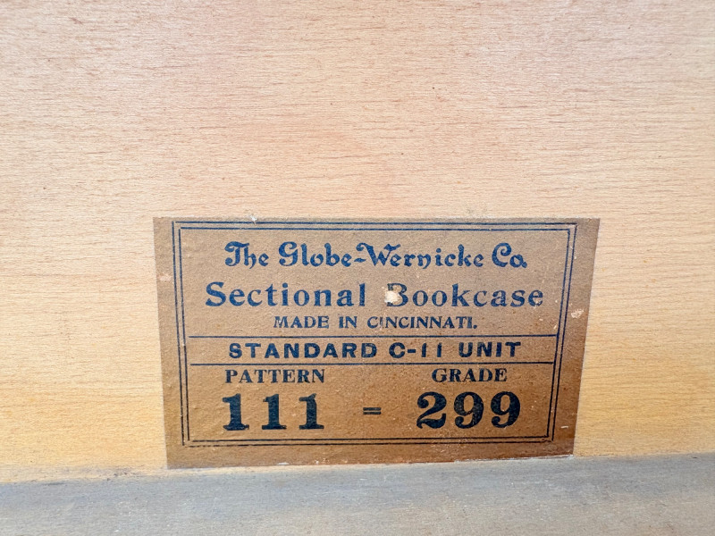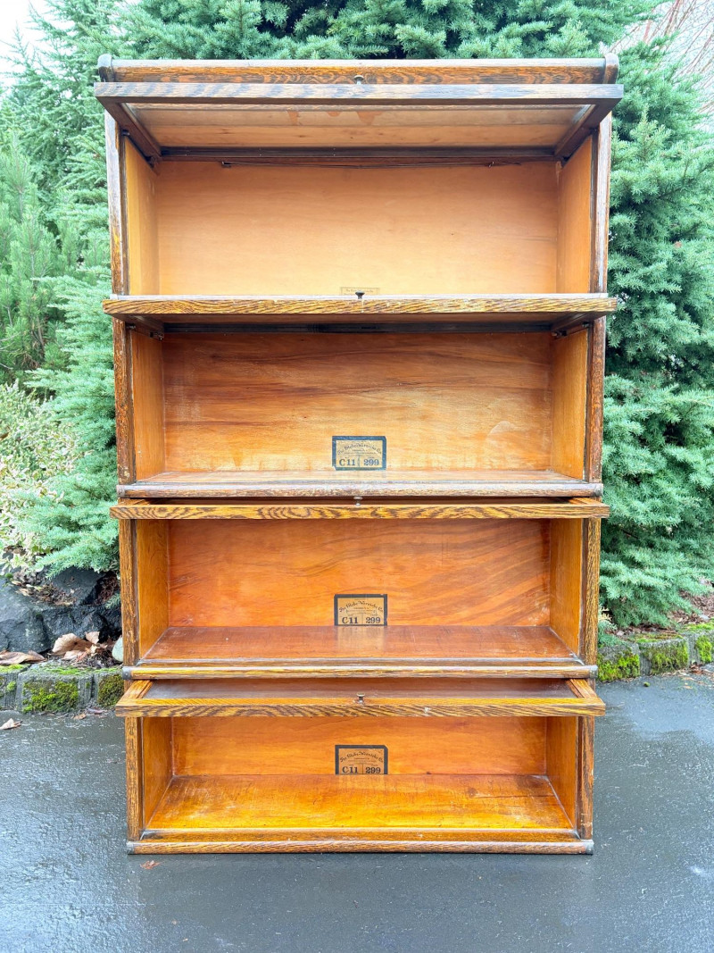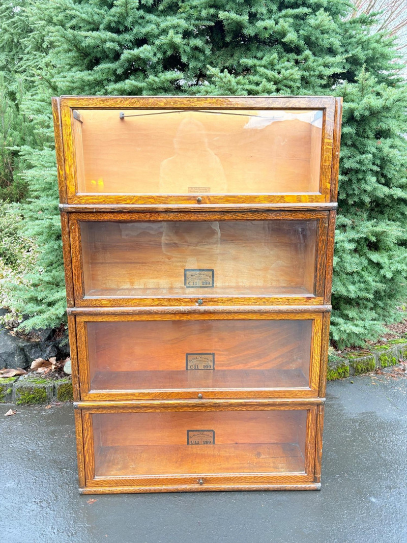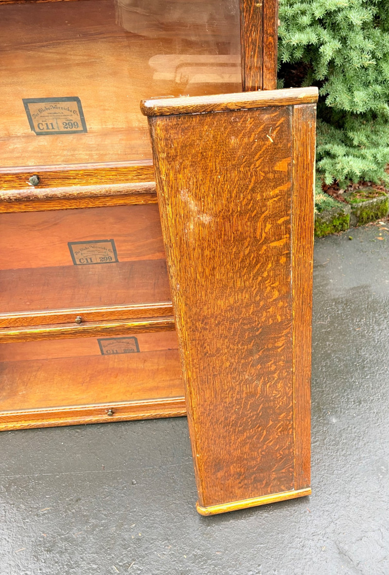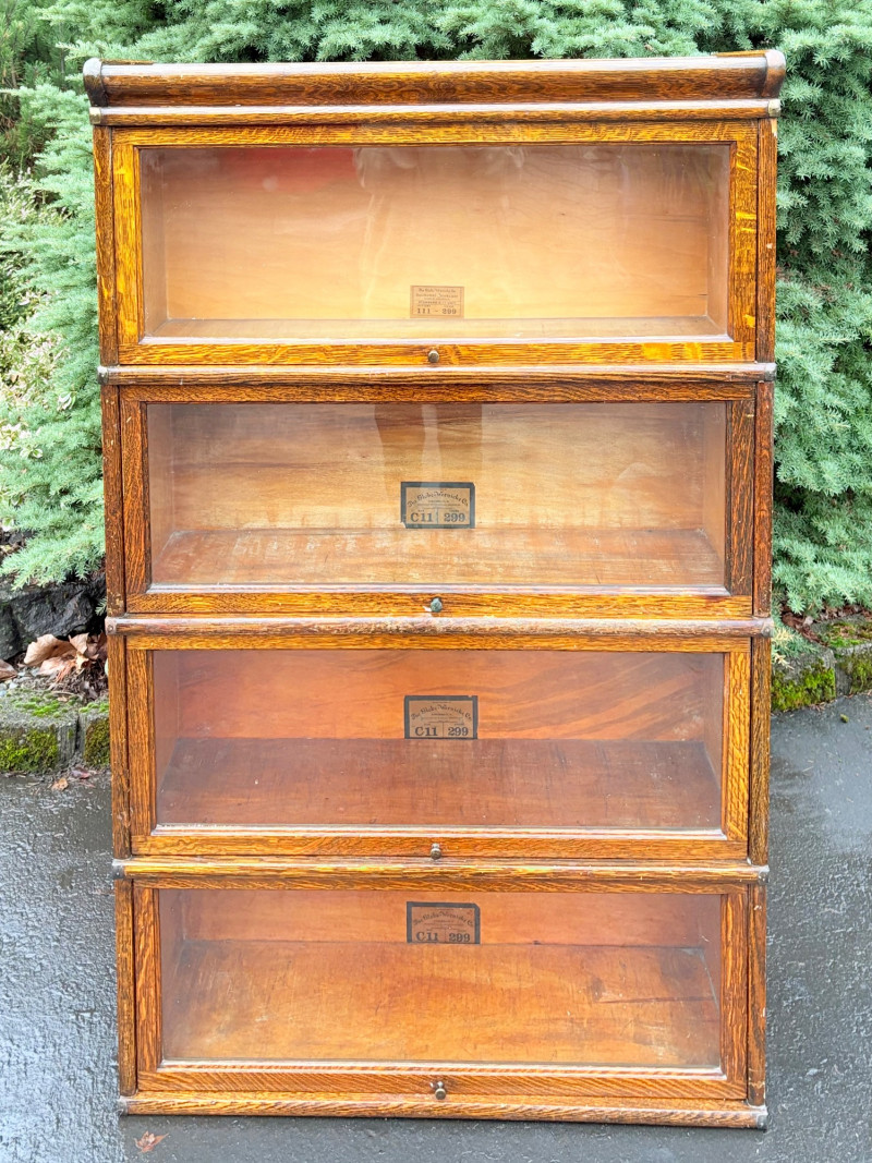 Globe-Wernicke was known for inventing the first "modular" furniture. This quarter-sawn oak set of shelves comes apart into 4 sections plus a top piece, so you can use 1,2,3, or all 4 of the cases depending upon the desired height you want. (there is no base piece, but clients used is as is and it looked just fine flush on the floor). The sections piggy-back onto one another and a sturdy top plank holds each jig-sawed into the next. Hardware uses a scissoring action to lift and slide back the front glass panel. This set has oxidized brass exterior hardware throughout and is solidly built. 3 of the sections are labeled C-11 299 with the 4th labeled C-11 in addition to 111-299. We think that last one must be slightly newer as they all appear to be the same design. (first 3 numbers are the size with the last the material/finish tone according to one source). Each section measures about 13.5" H x 34" W x 9.5" D. Total height with all 5 pieces is approx. 58" with a depth of 10.5" D. Note on condition: while in good condition mechanically, the piece needs a through scrub-down. Note that there are several cosmetic flaws: - tan paint on exterior of 2 side panels - may be able to remove/scrape. - brass needs to be polished on exterior hardware & knobs - one bookshelf has the metal " slide track" missing - still fully functions just fine; we didn't notice until doing close-up photos. - there are various scrapes/slight dings - most egregious are shown in final 2 photos. This would be a terrific addition to any traditional library setting as a bookcase or as a showcase (our client used it to show off her porcelains). Barrister Bookcases this is not an exact duplicate but will give you an idea of how these hold their value when well-taken care of.