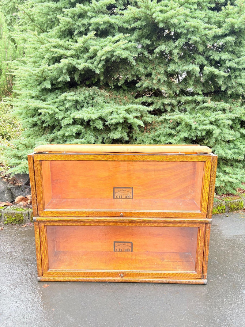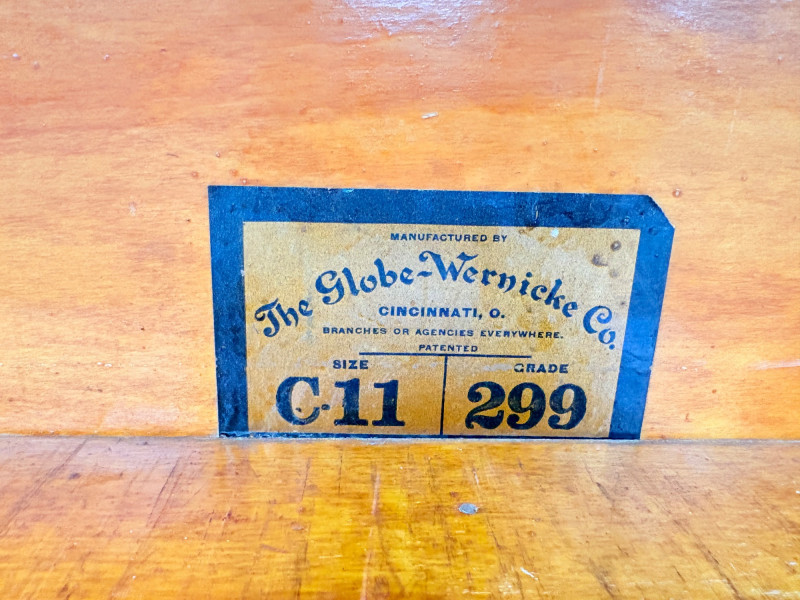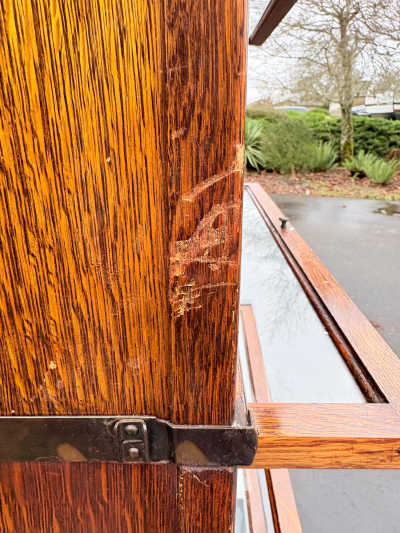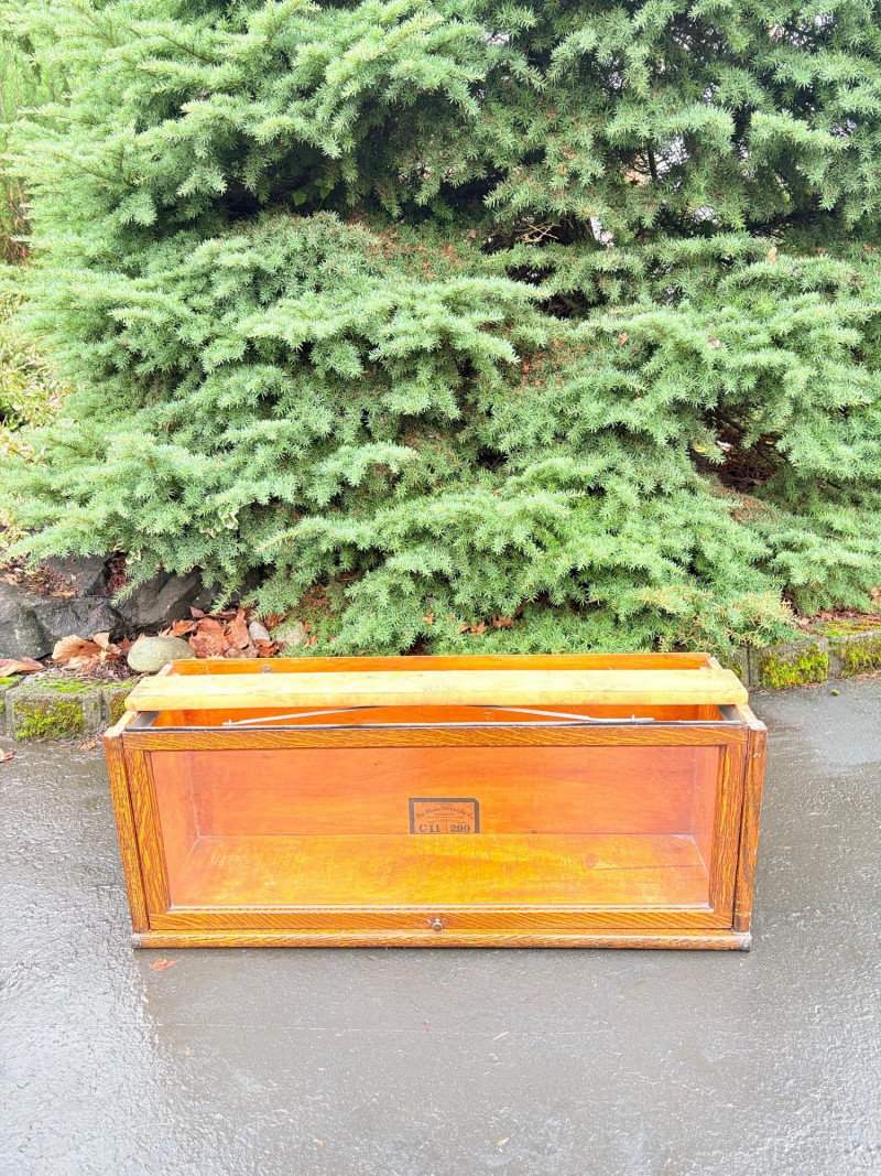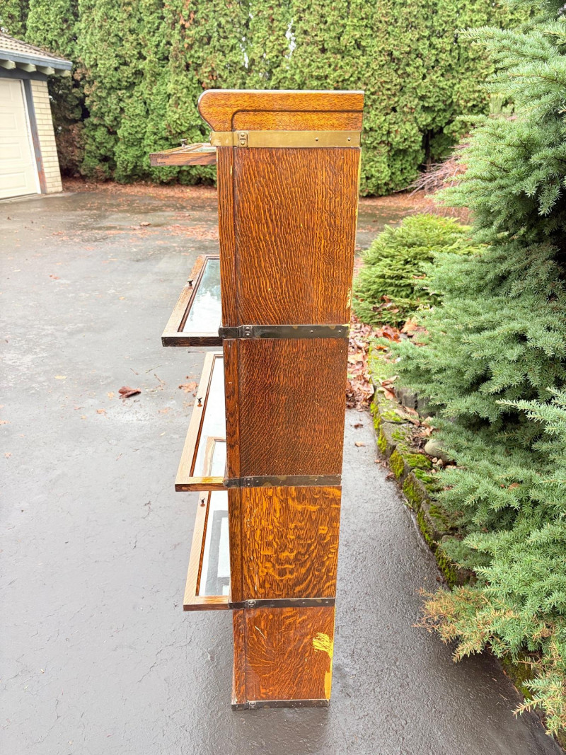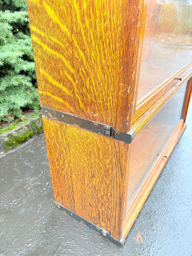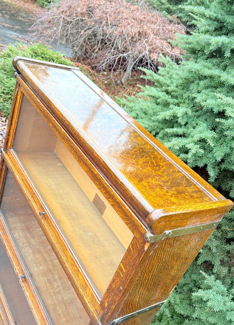 Globe-Wernicke was known for inventing the first "modular" furniture. This quarter-sawn oak set of shelves comes apart into 4 sections plus a top piece, so you can use 1,2,3, or all 4 of the cases depending upon the desired height you want. (there is no base piece, but clients used is as is and it looked just fine flush on the floor). The sections piggy-back onto one another and a sturdy top plank holds each jig-sawed into the next. Hardware uses a scissoring action to lift and slide back the front glass panel. This set has oxidized brass exterior hardware throughout and is solidly built. 3 of the sections are labeled C-11 299 with the 4th labeled C-11 in addition to 111-299. We think that last one must be slightly newer as they all appear to be the same design. (first 3 numbers are the size with the last the material/finish tone according to one source). Each section measures about 13.5" H x 34" W x 9.5" D. Total height with all 5 pieces is approx. 58" with a depth of 10.5" D. Note on condition: while in good condition mechanically, the piece needs a through scrub-down. Note that there are several cosmetic flaws: - tan paint on exterior of 2 side panels - may be able to remove/scrape. - brass needs to be polished on exterior hardware & knobs - one bookshelf has the metal " slide track" missing - still fully functions just fine; we didn't notice until doing close-up photos. - there are various scrapes/slight dings - most egregious are shown in final 2 photos. This would be a terrific addition to any traditional library setting as a bookcase or as a showcase (our client used it to show off her porcelains). Barrister Bookcases this is not an exact duplicate but will give you an idea of how these hold their value when well-taken care of.