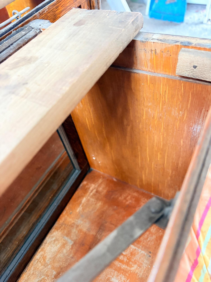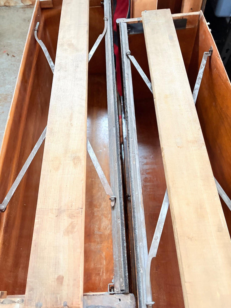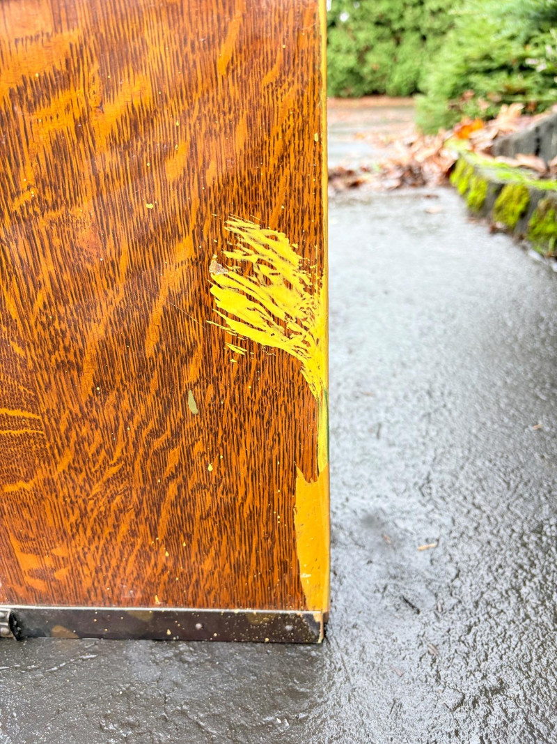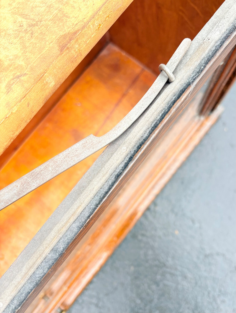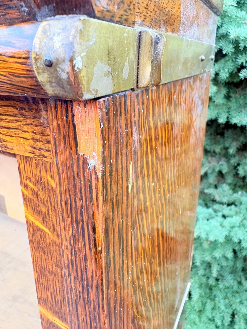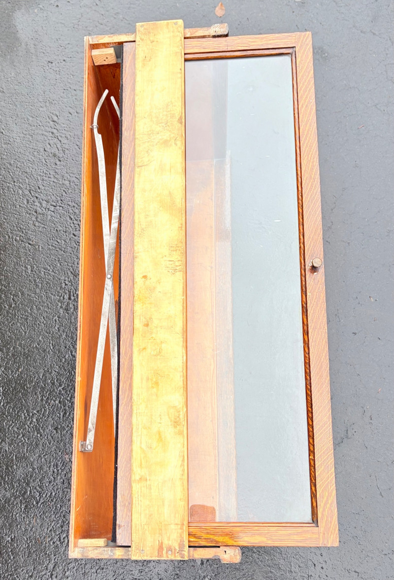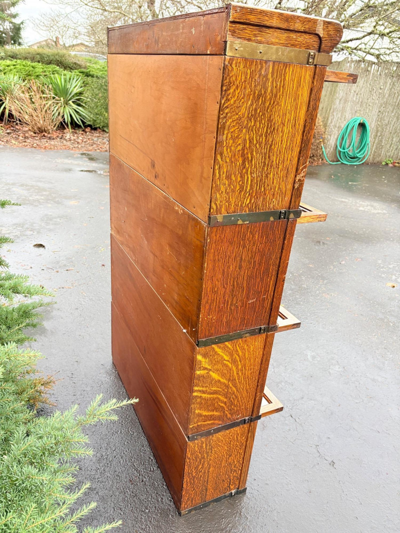 Globe-Wernicke was known for inventing the first "modular" furniture. This quarter-sawn oak set of shelves comes apart into 4 sections plus a top piece, so you can use 1,2,3, or all 4 of the cases depending upon the desired height you want. (there is no base piece, but clients used is as is and it looked just fine flush on the floor). The sections piggy-back onto one another and a sturdy top plank holds each jig-sawed into the next. Hardware uses a scissoring action to lift and slide back the front glass panel. This set has oxidized brass exterior hardware throughout and is solidly built. 3 of the sections are labeled C-11 299 with the 4th labeled C-11 in addition to 111-299. We think that last one must be slightly newer as they all appear to be the same design. (first 3 numbers are the size with the last the material/finish tone according to one source). Each section measures about 13.5" H x 34" W x 9.5" D. Total height with all 5 pieces is approx. 58" with a depth of 10.5" D. Note on condition: while in good condition mechanically, the piece needs a through scrub-down. Note that there are several cosmetic flaws: - tan paint on exterior of 2 side panels - may be able to remove/scrape. - brass needs to be polished on exterior hardware & knobs - one bookshelf has the metal " slide track" missing - still fully functions just fine; we didn't notice until doing close-up photos. - there are various scrapes/slight dings - most egregious are shown in final 2 photos. This would be a terrific addition to any traditional library setting as a bookcase or as a showcase (our client used it to show off her porcelains). Barrister Bookcases this is not an exact duplicate but will give you an idea of how these hold their value when well-taken care of.