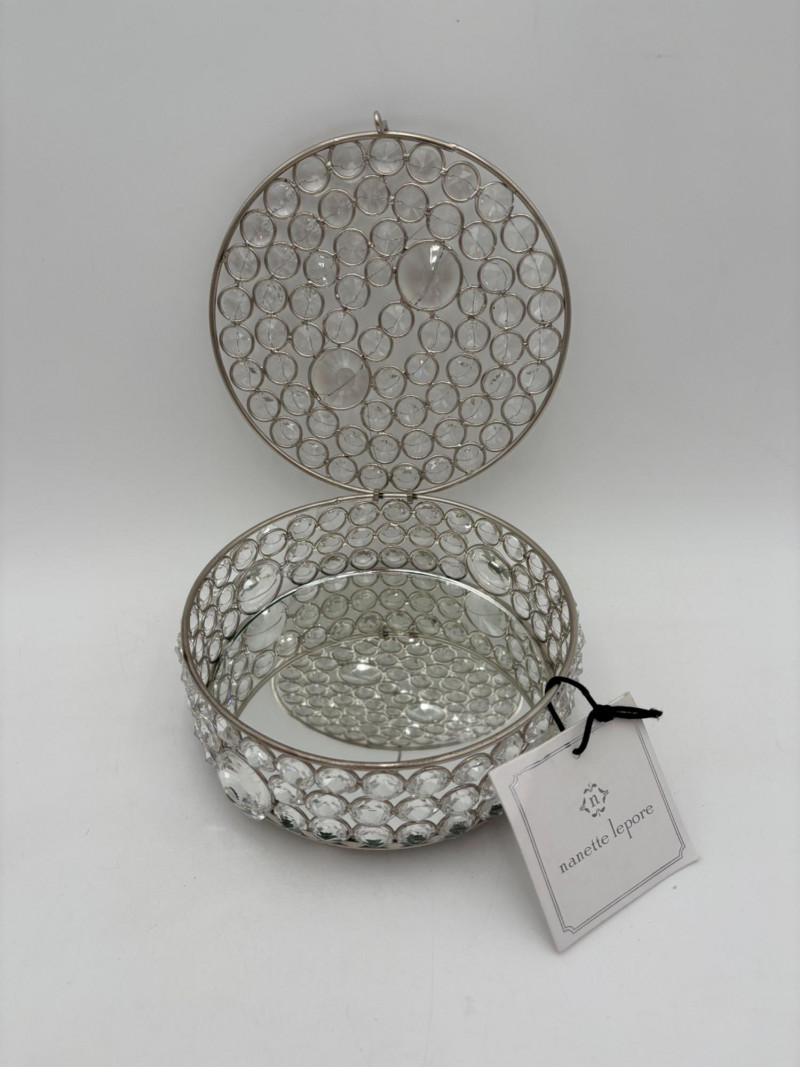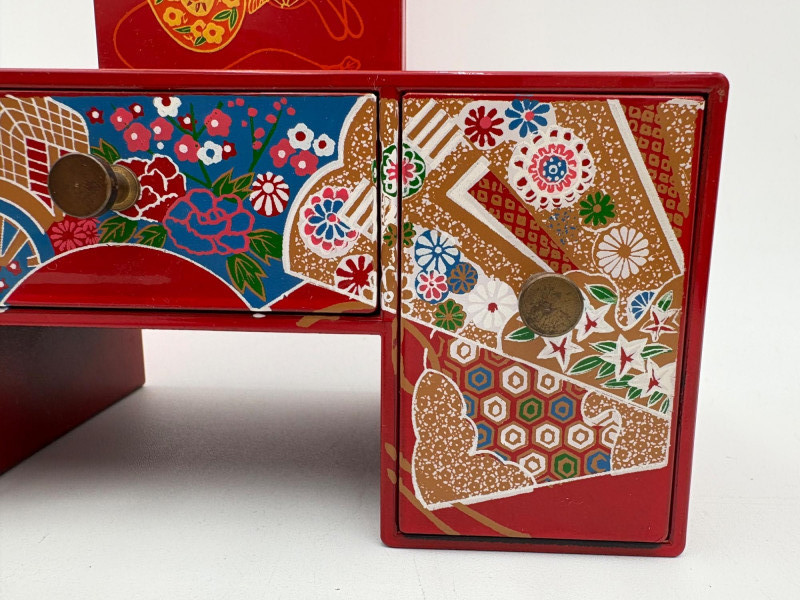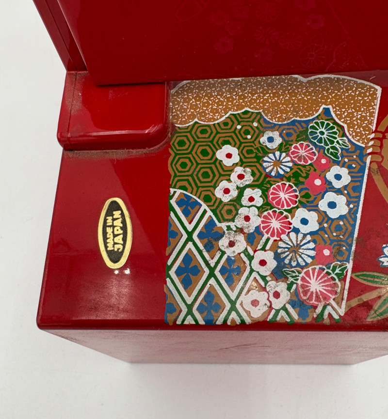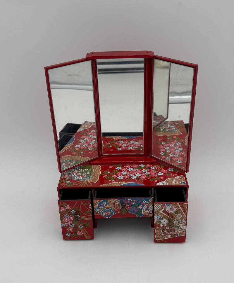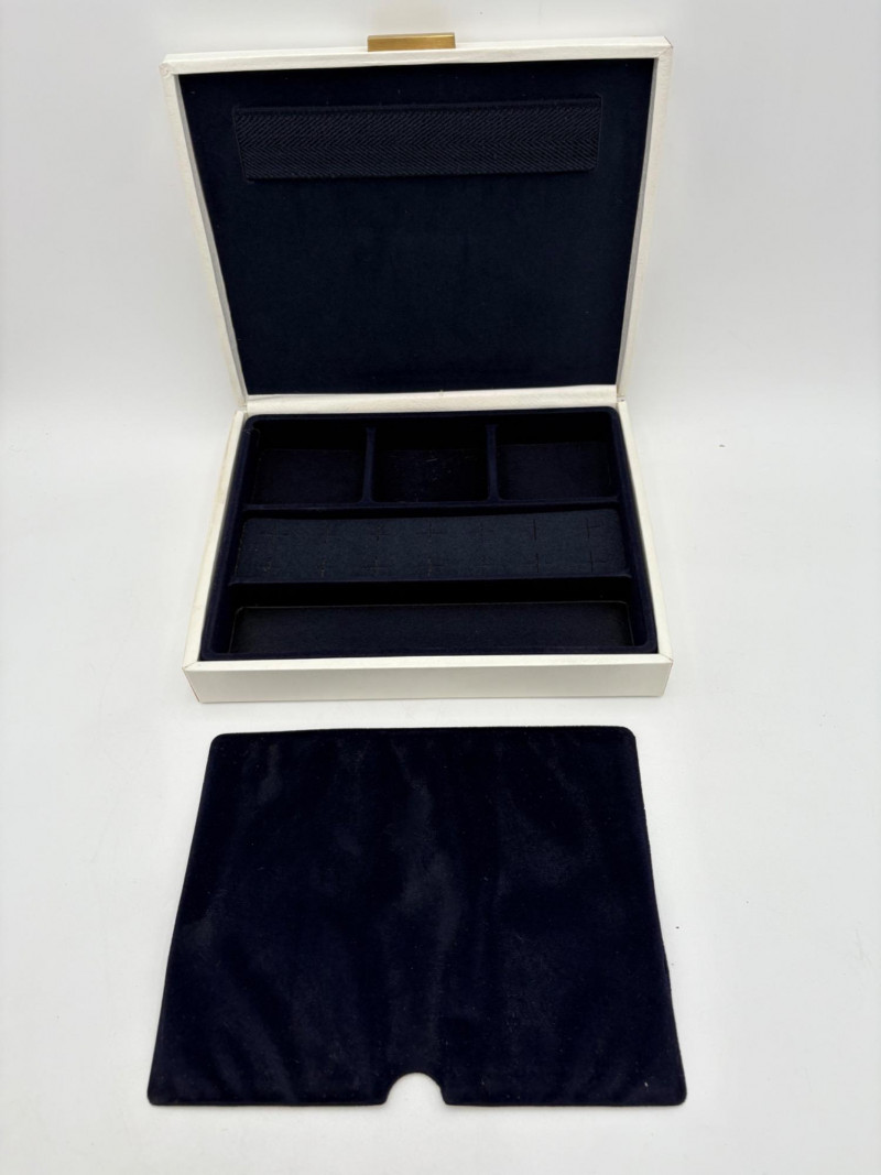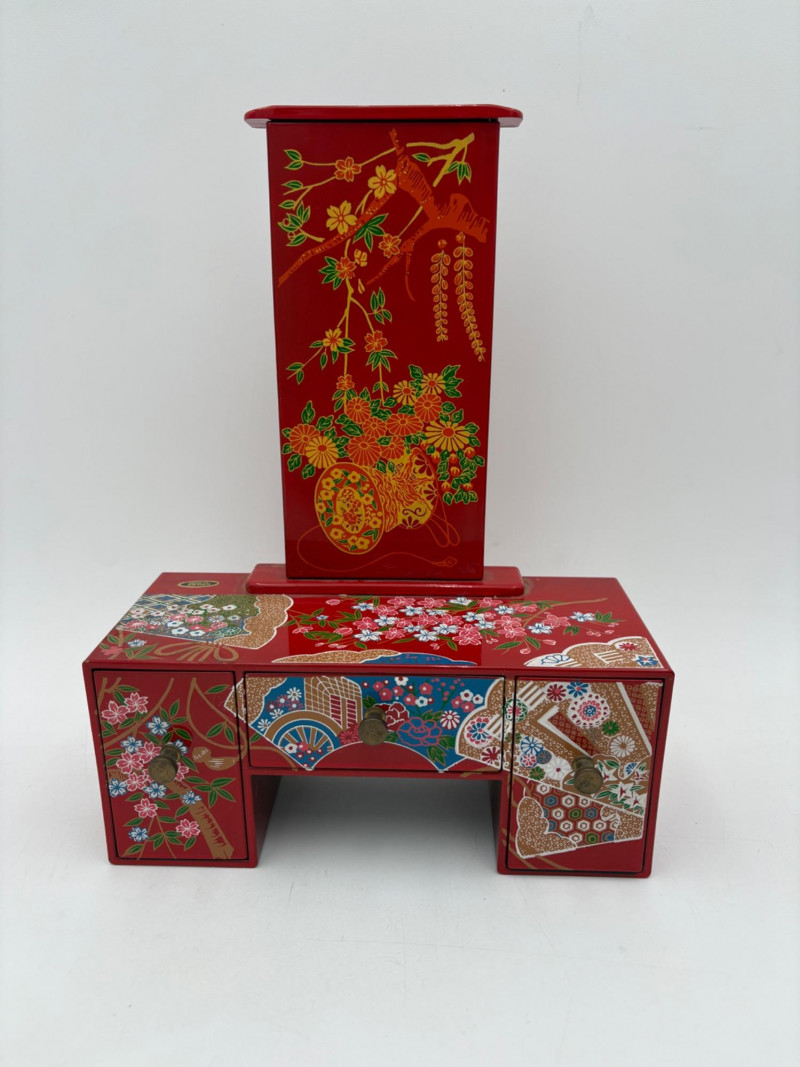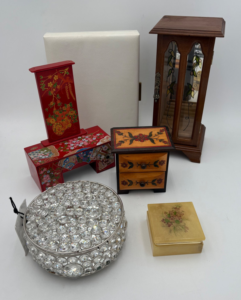6 vintage jewelry boxes to hold all the other jewelry lots we know you are bidding on! They are in pretty good condition for their age and will prove vastly useful! - White naugahyde square box with lift up lid has blue velveteen interior with removeable separator. From Avon. Measures 2.25" H x 10.5" W x 8.5" D. - Ivory/yellow alabaster box with gold trim & floral motif. Measures 1.75" H x 2/25" square. From 1983. - Sparkly round mirrored box from Nanette Lepore. Measures 2.5" H x 6.5" diameter. - Asian box in the shape of a vanity. Red lacquer with Japanese floral motifs - 3 drawers and a fold-out mirror. Measures 9.5" H x 7" W. We think this may be for a larger dollhouse, but the piece is great and would easily work for jewelry! - Small carved wood 2-drawer box with incised floral motif. Measures 5" H x 5" W x 3.5" D. - Necklace and ring "wardrobe" in wood with brass pull, necklace wheel, and pink interior. Measures 12" H x 5.5" W x 5" D.