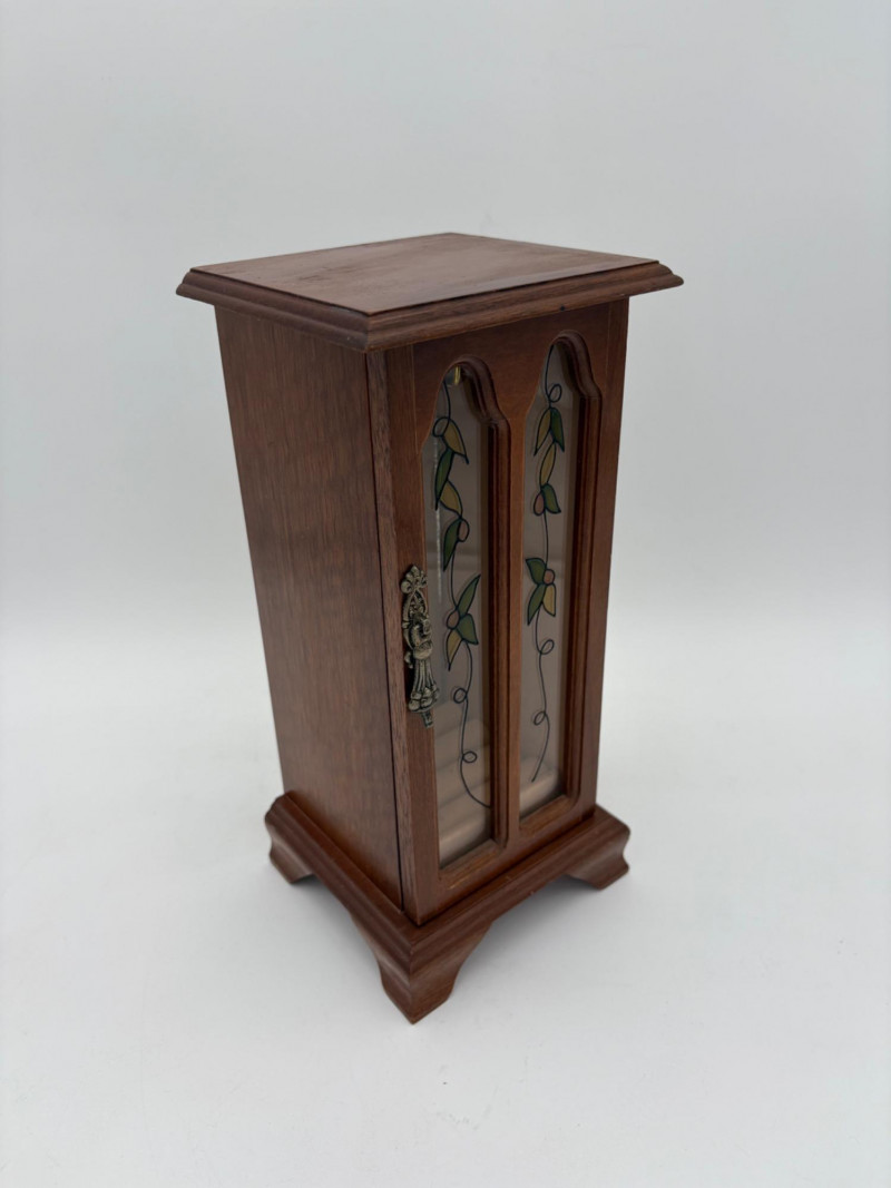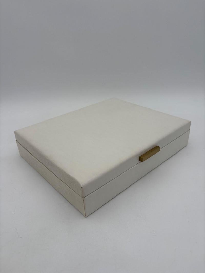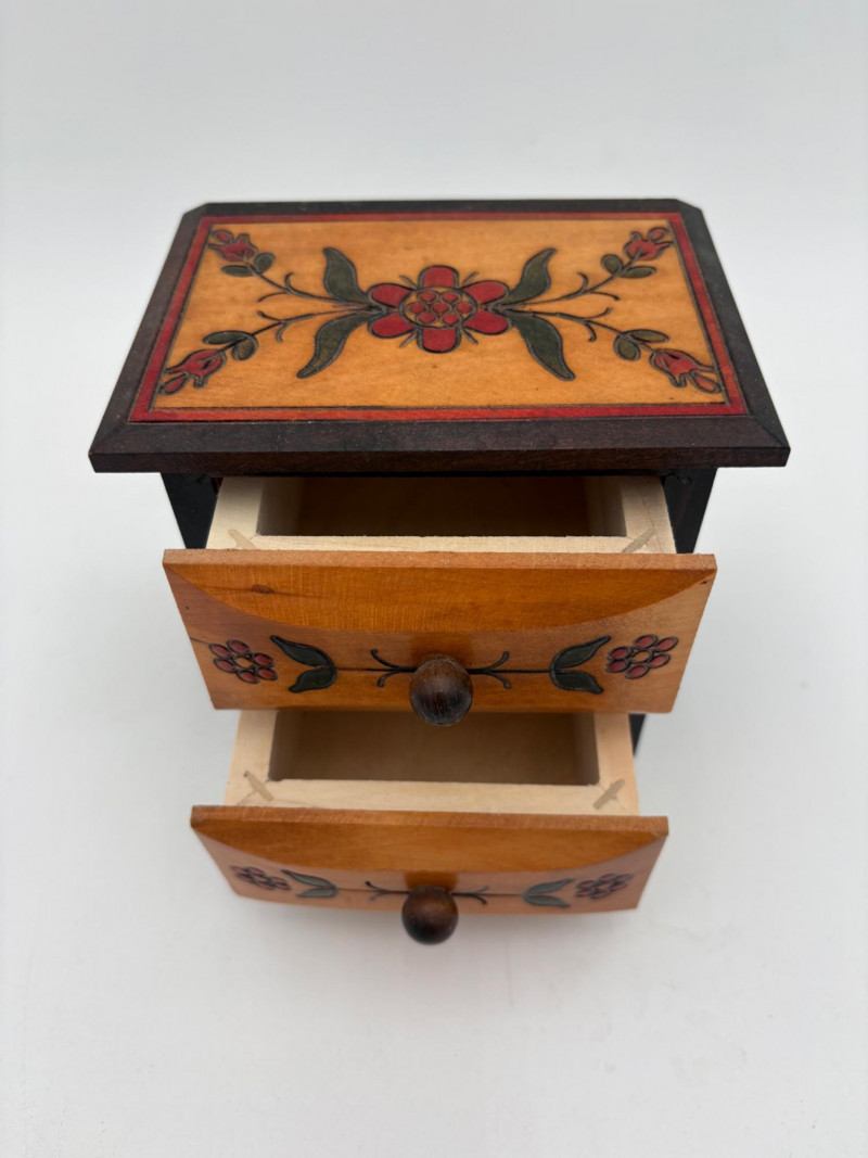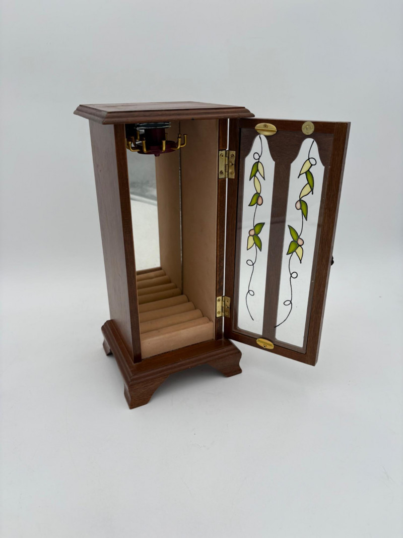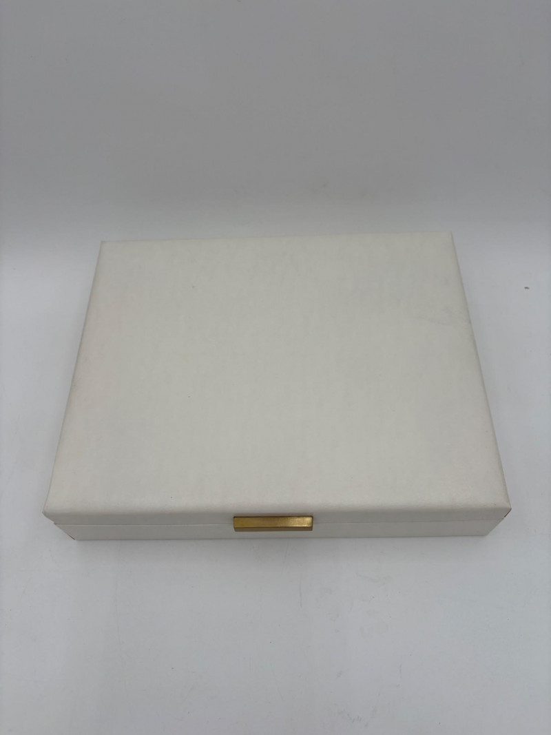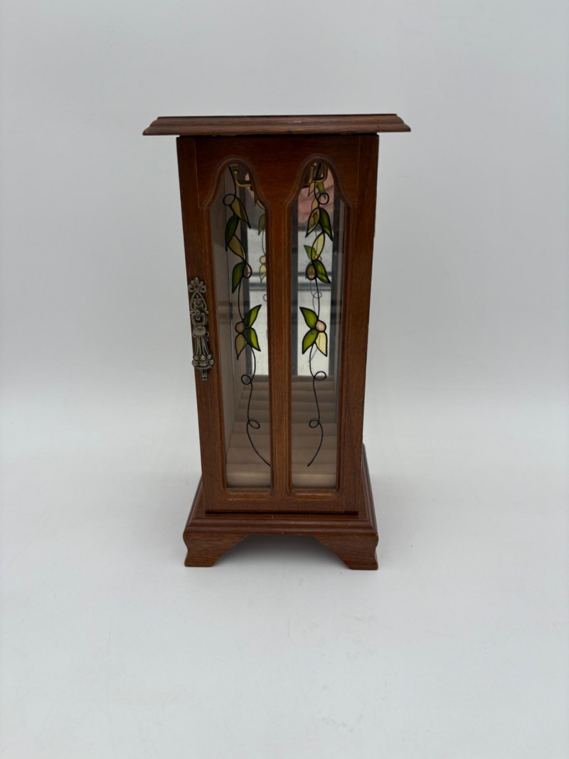 6 vintage jewelry boxes to hold all the other jewelry lots we know you are bidding on! They are in pretty good condition for their age and will prove vastly useful! - White naugahyde square box with lift up lid has blue velveteen interior with removeable separator. From Avon. Measures 2.25" H x 10.5" W x 8.5" D. - Ivory/yellow alabaster box with gold trim & floral motif. Measures 1.75" H x 2/25" square. From 1983. - Sparkly round mirrored box from Nanette Lepore. Measures 2.5" H x 6.5" diameter. - Asian box in the shape of a vanity. Red lacquer with Japanese floral motifs - 3 drawers and a fold-out mirror. Measures 9.5" H x 7" W. We think this may be for a larger dollhouse, but the piece is great and would easily work for jewelry! - Small carved wood 2-drawer box with incised floral motif. Measures 5" H x 5" W x 3.5" D. - Necklace and ring "wardrobe" in wood with brass pull, necklace wheel, and pink interior. Measures 12" H x 5.5" W x 5" D.