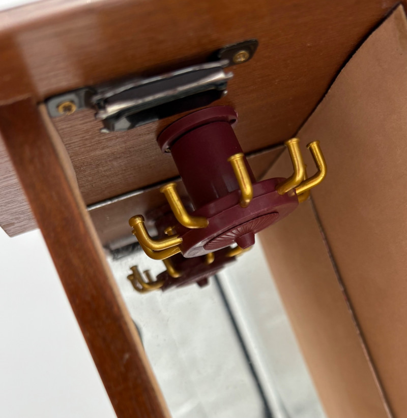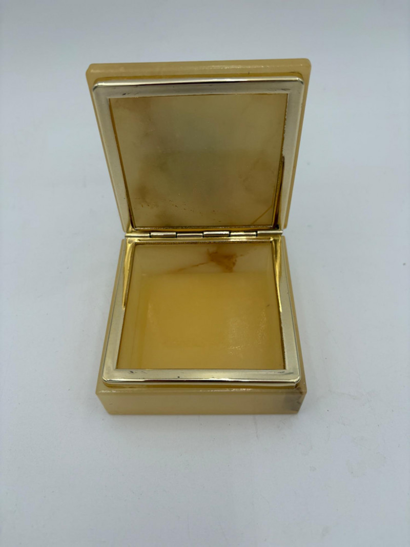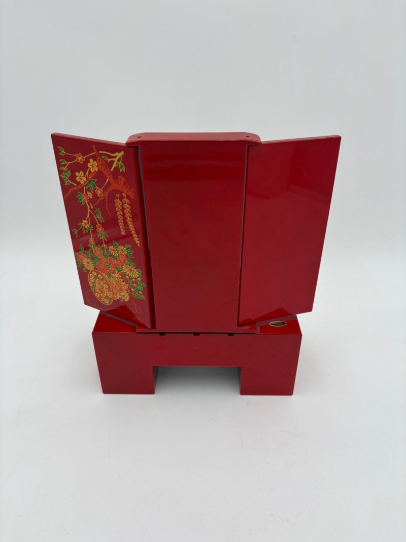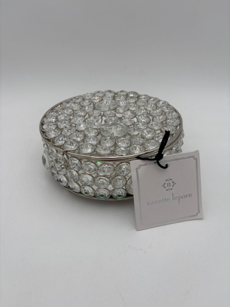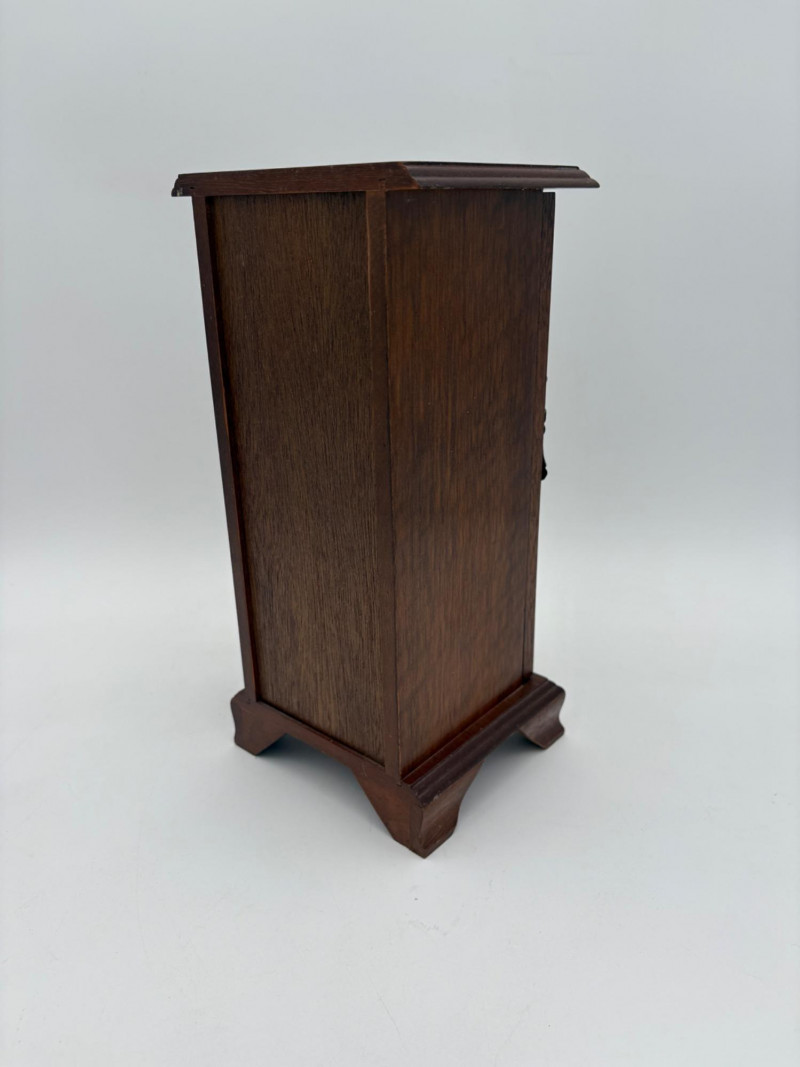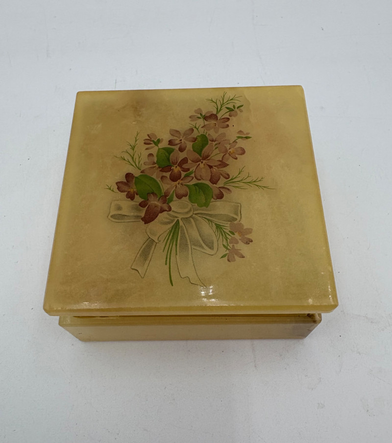 6 vintage jewelry boxes to hold all the other jewelry lots we know you are bidding on! They are in pretty good condition for their age and will prove vastly useful! - White naugahyde square box with lift up lid has blue velveteen interior with removeable separator. From Avon. Measures 2.25" H x 10.5" W x 8.5" D. - Ivory/yellow alabaster box with gold trim & floral motif. Measures 1.75" H x 2/25" square. From 1983. - Sparkly round mirrored box from Nanette Lepore. Measures 2.5" H x 6.5" diameter. - Asian box in the shape of a vanity. Red lacquer with Japanese floral motifs - 3 drawers and a fold-out mirror. Measures 9.5" H x 7" W. We think this may be for a larger dollhouse, but the piece is great and would easily work for jewelry! - Small carved wood 2-drawer box with incised floral motif. Measures 5" H x 5" W x 3.5" D. - Necklace and ring "wardrobe" in wood with brass pull, necklace wheel, and pink interior. Measures 12" H x 5.5" W x 5" D.