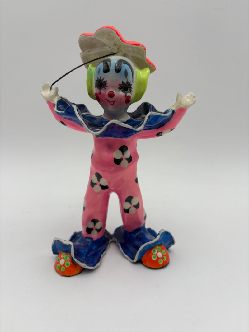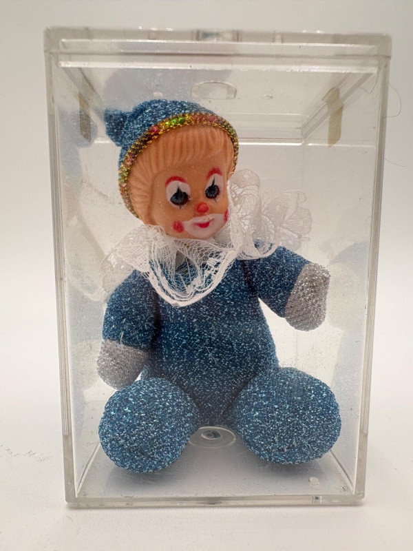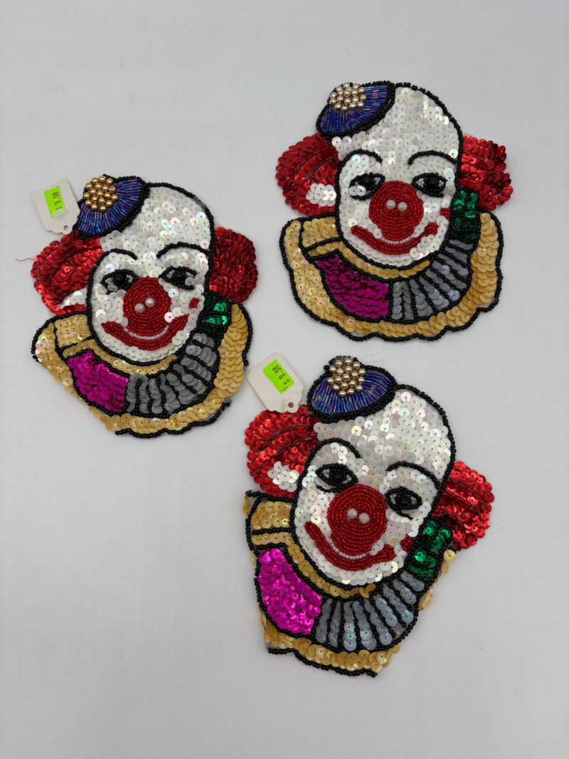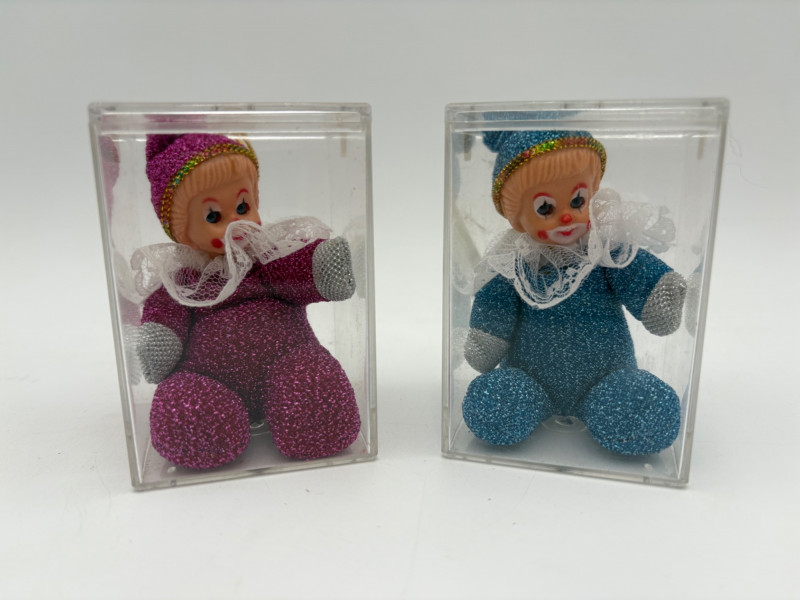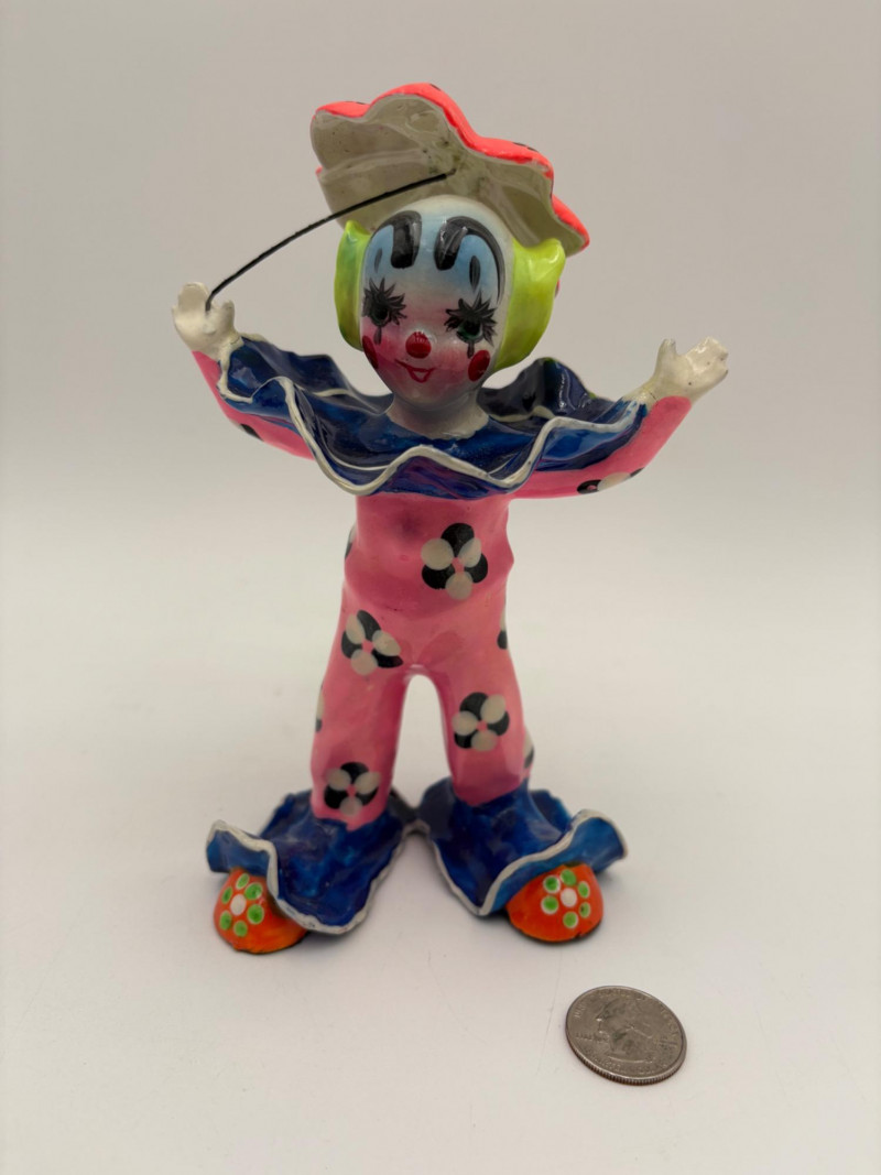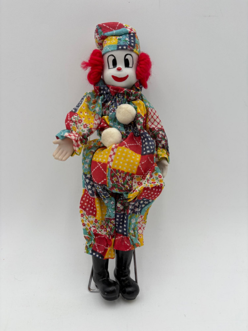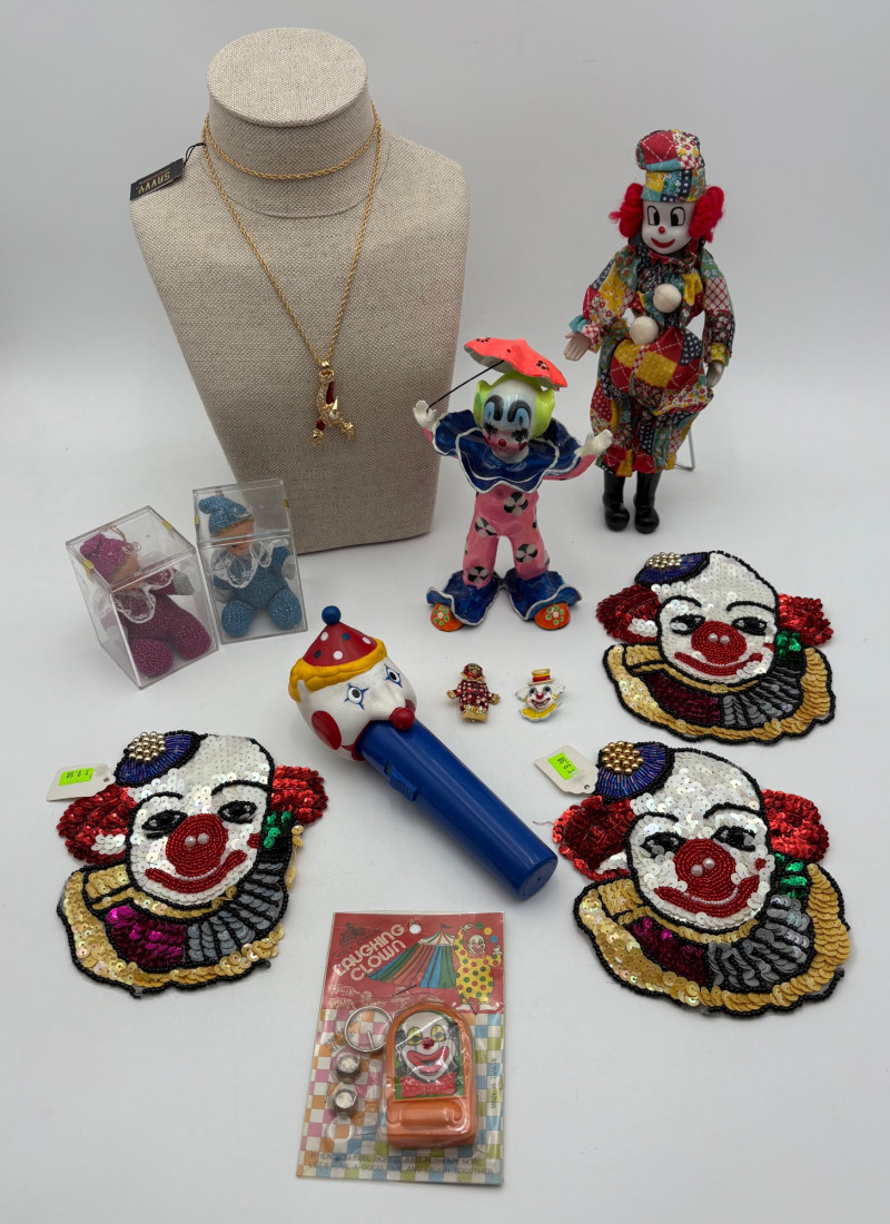 Mix of creepy and cute clowns! Vintage patchwork-clad clown with red yarn hair. Ceramic boots, hands, & head with wire stand. Note that there is a slight rip at the hipline in the vintage fabric - doesn't show much with the loud pattern & could easily be repaired with a couple stitches. Measures 10" H. Acrobatic clown on long gold necklace from Gloria Vanderbilt - new with tags. Chain measures 30" clasp to hook. Plastic clown in pink jumpsuit holding umbrella. Measures 7" H. Vintage clown flashlight. Powers on but needs new batteries and a good scrub. Measures 7" L. 3 vintage sequined applique clown heads. Beading and sequins are sewn on an organza background - it is unraveling in a couple of spots (near left forehead - see photos), but easily repaired when applied to your garment/backing. Measures 7" H x 6" W. Pair of vintage baby clown hanging ornaments/dolls, one in pink and one in blue. New in sealed boxes. Boxes measure just over 3" H. 2 vintage metal clown pins. Vintage laughing clown keychain - will need new batteries both because of age and because one of the originals is missing from the backing card. Measures 2.5" H.