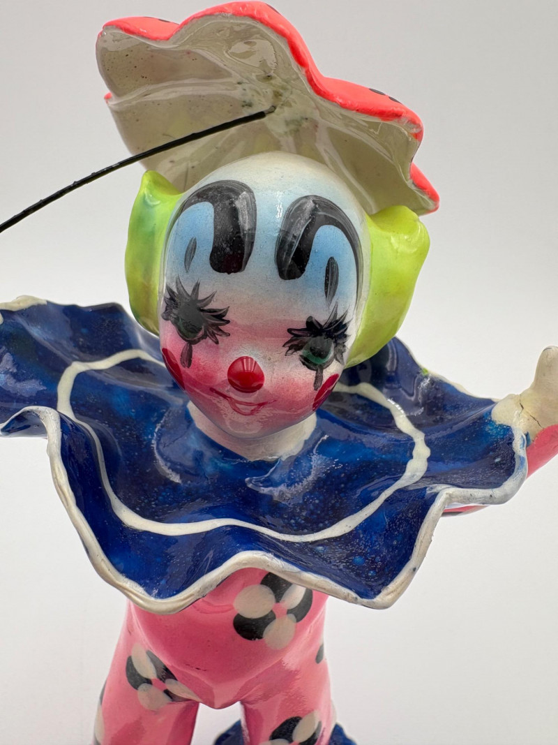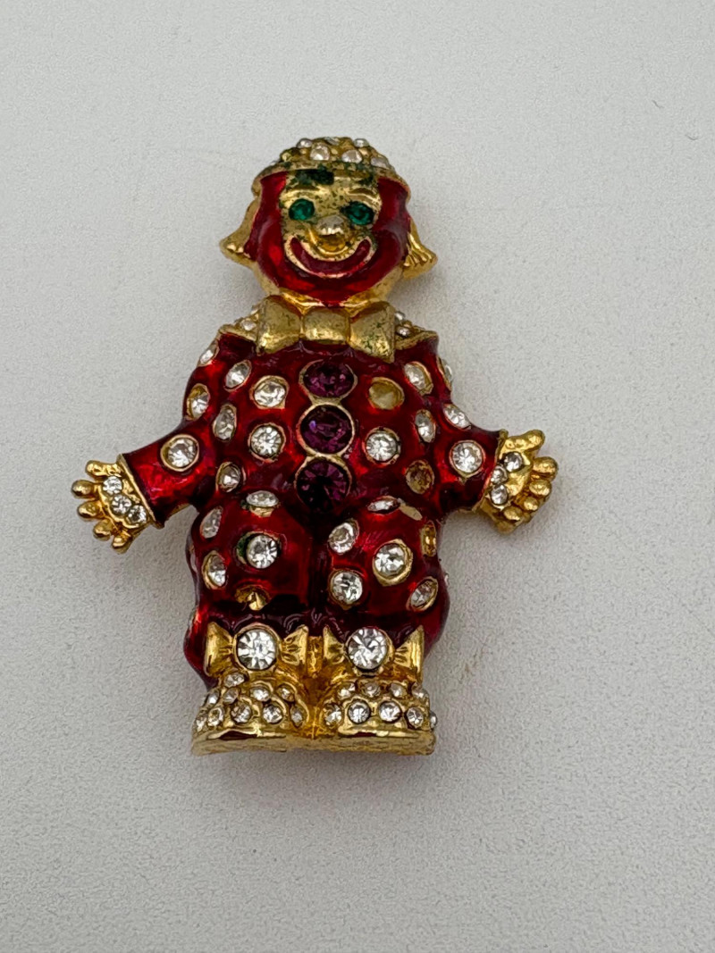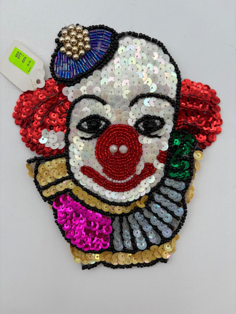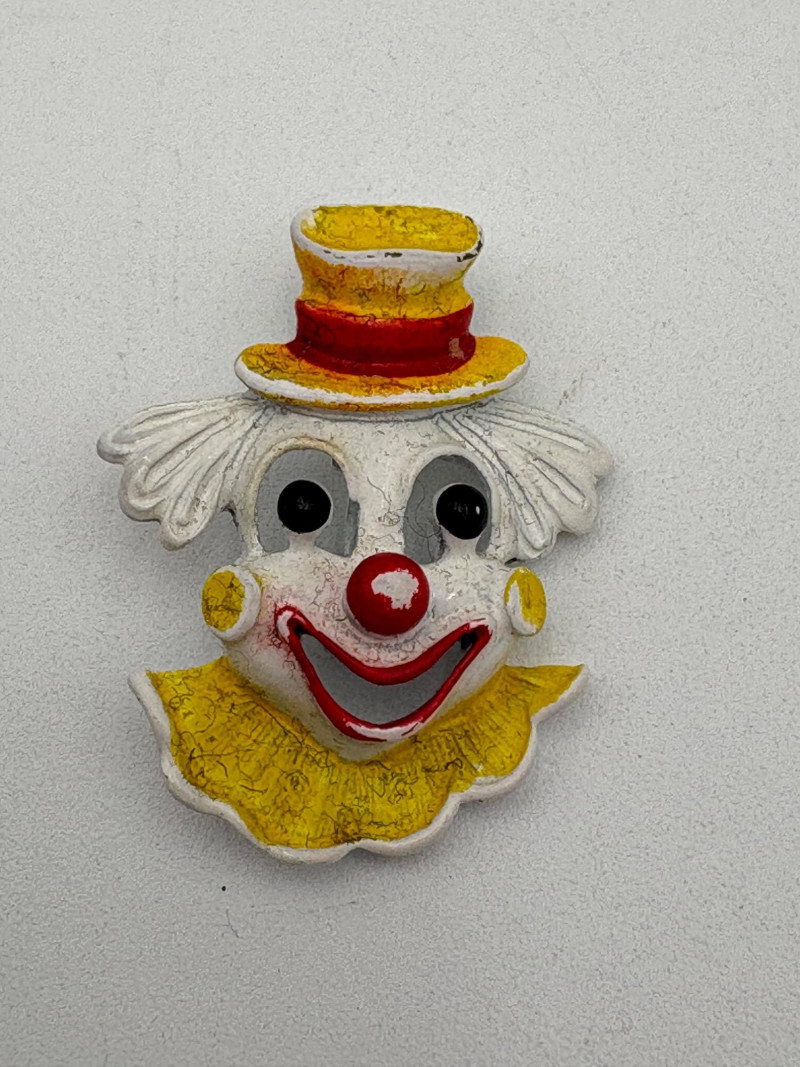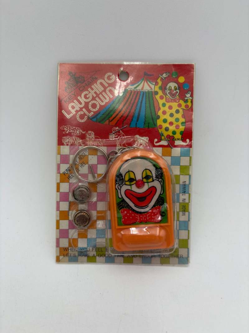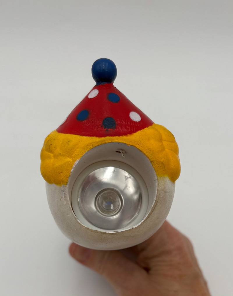 Mix of creepy and cute clowns! Vintage patchwork-clad clown with red yarn hair. Ceramic boots, hands, & head with wire stand. Note that there is a slight rip at the hipline in the vintage fabric - doesn't show much with the loud pattern & could easily be repaired with a couple stitches. Measures 10" H. Acrobatic clown on long gold necklace from Gloria Vanderbilt - new with tags. Chain measures 30" clasp to hook. Plastic clown in pink jumpsuit holding umbrella. Measures 7" H. Vintage clown flashlight. Powers on but needs new batteries and a good scrub. Measures 7" L. 3 vintage sequined applique clown heads. Beading and sequins are sewn on an organza background - it is unraveling in a couple of spots (near left forehead - see photos), but easily repaired when applied to your garment/backing. Measures 7" H x 6" W. Pair of vintage baby clown hanging ornaments/dolls, one in pink and one in blue. New in sealed boxes. Boxes measure just over 3" H. 2 vintage metal clown pins. Vintage laughing clown keychain - will need new batteries both because of age and because one of the originals is missing from the backing card. Measures 2.5" H.