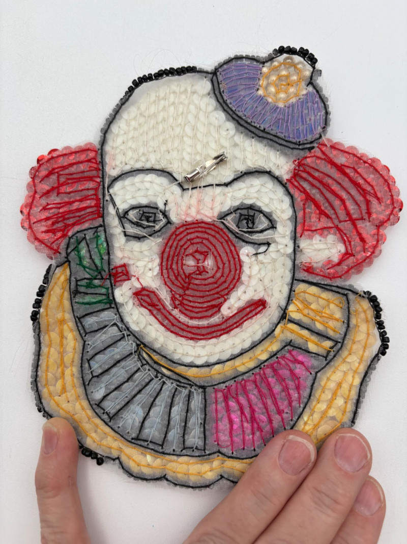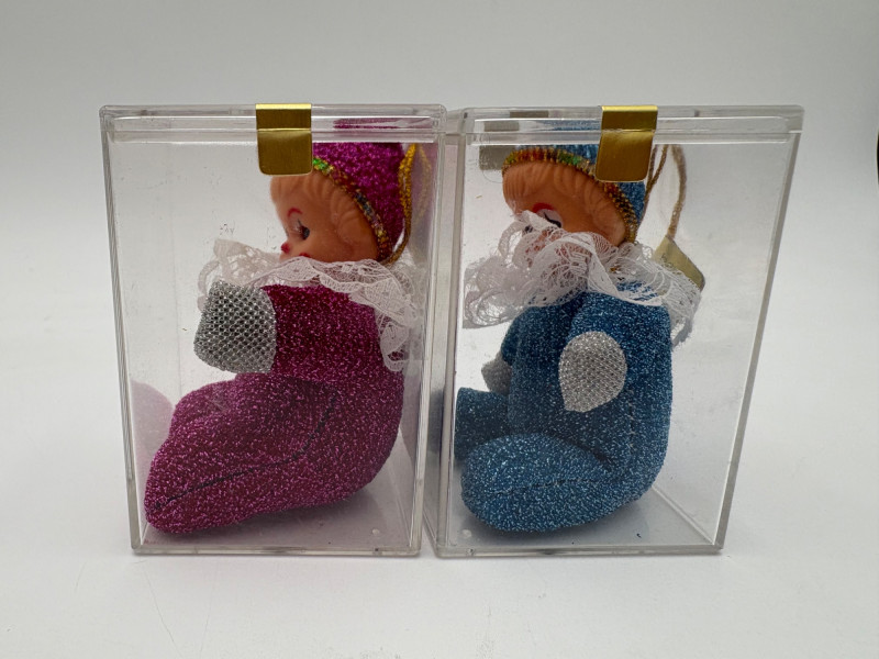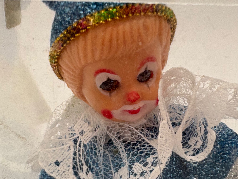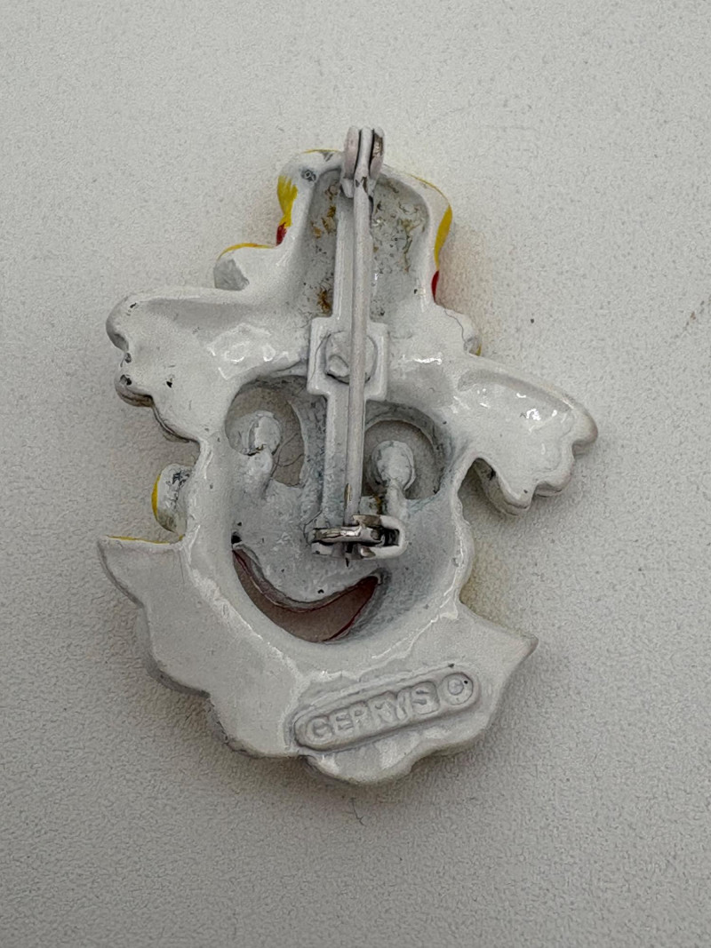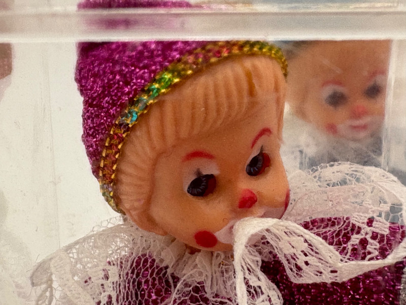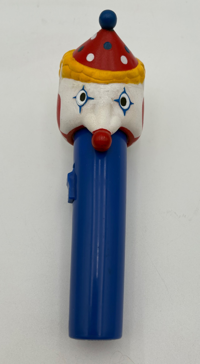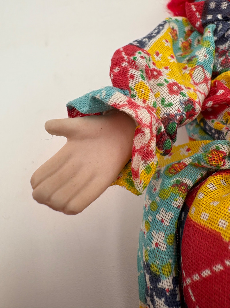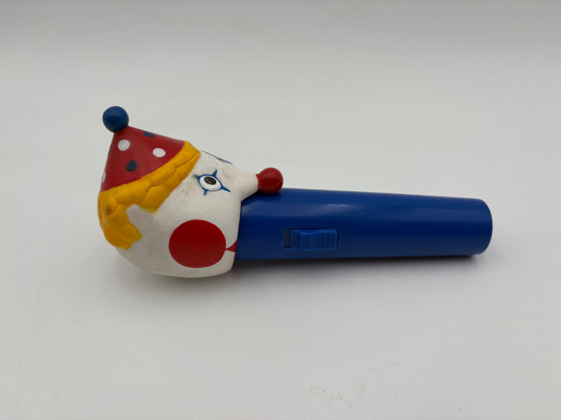 Mix of creepy and cute clowns! Vintage patchwork-clad clown with red yarn hair. Ceramic boots, hands, & head with wire stand. Note that there is a slight rip at the hipline in the vintage fabric - doesn't show much with the loud pattern & could easily be repaired with a couple stitches. Measures 10" H. Acrobatic clown on long gold necklace from Gloria Vanderbilt - new with tags. Chain measures 30" clasp to hook. Plastic clown in pink jumpsuit holding umbrella. Measures 7" H. Vintage clown flashlight. Powers on but needs new batteries and a good scrub. Measures 7" L. 3 vintage sequined applique clown heads. Beading and sequins are sewn on an organza background - it is unraveling in a couple of spots (near left forehead - see photos), but easily repaired when applied to your garment/backing. Measures 7" H x 6" W. Pair of vintage baby clown hanging ornaments/dolls, one in pink and one in blue. New in sealed boxes. Boxes measure just over 3" H. 2 vintage metal clown pins. Vintage laughing clown keychain - will need new batteries both because of age and because one of the originals is missing from the backing card. Measures 2.5" H.