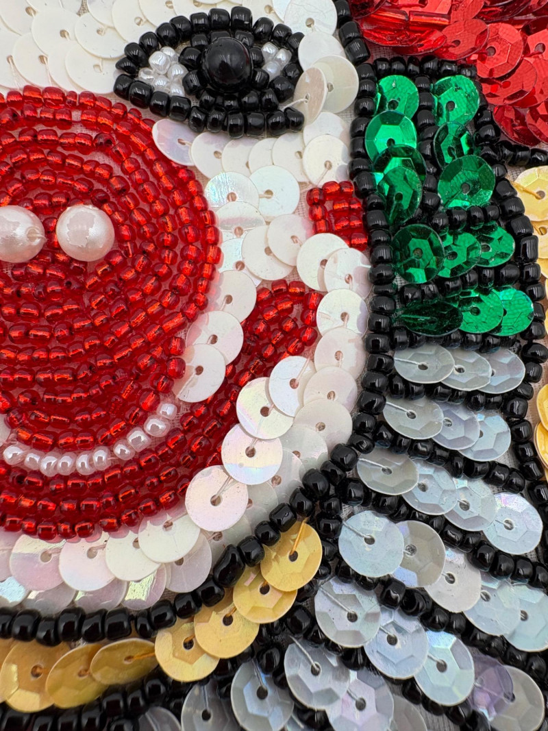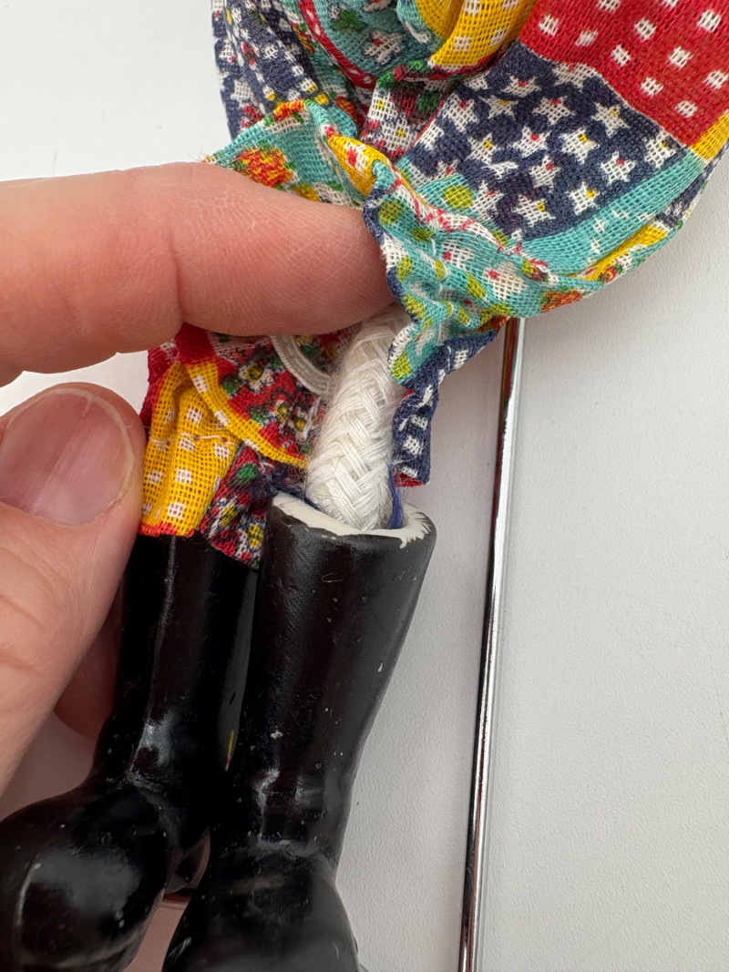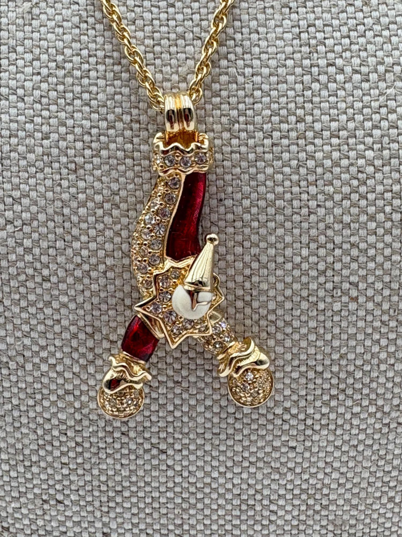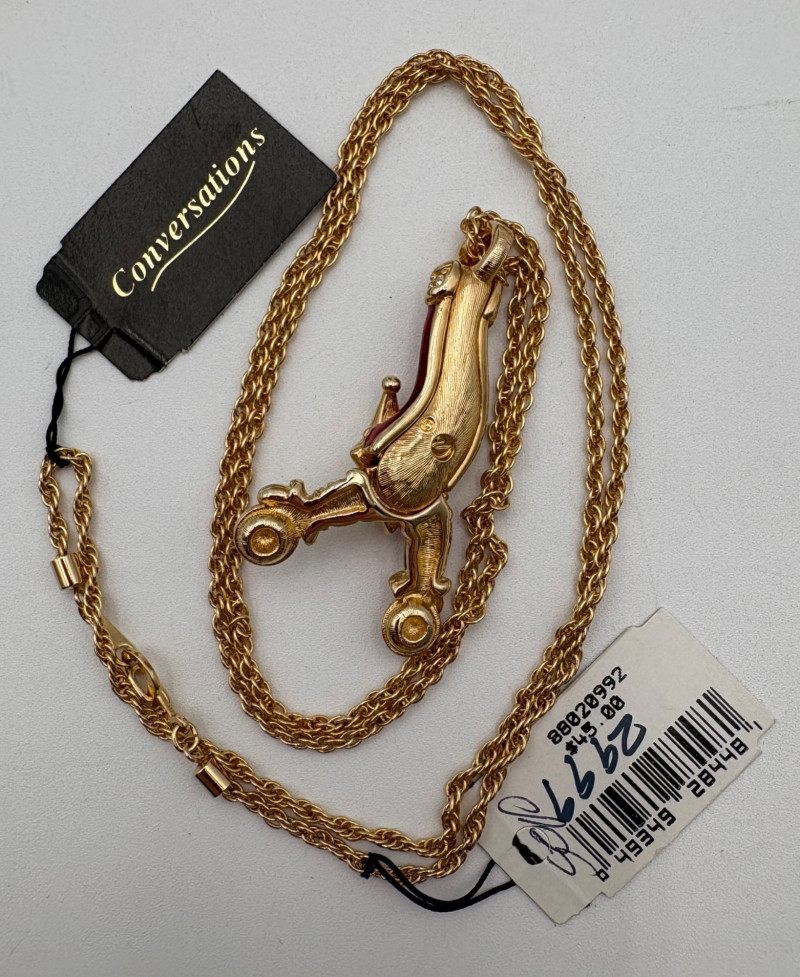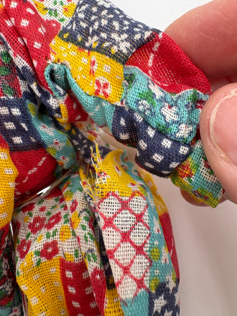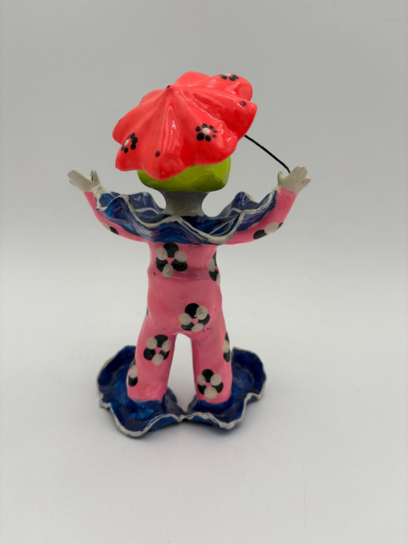 Mix of creepy and cute clowns! Vintage patchwork-clad clown with red yarn hair. Ceramic boots, hands, & head with wire stand. Note that there is a slight rip at the hipline in the vintage fabric - doesn't show much with the loud pattern & could easily be repaired with a couple stitches. Measures 10" H. Acrobatic clown on long gold necklace from Gloria Vanderbilt - new with tags. Chain measures 30" clasp to hook. Plastic clown in pink jumpsuit holding umbrella. Measures 7" H. Vintage clown flashlight. Powers on but needs new batteries and a good scrub. Measures 7" L. 3 vintage sequined applique clown heads. Beading and sequins are sewn on an organza background - it is unraveling in a couple of spots (near left forehead - see photos), but easily repaired when applied to your garment/backing. Measures 7" H x 6" W. Pair of vintage baby clown hanging ornaments/dolls, one in pink and one in blue. New in sealed boxes. Boxes measure just over 3" H. 2 vintage metal clown pins. Vintage laughing clown keychain - will need new batteries both because of age and because one of the originals is missing from the backing card. Measures 2.5" H.