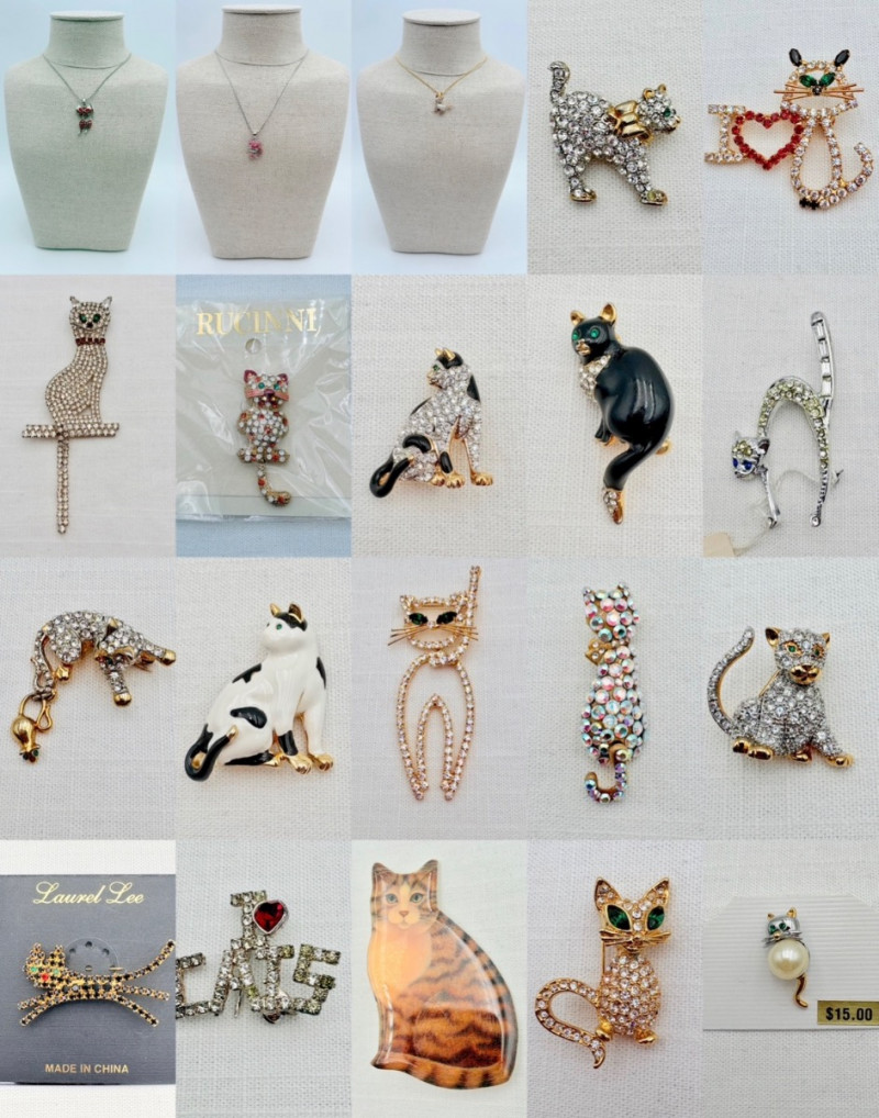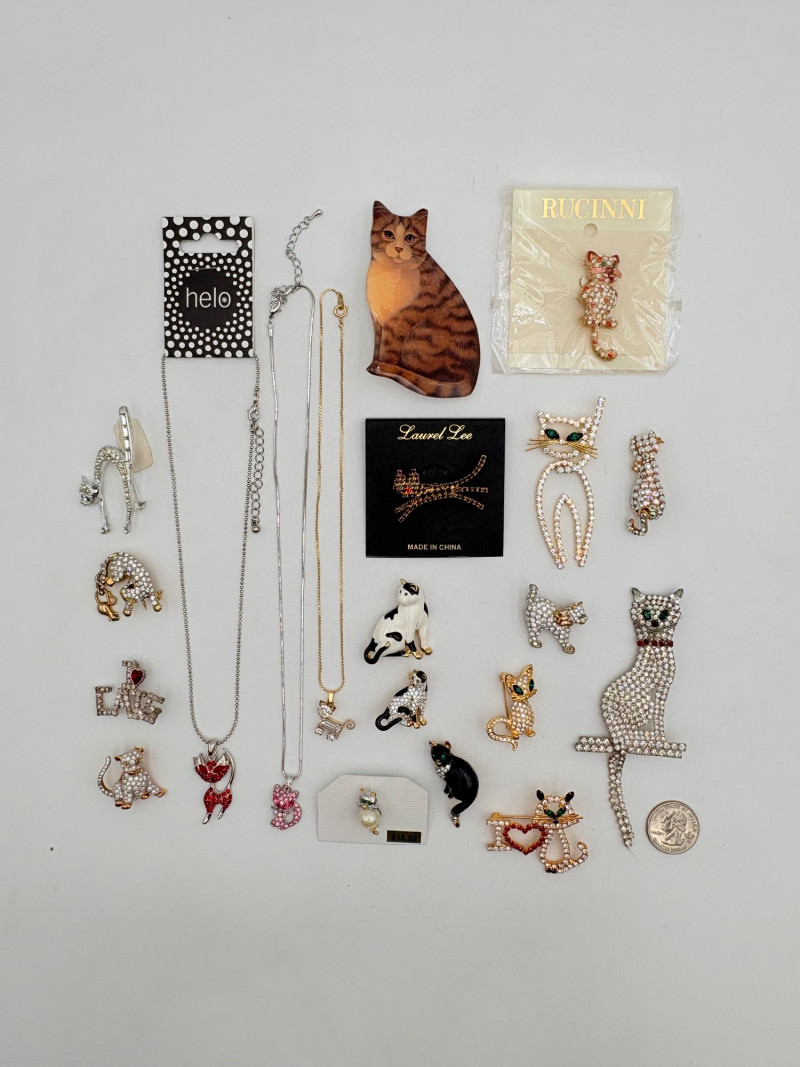 Large crowd of cats with 3 necklaces and 17 pins. Good quality costume jewelry with a number of vintage pieces. Please see photos for details.
