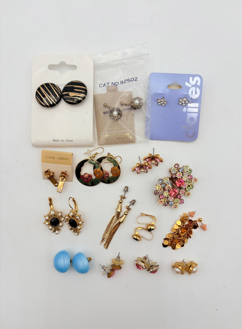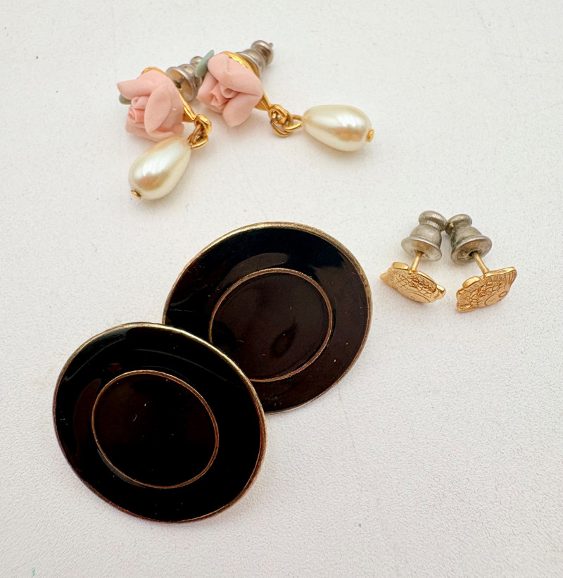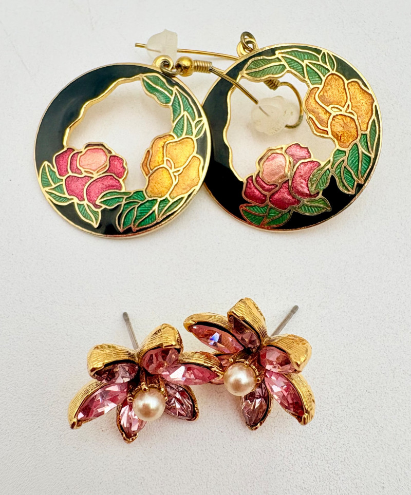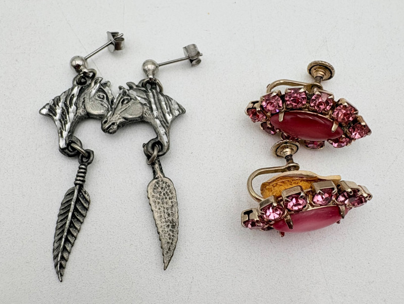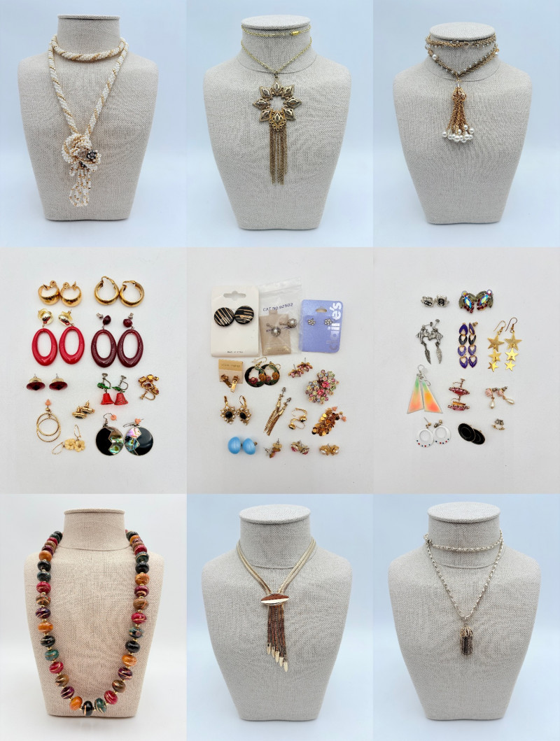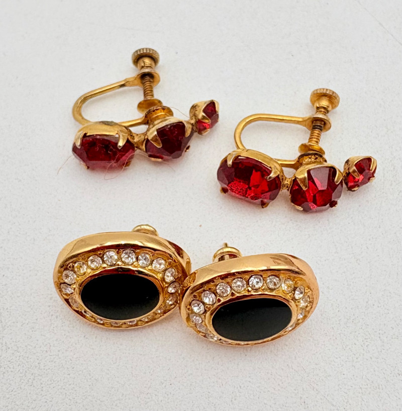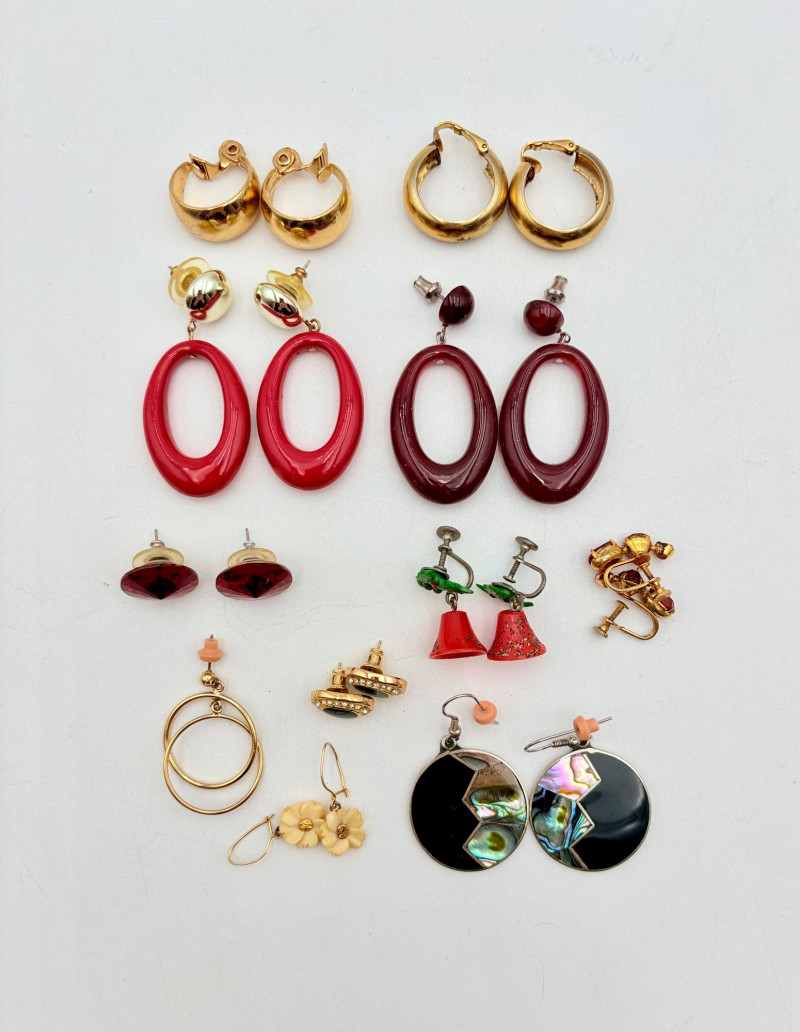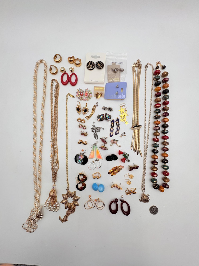 Your grandma's jewelry was vintage and yours is contemporary - your mom's falls somewhere in-between! This is a large grouping of vintage & almost vintage earrings and necklaces we would consider "transitional" in style (sounds better than "mom style", no?) Please see photos for details - earrings are a mix of clip-on and pierced with most being the latter.