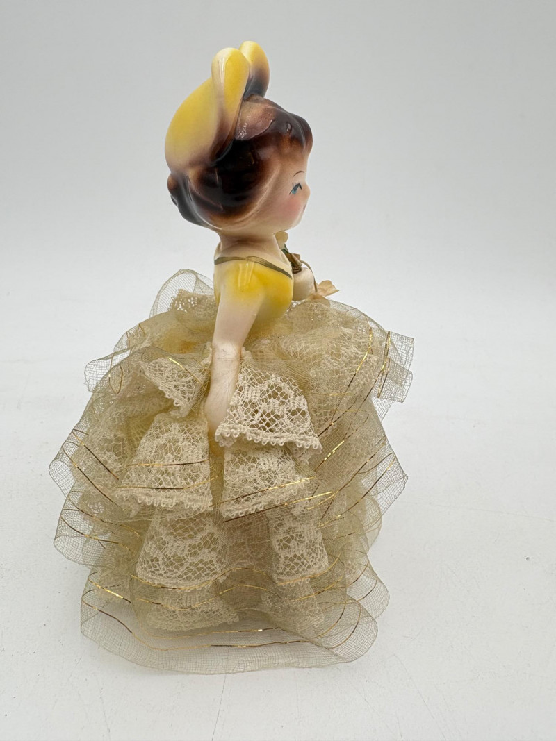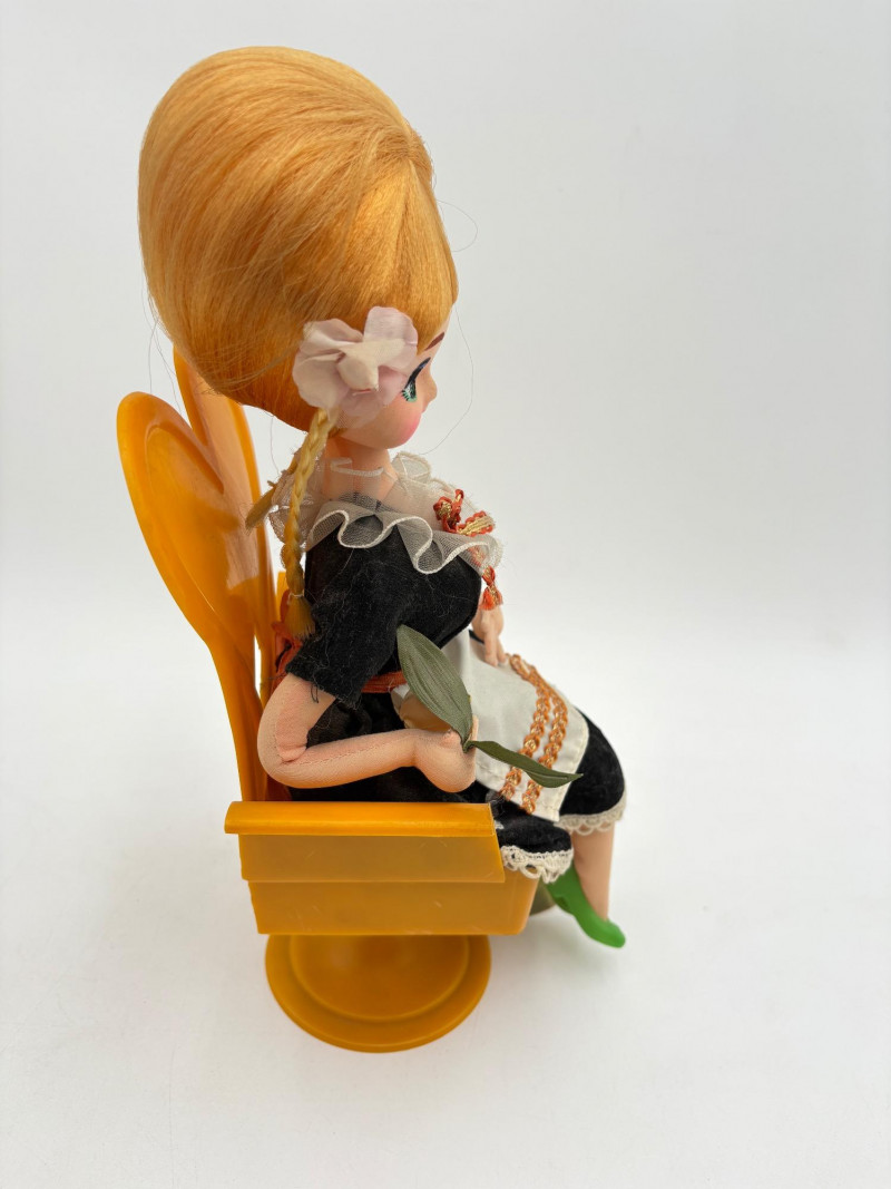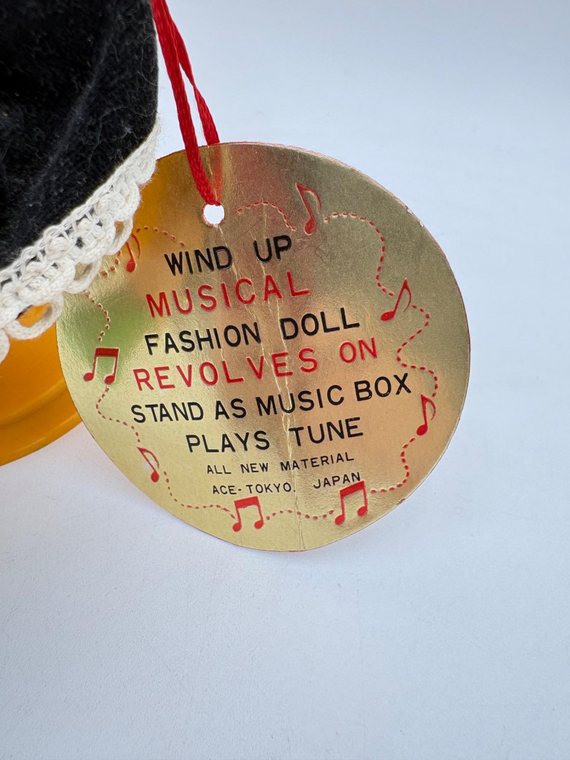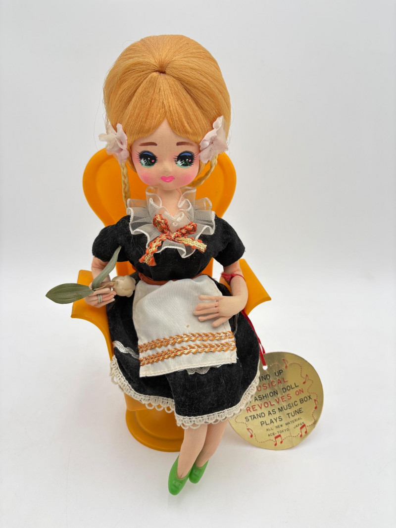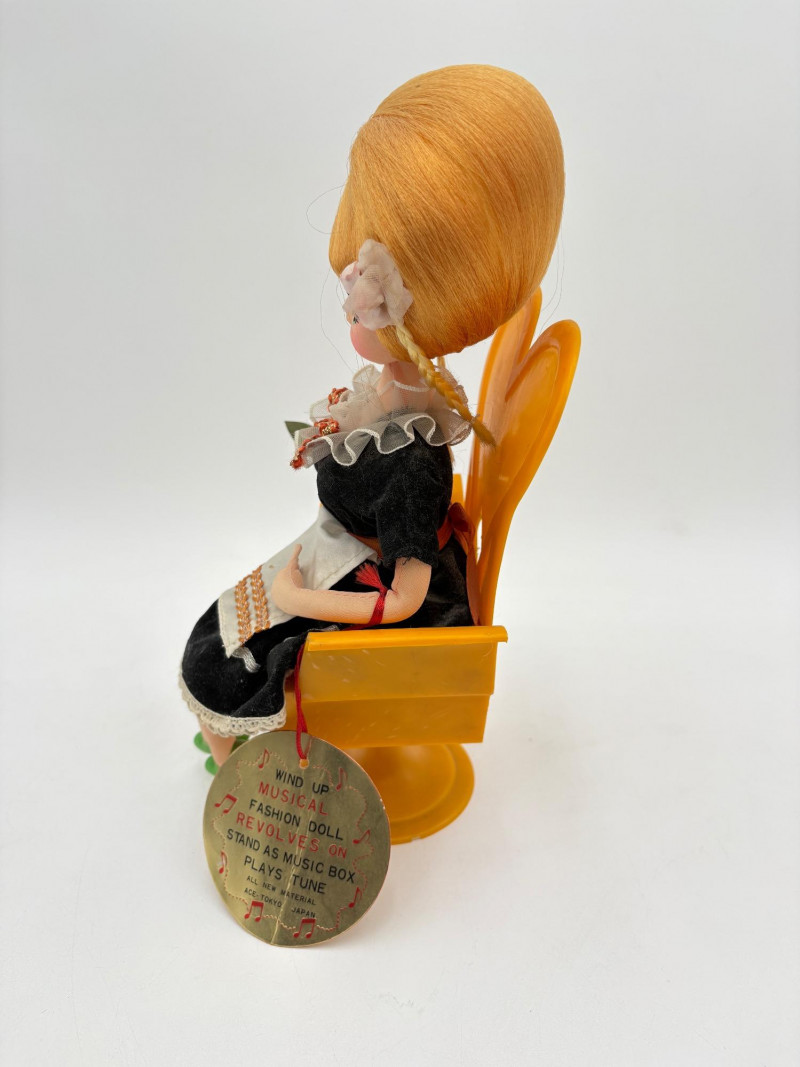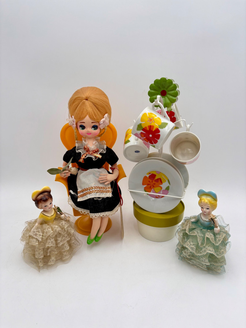 Three very vintage 1960s dolls to share your afternoon tea with - The ladies are all made in Japan and your event even has musical accompaniment! All are in good vintage condition with a few minor flaws here and there. Large doll in black dress sits in a mod 1960s chair that plays music and spins her around - works great! She measures approx. 12" H. From Tokyo manufacturer Senpo. Pair of porcelain fancy dolls with layered tulle fabric dresses are from Reis of Japan and measure approx. 6.5" H. Teacups and saucers in a mod design with accompanying metal rack. They are porcelain and made in Japan. Plates measure 4.5" diameter while cups measure 2.25" H. In excellent vintage shape with only very minor flaws from use - most egregious is shown in the last photo but doesn't affect function. Please note - like most other things in this auction, items have been in storage for a long time - a good cleaning would really do right by these items.