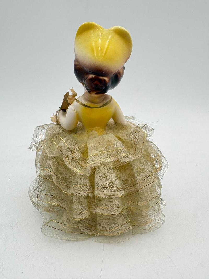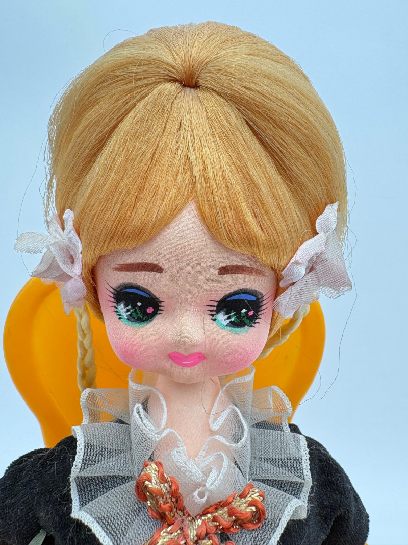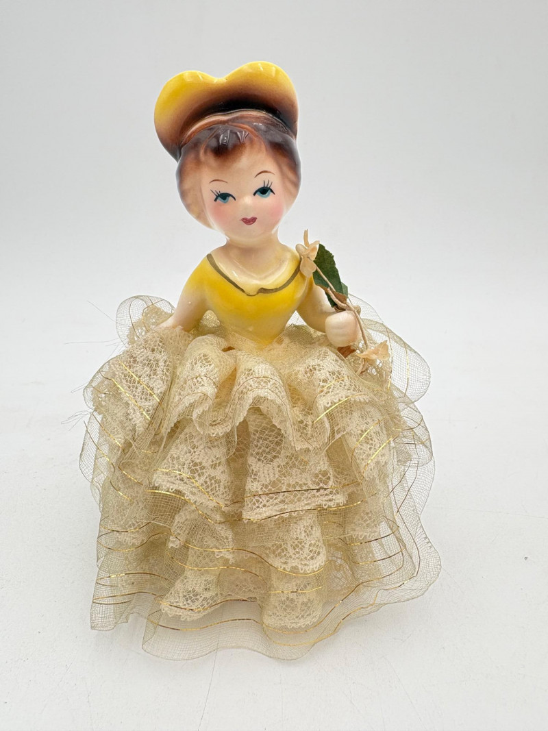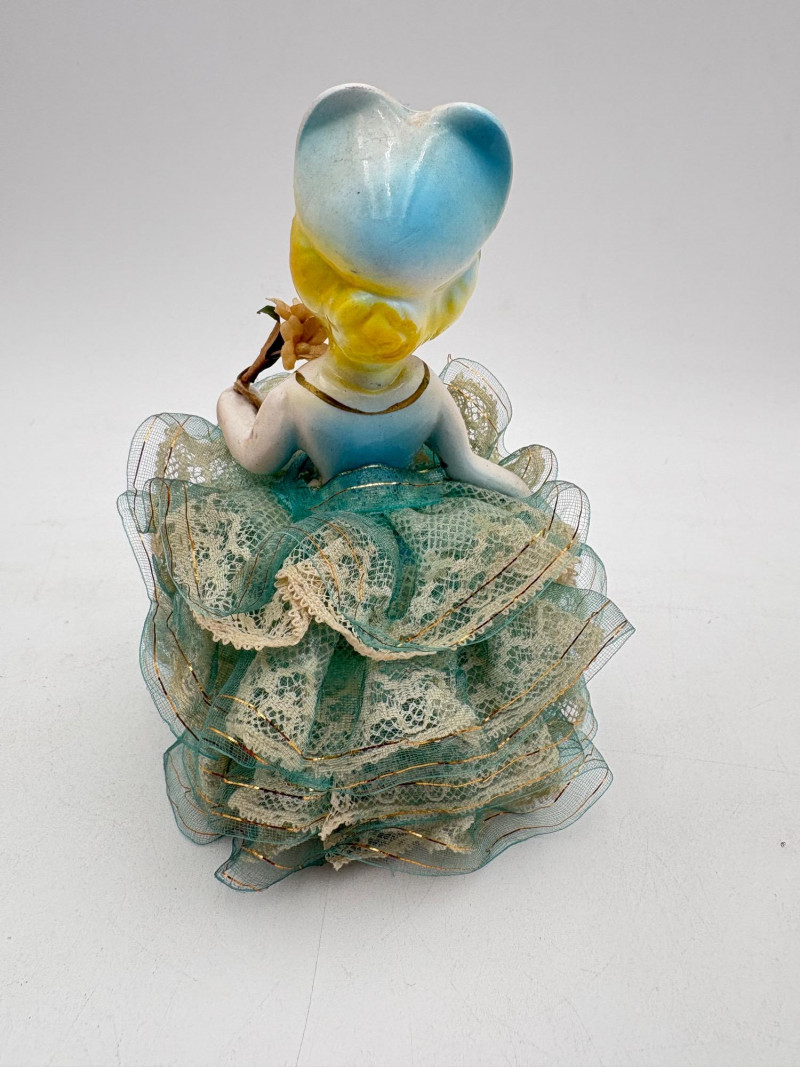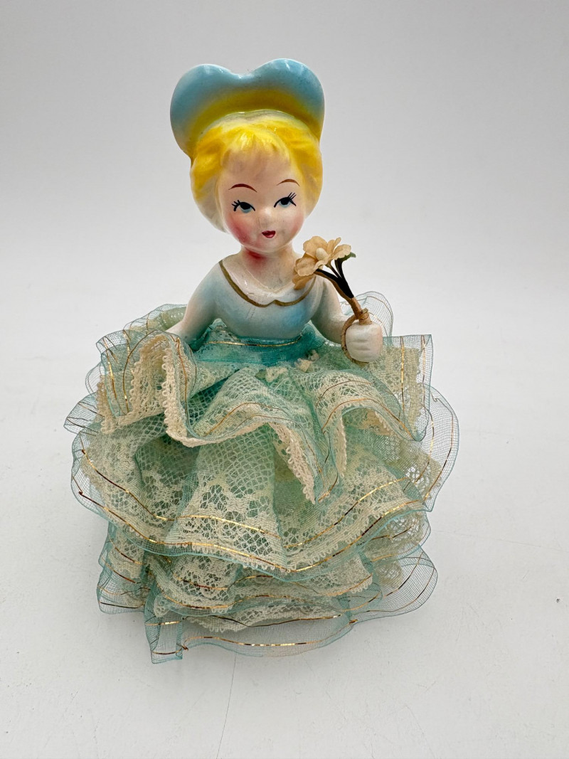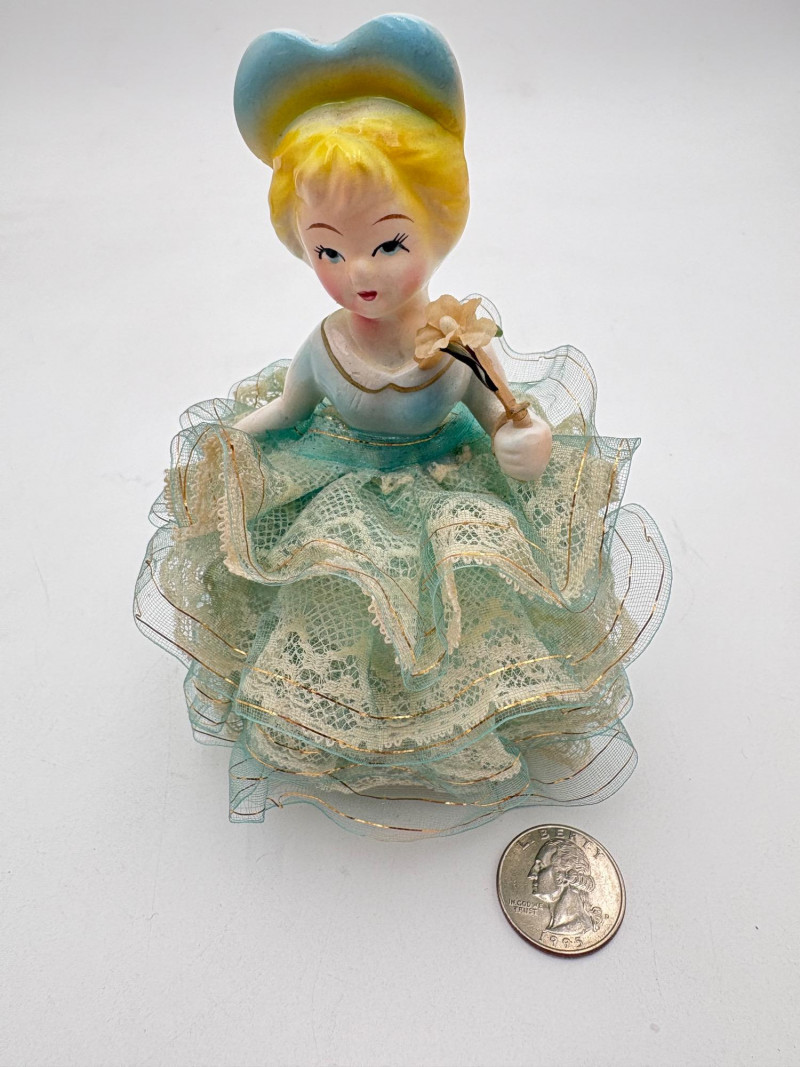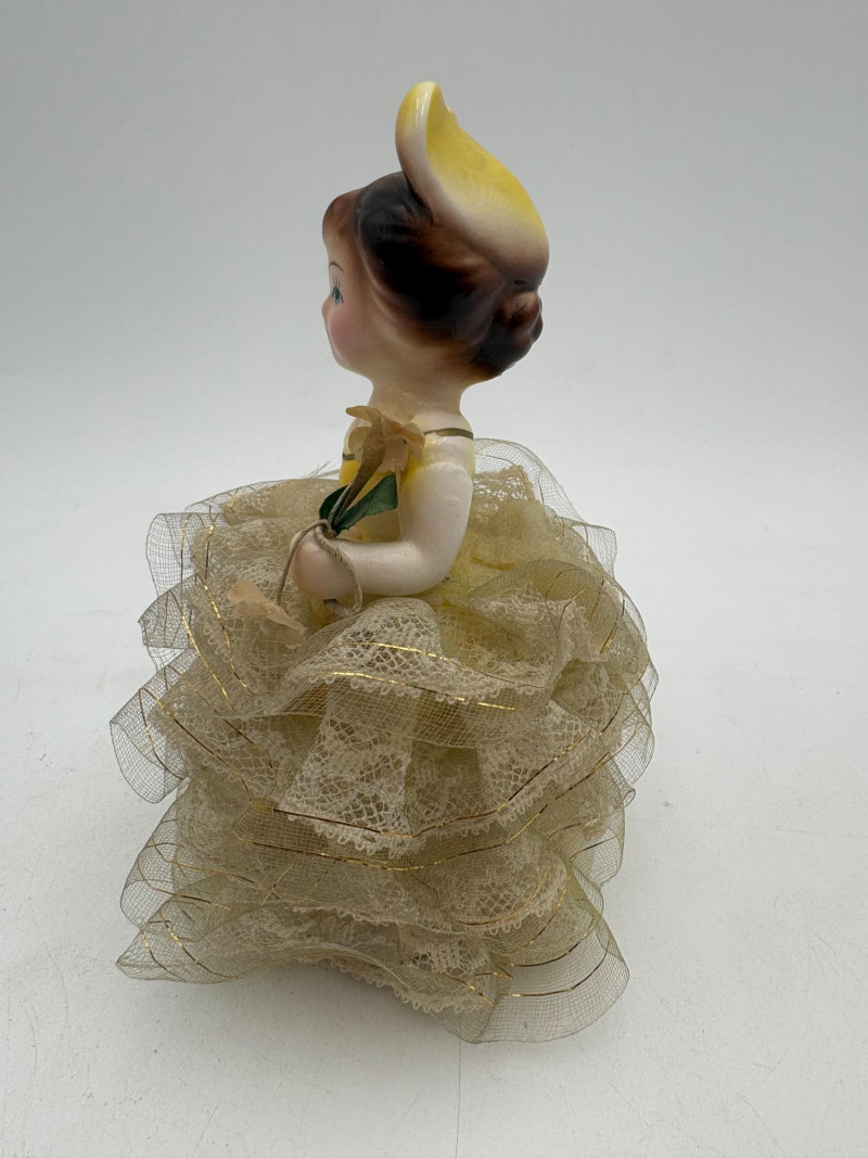 Three very vintage 1960s dolls to share your afternoon tea with - The ladies are all made in Japan and your event even has musical accompaniment! All are in good vintage condition with a few minor flaws here and there. Large doll in black dress sits in a mod 1960s chair that plays music and spins her around - works great! She measures approx. 12" H. From Tokyo manufacturer Senpo. Pair of porcelain fancy dolls with layered tulle fabric dresses are from Reis of Japan and measure approx. 6.5" H. Teacups and saucers in a mod design with accompanying metal rack. They are porcelain and made in Japan. Plates measure 4.5" diameter while cups measure 2.25" H. In excellent vintage shape with only very minor flaws from use - most egregious is shown in the last photo but doesn't affect function. Please note - like most other things in this auction, items have been in storage for a long time - a good cleaning would really do right by these items.