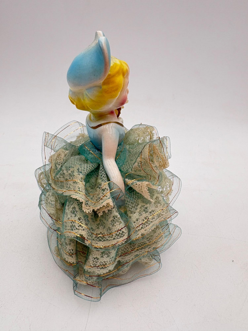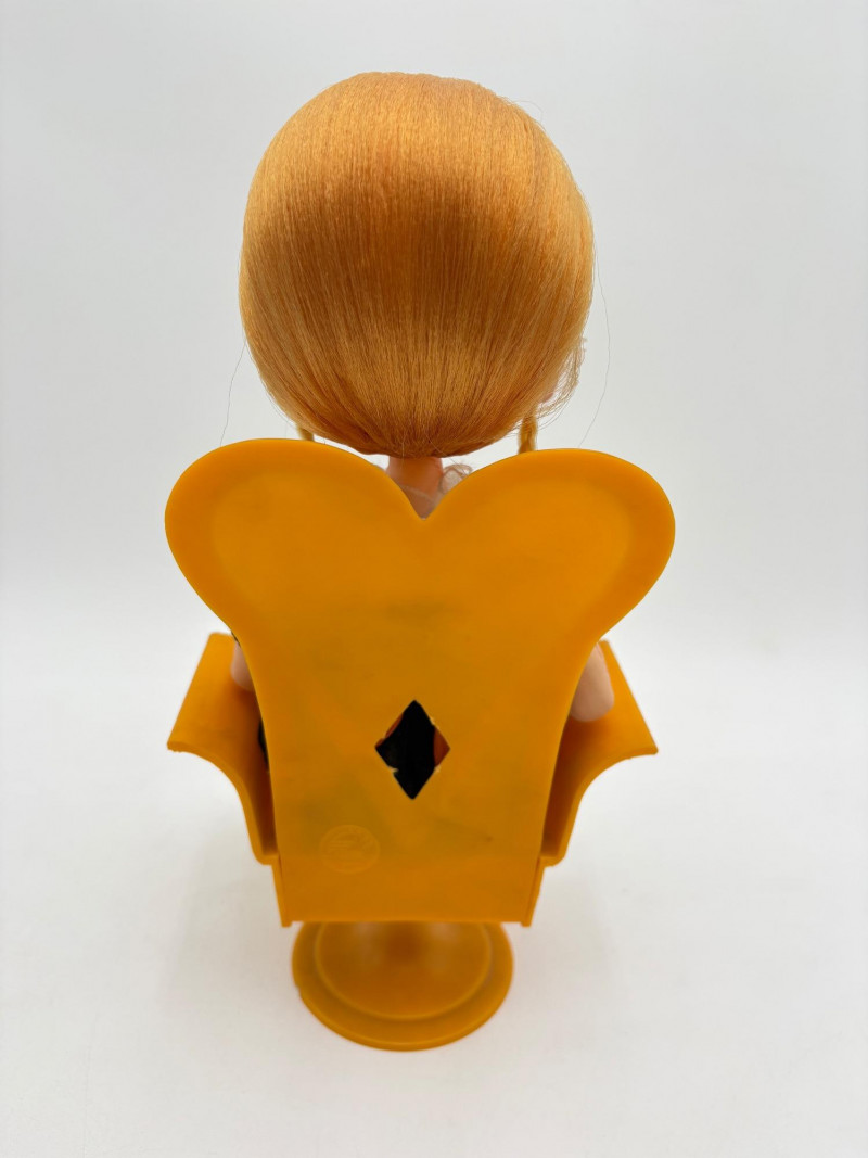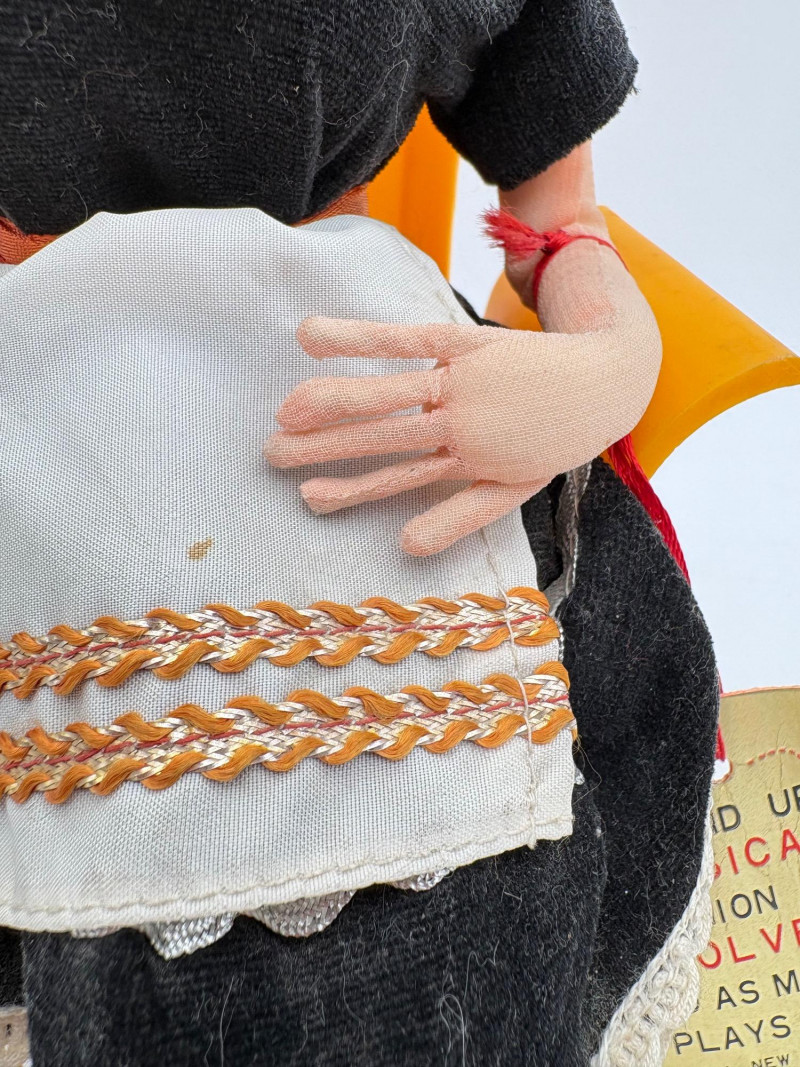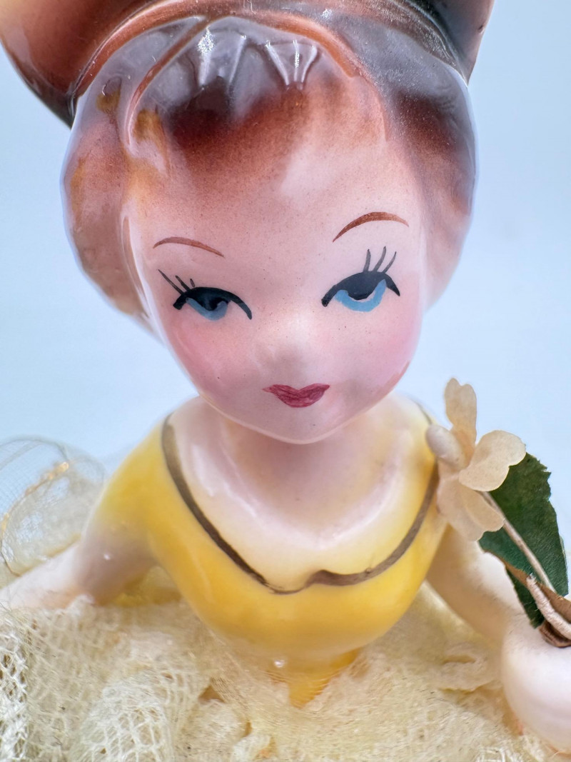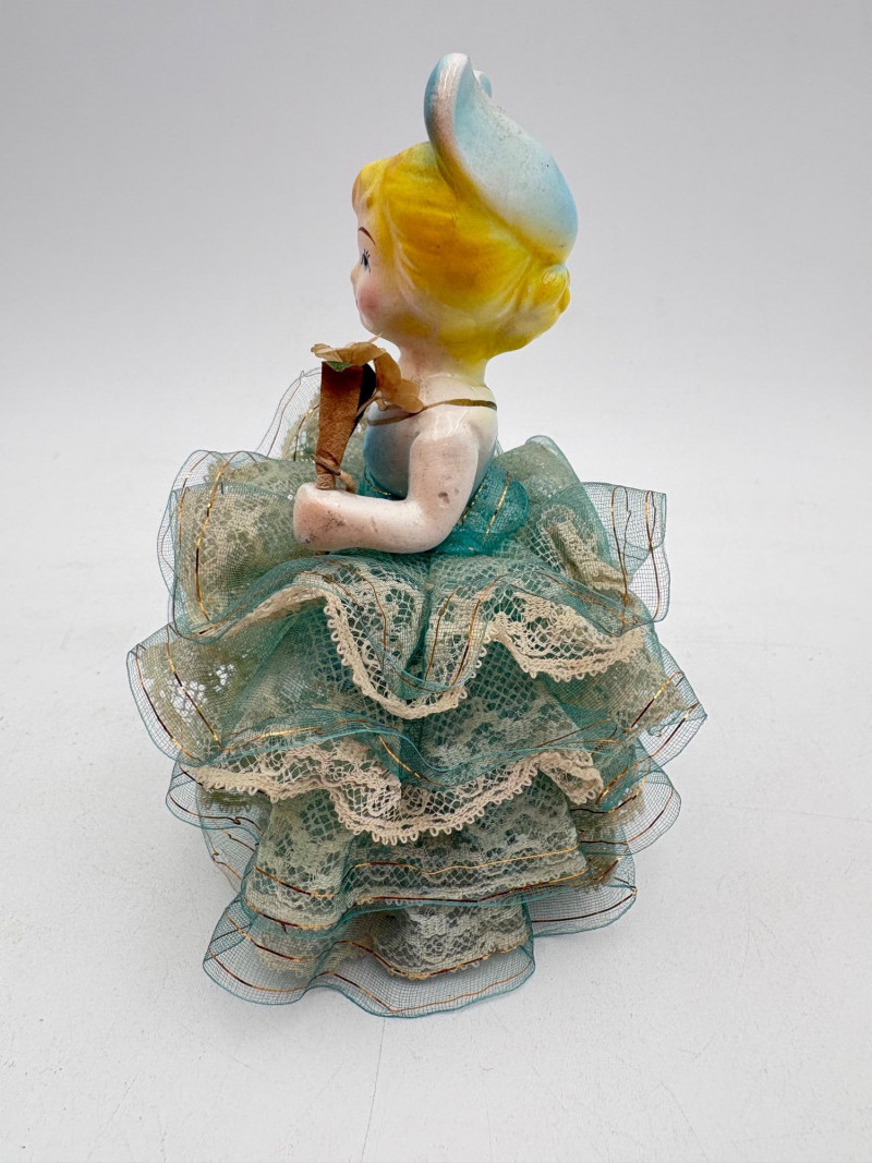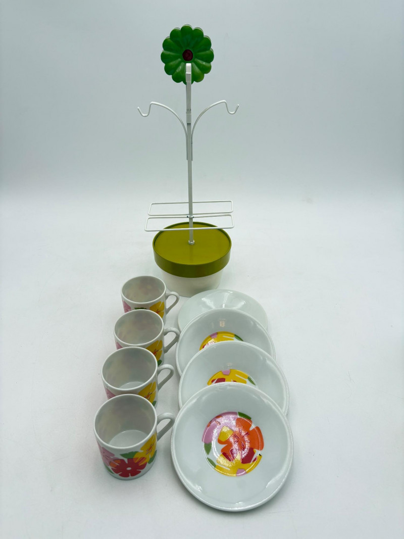 Three very vintage 1960s dolls to share your afternoon tea with - The ladies are all made in Japan and your event even has musical accompaniment! All are in good vintage condition with a few minor flaws here and there. Large doll in black dress sits in a mod 1960s chair that plays music and spins her around - works great! She measures approx. 12" H. From Tokyo manufacturer Senpo. Pair of porcelain fancy dolls with layered tulle fabric dresses are from Reis of Japan and measure approx. 6.5" H. Teacups and saucers in a mod design with accompanying metal rack. They are porcelain and made in Japan. Plates measure 4.5" diameter while cups measure 2.25" H. In excellent vintage shape with only very minor flaws from use - most egregious is shown in the last photo but doesn't affect function. Please note - like most other things in this auction, items have been in storage for a long time - a good cleaning would really do right by these items.
