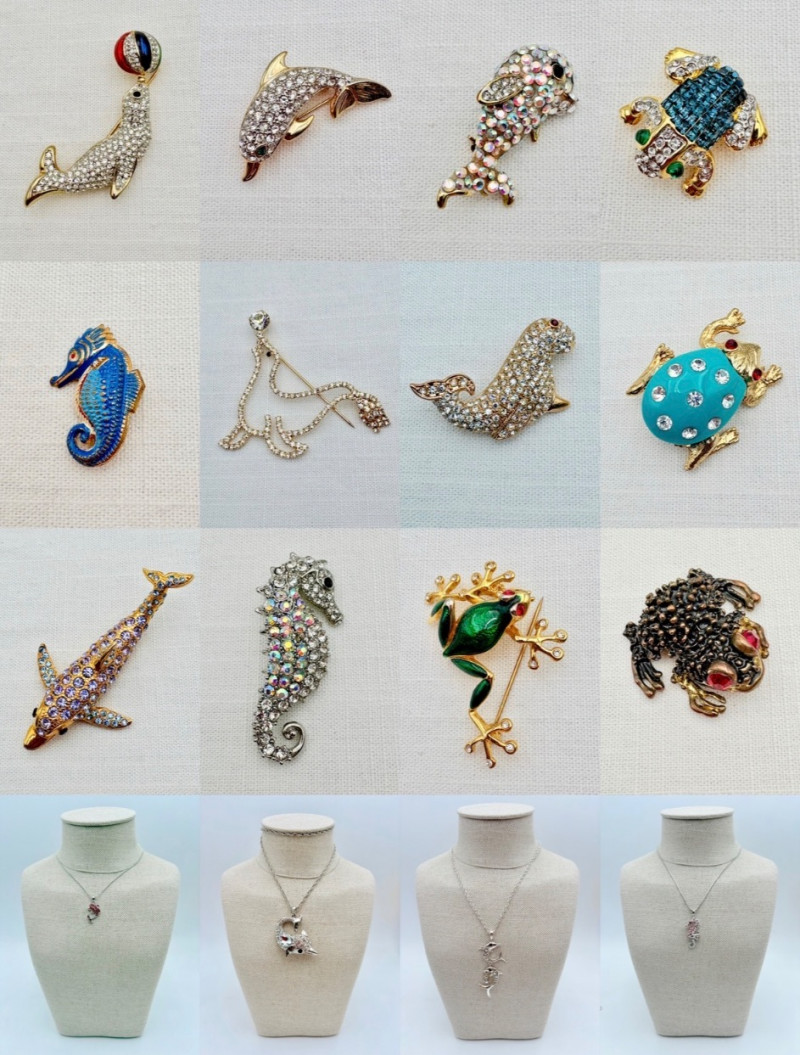 Mixed lot of creatures who live in or near the water! 4 necklaces & 12 pins. Good quality costume jewelry with a number of vintage pieces. Please see photos for details.