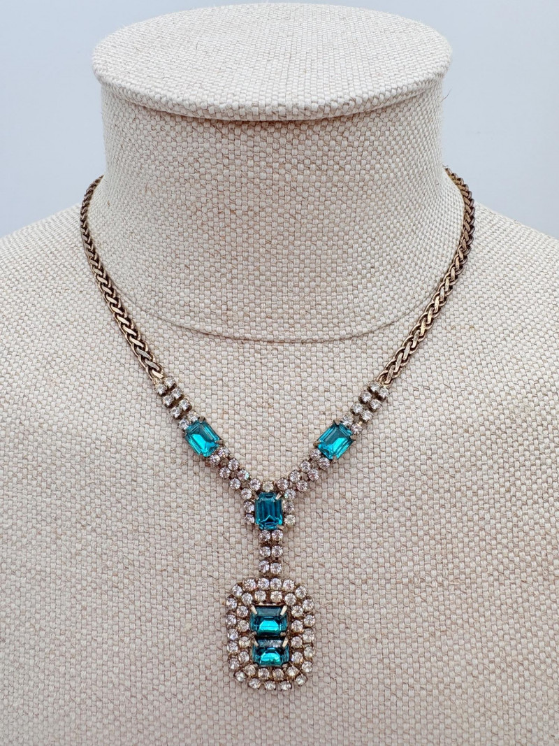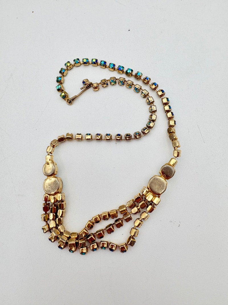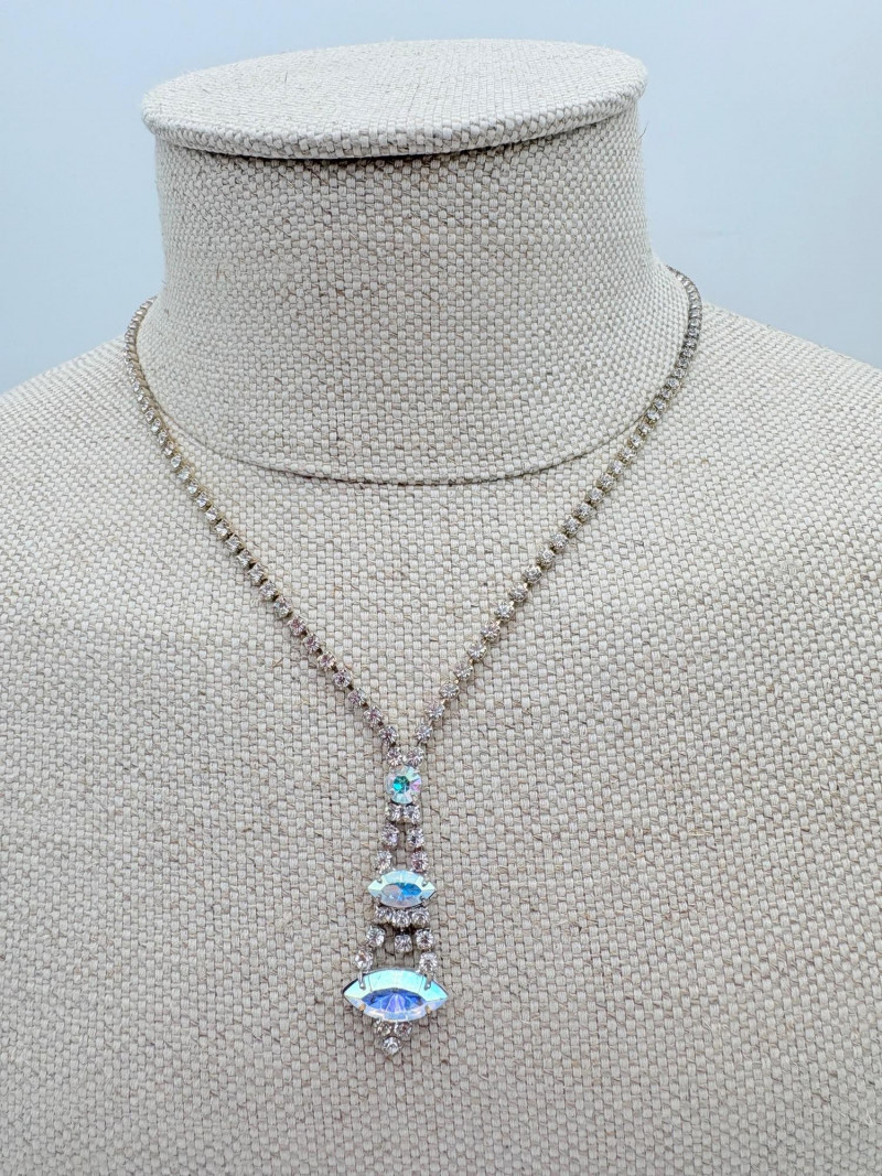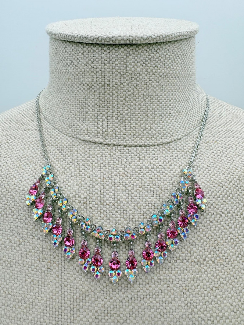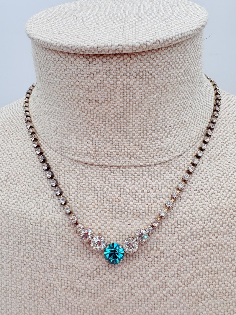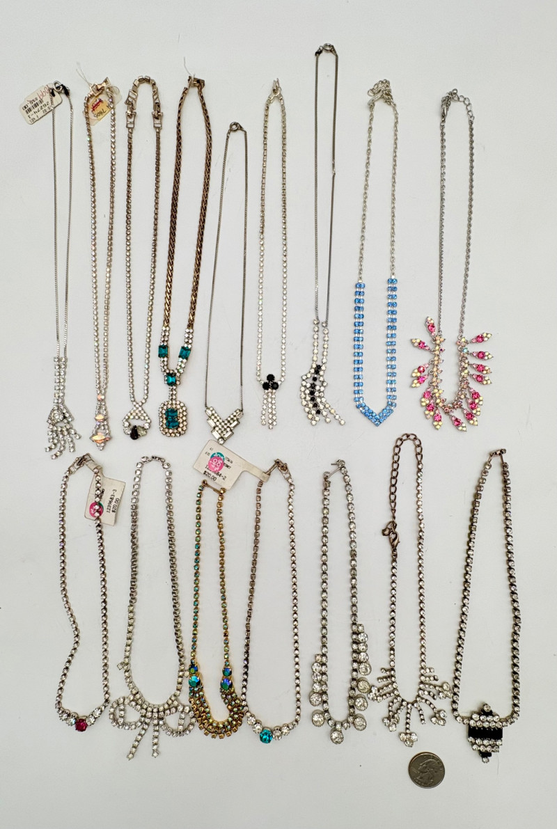 16 rhinestone necklaces in various shapes, sizes, and colors but with one thing in common: SPARKLE! Good quality costume jewelry with many vintage pieces. Please see photos for details.