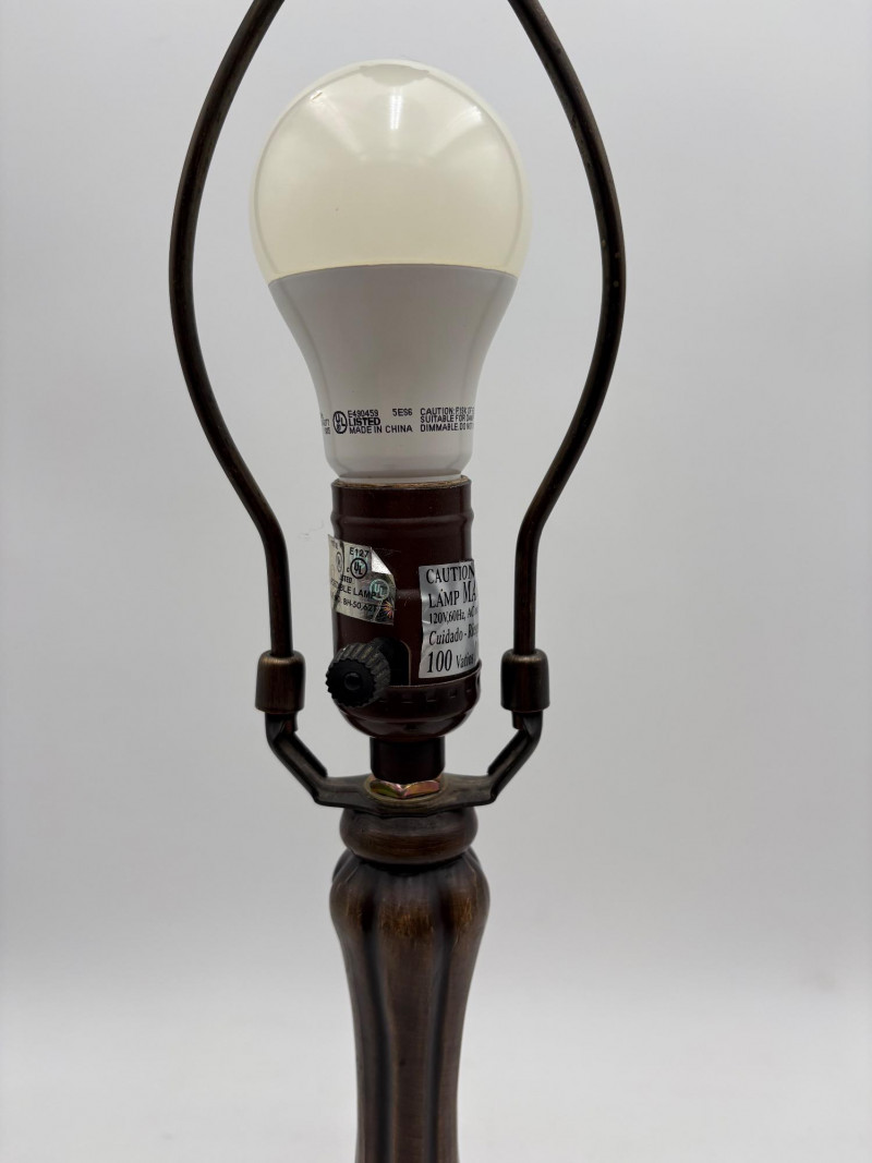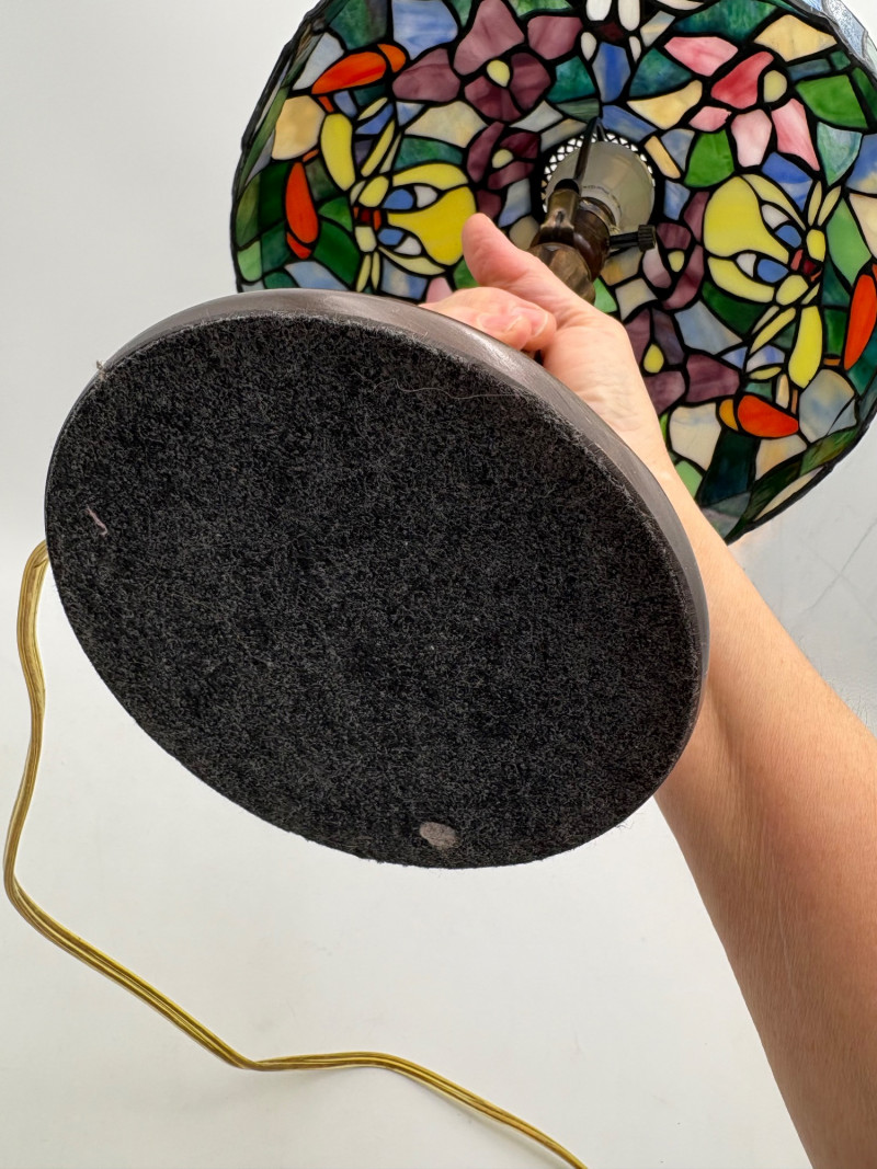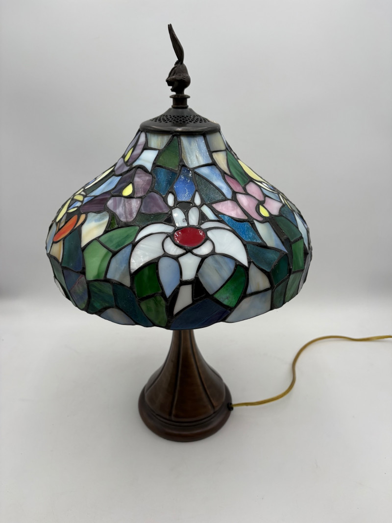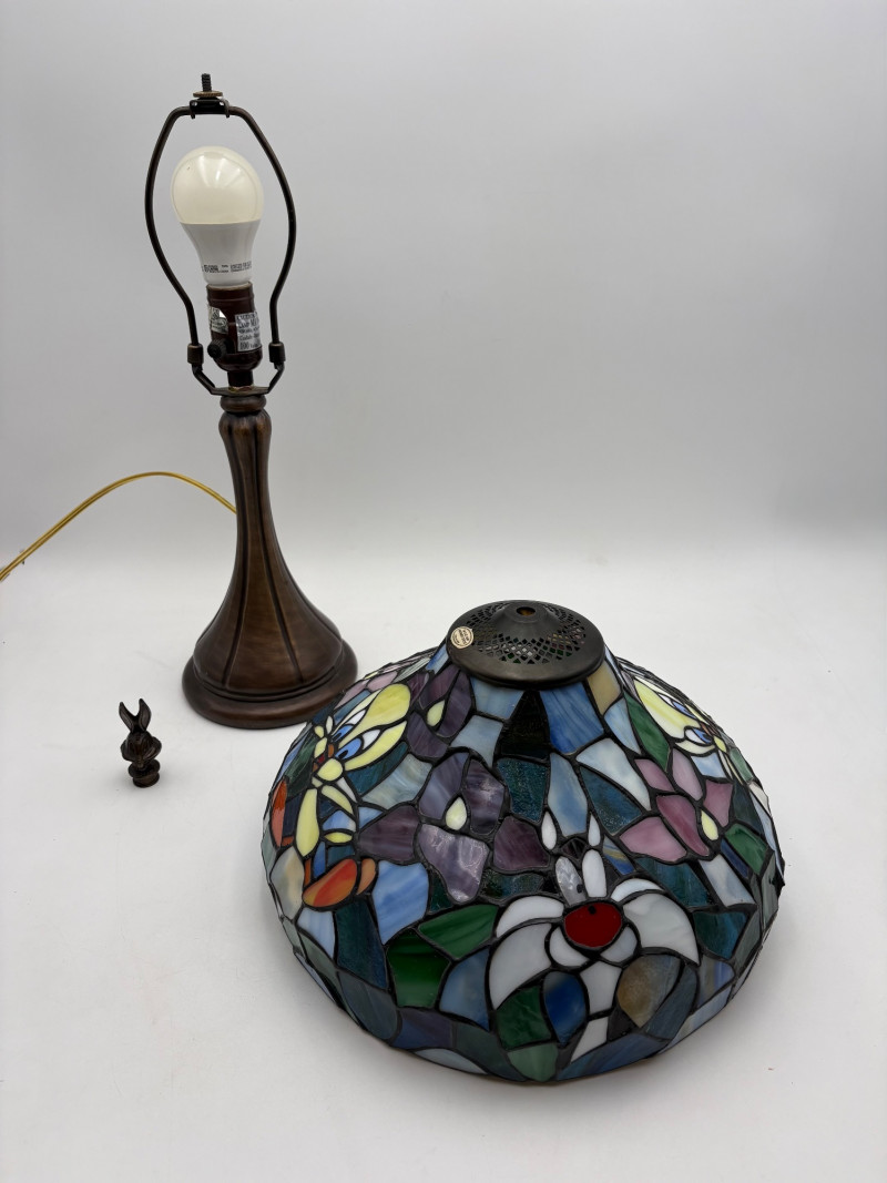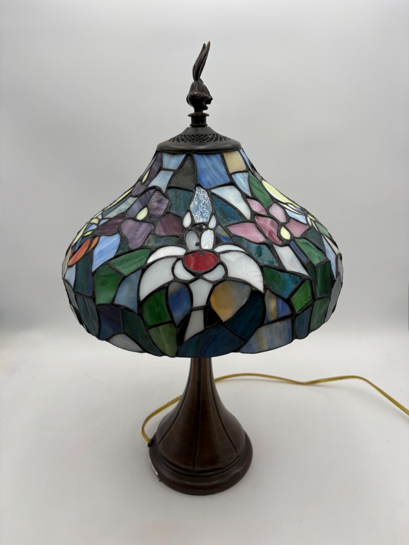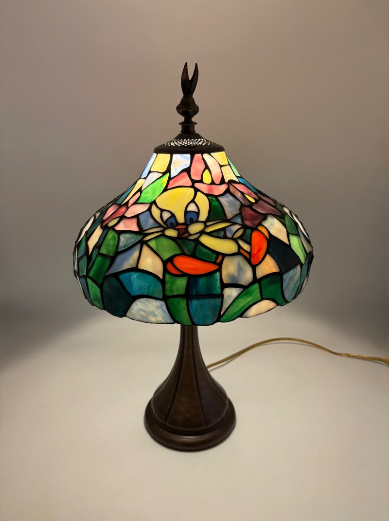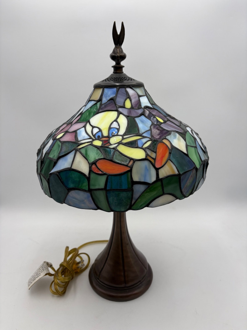 This traditionally styled stained-glass lamp isn't so traditional when you look closely - the shade portrays Tweety & Sylvester! Sturdy metal base with Bugs Bunny finial above the shade. Measures 21" H x 12" W (shade at widest). Works great & appears to be in good condition. Vintage Dale Tiffany Looney Tunes Lamp Stained Glass Cartoon Tweety Sylvester | eBay not that this is only for the shade, ours includes the lamp base, too.