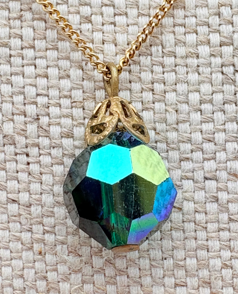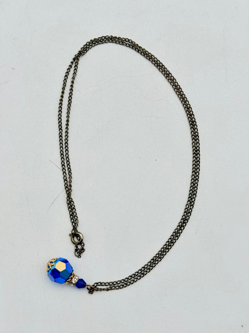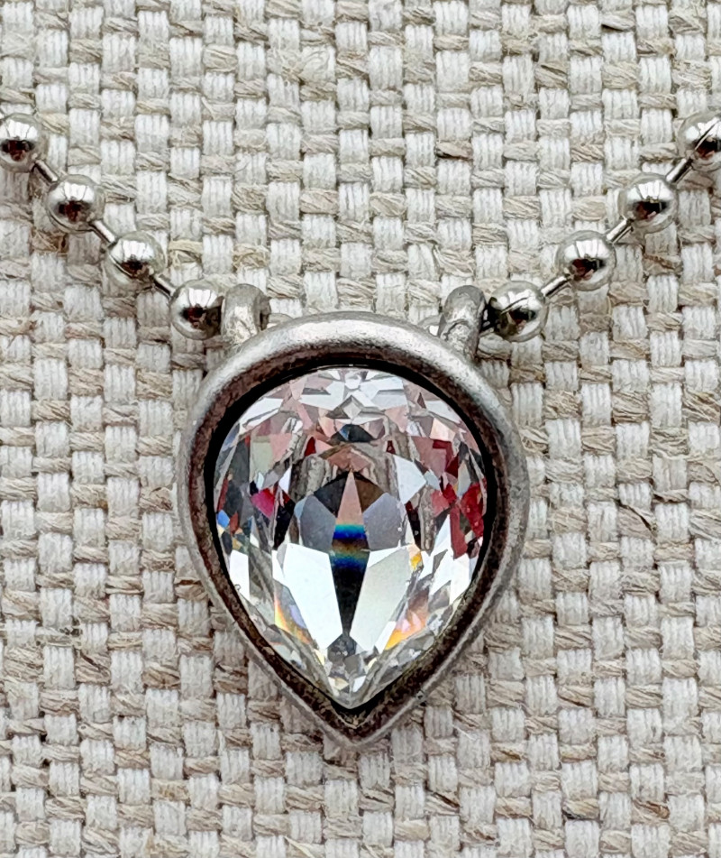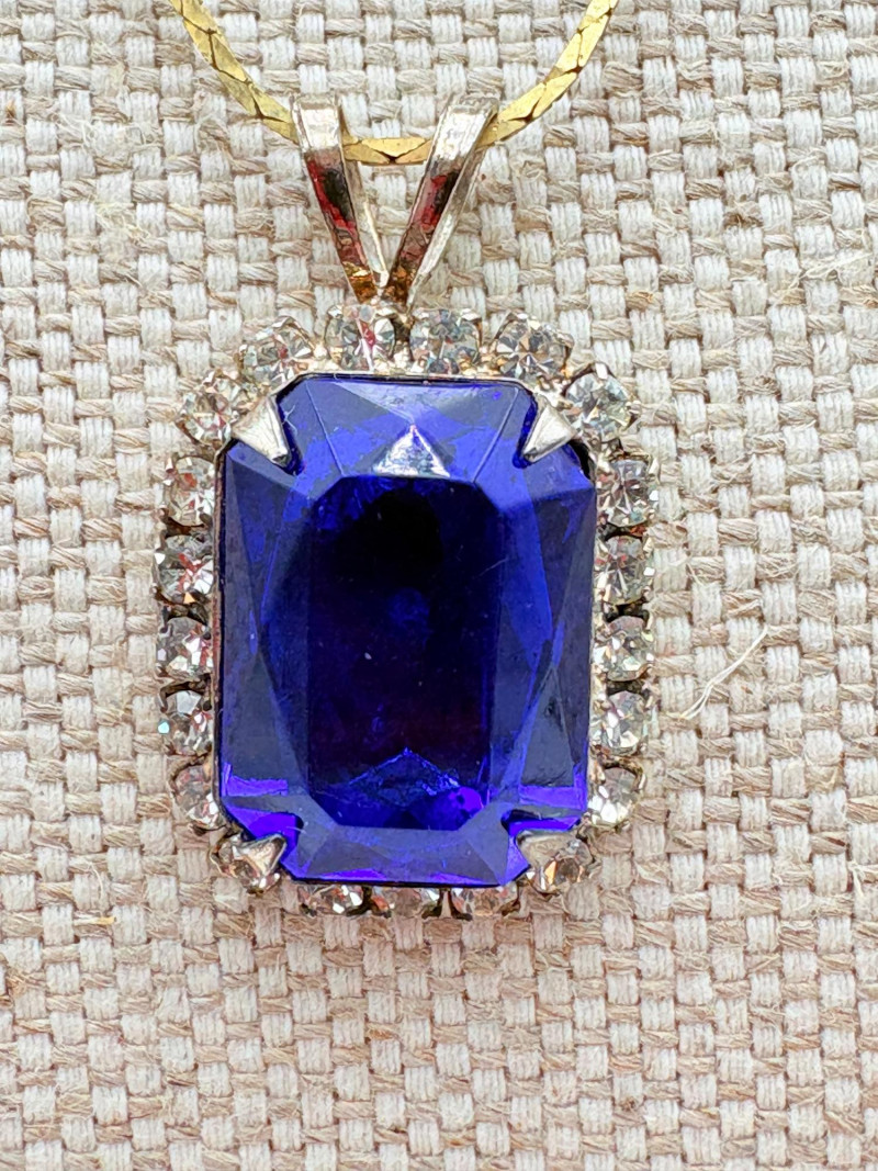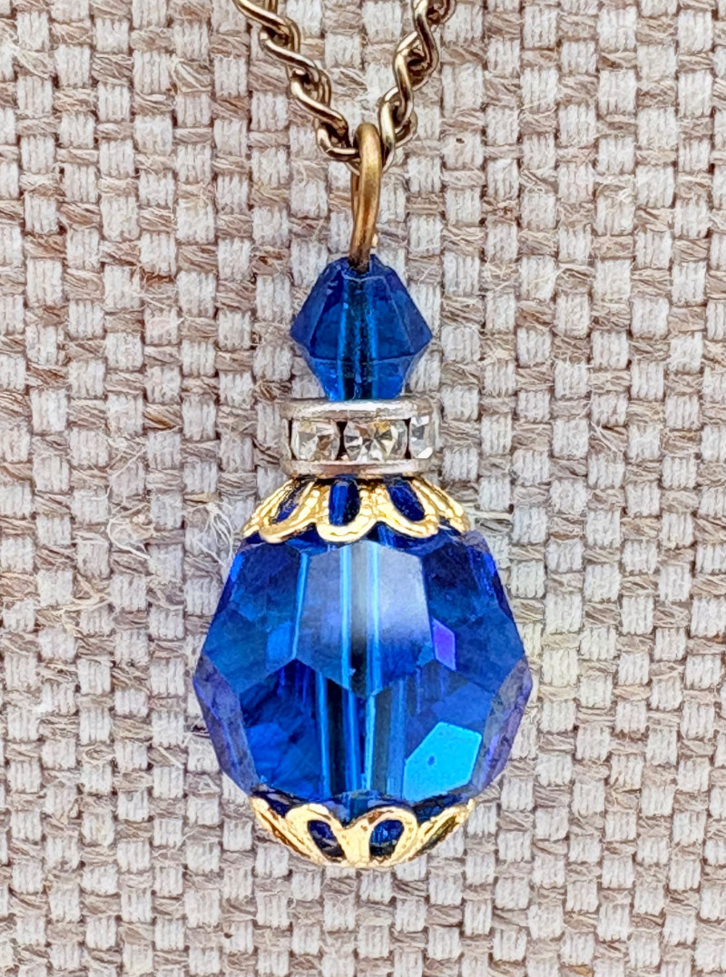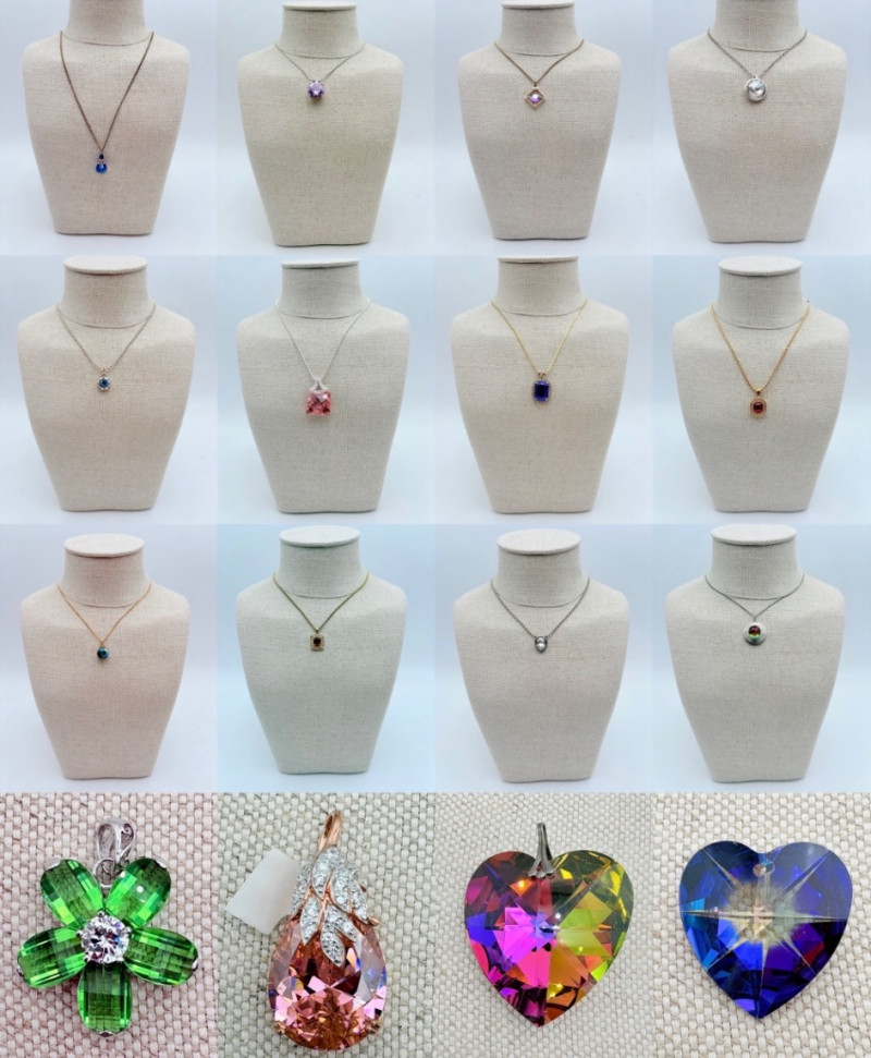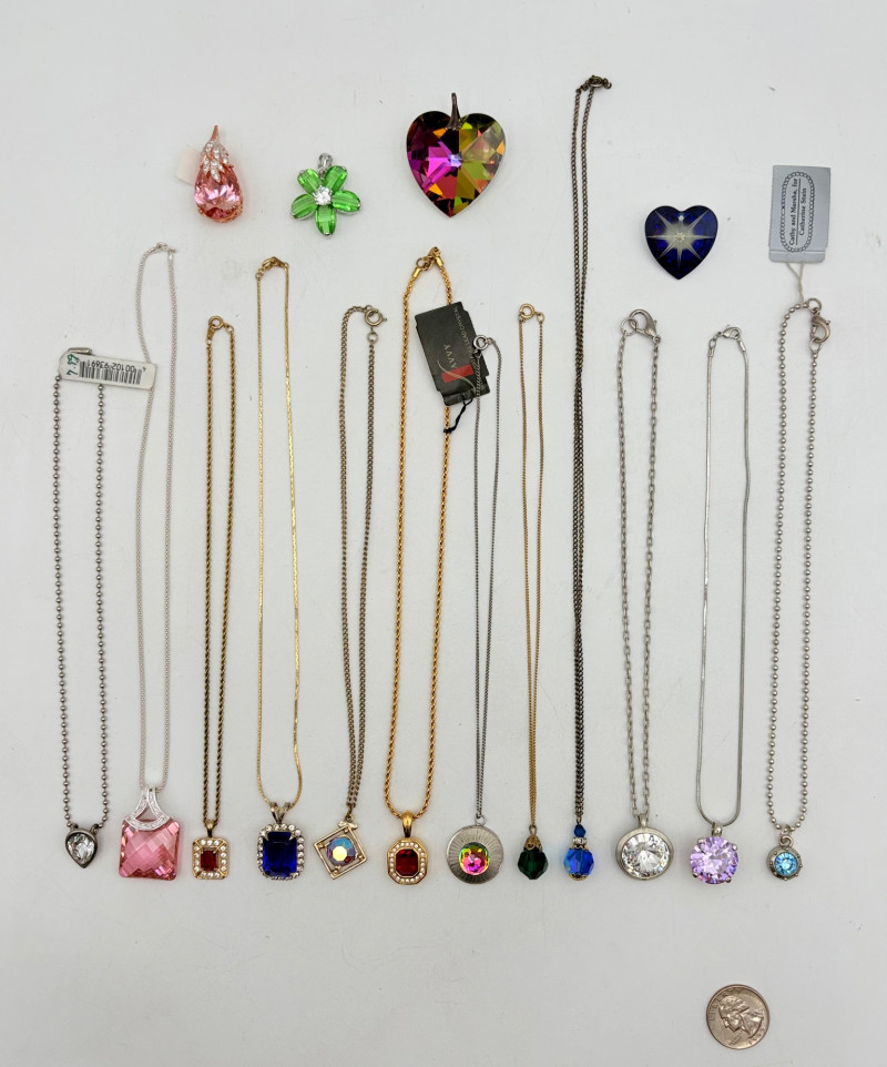 12 sparkly necklaces and 4 pendants that need a chain. Designs are different, but all catch light and sparkle. Good quality costume jewelry with a couple of vintage pieces. Please see photos for detail and note that we think the chains on a few of these are not original to the pendant (differing colors, etc.)