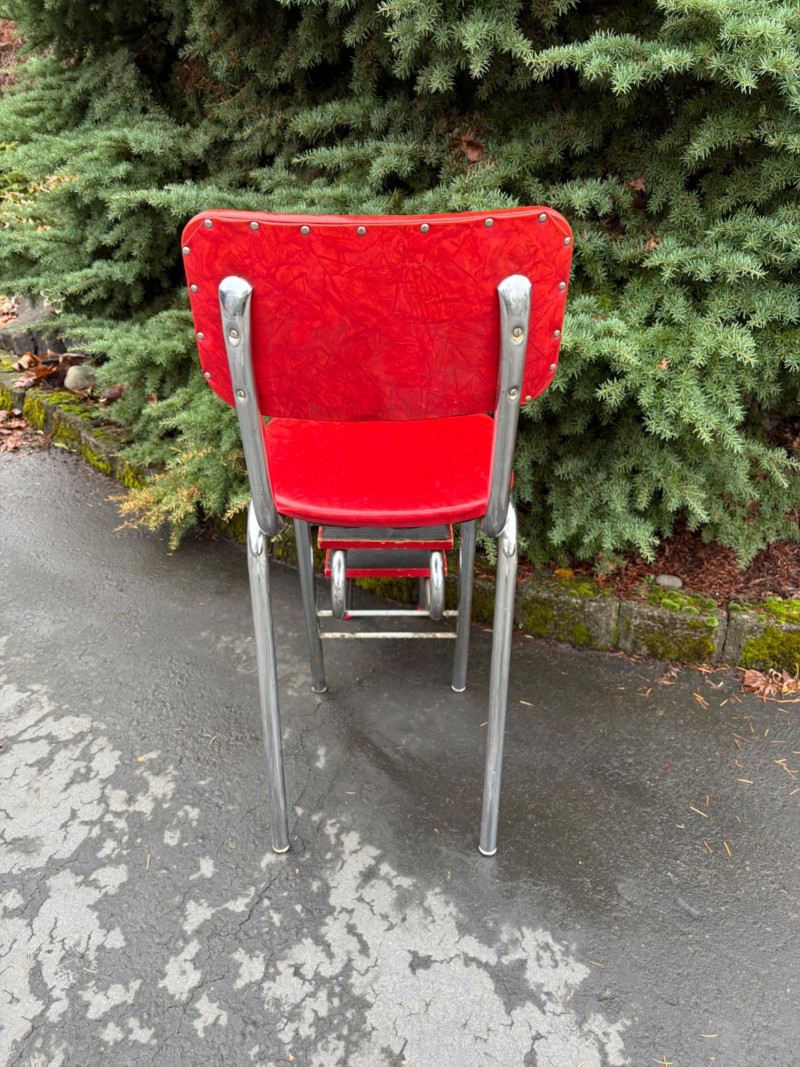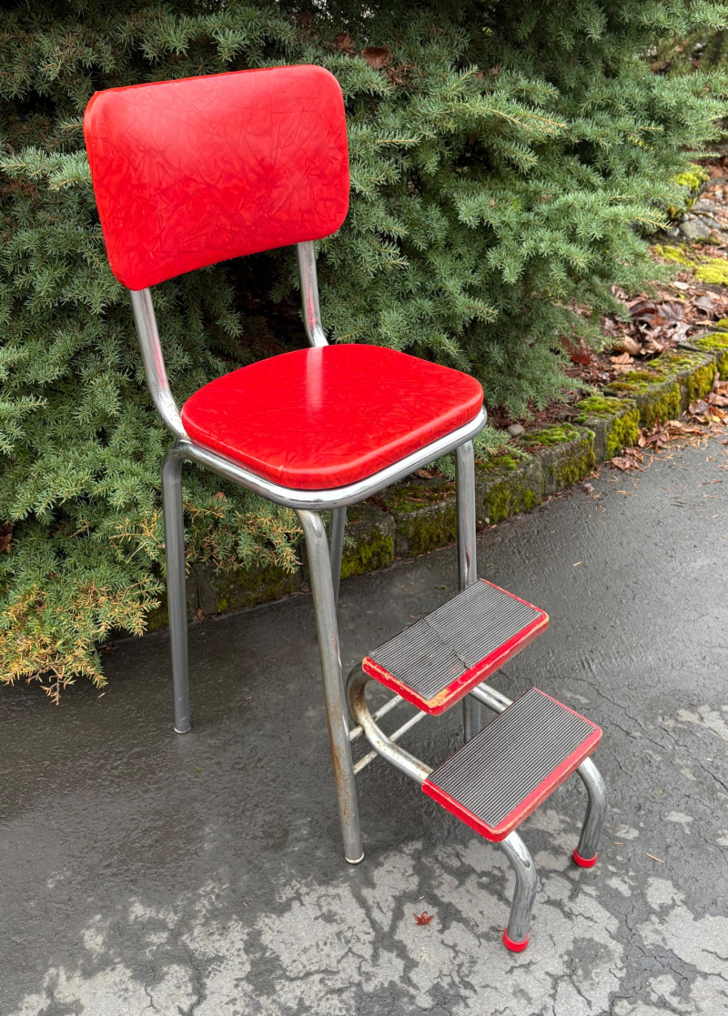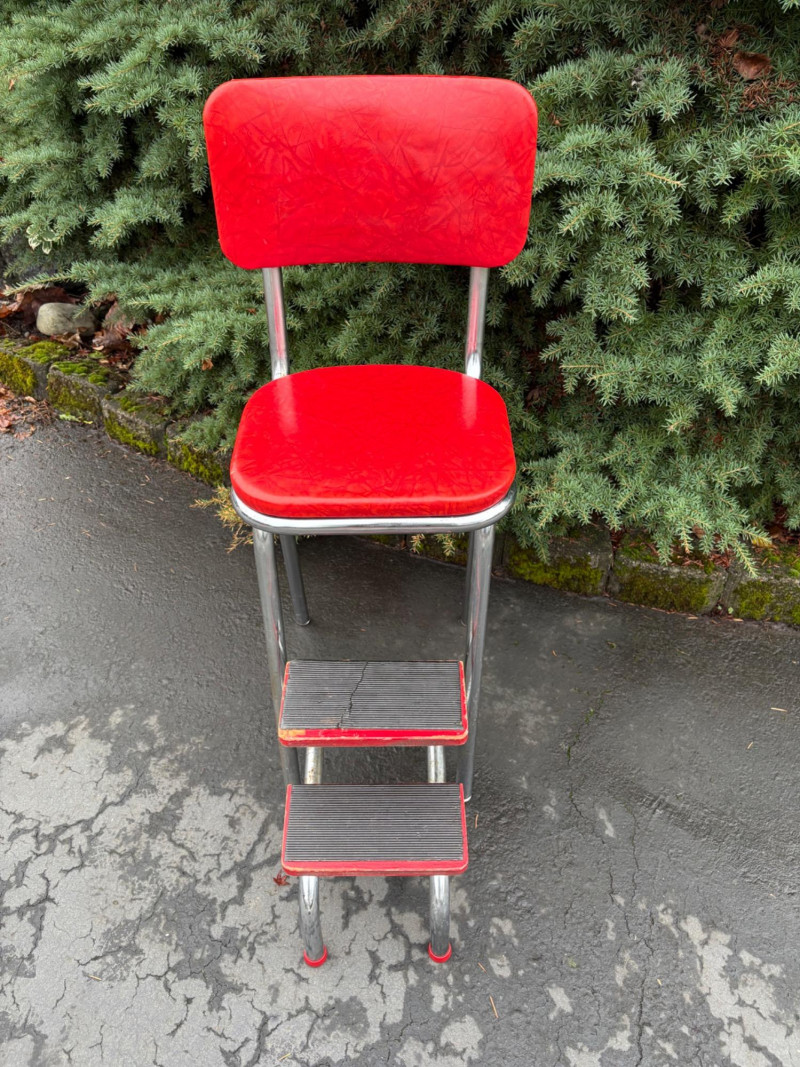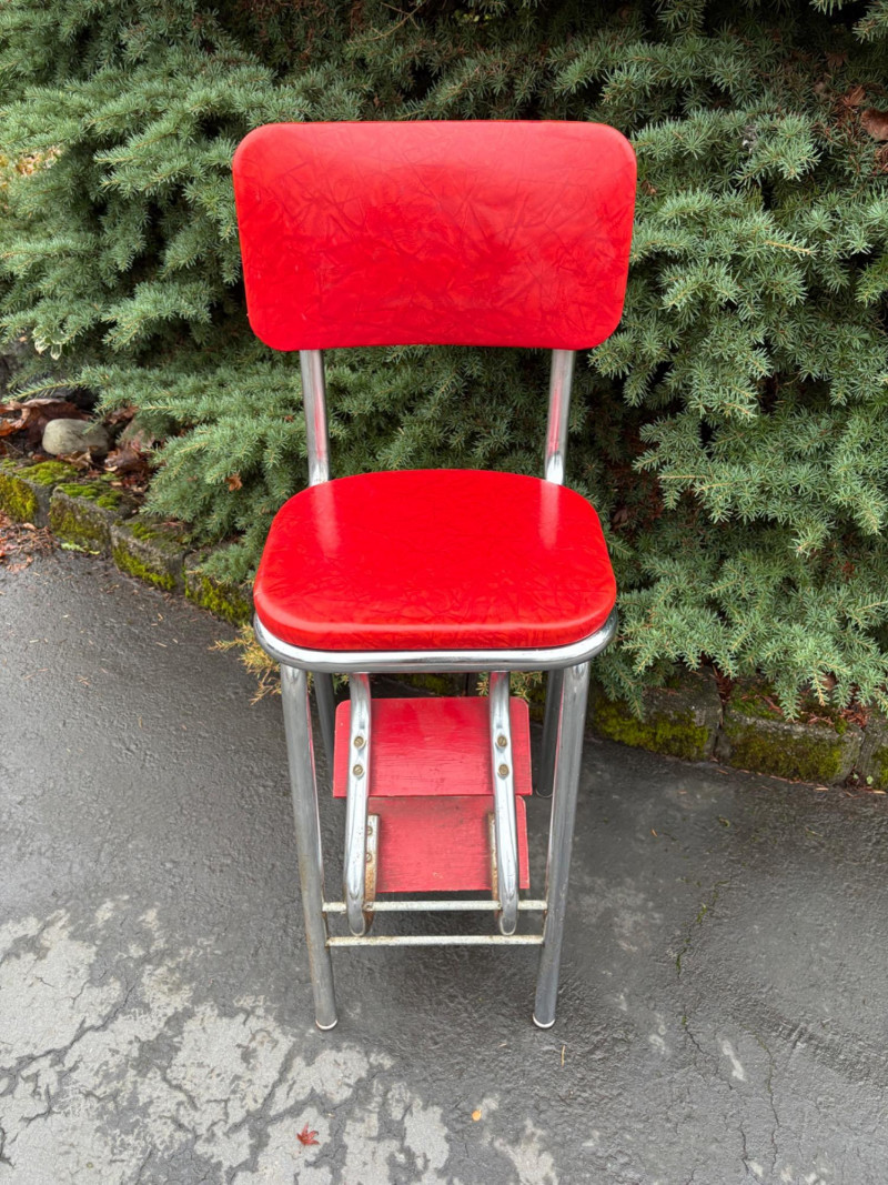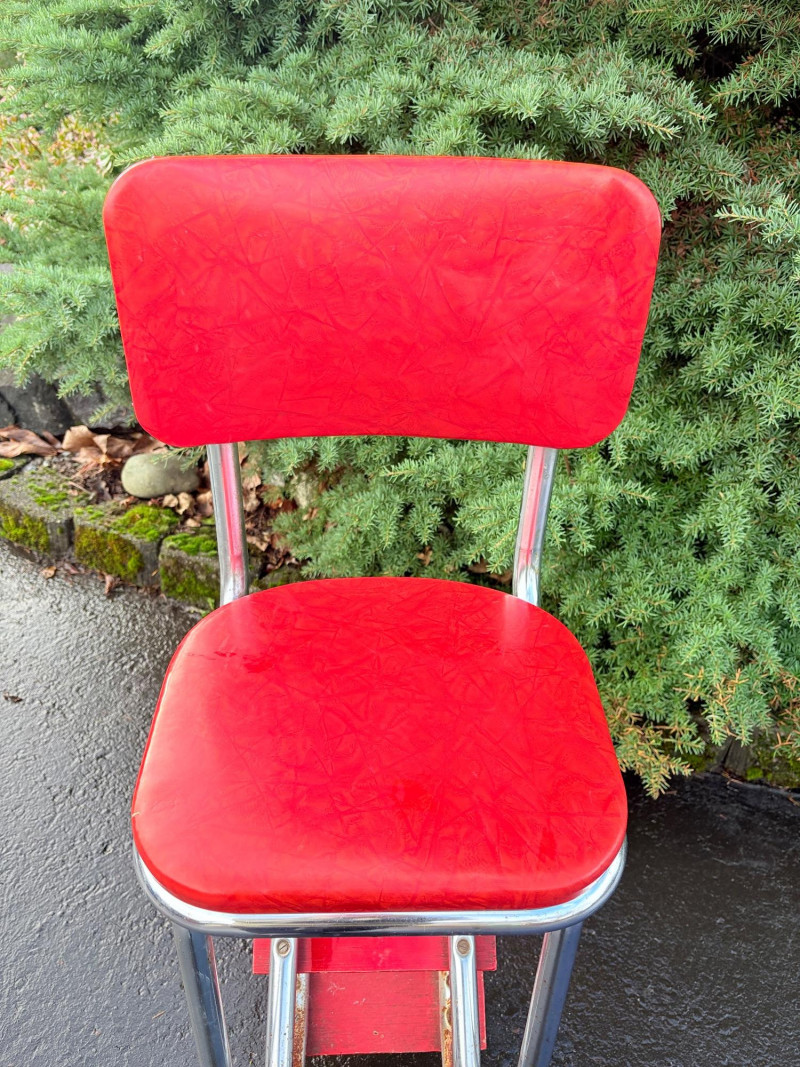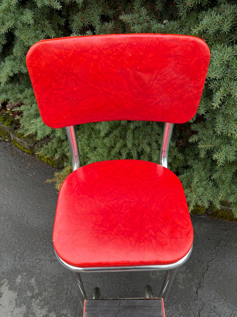 Just like the chair your Granny had in her kitchen - we LOVED these chairs since you could climb to get into cabinets you weren't supposed to be in.... Vintage red vinyl chair/fold-away stepstool with upholstery in great shape for its age! * At first glance, the chrome doesn't look to be in good condition, but we wiped down a portion of it and it came fairly clean (no guarantees that will hold true for all the chrome, however!). New owner should be able to get it this piece looking great with a little elbow grease & a good scrub. Chair stands 36" H at the top of the backrest. It is 13.5" W across the seat with seat depth of 12". (When you add in the steps out front in the down position, it expands to about 24" D.) Only noticeable flaw in the upholstery is on the seat edge - see last picture. One of the steps has cracked rubber tread, but it does not appear that the wood step below the tread is cracked. We would advocate for removing the tread and applying new after a quick touchup of the red paint on the steps as well as polishing the chrome.