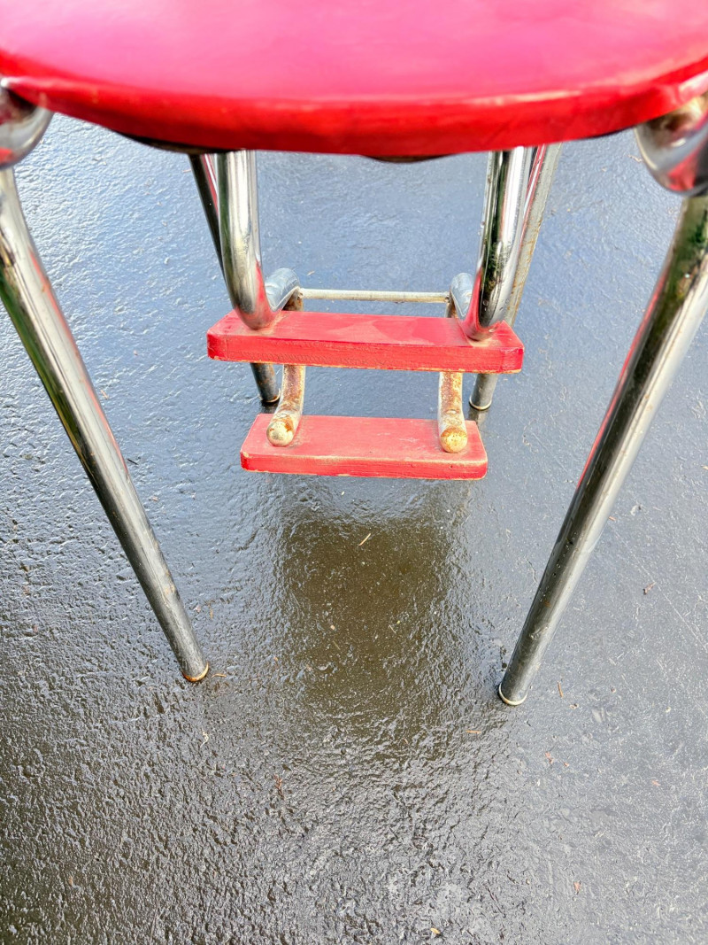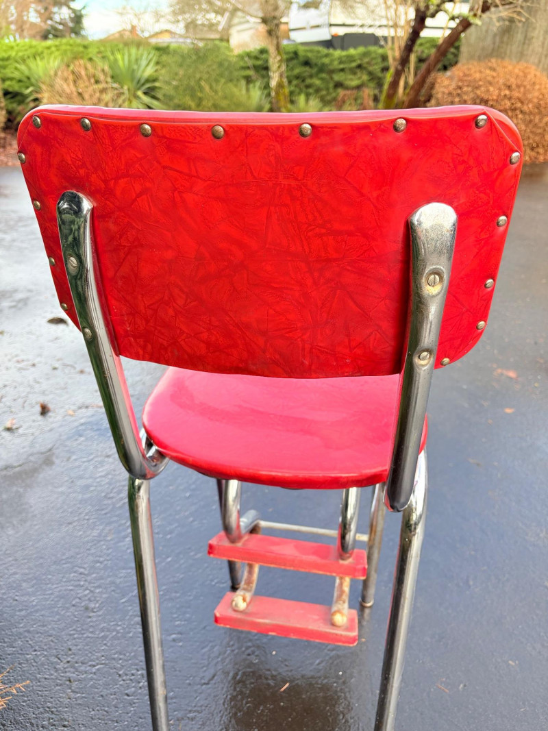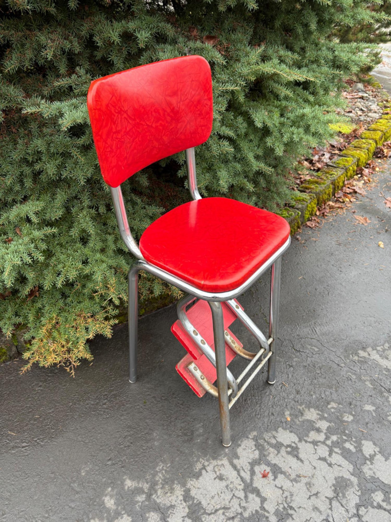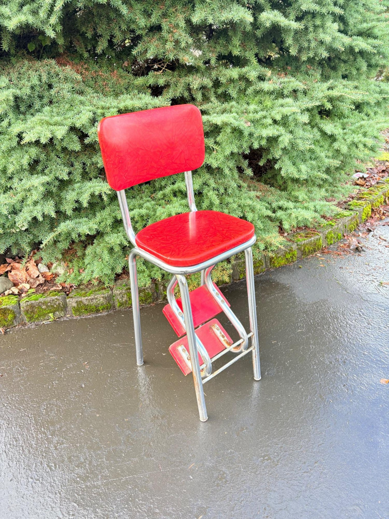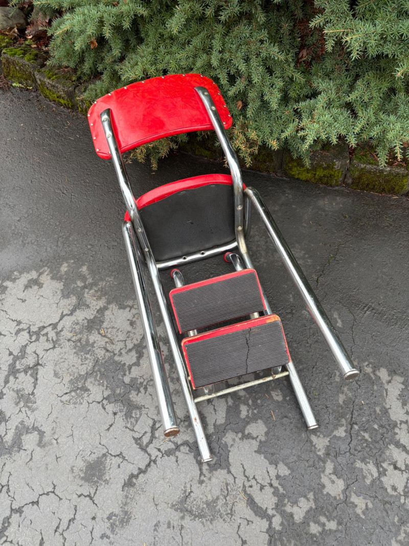 Just like the chair your Granny had in her kitchen - we LOVED these chairs since you could climb to get into cabinets you weren't supposed to be in.... Vintage red vinyl chair/fold-away stepstool with upholstery in great shape for its age! * At first glance, the chrome doesn't look to be in good condition, but we wiped down a portion of it and it came fairly clean (no guarantees that will hold true for all the chrome, however!). New owner should be able to get it this piece looking great with a little elbow grease & a good scrub. Chair stands 36" H at the top of the backrest. It is 13.5" W across the seat with seat depth of 12". (When you add in the steps out front in the down position, it expands to about 24" D.) Only noticeable flaw in the upholstery is on the seat edge - see last picture. One of the steps has cracked rubber tread, but it does not appear that the wood step below the tread is cracked. We would advocate for removing the tread and applying new after a quick touchup of the red paint on the steps as well as polishing the chrome.