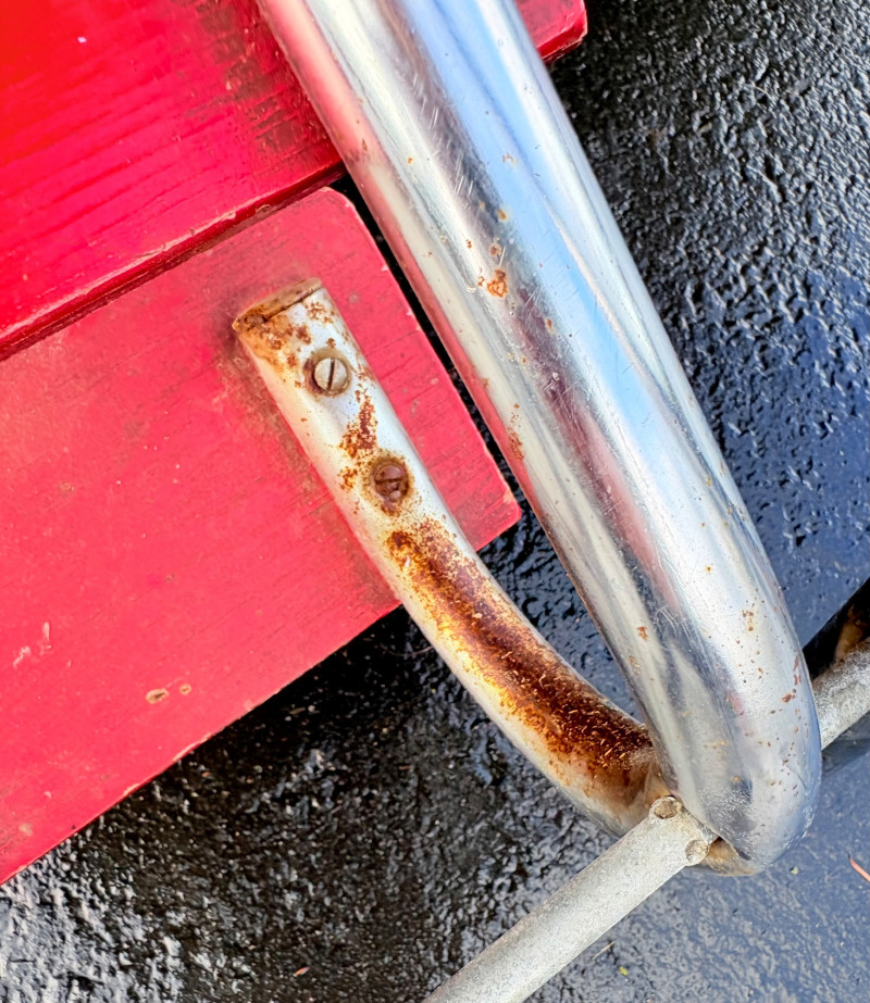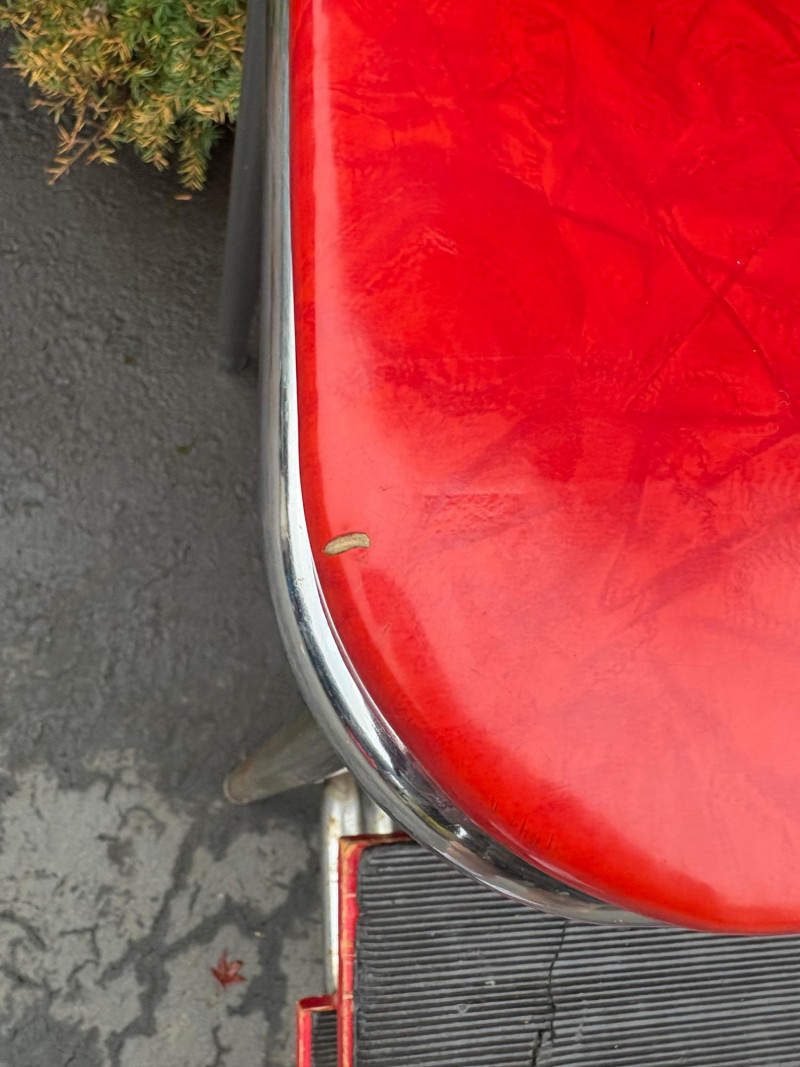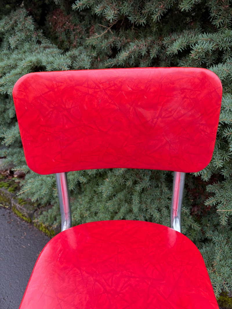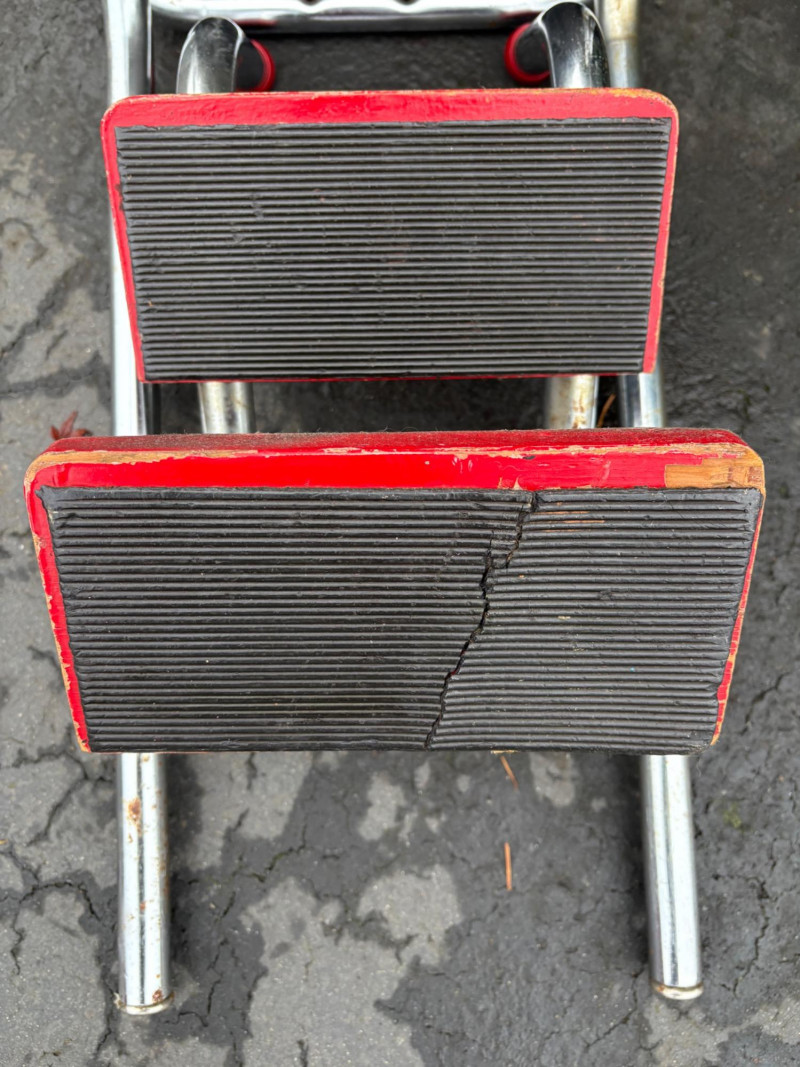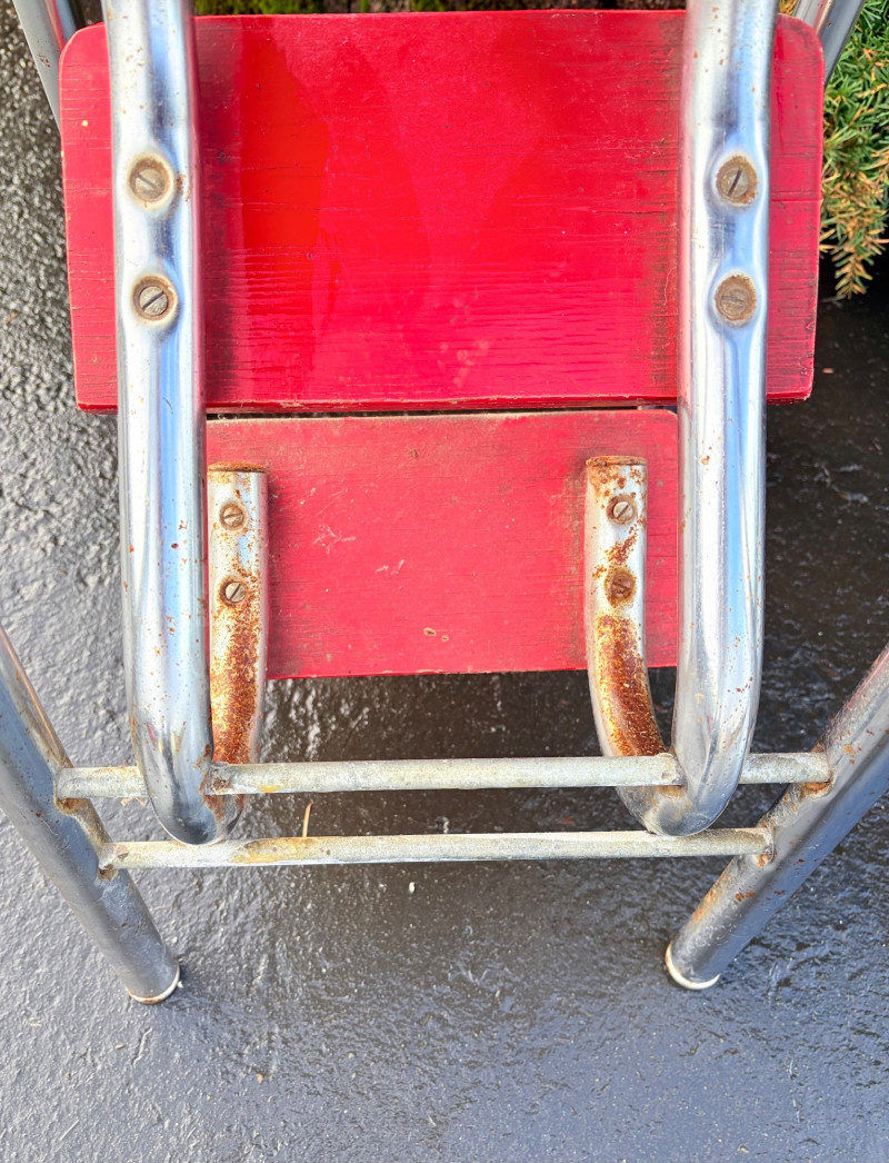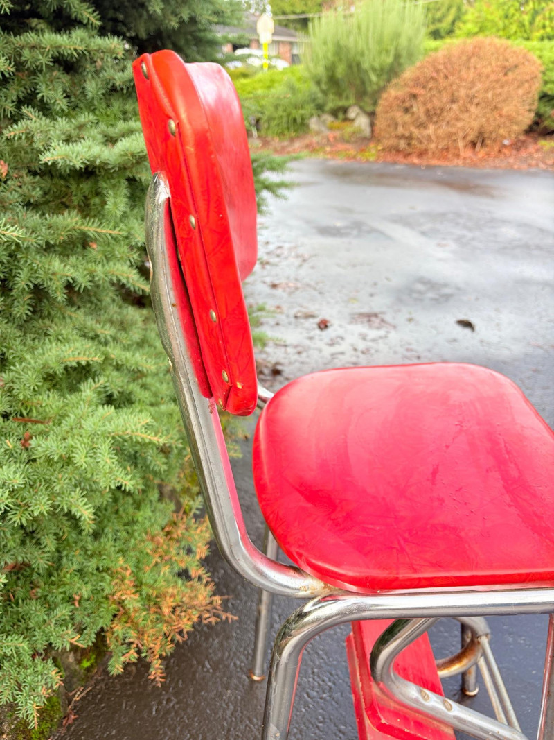 Just like the chair your Granny had in her kitchen - we LOVED these chairs since you could climb to get into cabinets you weren't supposed to be in.... Vintage red vinyl chair/fold-away stepstool with upholstery in great shape for its age! * At first glance, the chrome doesn't look to be in good condition, but we wiped down a portion of it and it came fairly clean (no guarantees that will hold true for all the chrome, however!). New owner should be able to get it this piece looking great with a little elbow grease & a good scrub. Chair stands 36" H at the top of the backrest. It is 13.5" W across the seat with seat depth of 12". (When you add in the steps out front in the down position, it expands to about 24" D.) Only noticeable flaw in the upholstery is on the seat edge - see last picture. One of the steps has cracked rubber tread, but it does not appear that the wood step below the tread is cracked. We would advocate for removing the tread and applying new after a quick touchup of the red paint on the steps as well as polishing the chrome.