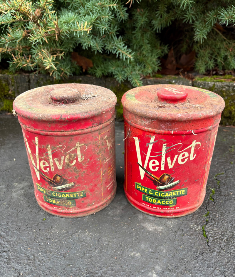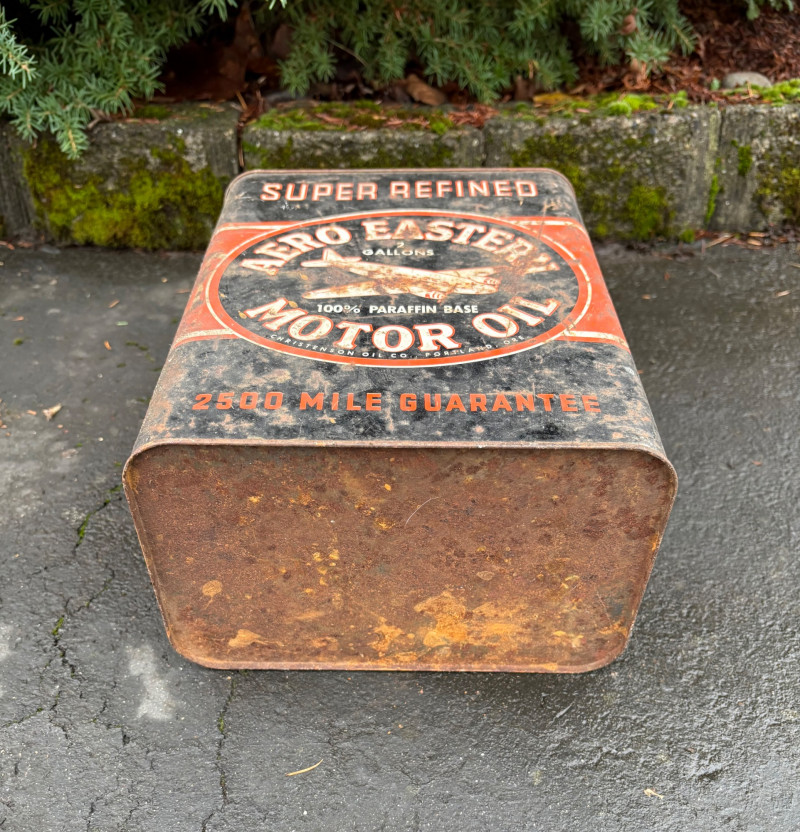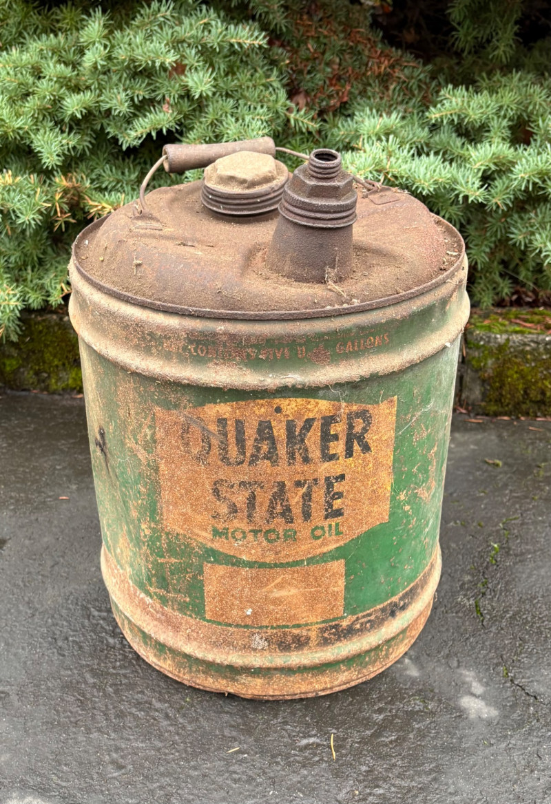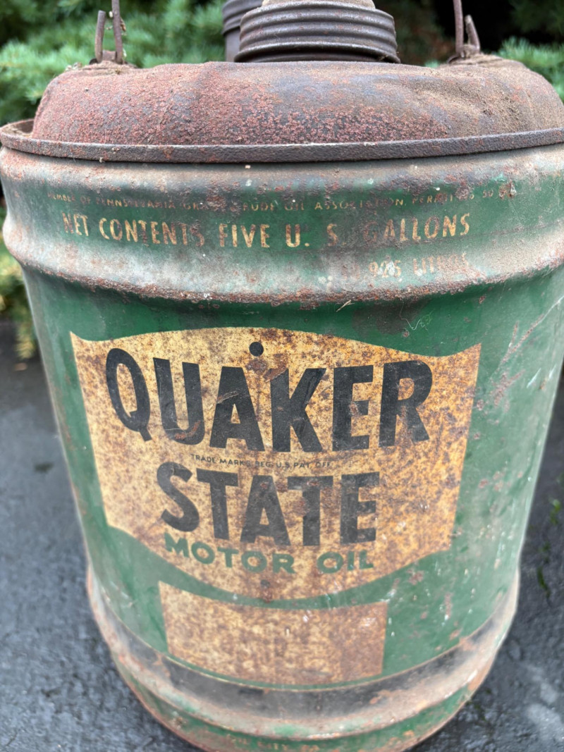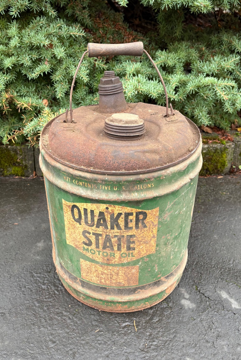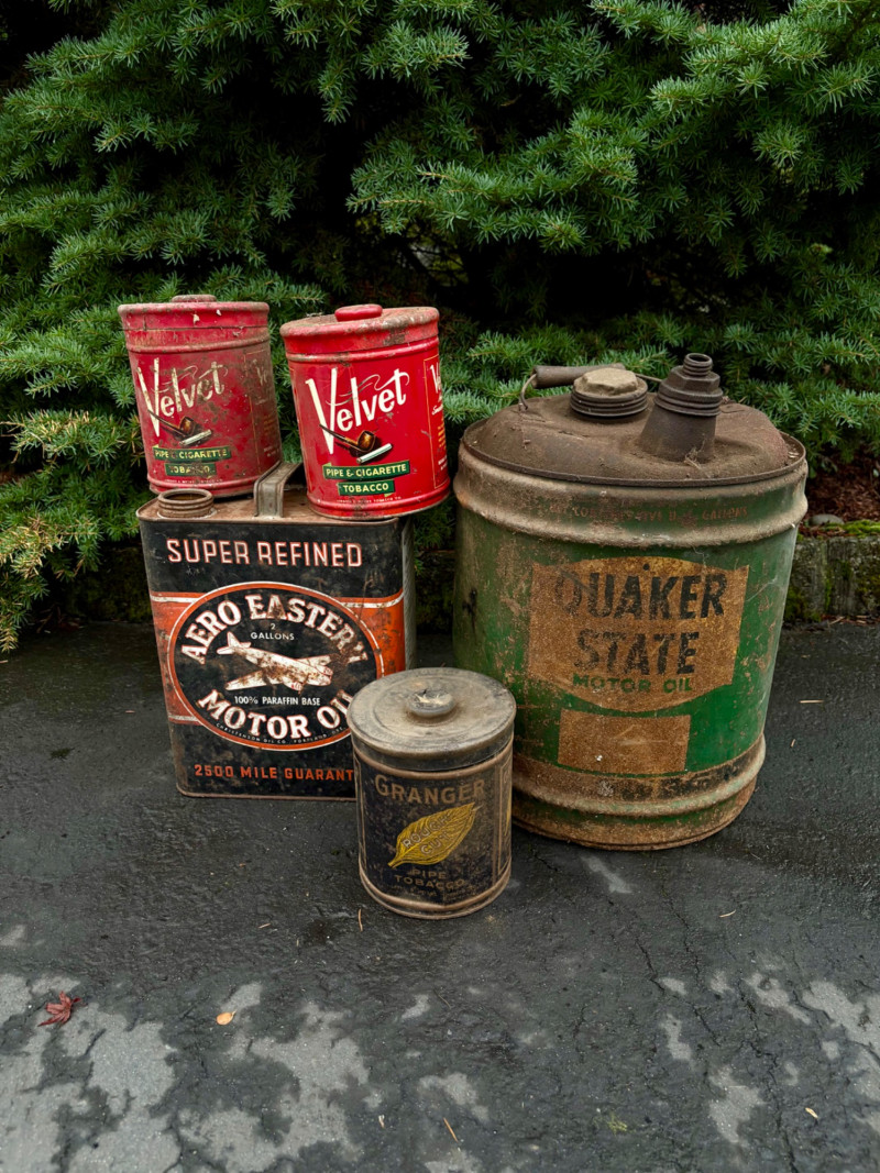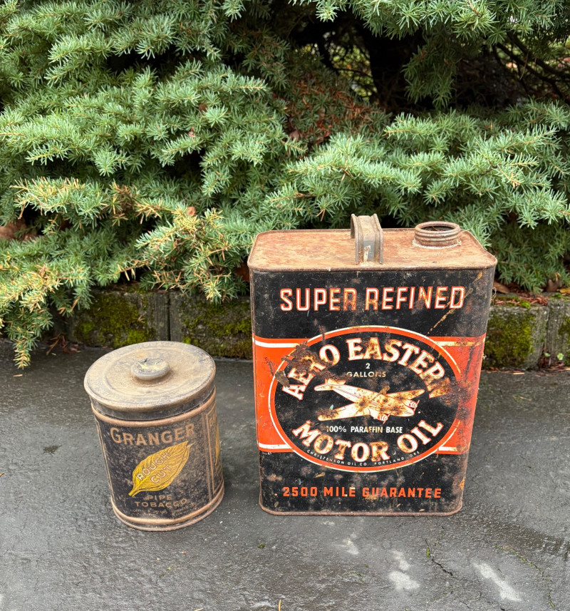 We found these items in the garage and they are being sold as is. Some of our clients buy antique items for stage settings and want the items to look used/aged so we will let the new owner decide whether or not to clean up the decades of "accumulation" on them. Quaker State Motor Oil 5-gallon metal can in green & white. Measures 16" H to the spout by 11" in diameter with a metal and wood carry handle. 3 pipe tobacco metal cans (2 Velvet & 1 Granger brand) with lids. Measure 6" H x just shy 5" in diameter. Rectangular Aero Eastern Motor Oil metal can in white, orange, and black with a metal handle. Measures 11.5" H x 8" W x 5.5" D.