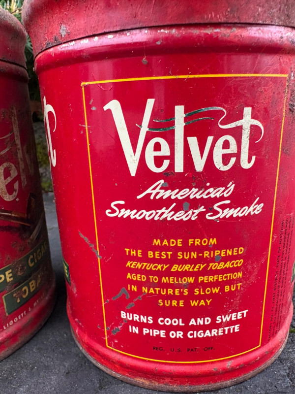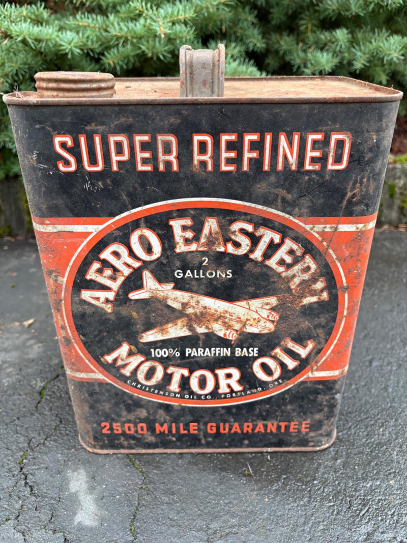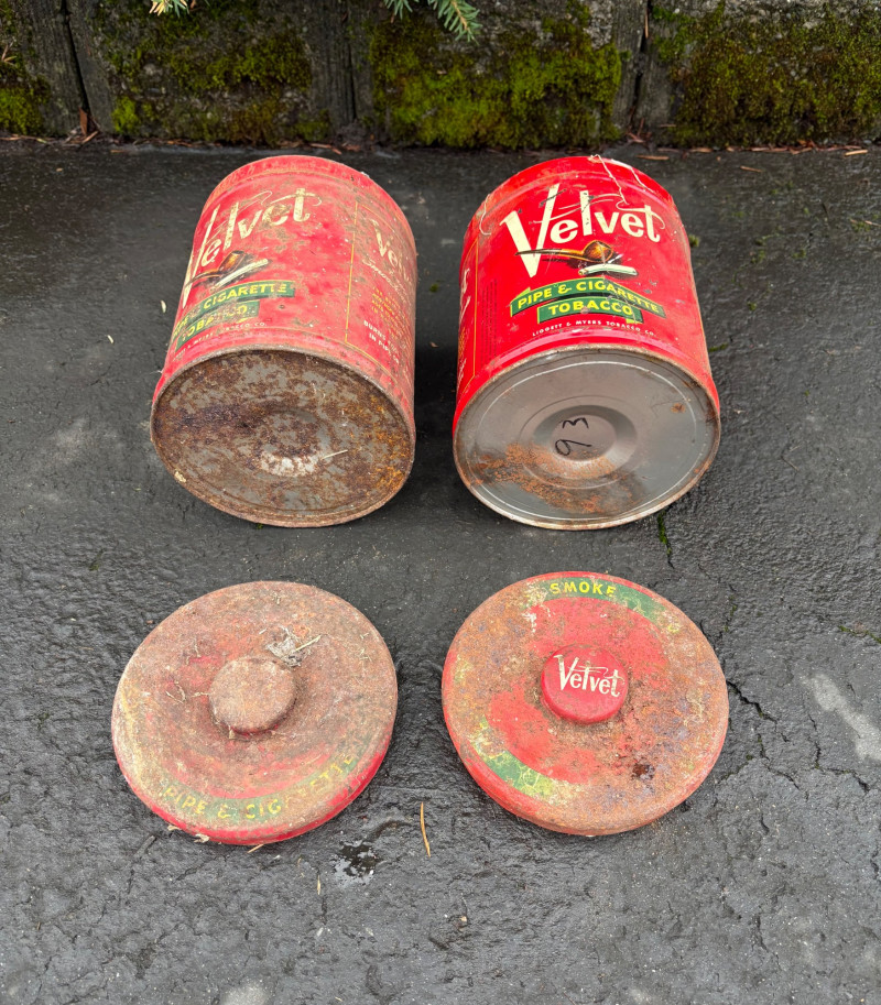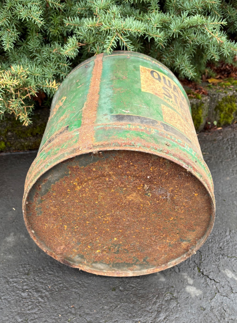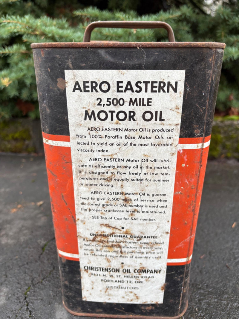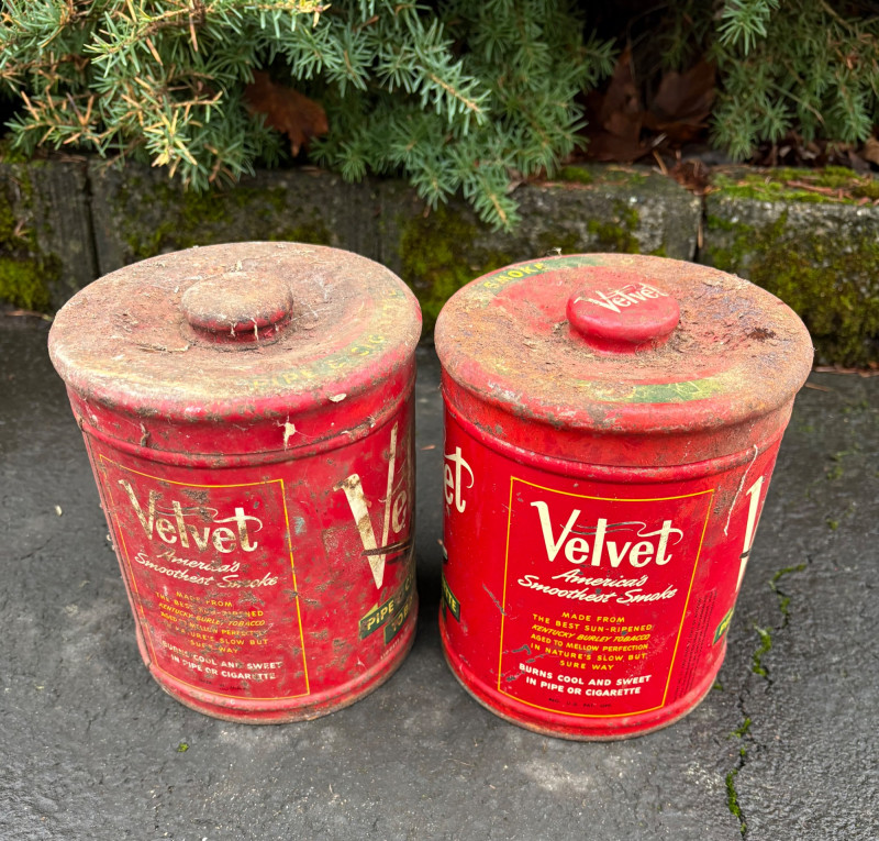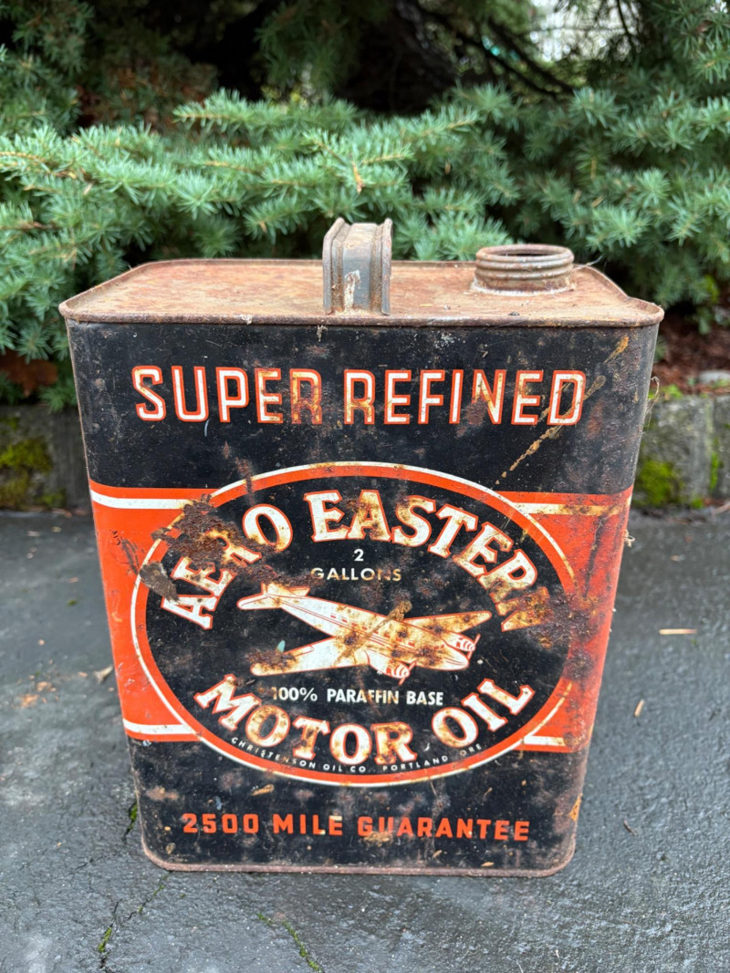 We found these items in the garage and they are being sold as is. Some of our clients buy antique items for stage settings and want the items to look used/aged so we will let the new owner decide whether or not to clean up the decades of "accumulation" on them. Quaker State Motor Oil 5-gallon metal can in green & white. Measures 16" H to the spout by 11" in diameter with a metal and wood carry handle. 3 pipe tobacco metal cans (2 Velvet & 1 Granger brand) with lids. Measure 6" H x just shy 5" in diameter. Rectangular Aero Eastern Motor Oil metal can in white, orange, and black with a metal handle. Measures 11.5" H x 8" W x 5.5" D.