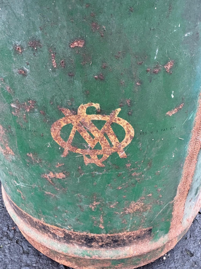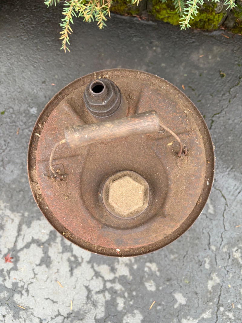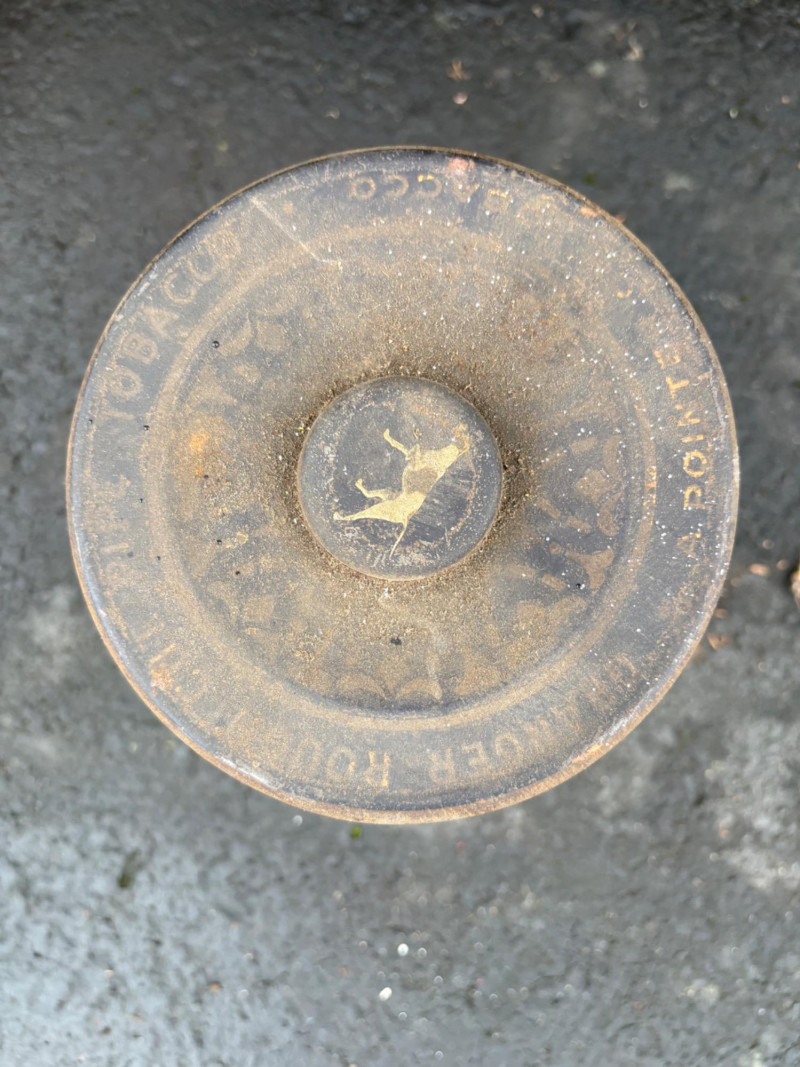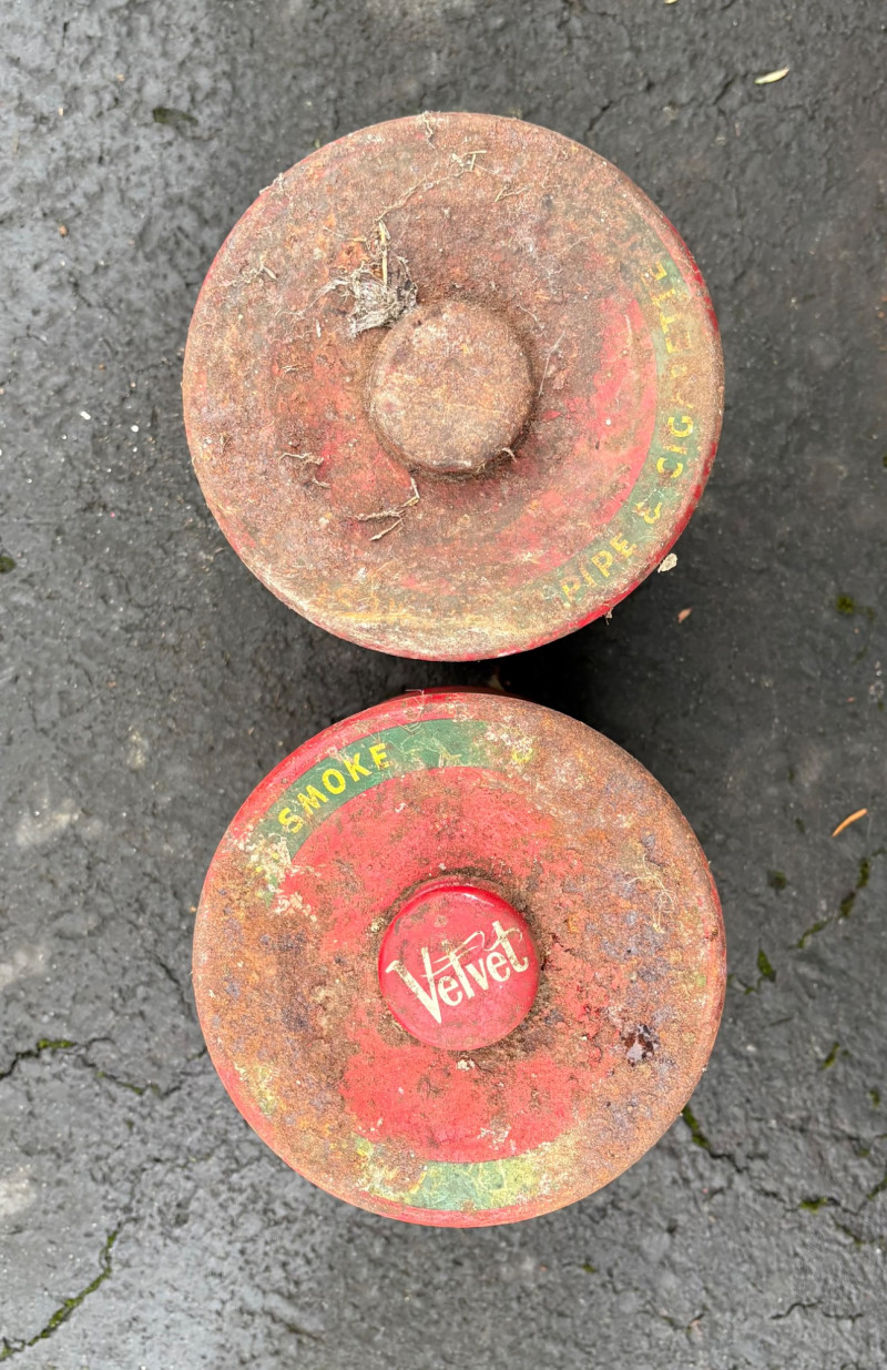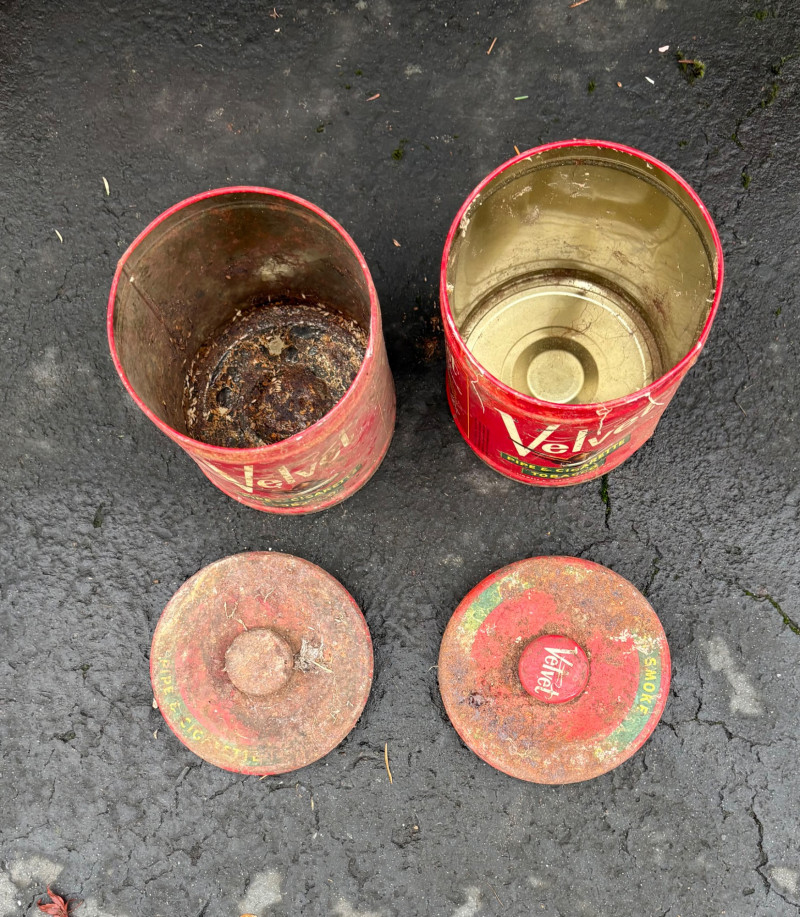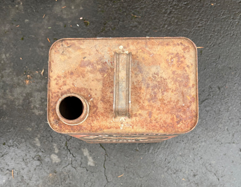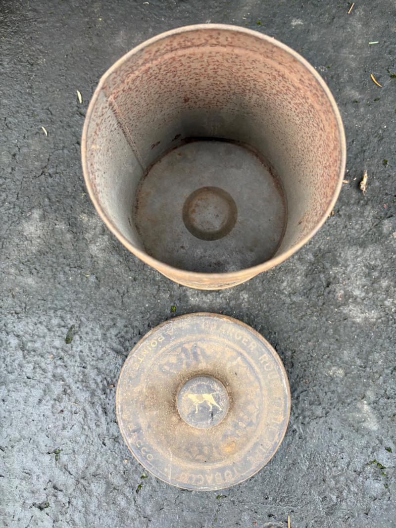 We found these items in the garage and they are being sold as is. Some of our clients buy antique items for stage settings and want the items to look used/aged so we will let the new owner decide whether or not to clean up the decades of "accumulation" on them. Quaker State Motor Oil 5-gallon metal can in green & white. Measures 16" H to the spout by 11" in diameter with a metal and wood carry handle. 3 pipe tobacco metal cans (2 Velvet & 1 Granger brand) with lids. Measure 6" H x just shy 5" in diameter. Rectangular Aero Eastern Motor Oil metal can in white, orange, and black with a metal handle. Measures 11.5" H x 8" W x 5.5" D.