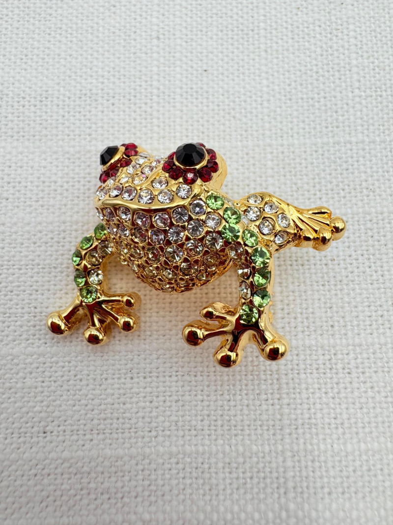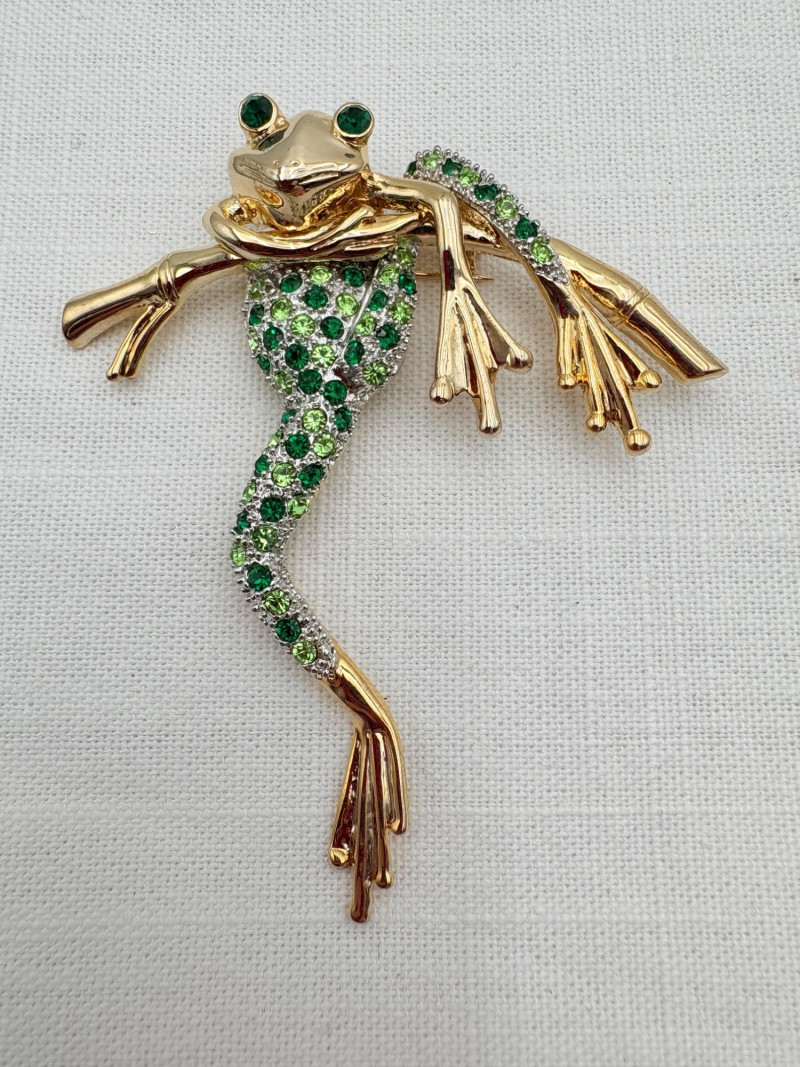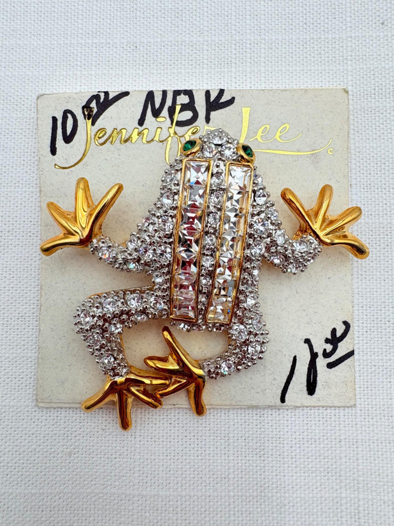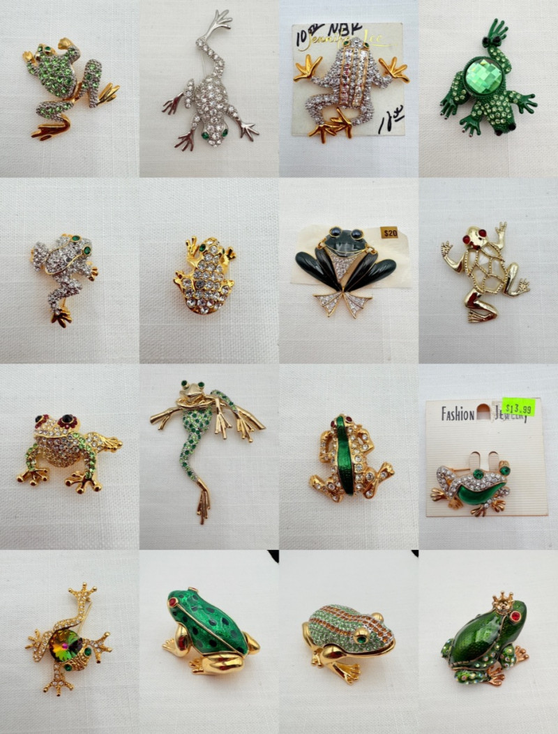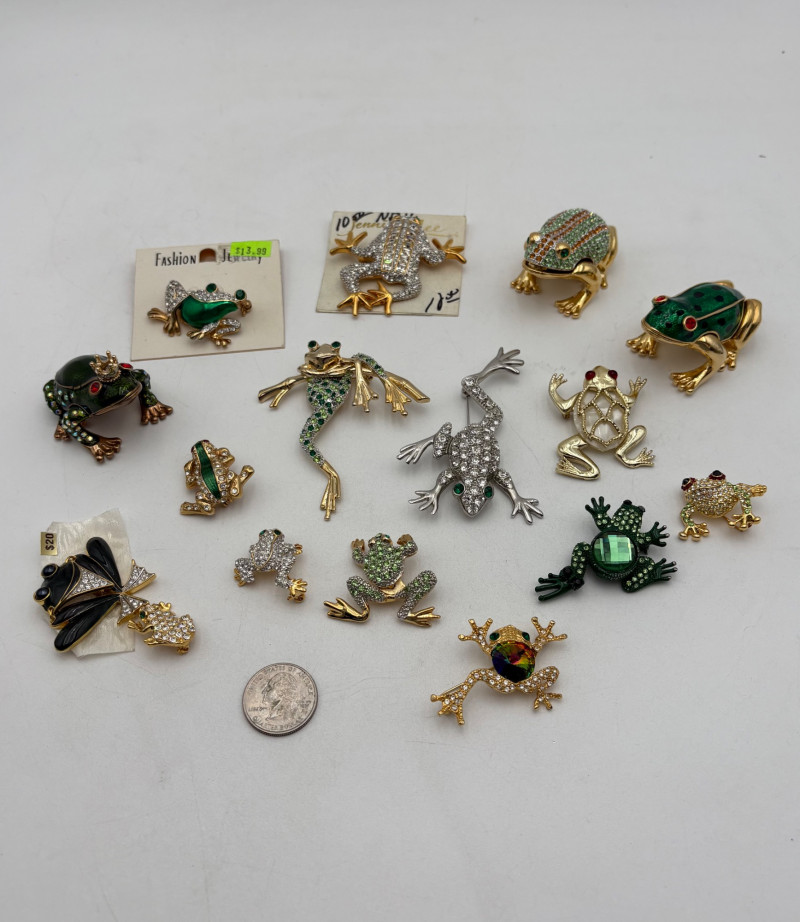 Large army of 13 frog pins accompanied by 3 lovely frog trinket boxes that are equally sparkly. Good quality costume jewelry with a number of vintage pieces. Please see photos for details.
