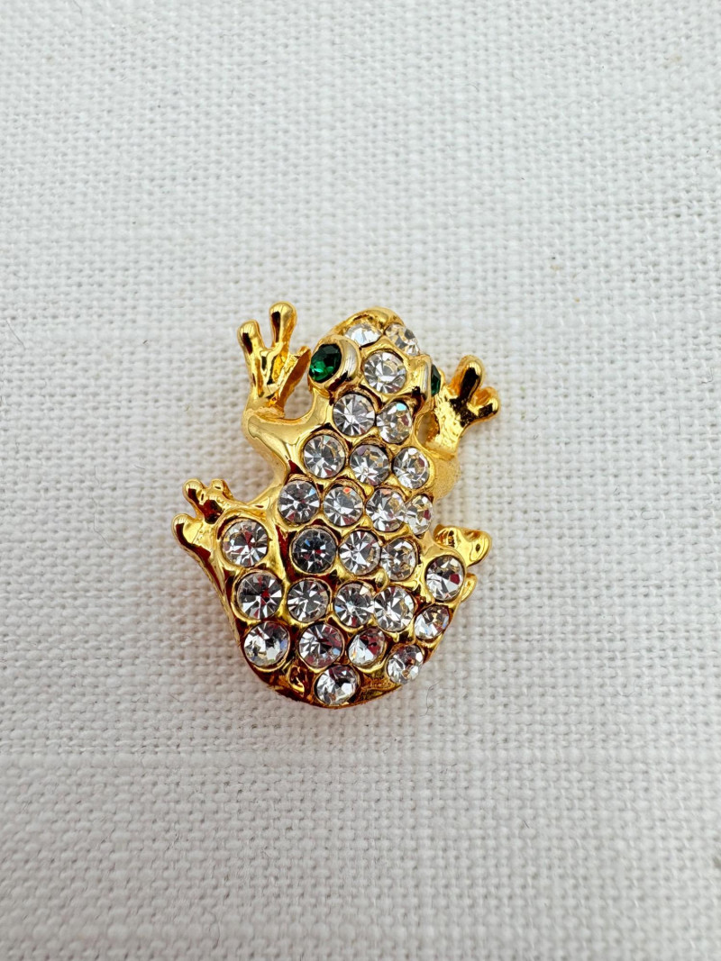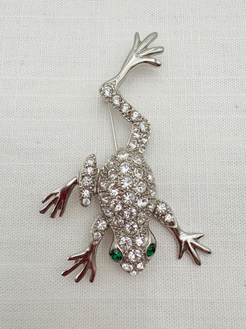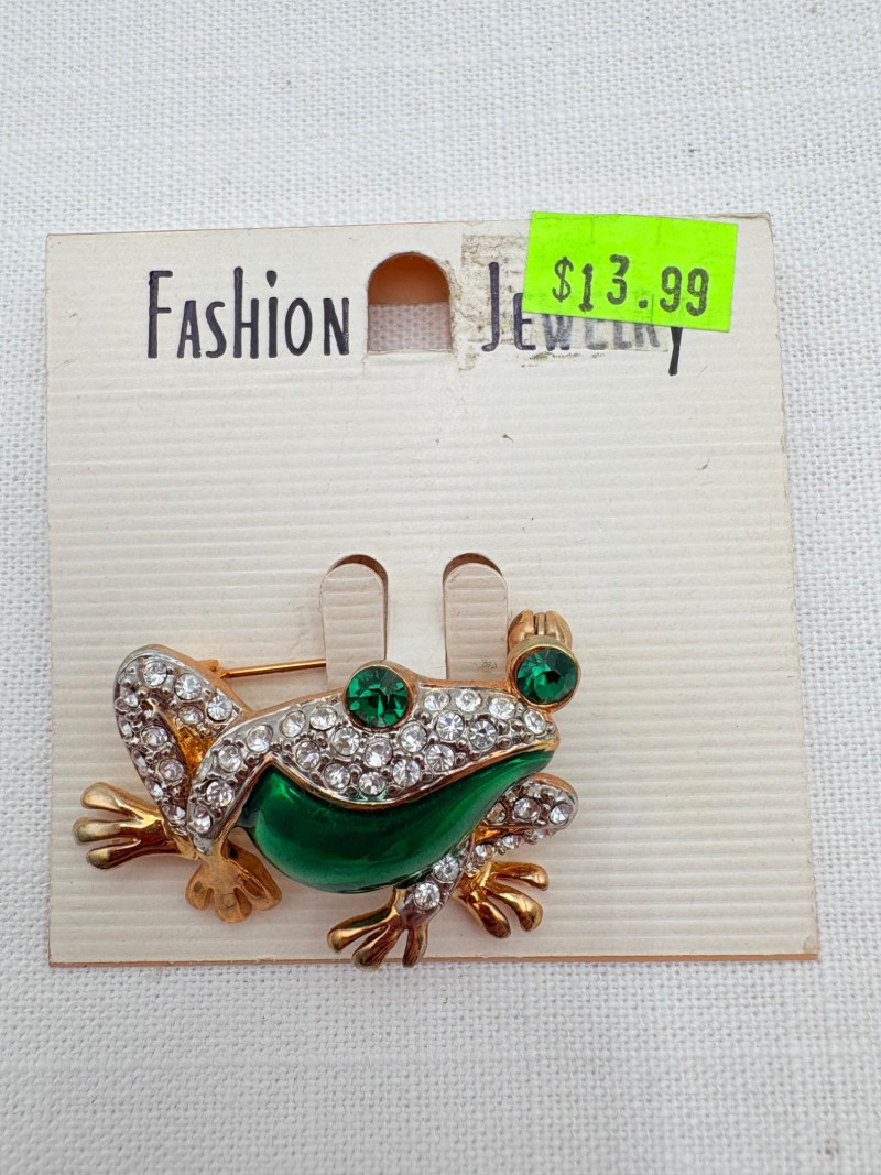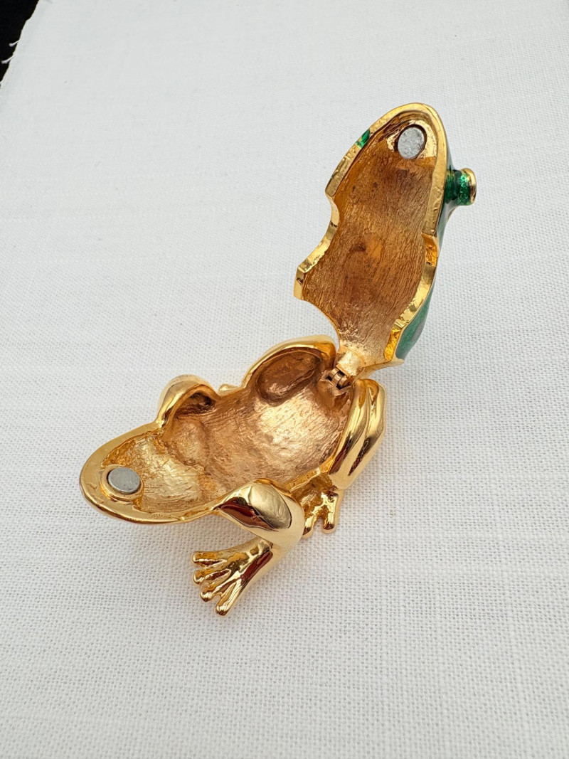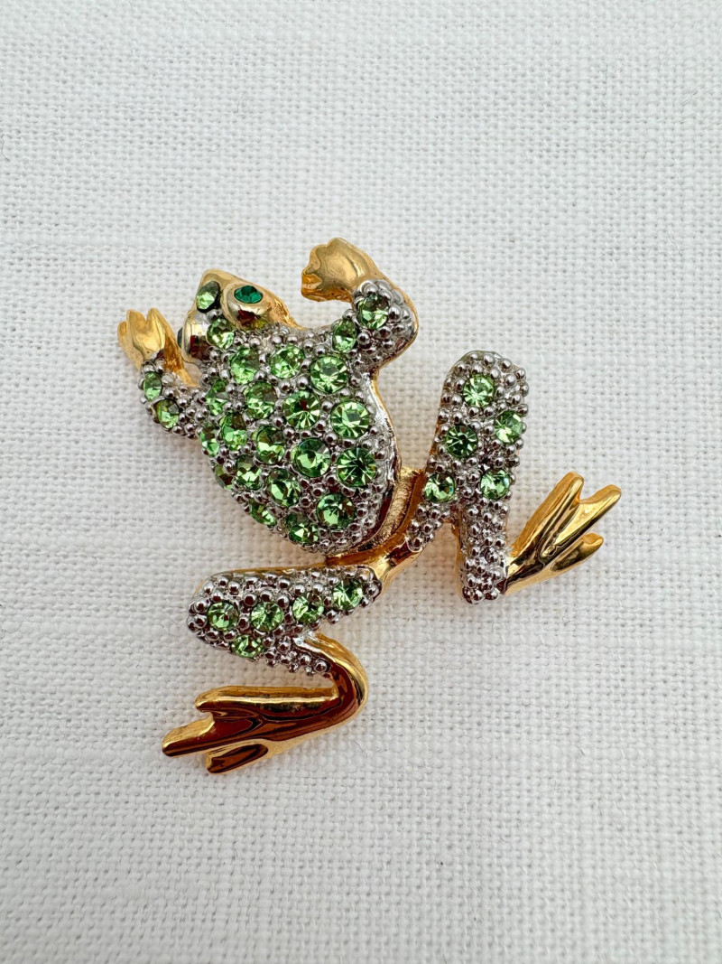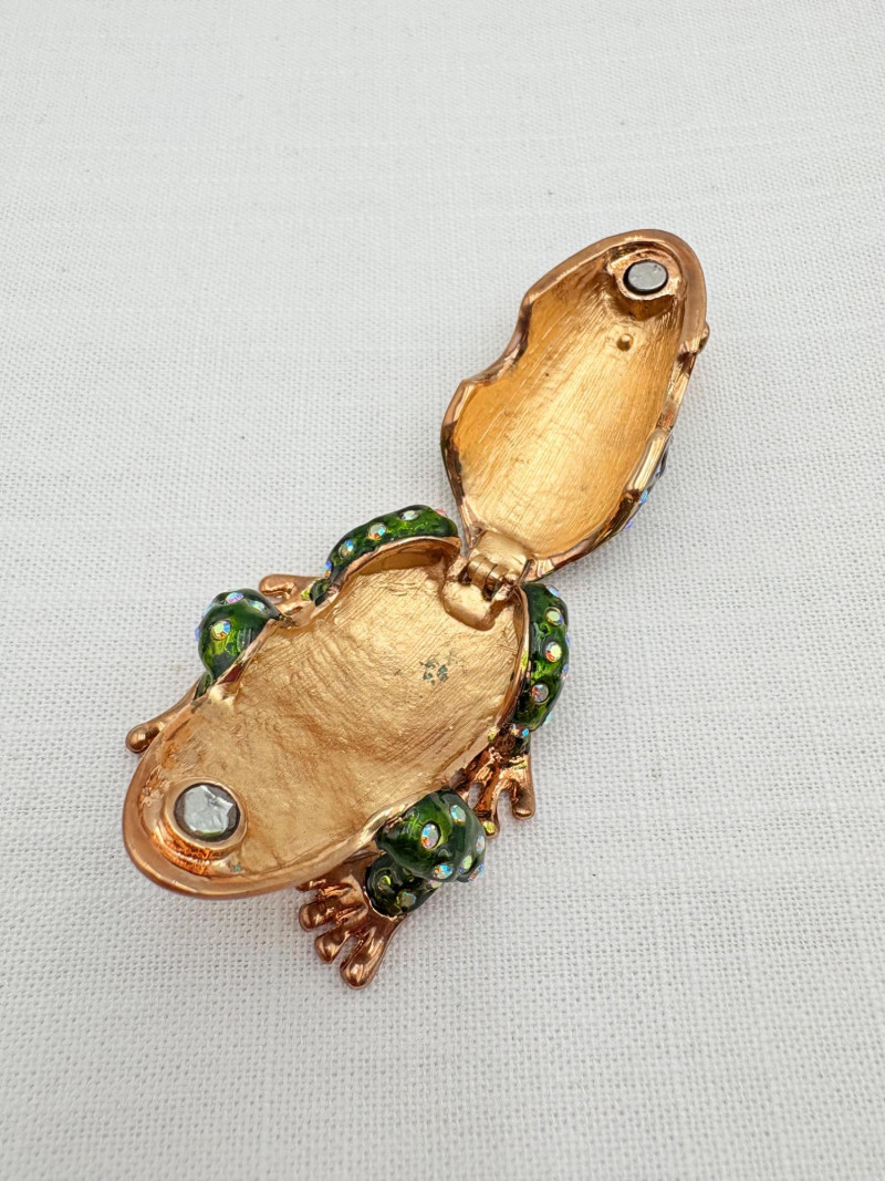 Large army of 13 frog pins accompanied by 3 lovely frog trinket boxes that are equally sparkly. Good quality costume jewelry with a number of vintage pieces. Please see photos for details.