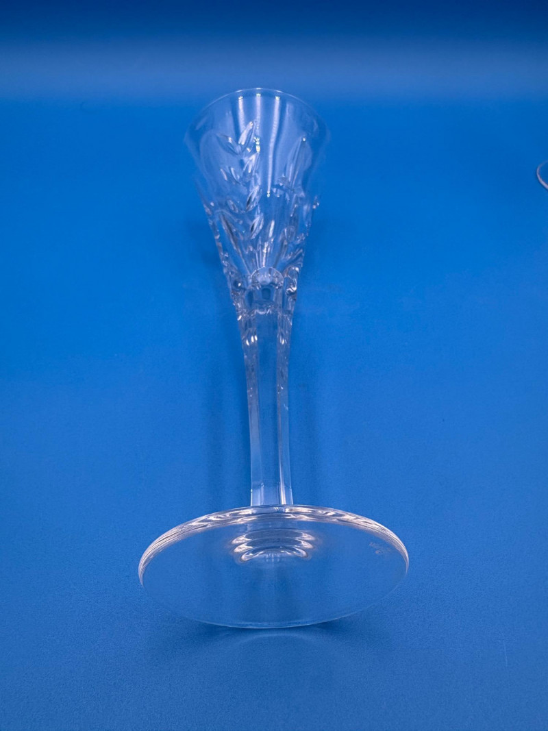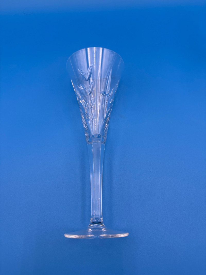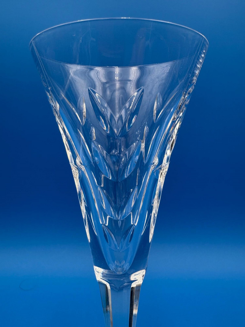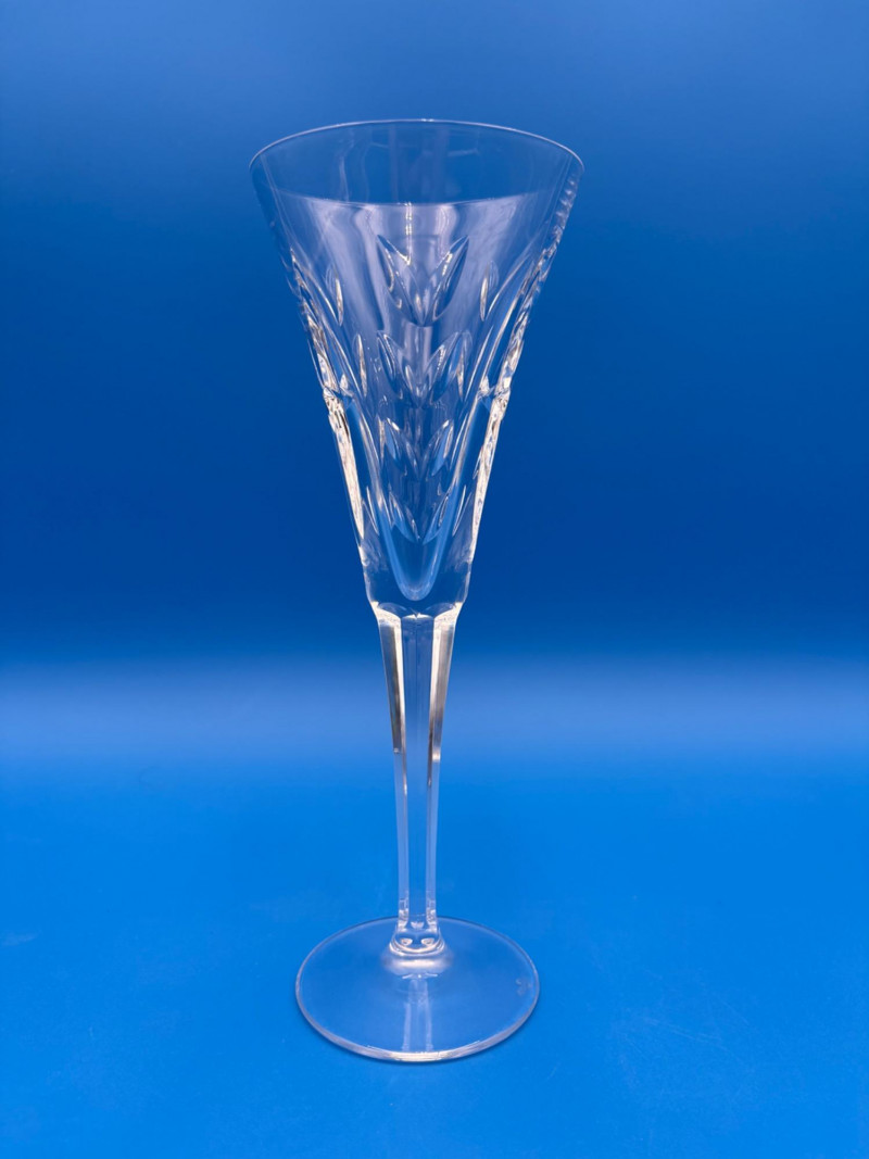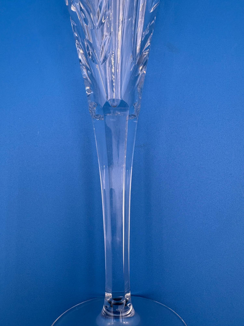 Pair of lead crystal toasting flutes from Waterford in what we think is the "Lincoln" design (with rather restrained carving for Waterford). They have beautiful detailing