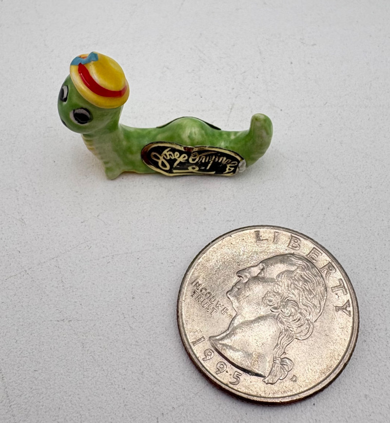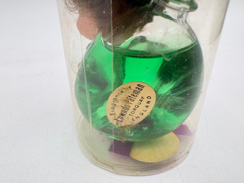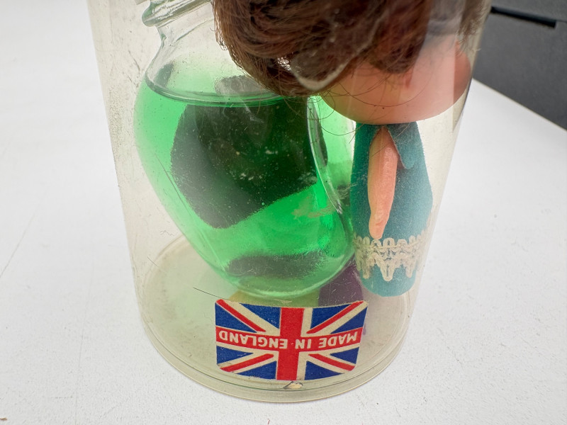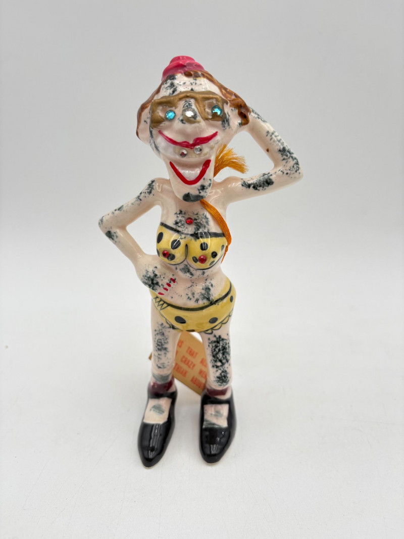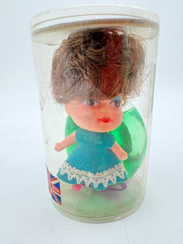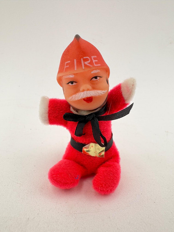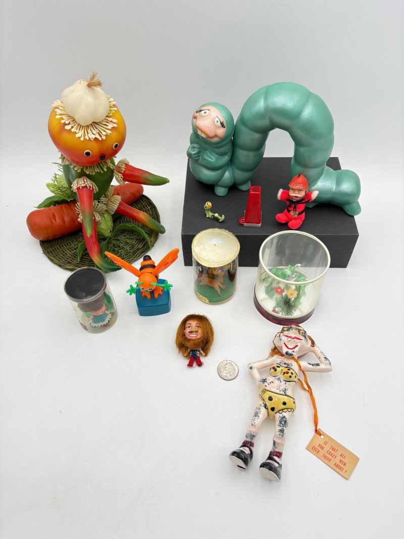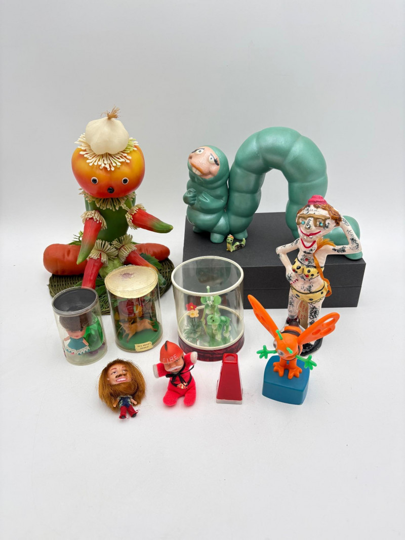 Eclectic group of vintage oddball items - not sure what purpose a couple even have, but we love the offbeat vibe! - Buck-toothed inchworm and his miniature friend. We think he once held a flag or toothpick sign of some kind - use your imagination to create your own if you like. - Strange plastic vegetable "Tomato Lady" figure from the 1960s (reminds us of a modern-day Arcimboldo painting), - 1960s mini-hippie doll (very tiny and we had to laugh at the meagre mustache attempt!) - Incredibly tacky Kreiss & Co. ceramic female figure from the 1960s "Psycho Ceramic" line in her undies. - Miniature fireman in a onesie. - Little elephants in a mirrored plastic tube. - Collapsing insect thumb puppet - classic from childhood! - Hey Diddle Diddle creepy fiddling cat. - Small red "viewer" of a little white boy in full Alaska Native parka & mukluks (couldn't capture a photo inside the viewer - we are guessing this is from the 1960s) - English mini-doll with a bottle of fragrance called "Devon Violets". Appears to be new & unopened (fragrance tag is loose in tube). See last photo with quarter in lower right for size comparison.
