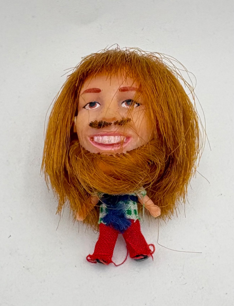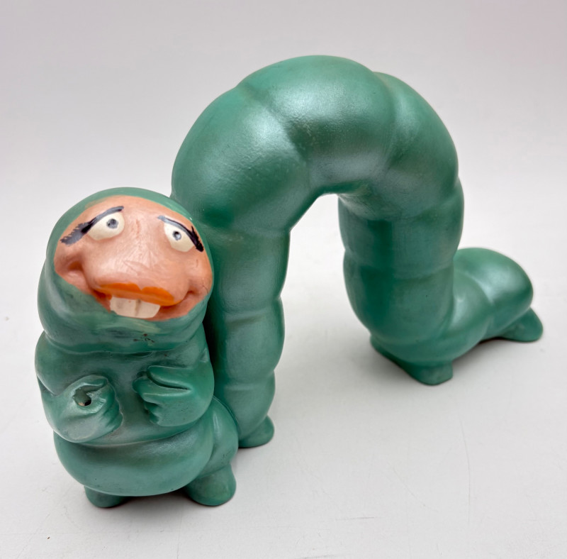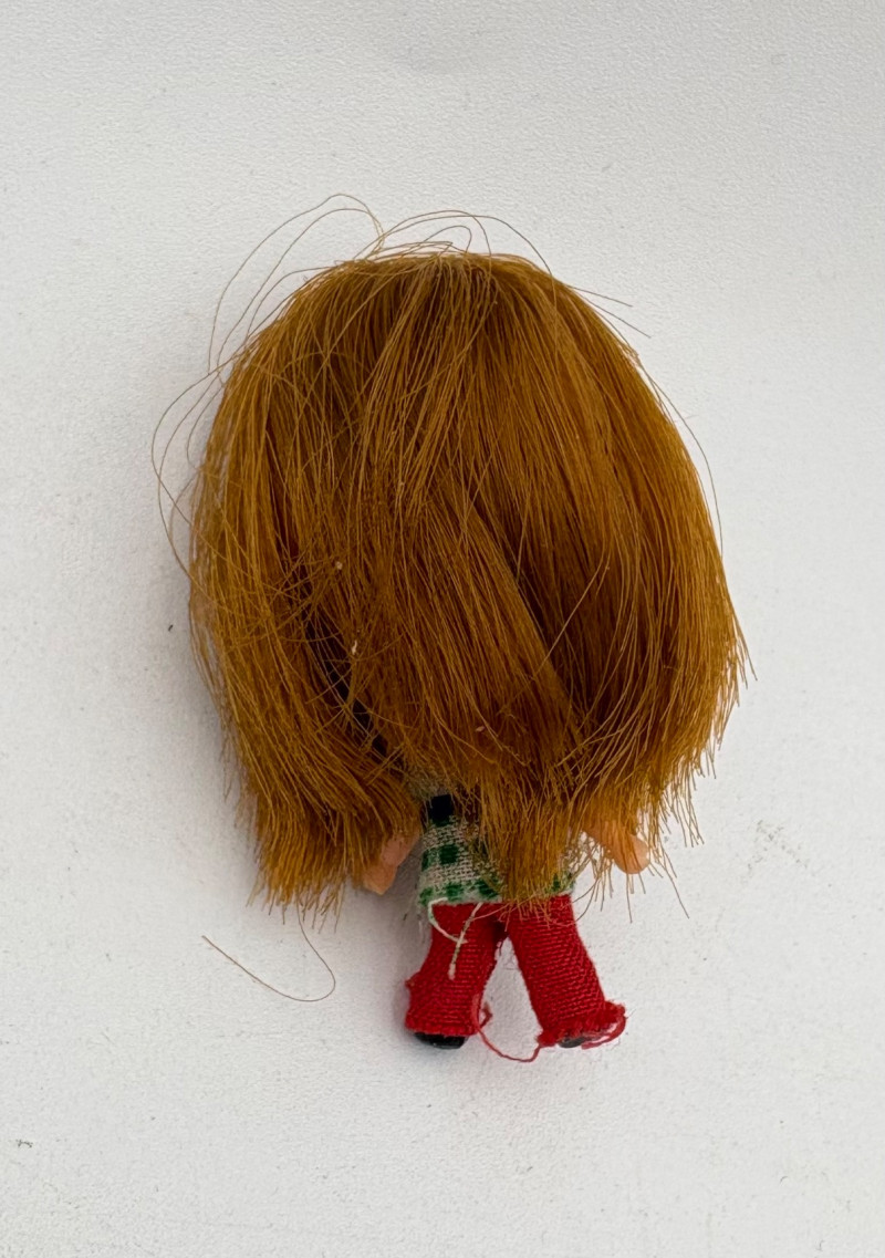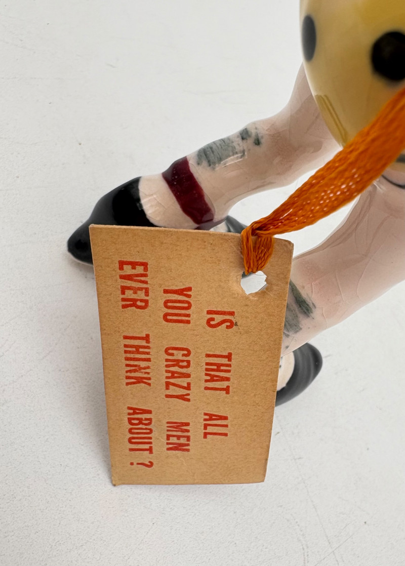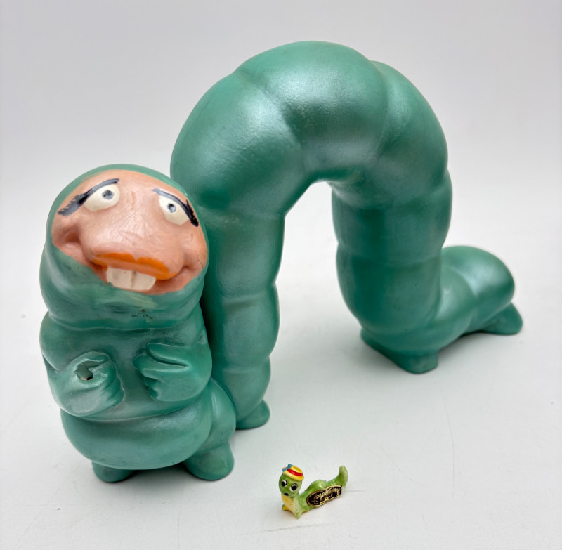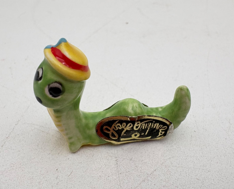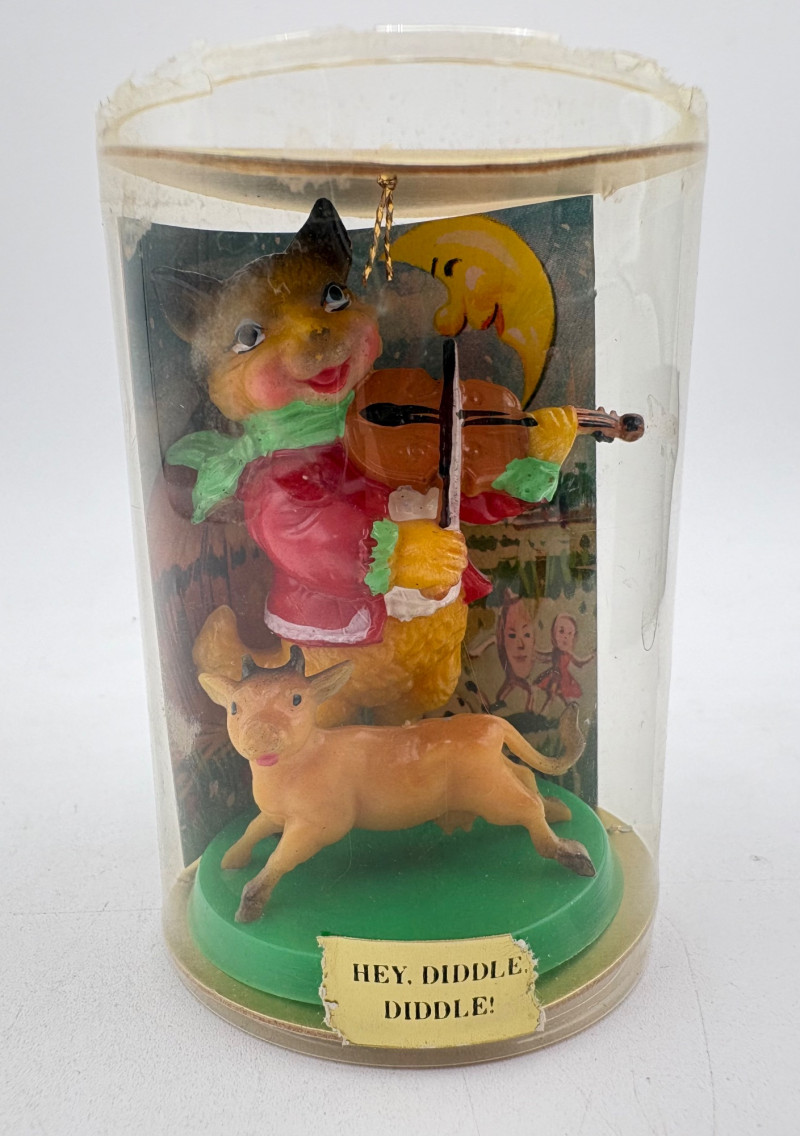 Eclectic group of vintage oddball items - not sure what purpose a couple even have, but we love the offbeat vibe! - Buck-toothed inchworm and his miniature friend. We think he once held a flag or toothpick sign of some kind - use your imagination to create your own if you like. - Strange plastic vegetable "Tomato Lady" figure from the 1960s (reminds us of a modern-day Arcimboldo painting), - 1960s mini-hippie doll (very tiny and we had to laugh at the meagre mustache attempt!) - Incredibly tacky Kreiss & Co. ceramic female figure from the 1960s "Psycho Ceramic" line in her undies. - Miniature fireman in a onesie. - Little elephants in a mirrored plastic tube. - Collapsing insect thumb puppet - classic from childhood! - Hey Diddle Diddle creepy fiddling cat. - Small red "viewer" of a little white boy in full Alaska Native parka & mukluks (couldn't capture a photo inside the viewer - we are guessing this is from the 1960s) - English mini-doll with a bottle of fragrance called "Devon Violets". Appears to be new & unopened (fragrance tag is loose in tube). See last photo with quarter in lower right for size comparison.