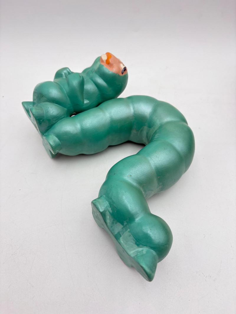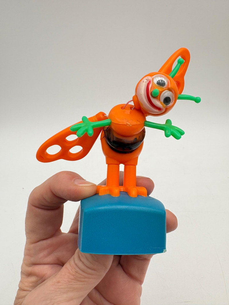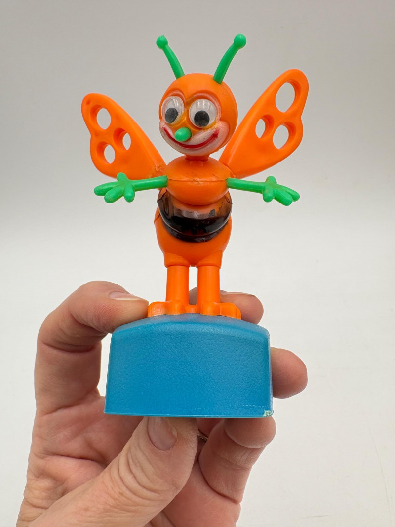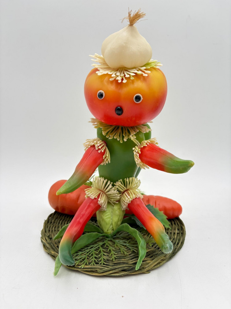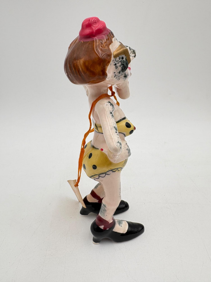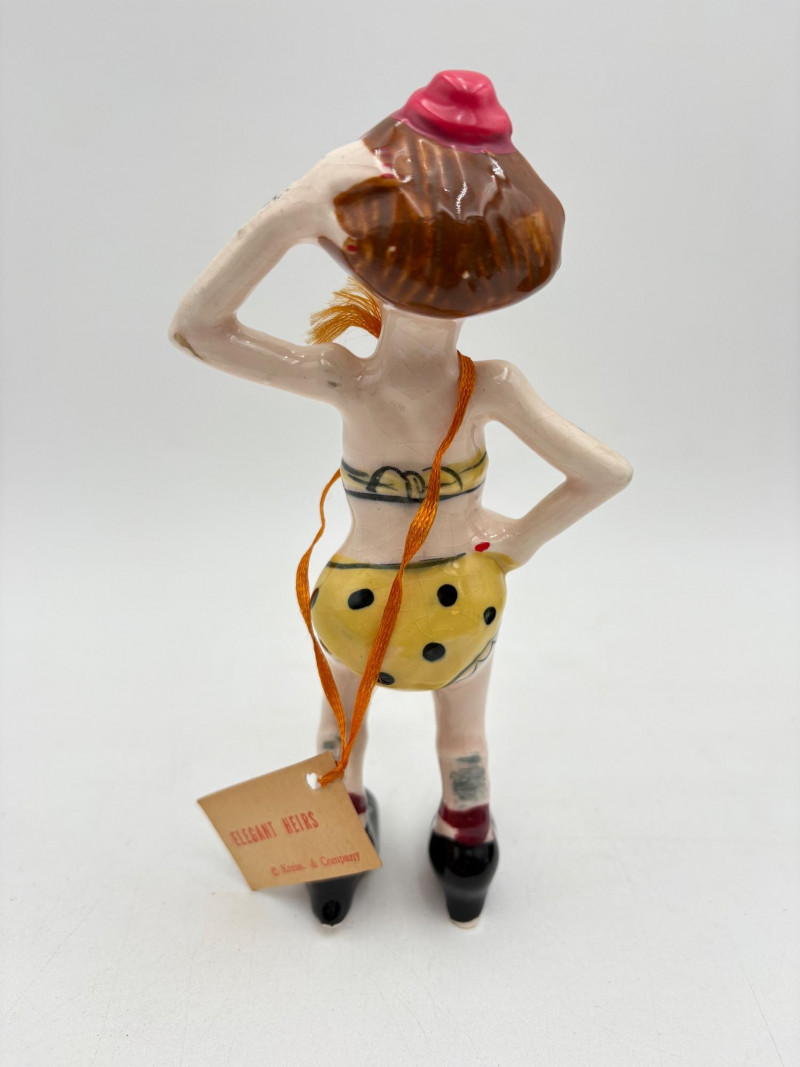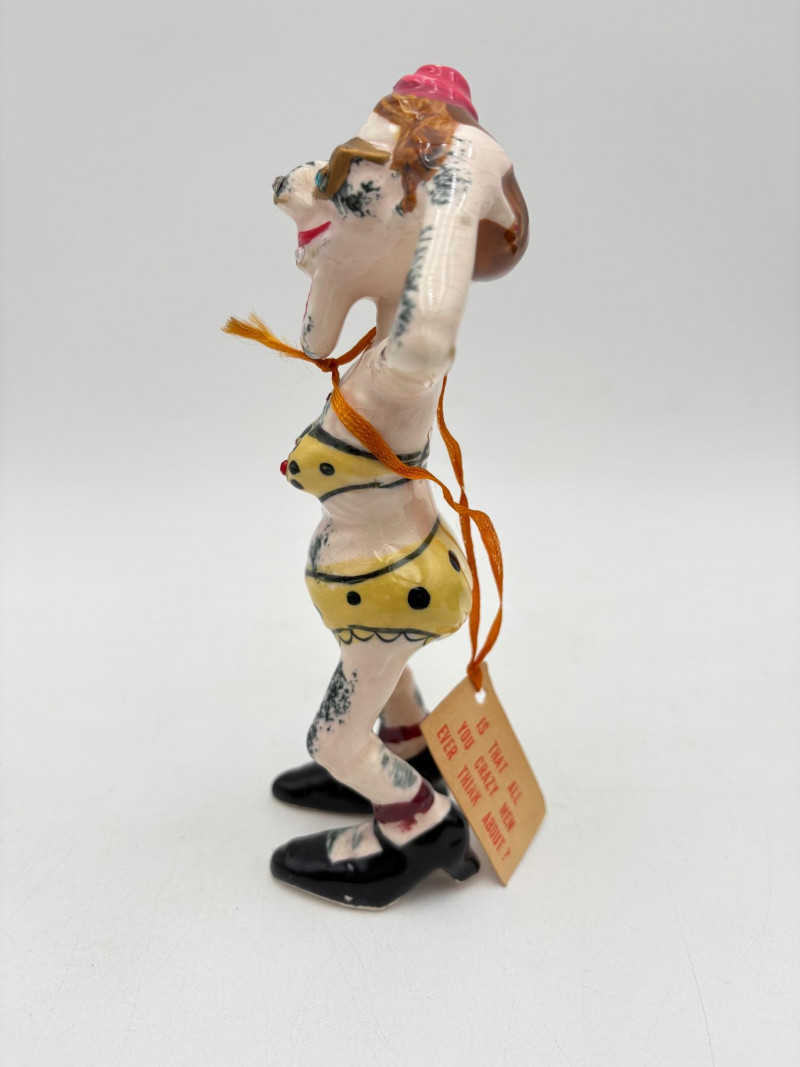 Eclectic group of vintage oddball items - not sure what purpose a couple even have, but we love the offbeat vibe! - Buck-toothed inchworm and his miniature friend. We think he once held a flag or toothpick sign of some kind - use your imagination to create your own if you like. - Strange plastic vegetable "Tomato Lady" figure from the 1960s (reminds us of a modern-day Arcimboldo painting), - 1960s mini-hippie doll (very tiny and we had to laugh at the meagre mustache attempt!) - Incredibly tacky Kreiss & Co. ceramic female figure from the 1960s "Psycho Ceramic" line in her undies. - Miniature fireman in a onesie. - Little elephants in a mirrored plastic tube. - Collapsing insect thumb puppet - classic from childhood! - Hey Diddle Diddle creepy fiddling cat. - Small red "viewer" of a little white boy in full Alaska Native parka & mukluks (couldn't capture a photo inside the viewer - we are guessing this is from the 1960s) - English mini-doll with a bottle of fragrance called "Devon Violets". Appears to be new & unopened (fragrance tag is loose in tube). See last photo with quarter in lower right for size comparison.