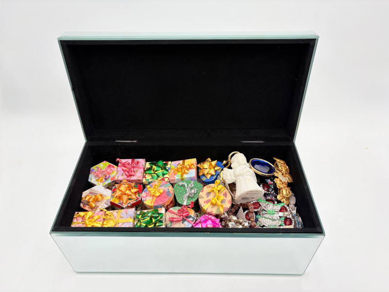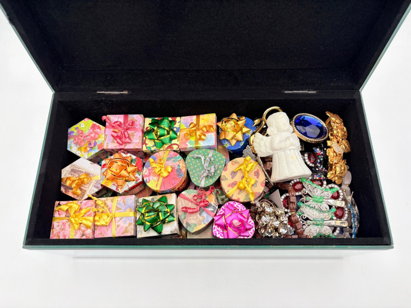 This mirrored mystery box measures 6" H x 14" L x 7" D. It's lined with black velvet and full of jewelry for the younger set, i.e., fun bright stuff, but not precious stones or metals (the little gift boxes each have a fun ring). Would be a terrific addition to any little kids' dress up attire!