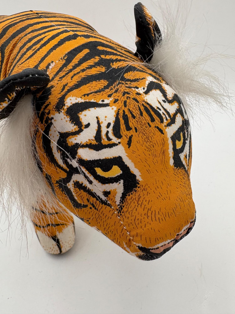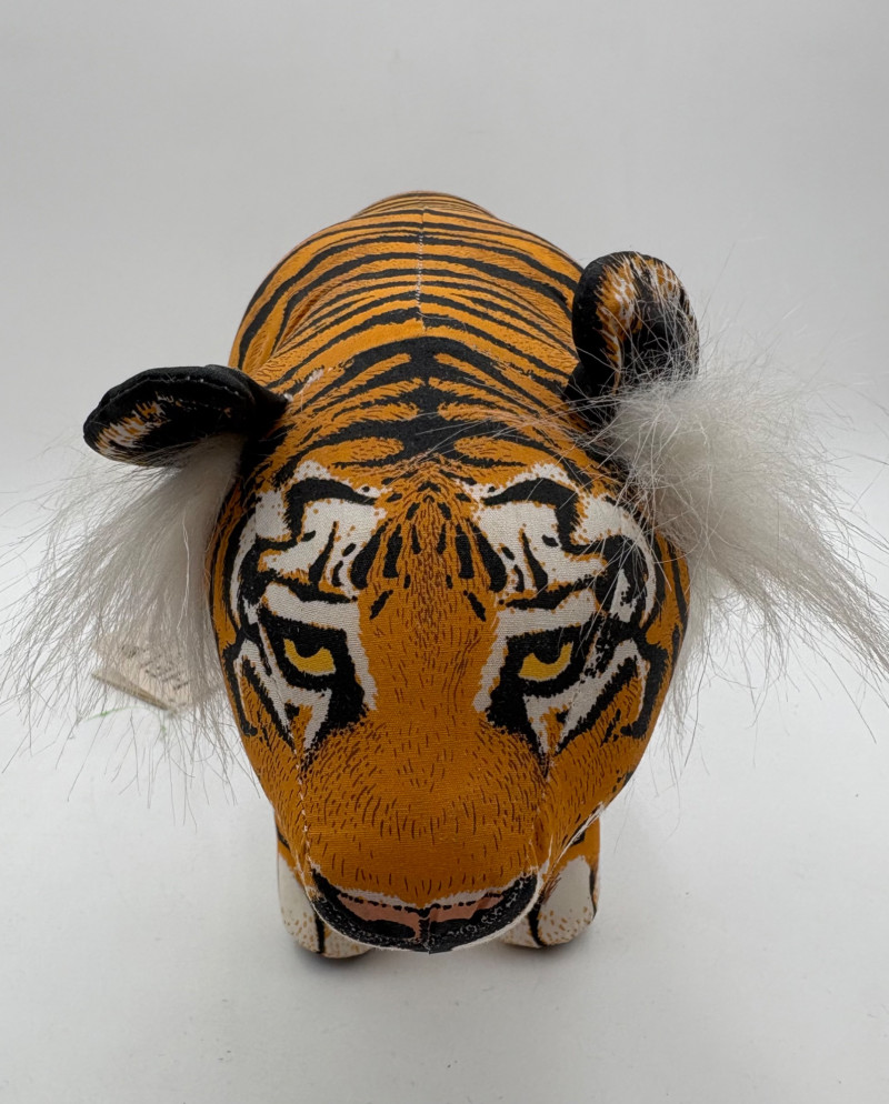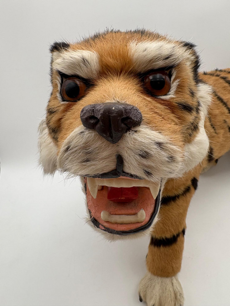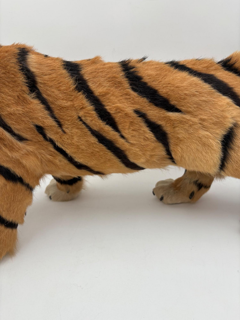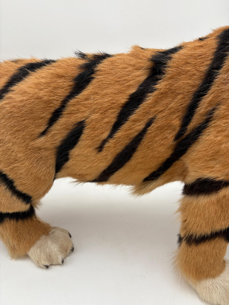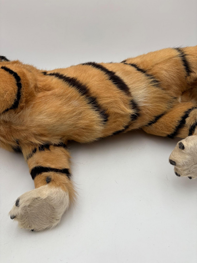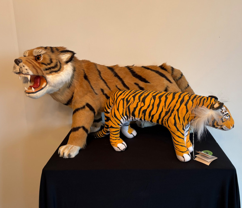 Pair of tigers - one very life-like and the other not-so-much! The larger of the two has faux fur (we think it looks like dyed cowhide - it's the same texture as high-end "ponyhair" shoes) over a shaped body. He is of substantial size measuring 15" H x 33" L x 12" W (front body curves). He has a few minor flaws (black lining around his right lower lip is missing - see mouth photo), but overall in good shape.* He has no tag, be we are guessing he is from the 1980s. Smaller tiger is made of printed fabric and has terrible posture. He measures 9" H x 22" L x 5" W. In good shape*- made for the National Wildlife fund in 1990. * Both tigers were in storage for a LONG time and could use a good airing out and cleaning.