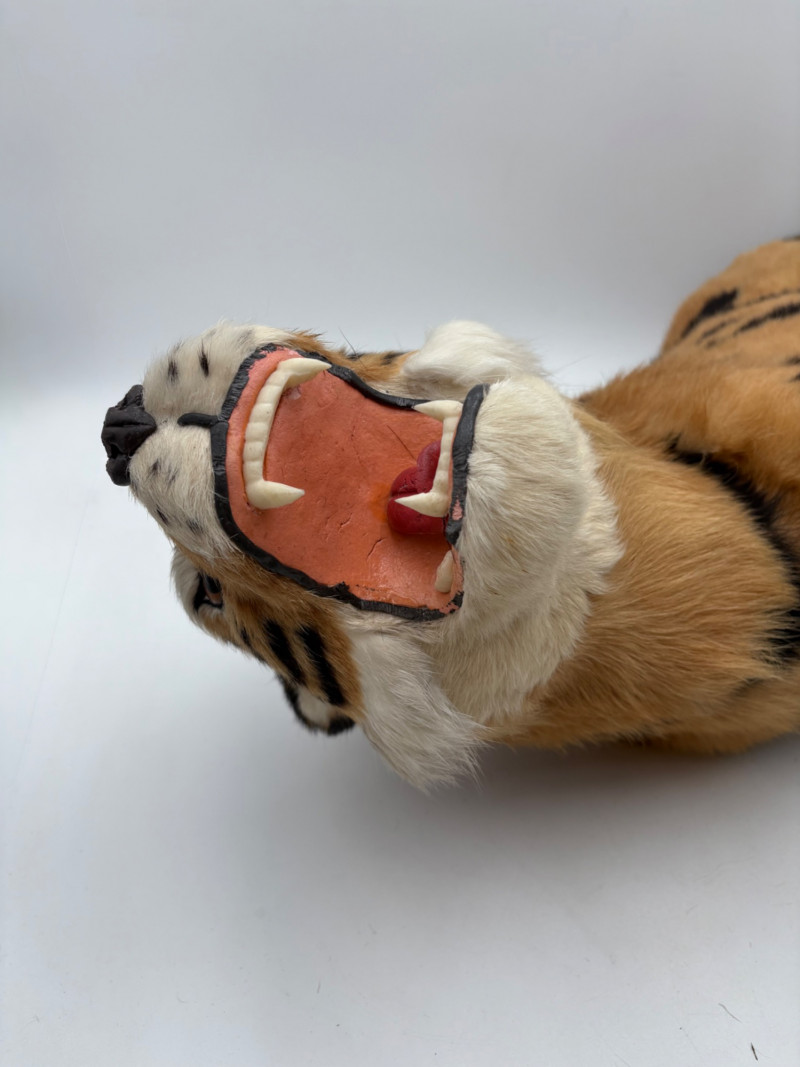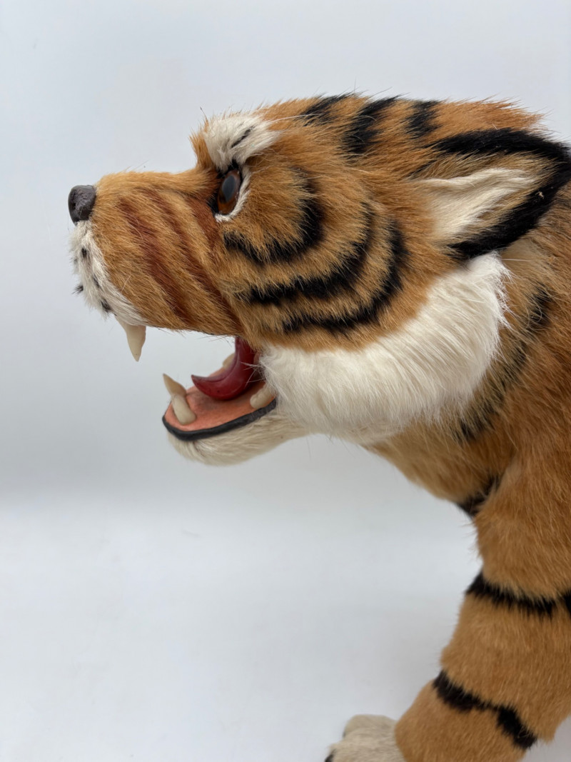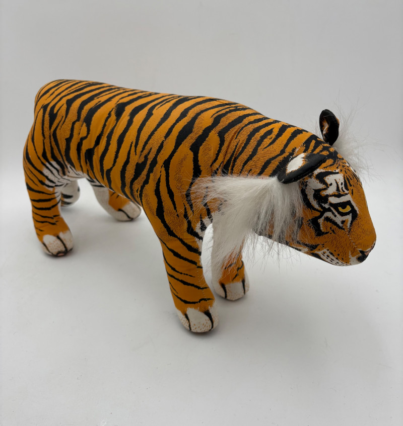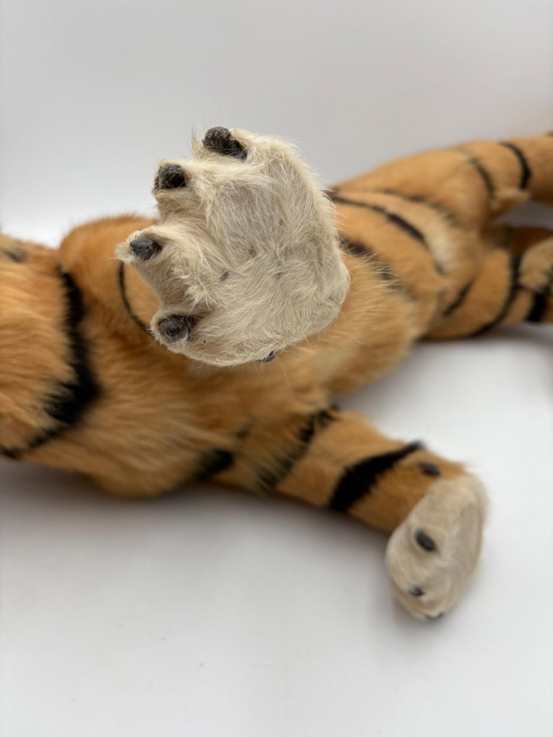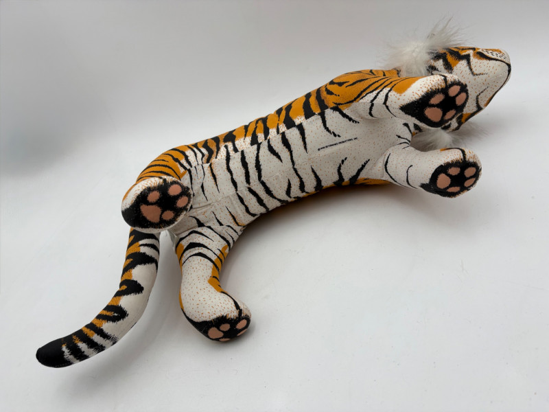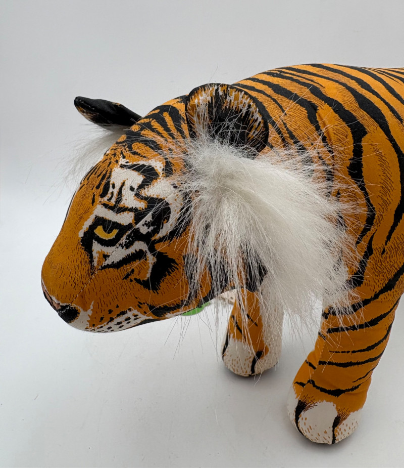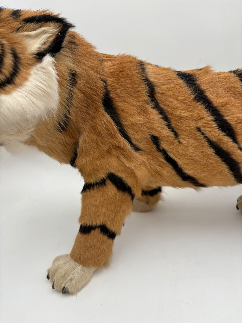 Pair of tigers - one very life-like and the other not-so-much! The larger of the two has faux fur (we think it looks like dyed cowhide - it's the same texture as high-end "ponyhair" shoes) over a shaped body. He is of substantial size measuring 15" H x 33" L x 12" W (front body curves). He has a few minor flaws (black lining around his right lower lip is missing - see mouth photo), but overall in good shape.* He has no tag, be we are guessing he is from the 1980s. Smaller tiger is made of printed fabric and has terrible posture. He measures 9" H x 22" L x 5" W. In good shape*- made for the National Wildlife fund in 1990. * Both tigers were in storage for a LONG time and could use a good airing out and cleaning.